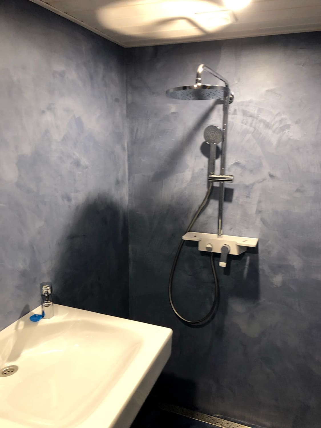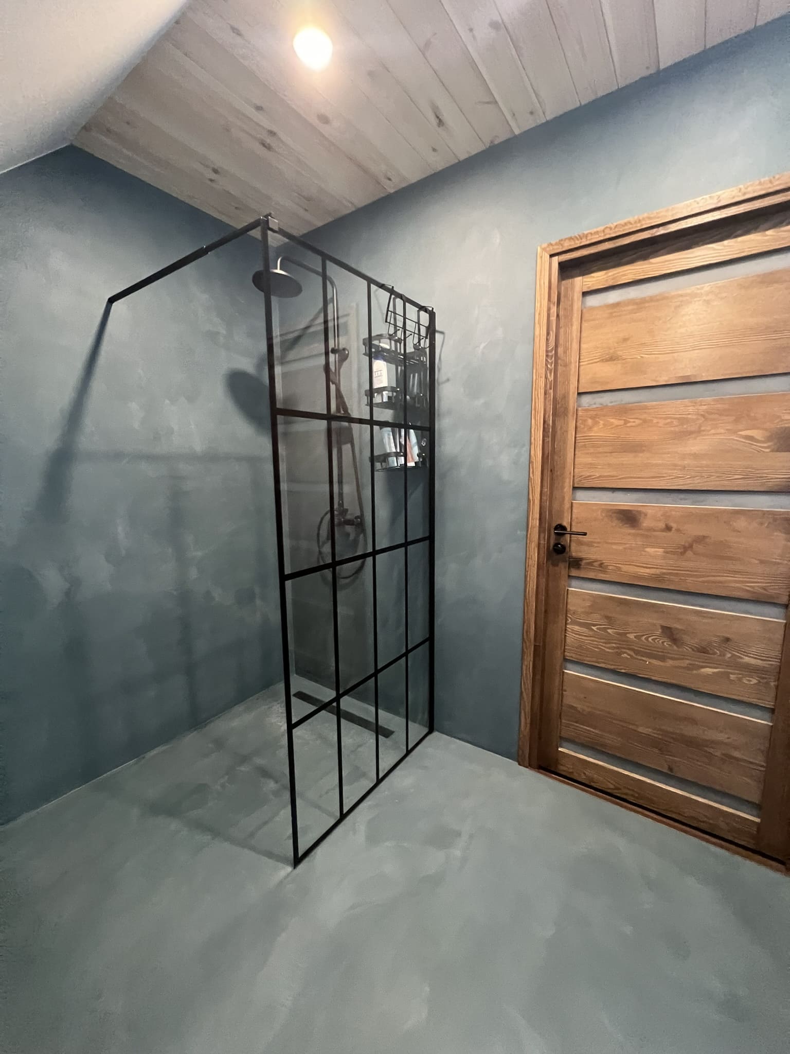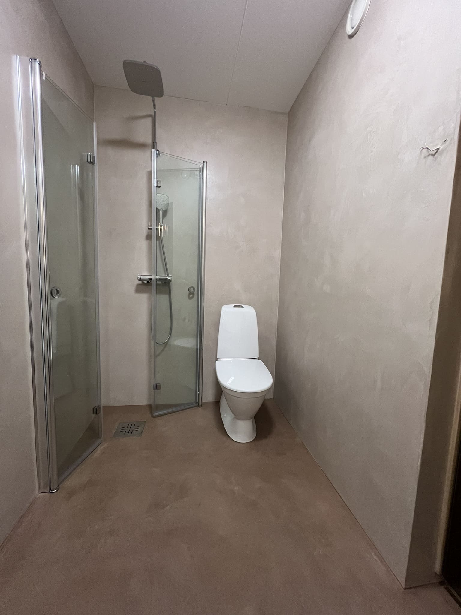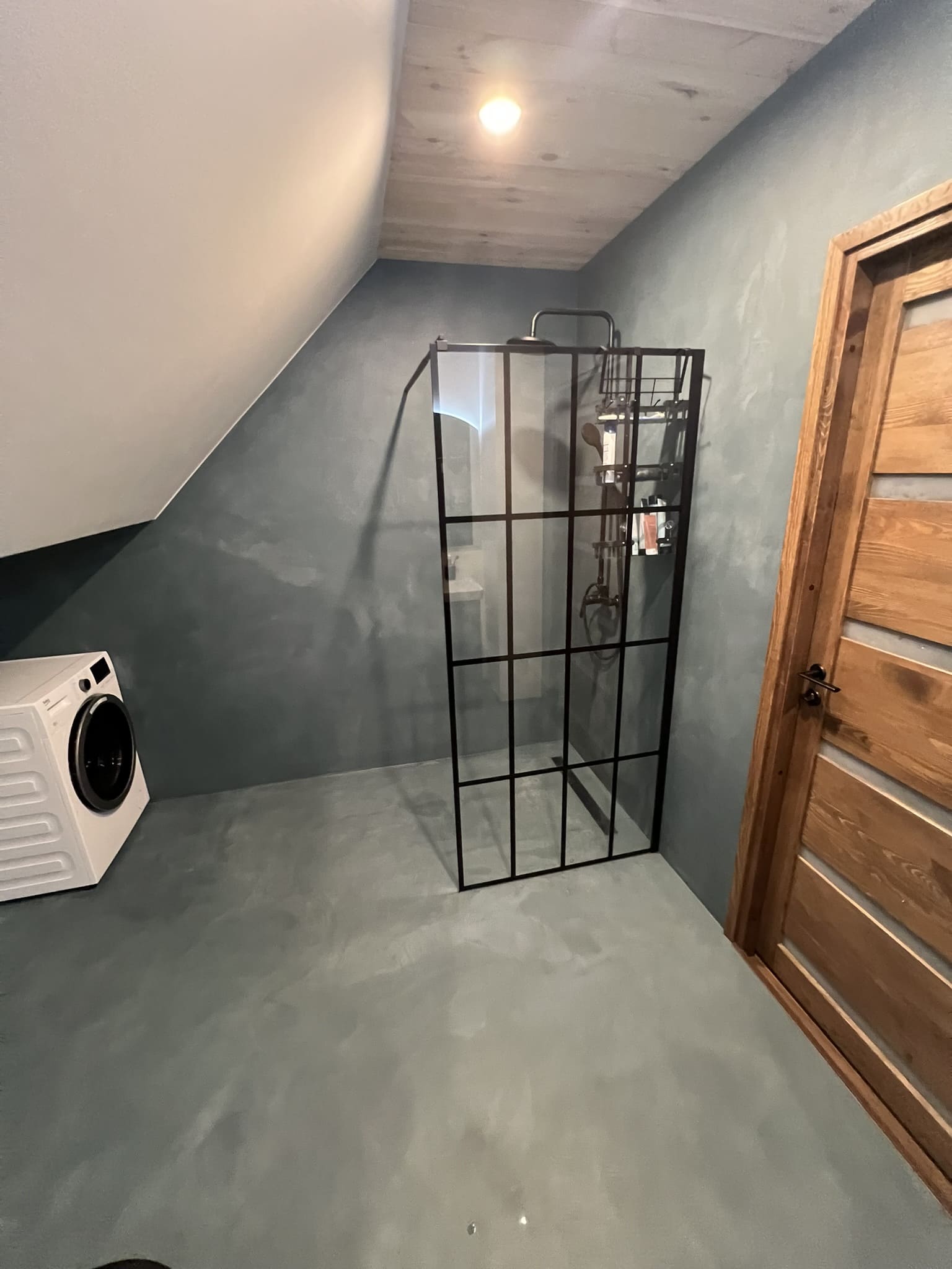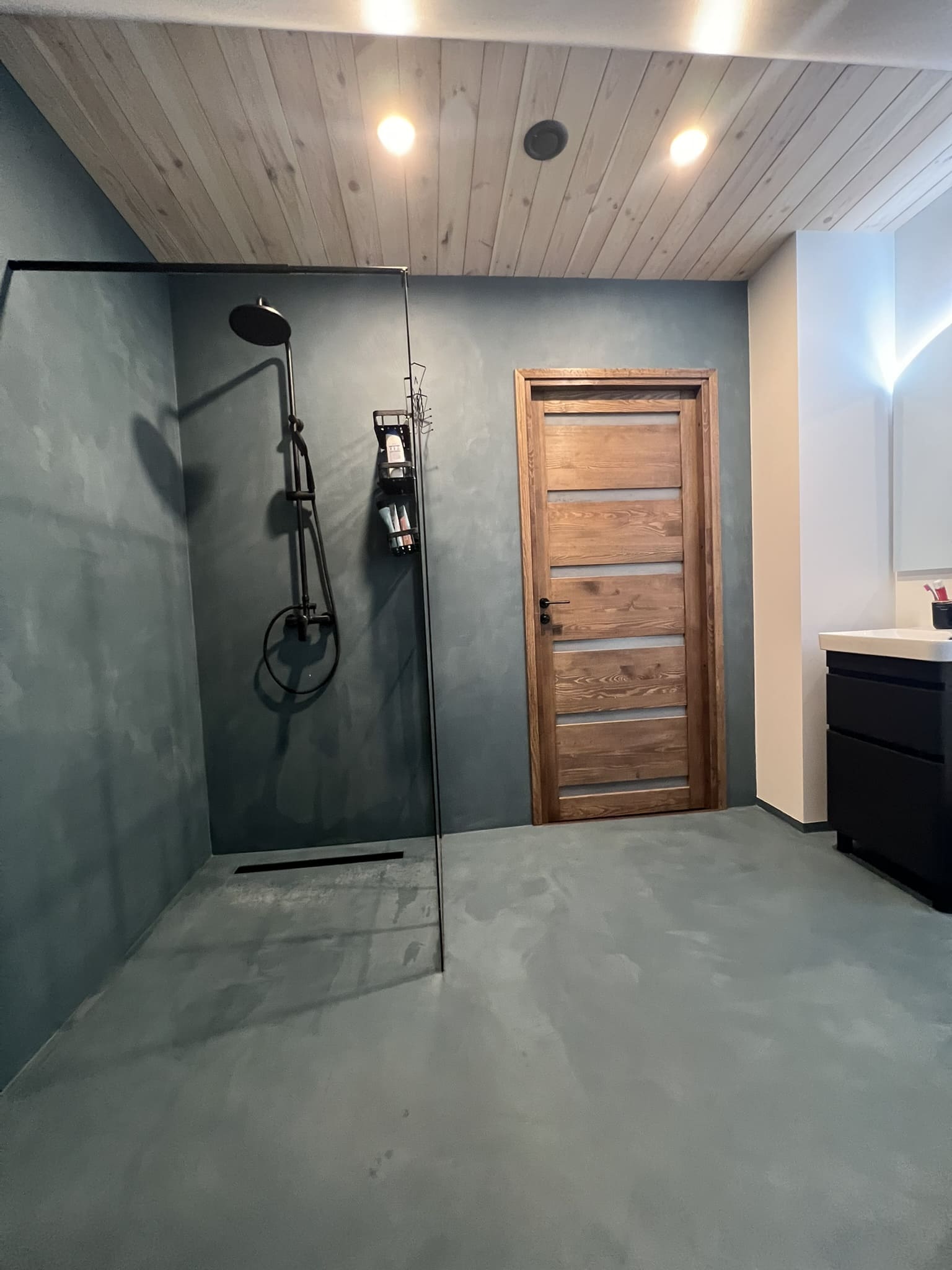 Täislahendusena valminud 2,5 m2 põrandapinnaga  duširuum, kus sai üle võetud poolik töö.  Lakke sanglepp, põrand ja seinad mikrotsemendiga, mida on lihtne hooldada. Toon Basebeton Duhe.