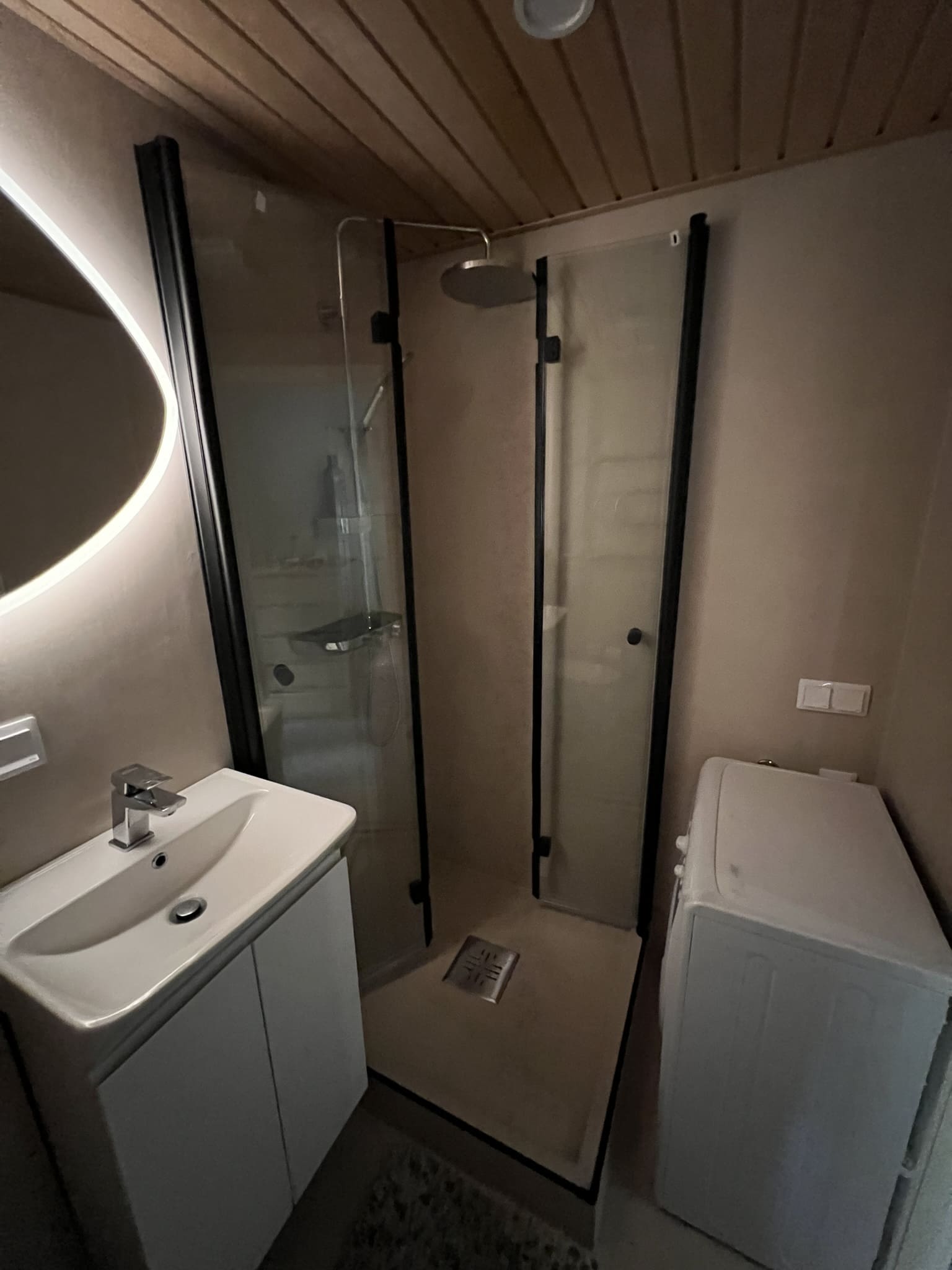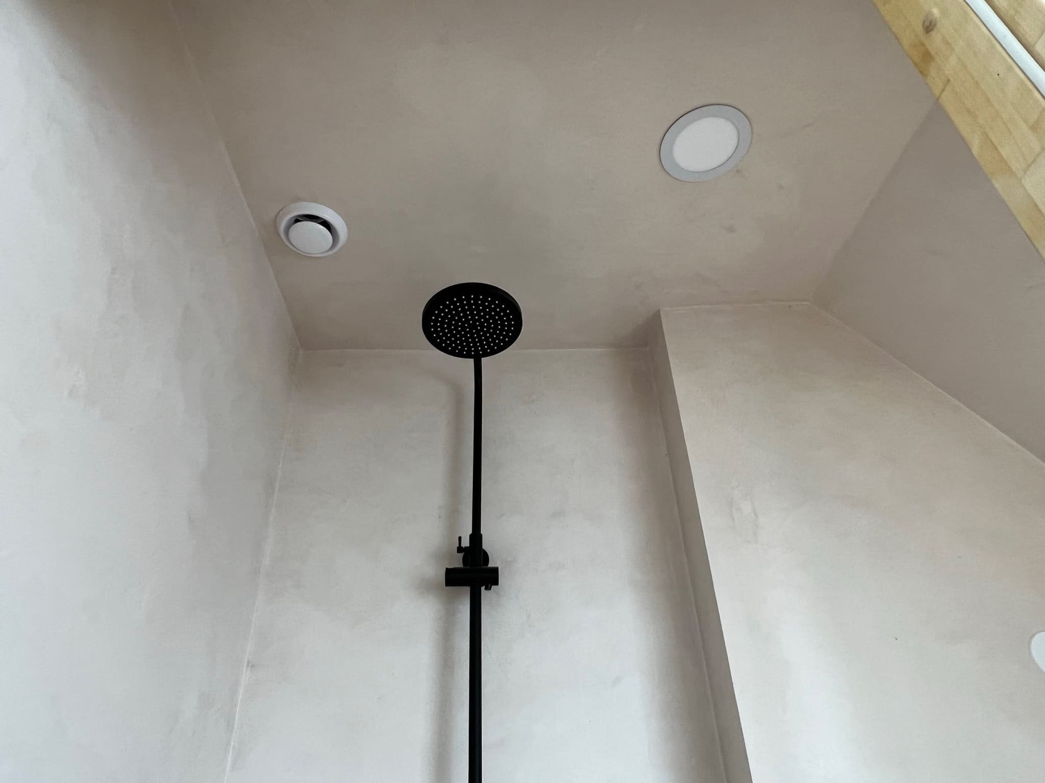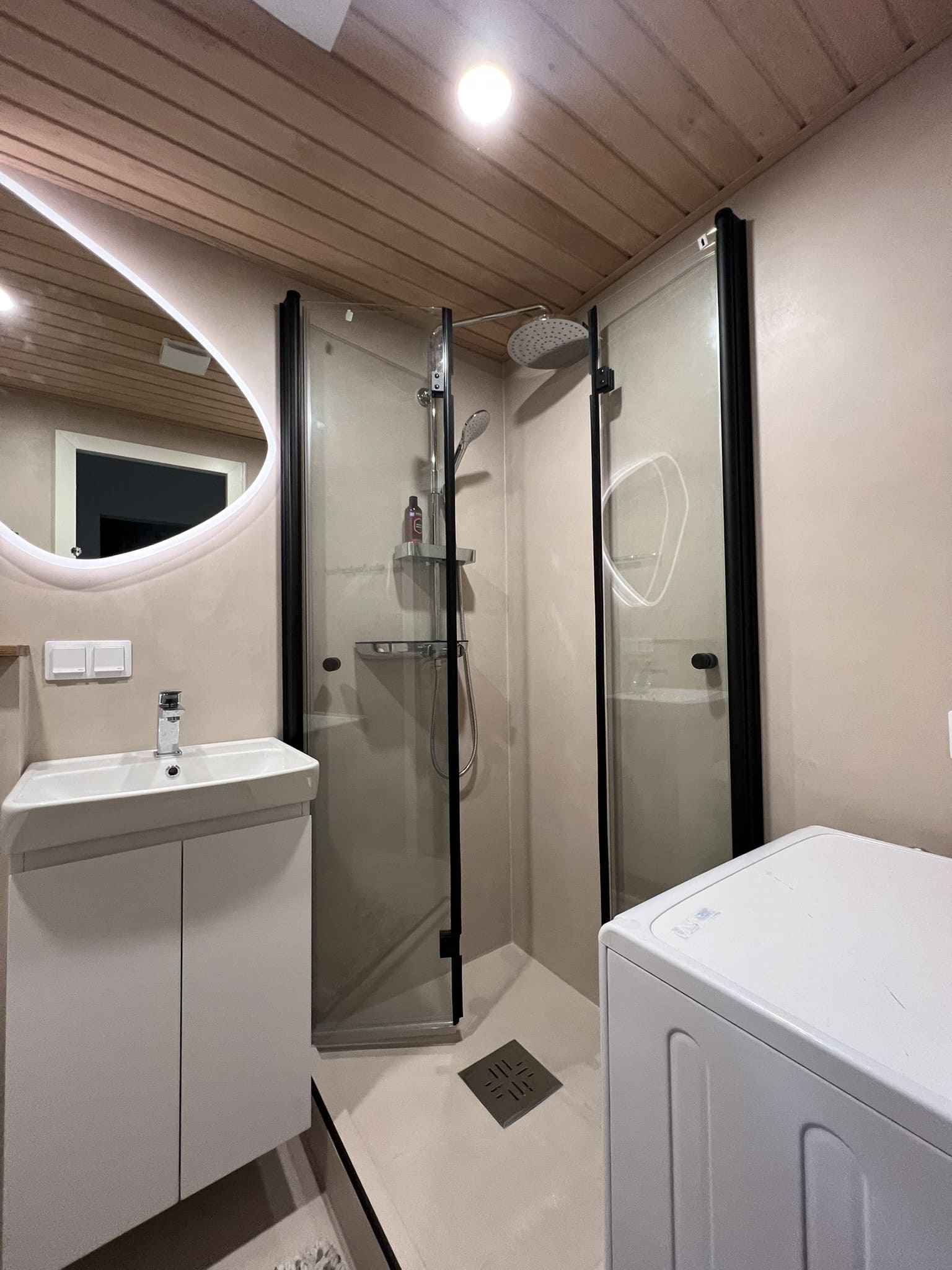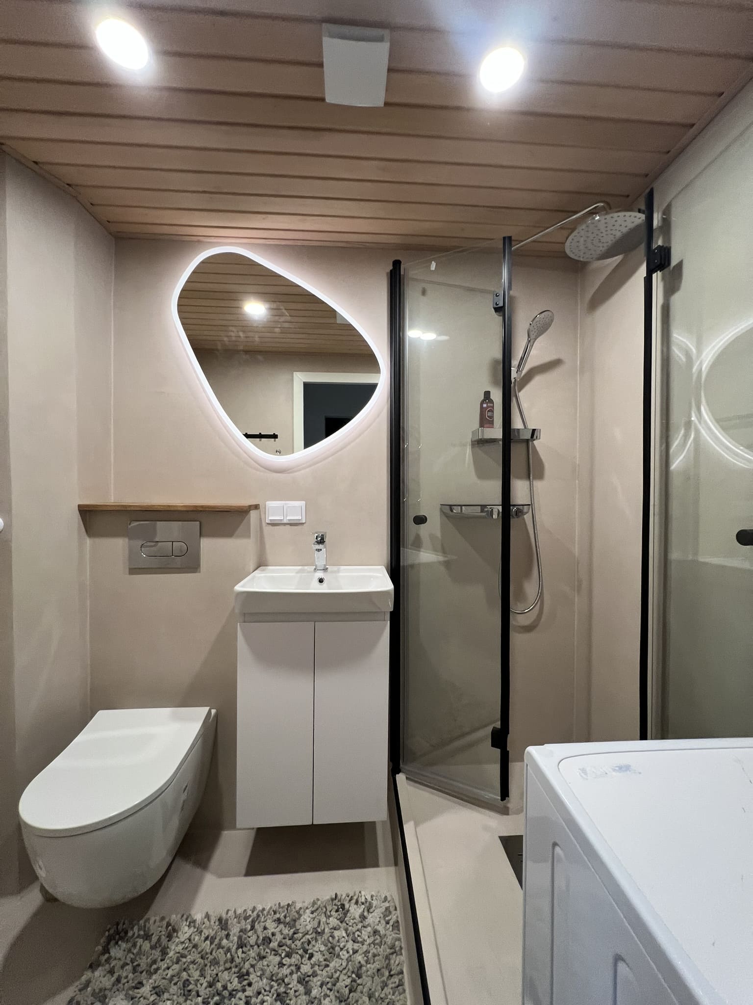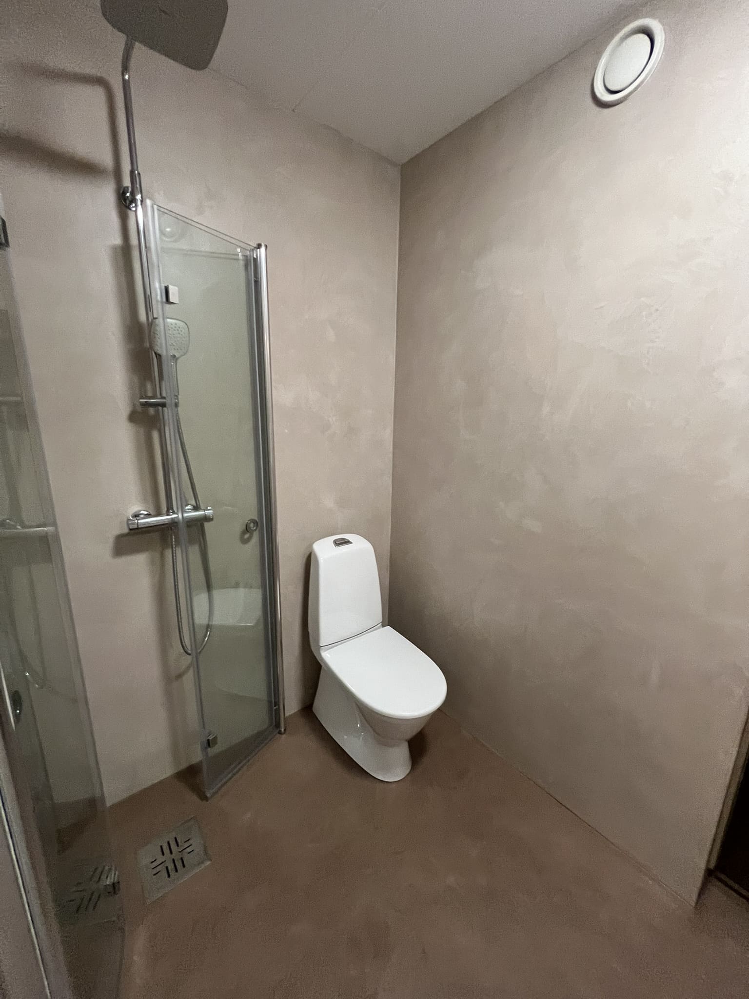 Täislahendusena valminud 2,5 m2 põrandapinnaga  duširuum, kus sai üle võetud poolik töö.  Lakke sanglepp, põrand ja seinad mikrotsemendiga, mida on lihtne hooldada. Toon Basebeton Duhe.