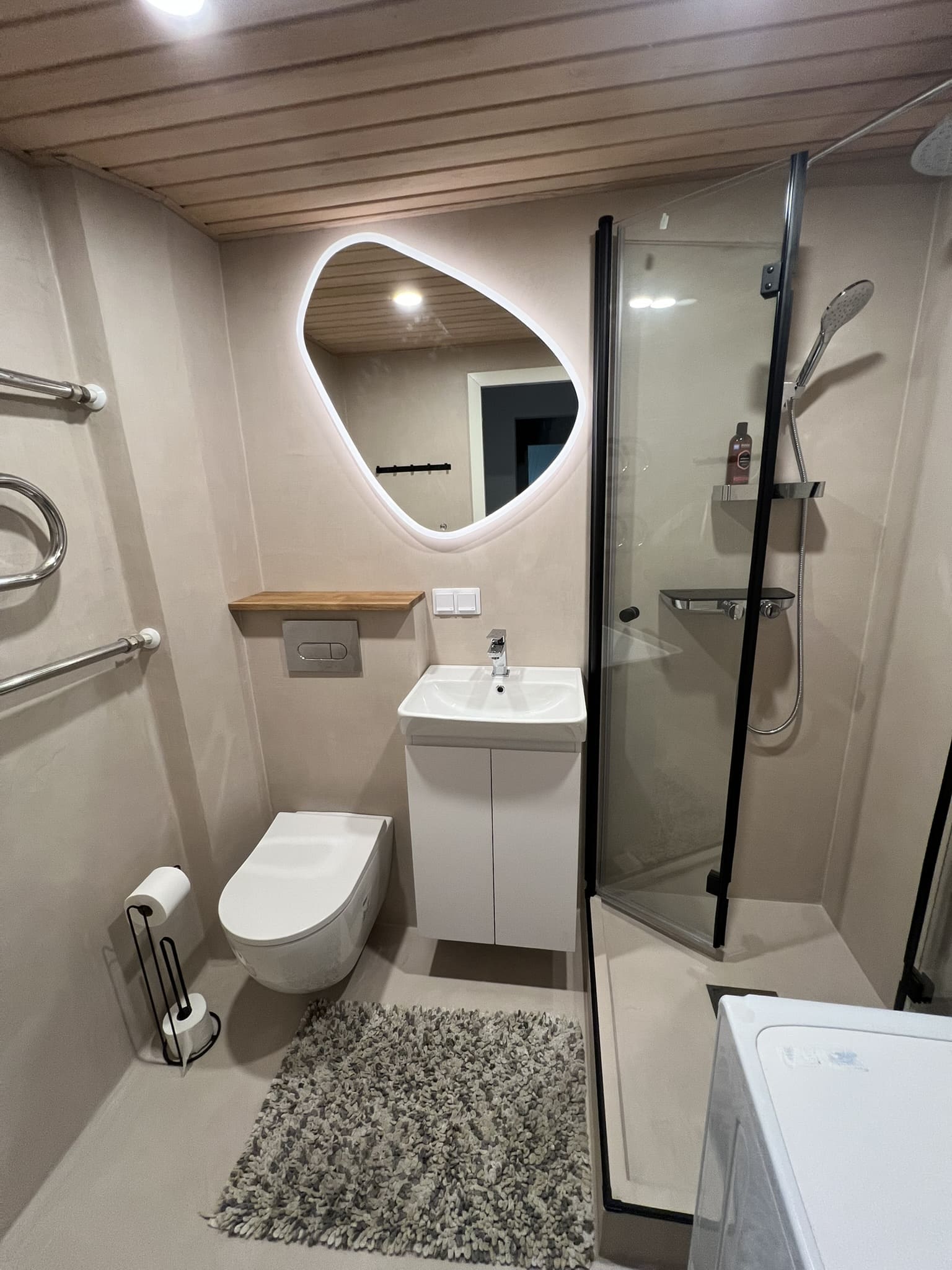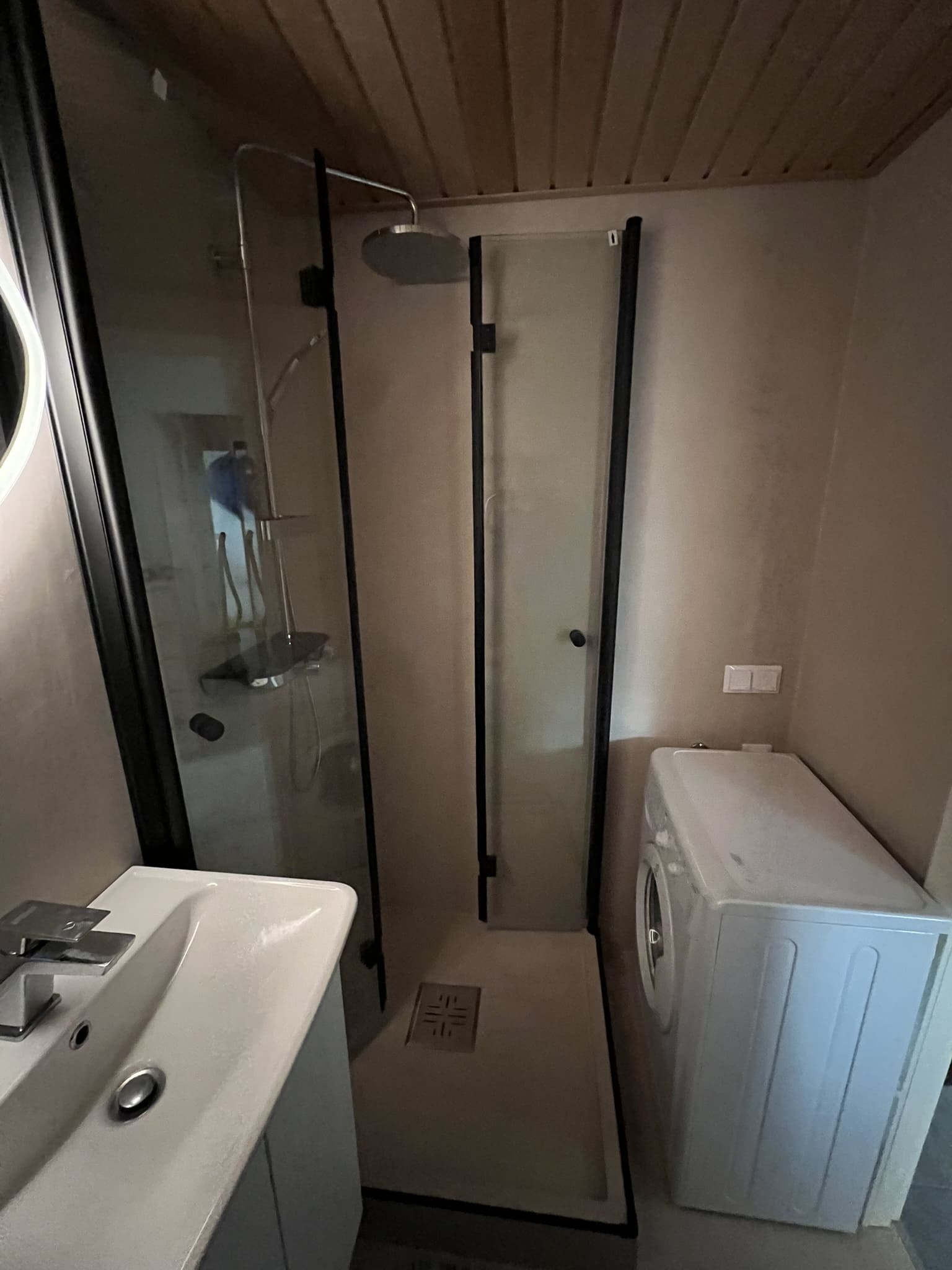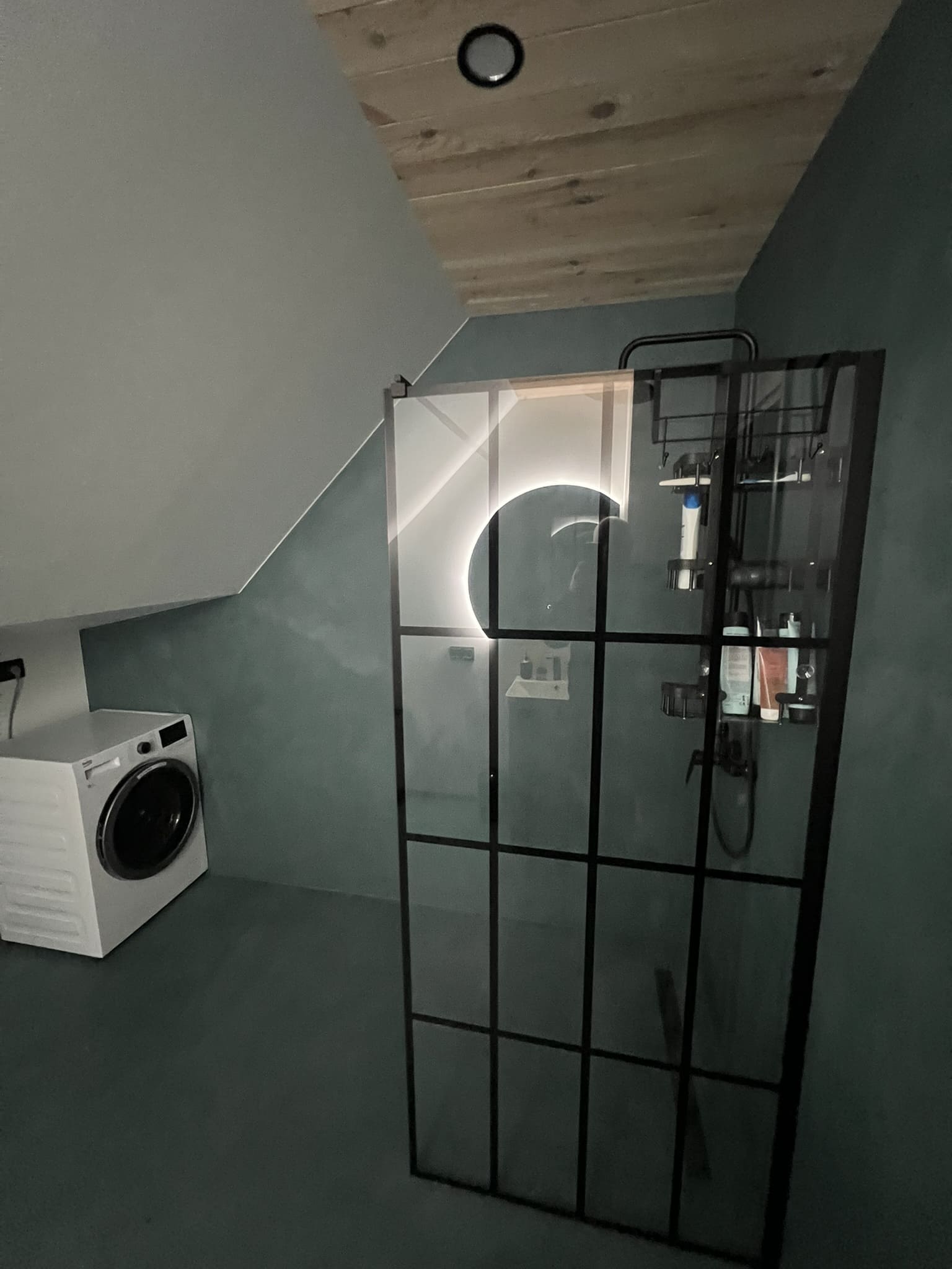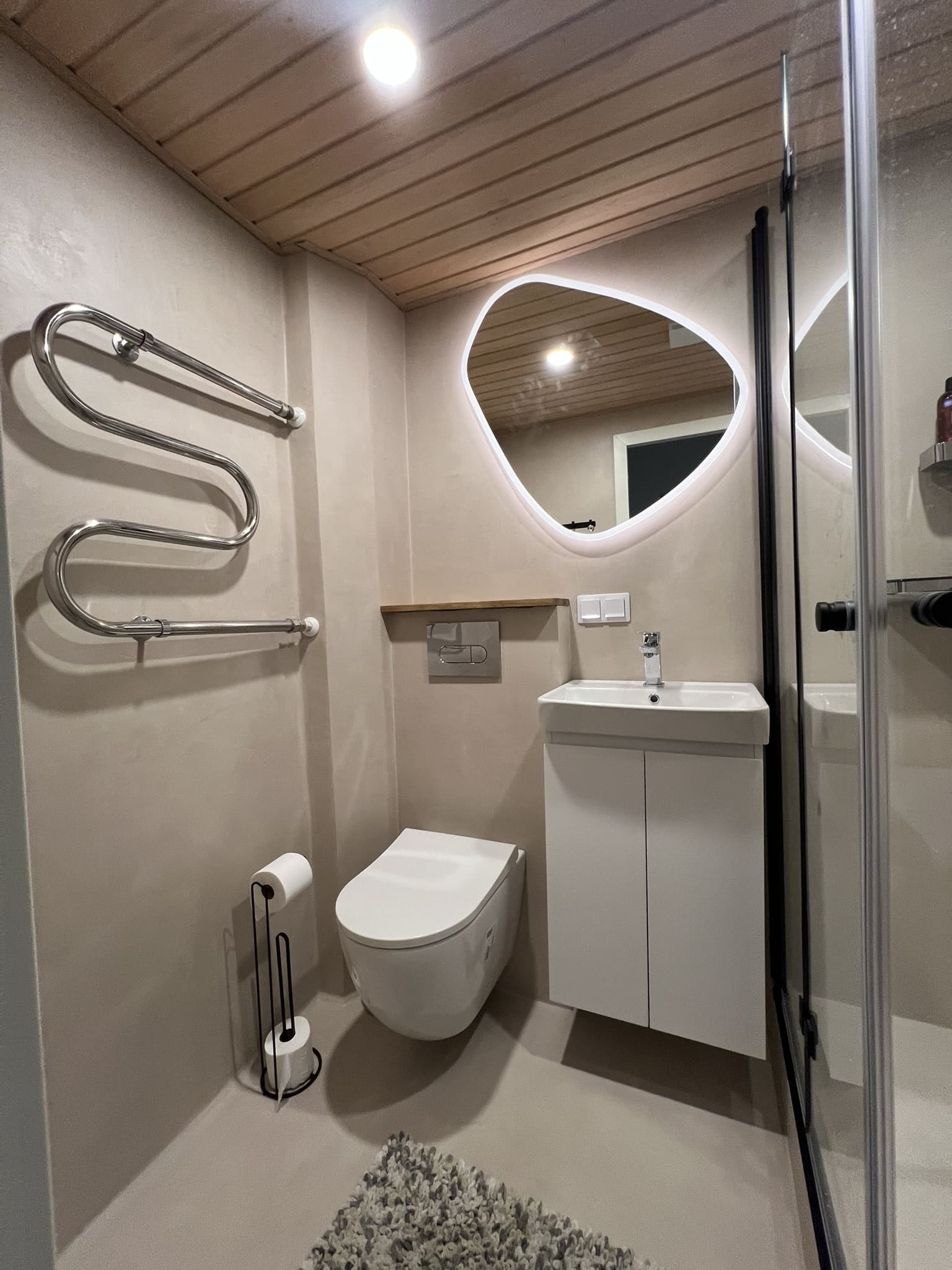 Täislahendusena valminud 2,5 m2 põrandapinnaga  duširuum, kus sai üle võetud poolik töö.  Lakke sanglepp, põrand ja seinad mikrotsemendiga, mida on lihtne hooldada. Toon Basebeton Duhe.