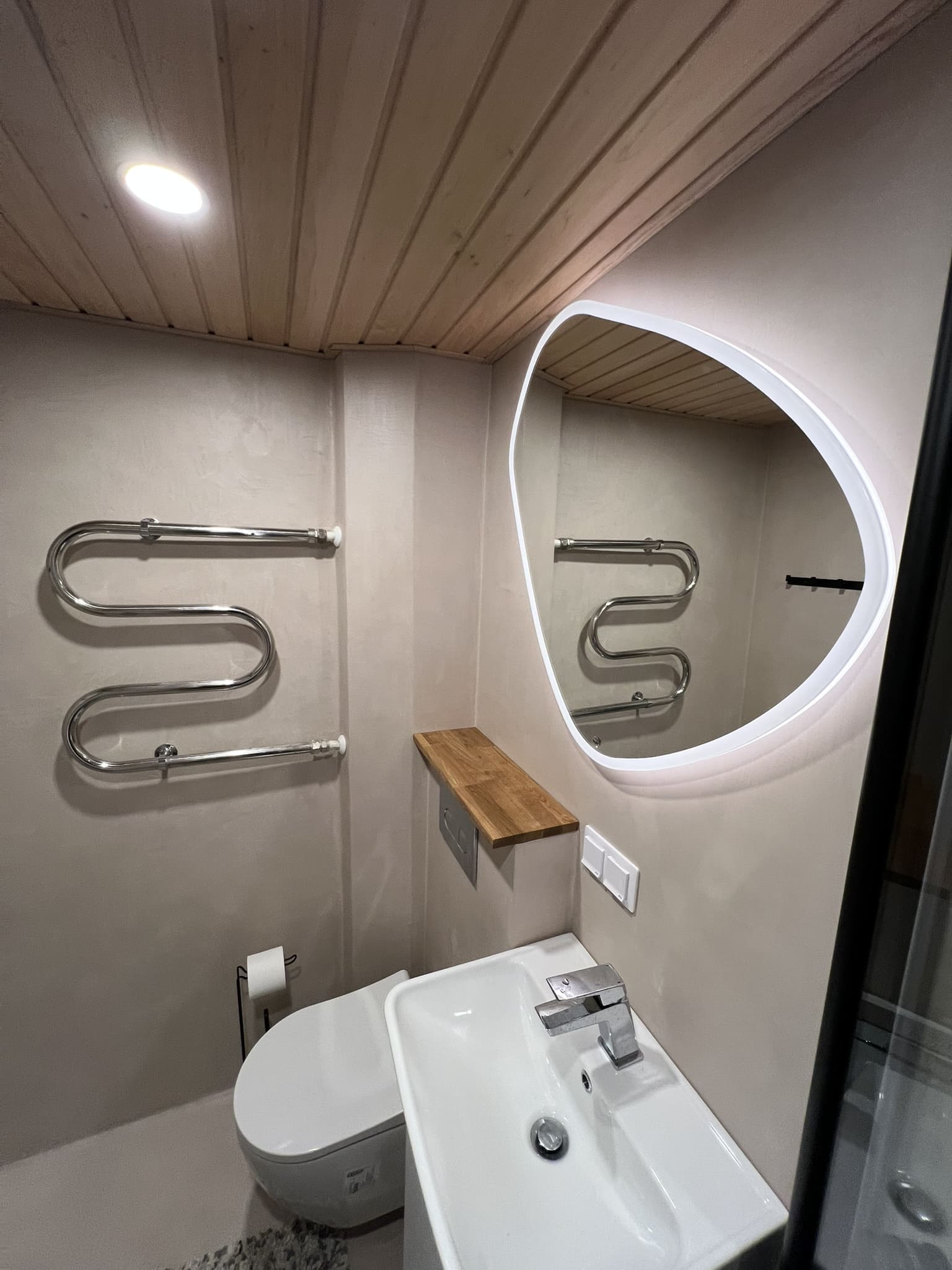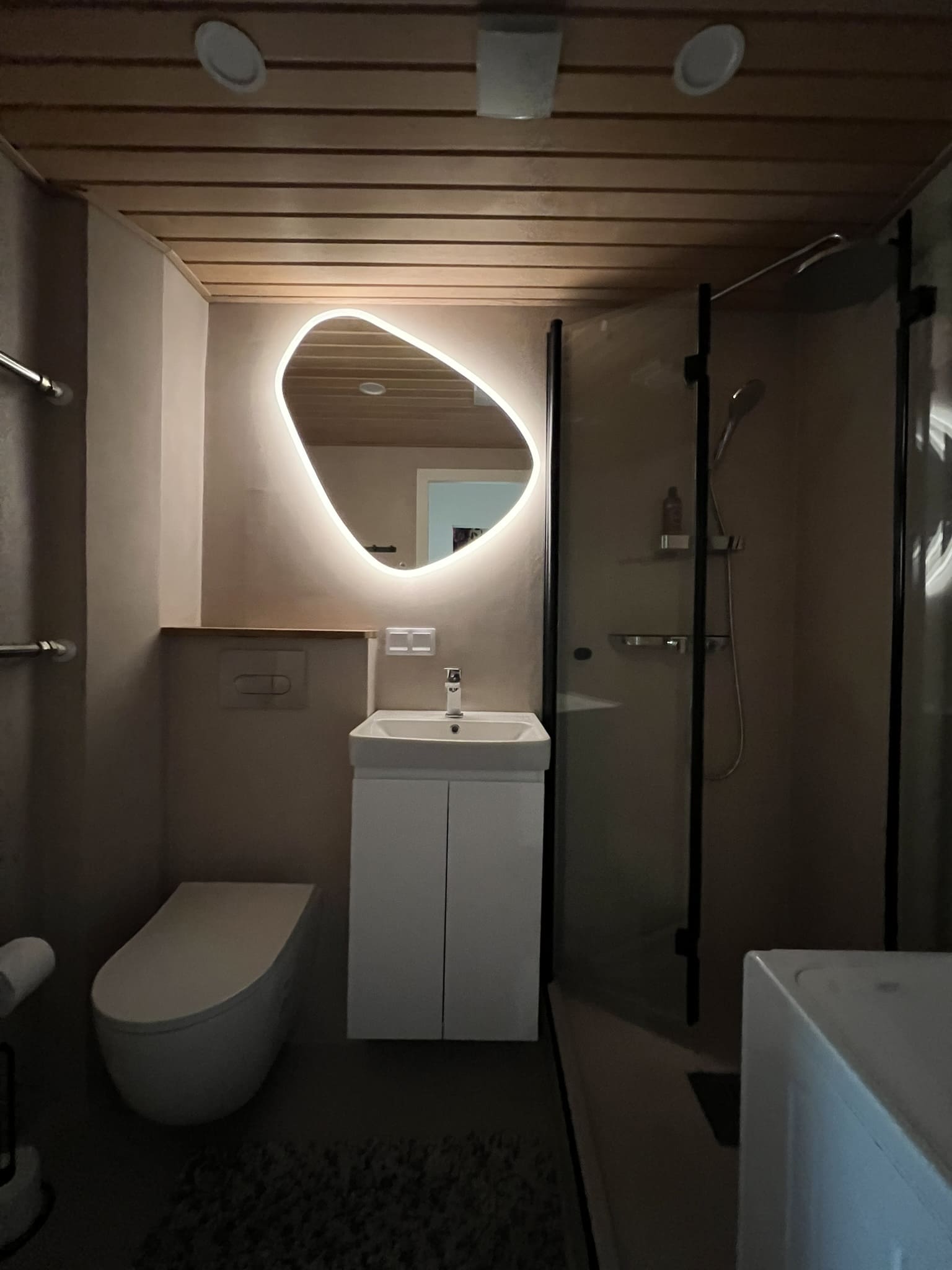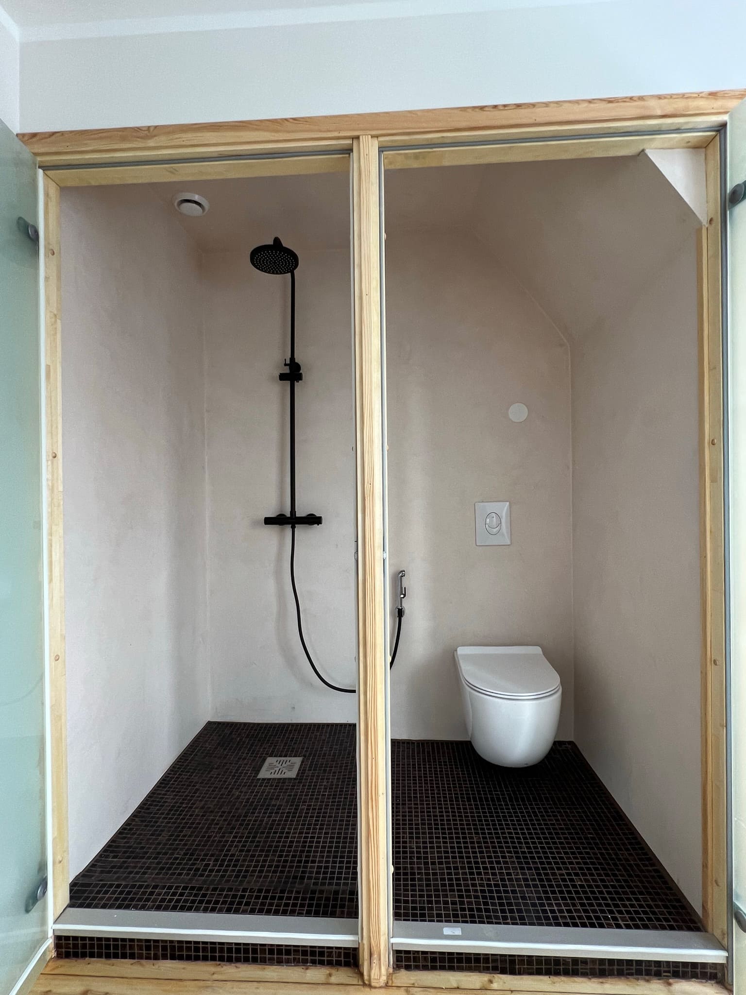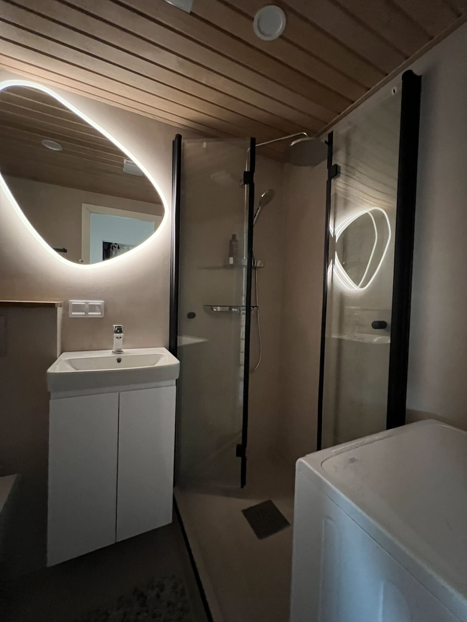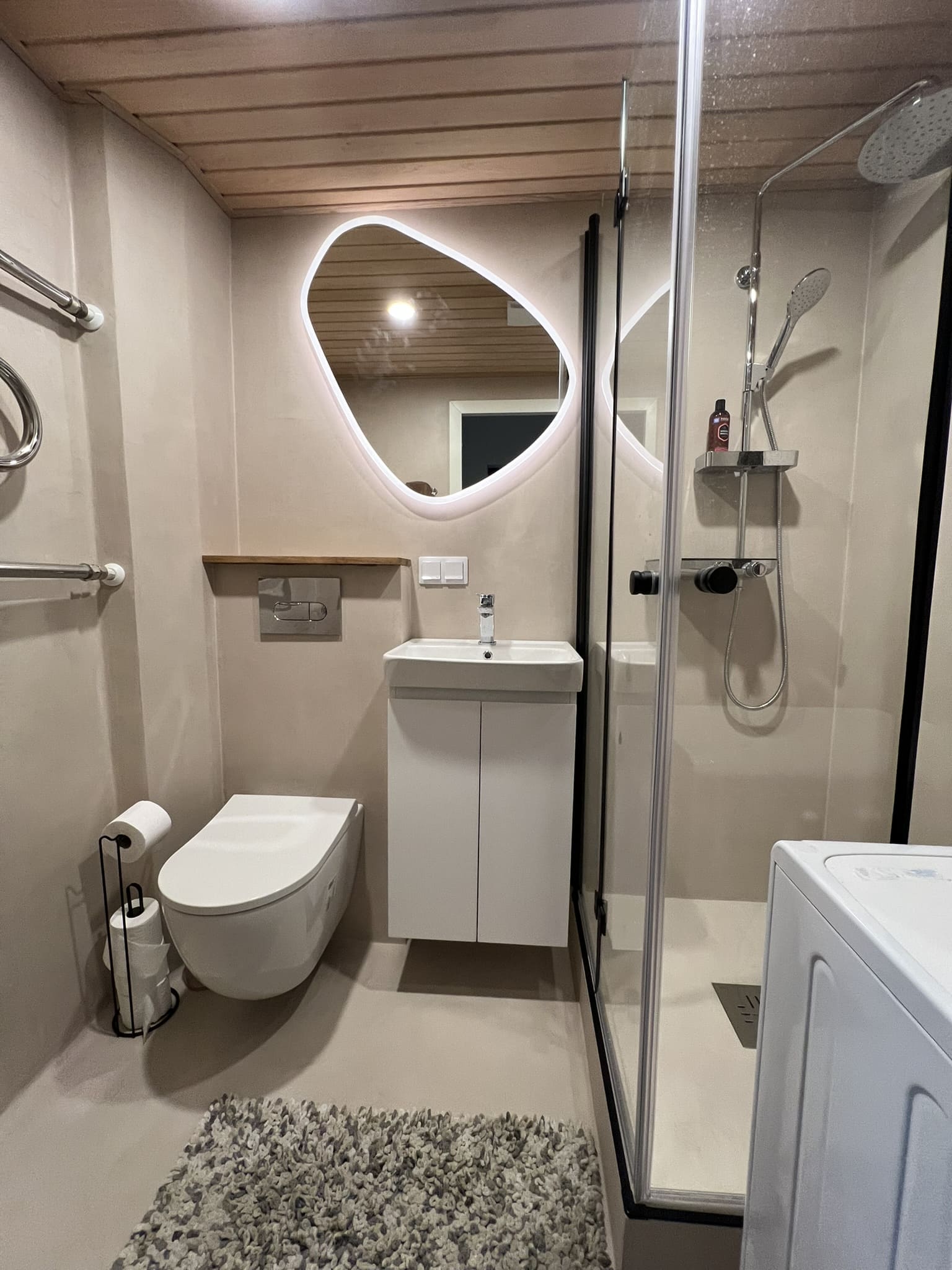 Täislahendusena valminud 2,5 m2 põrandapinnaga  duširuum, kus sai üle võetud poolik töö.  Lakke sanglepp, põrand ja seinad mikrotsemendiga, mida on lihtne hooldada. Toon Basebeton Duhe.