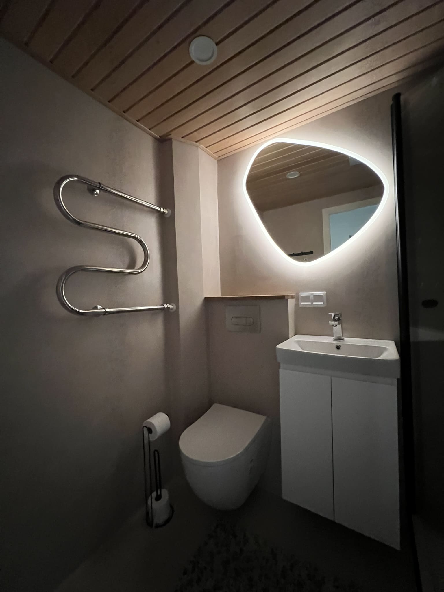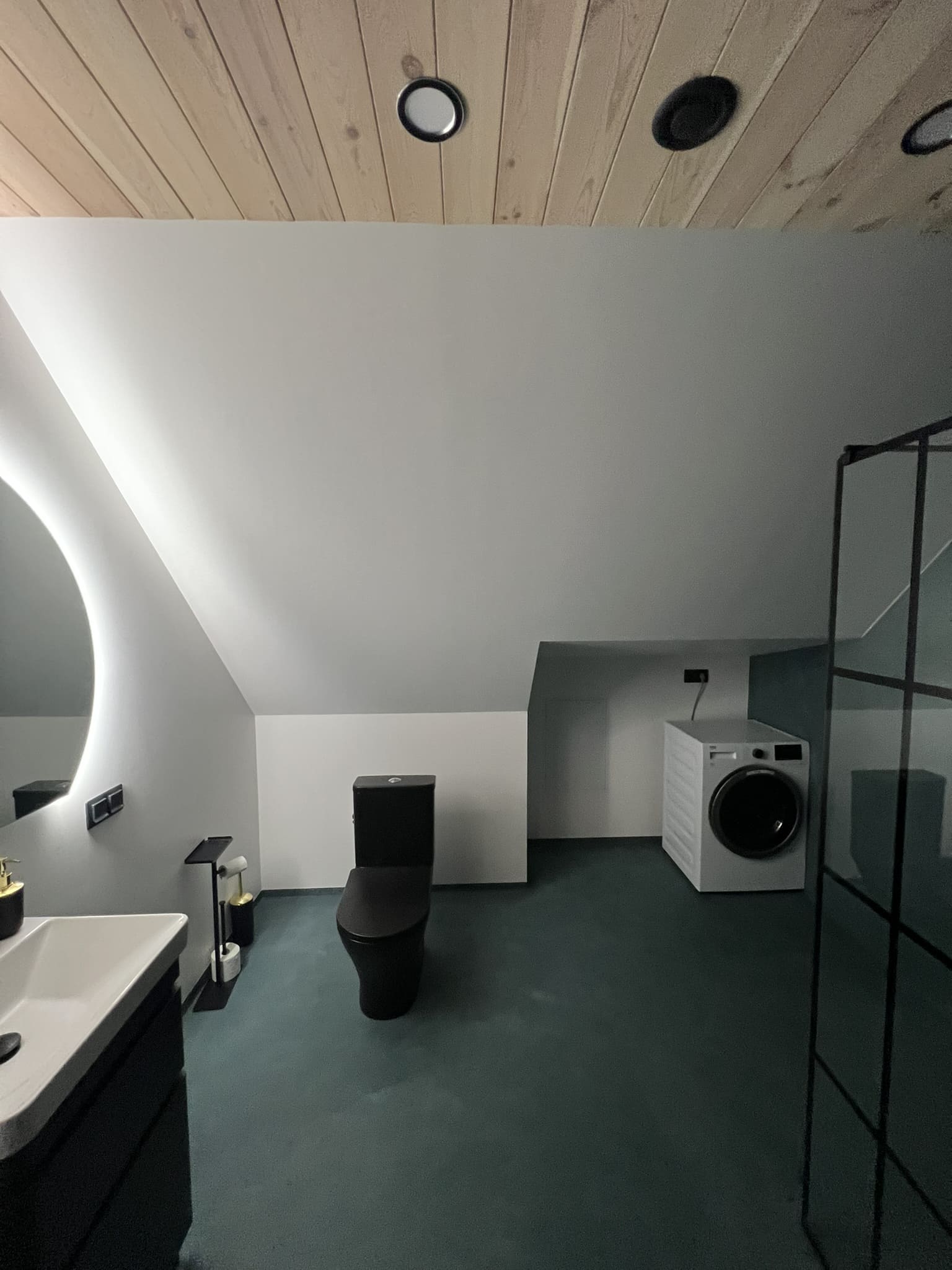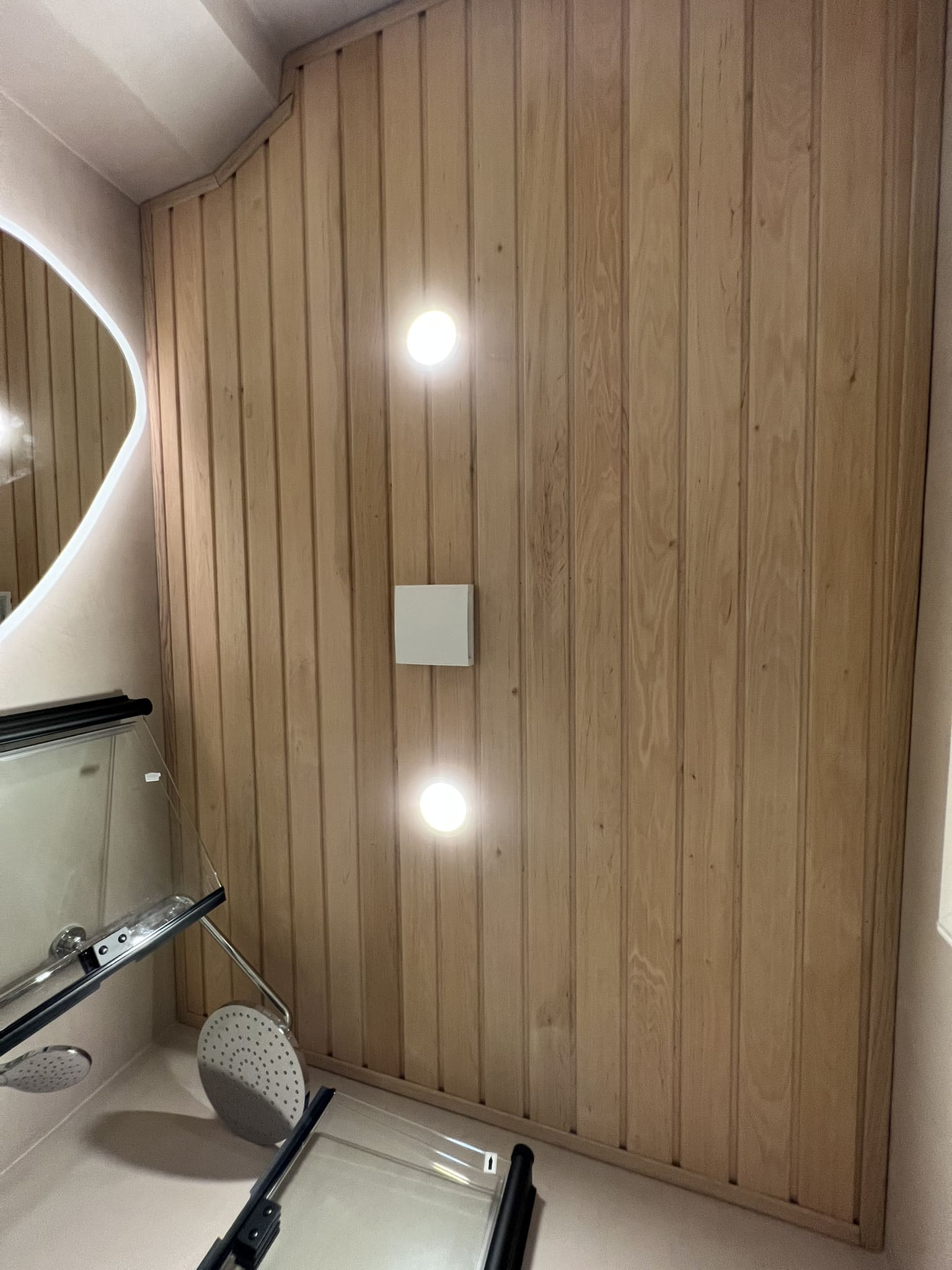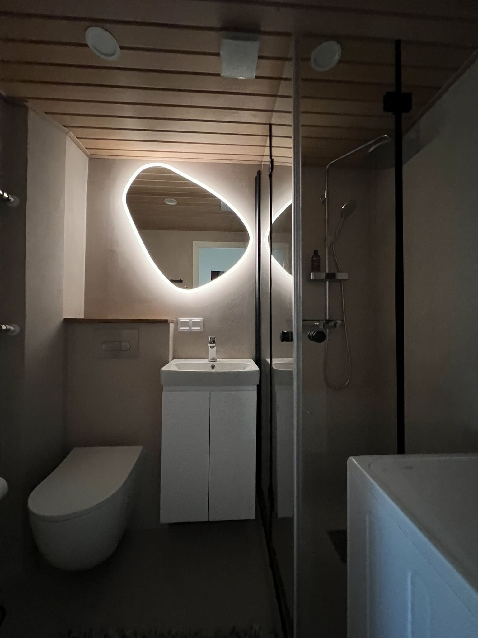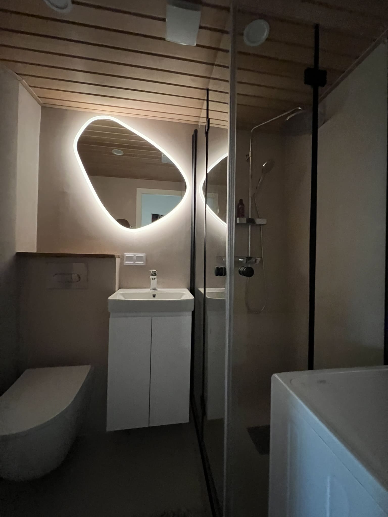 Täislahendusena valminud 2,5 m2 põrandapinnaga  duširuum, kus sai üle võetud poolik töö.  Lakke sanglepp, põrand ja seinad mikrotsemendiga, mida on lihtne hooldada. Toon Basebeton Duhe.