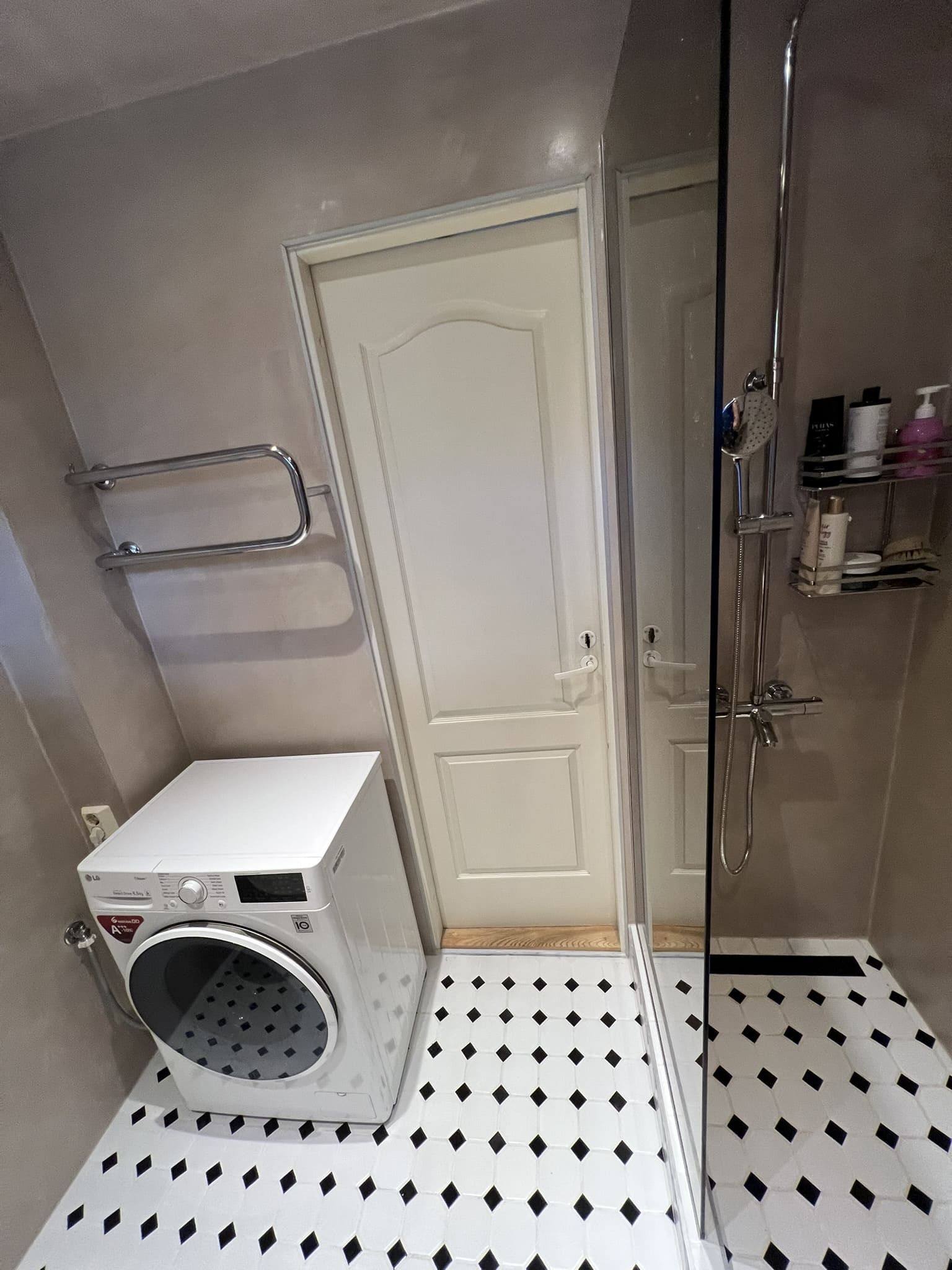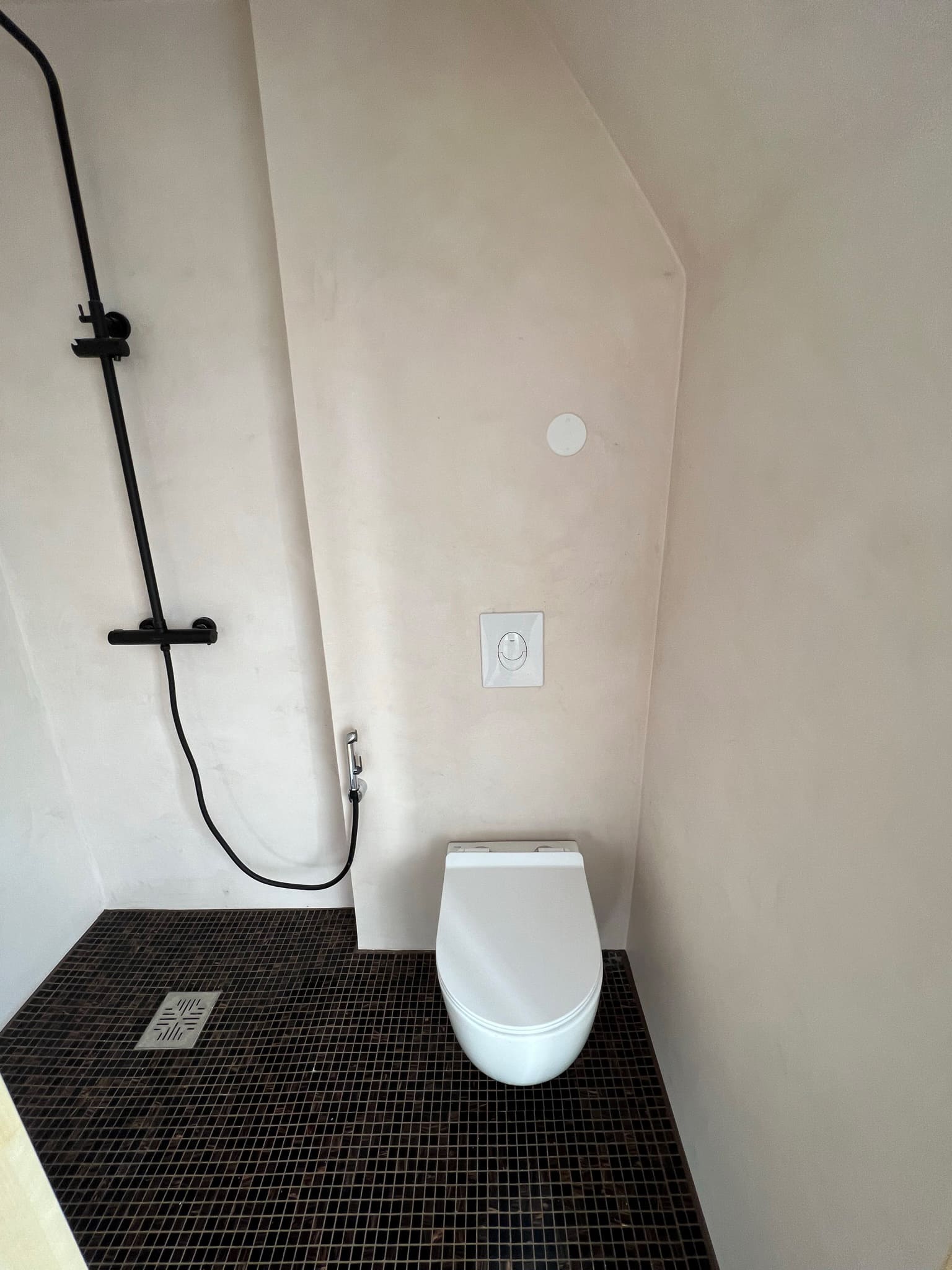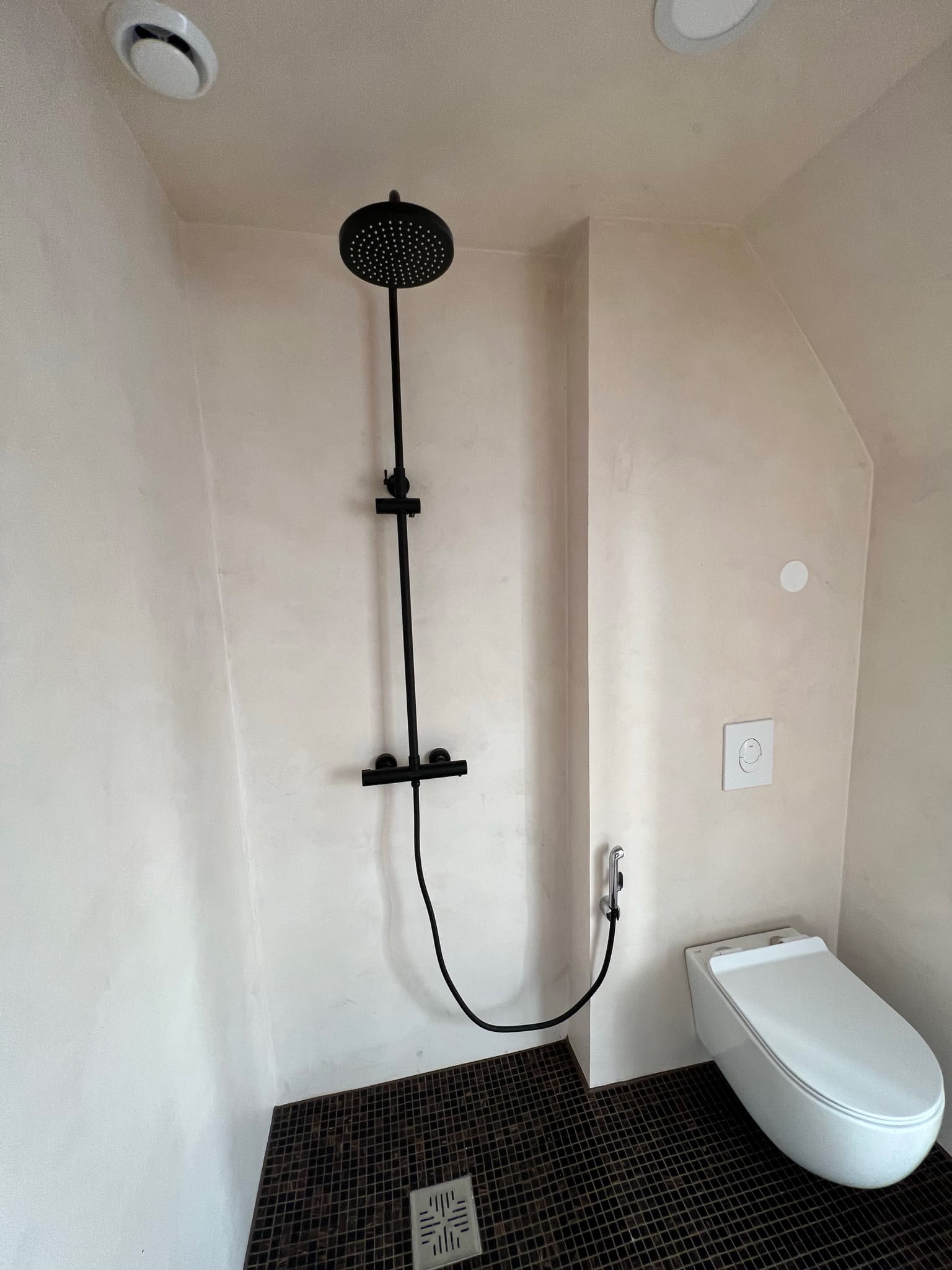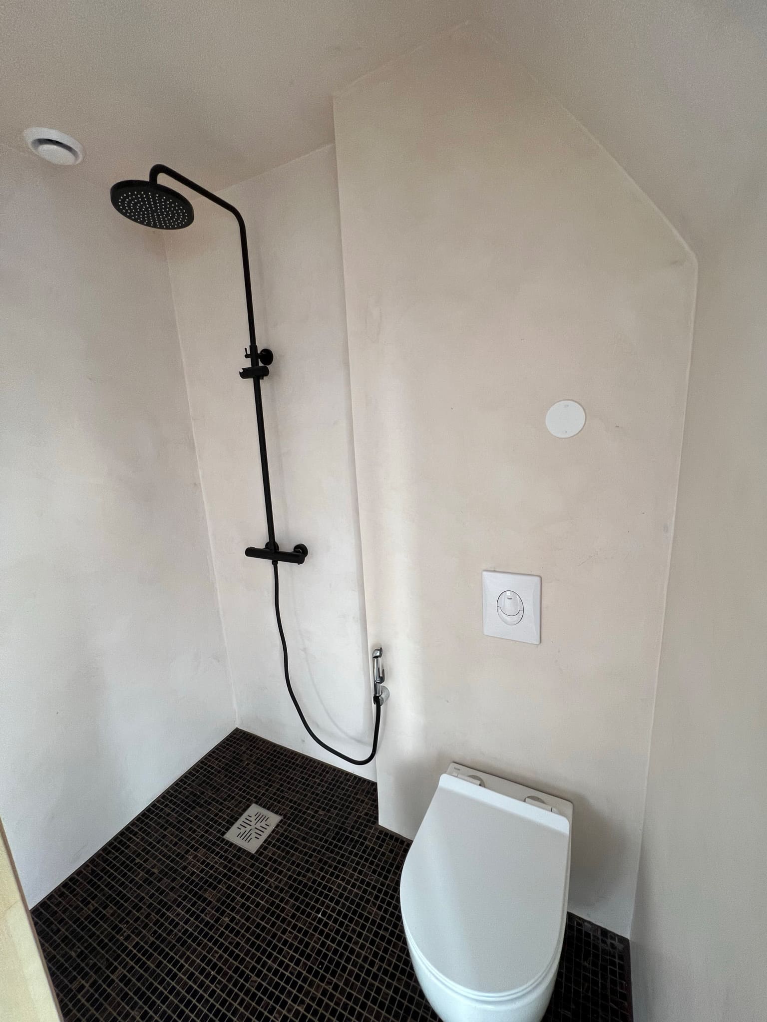 Klient avaldas soovi teha uuenduskuur duširuumile. Valutumalt saab seda teha mikrotsementi kandes otse olemasolevale keraamilisele plaadile. Klient soovis vabaneda vannist ning asemele tehtaks dušinurk. Lammutusele läks metallpaneelidest lagi, mille asendasime kipsist ripplaega, mis omakorda kaeti mikrotsemendiga. Kasutatud on kahte mikrotsemendi tooni otse seinale Basebeton Rosered ja küljed ja lagi Basebeton Dust, põrandale läks pentagon klinker mosaiikplaat.