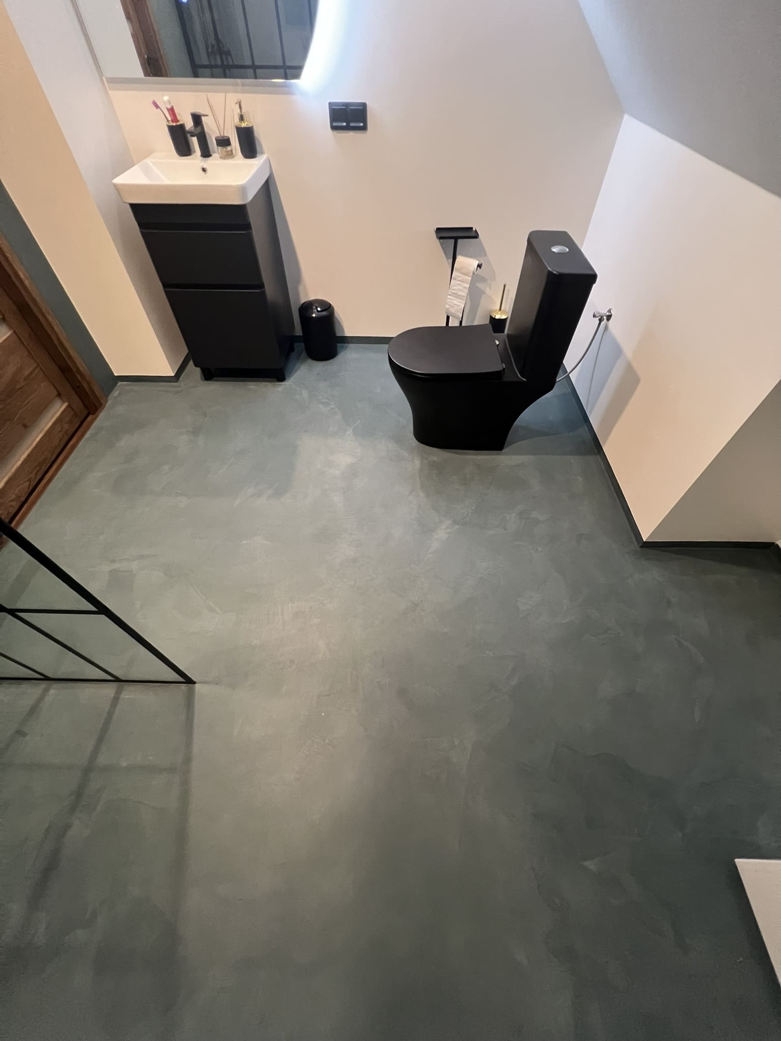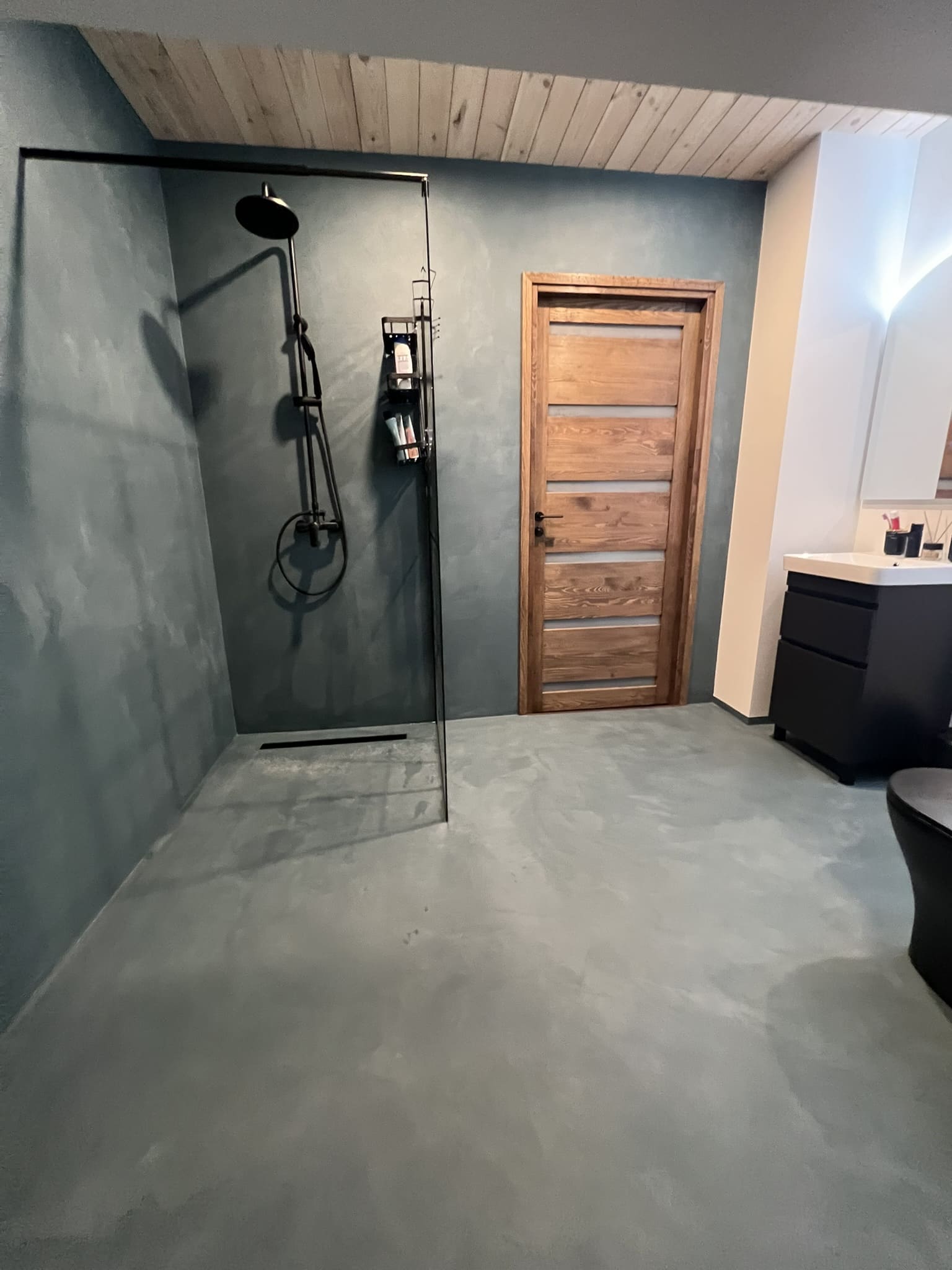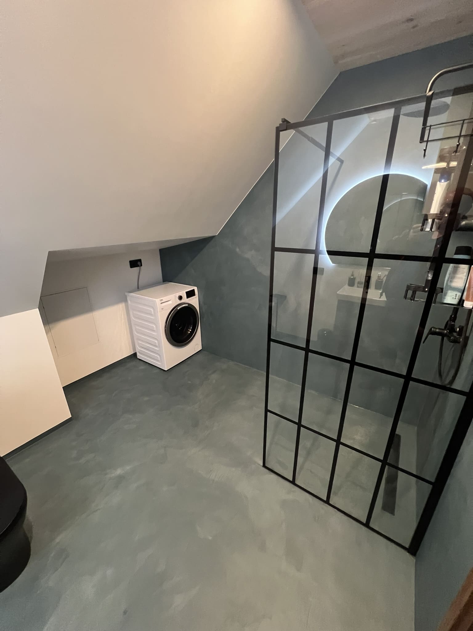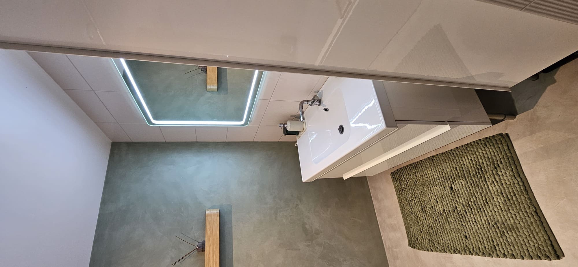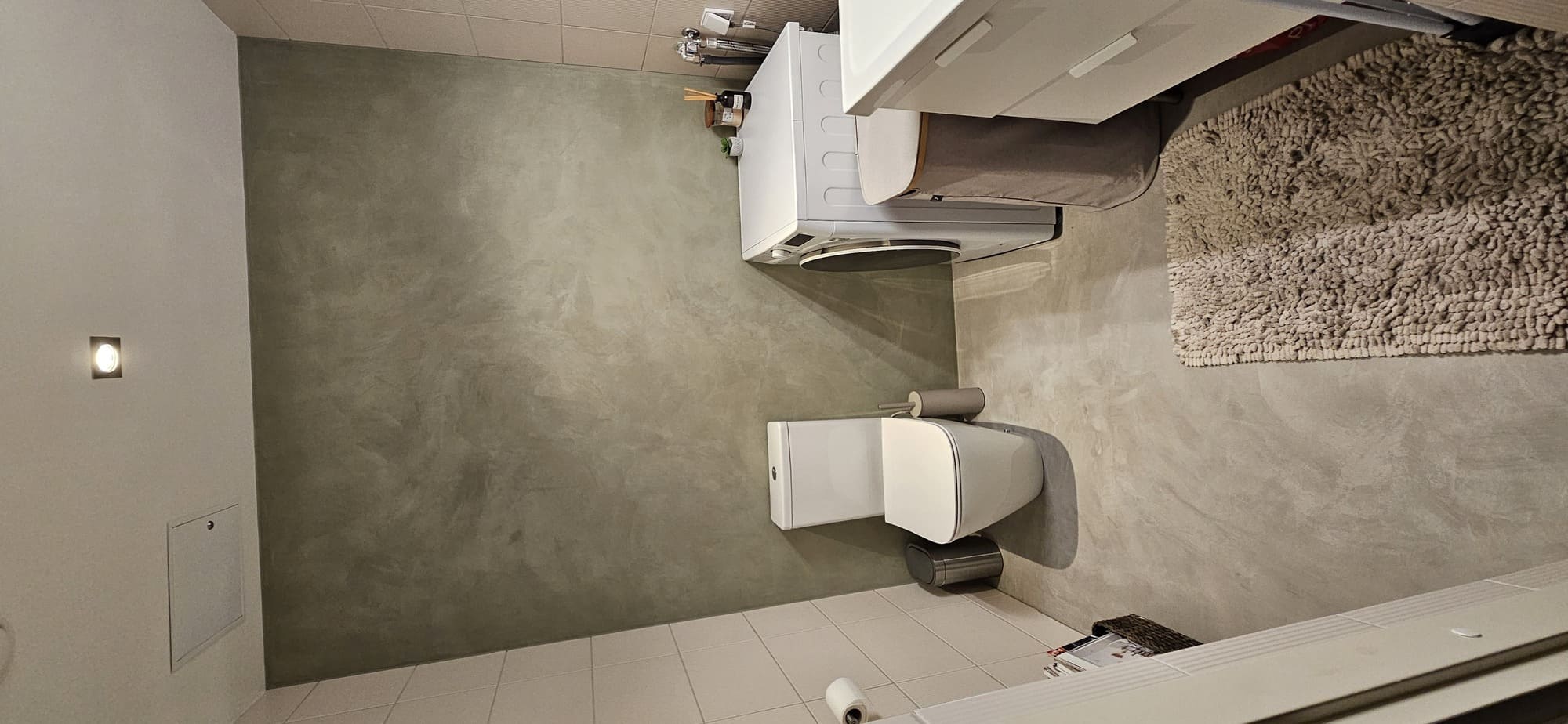 Kahe tooniga mikrotsemendi tööd on alati huvitavad. Mikrotsement paigaldati olemasoleva keraamilisele plaadile. Toon Basebeton Jade (sein), Basebeton Mouse ( põrand).