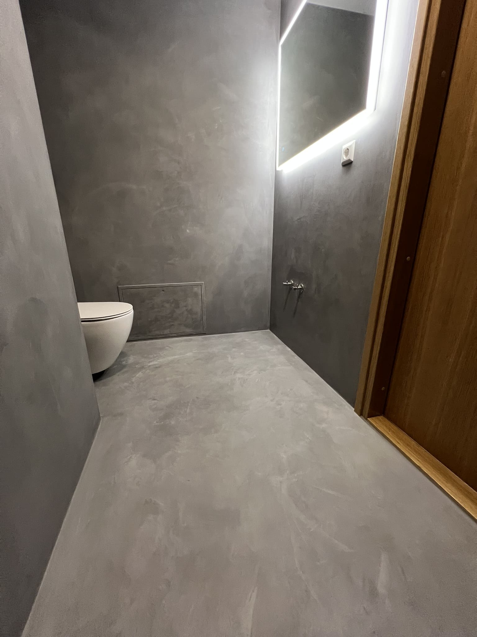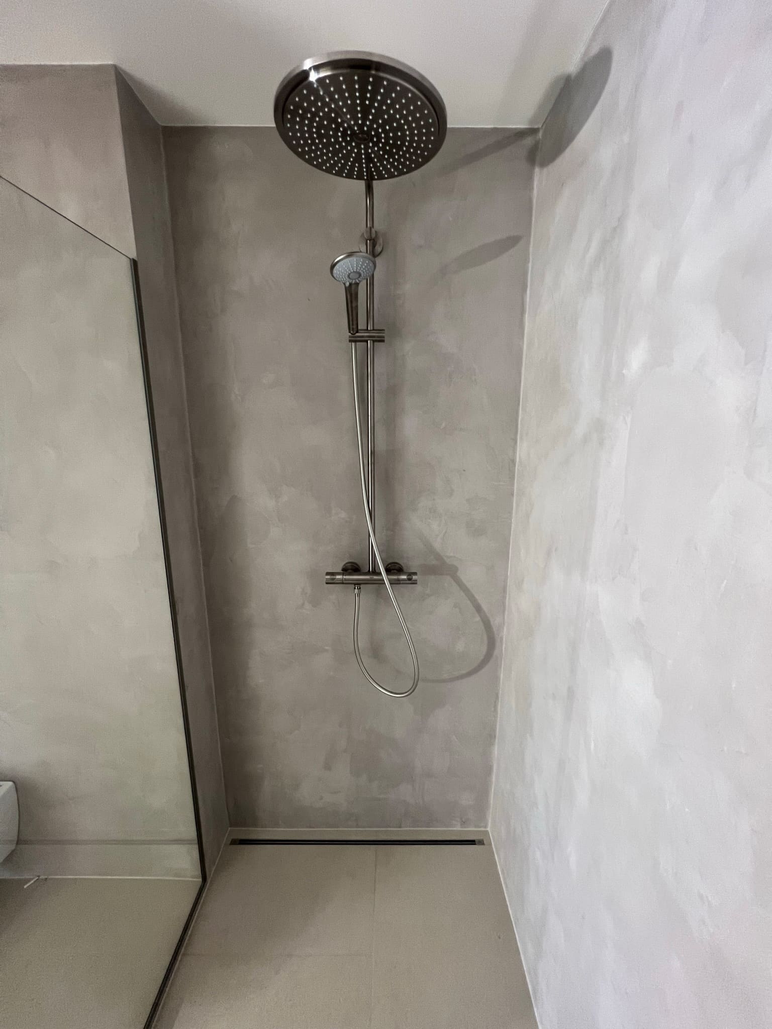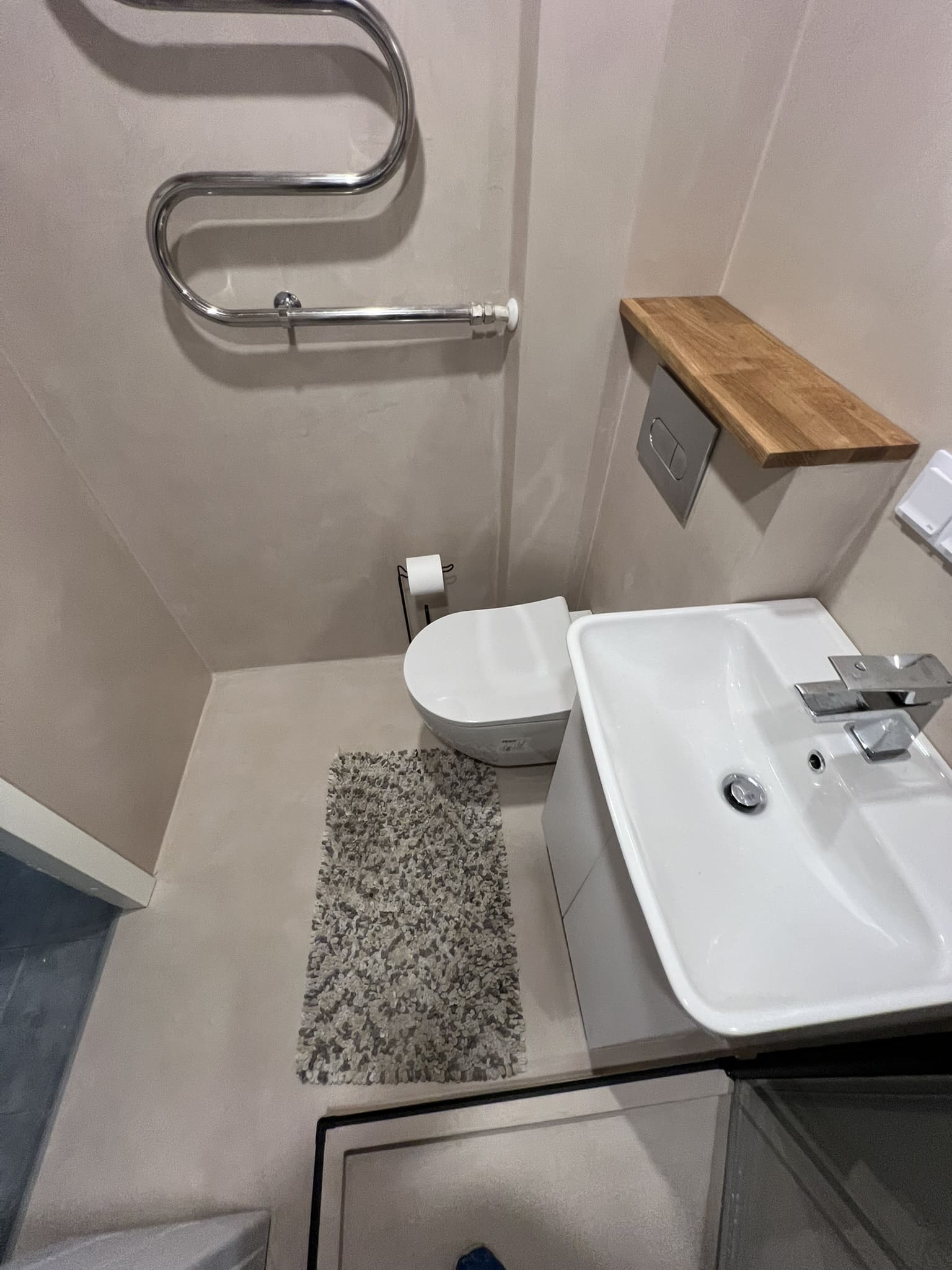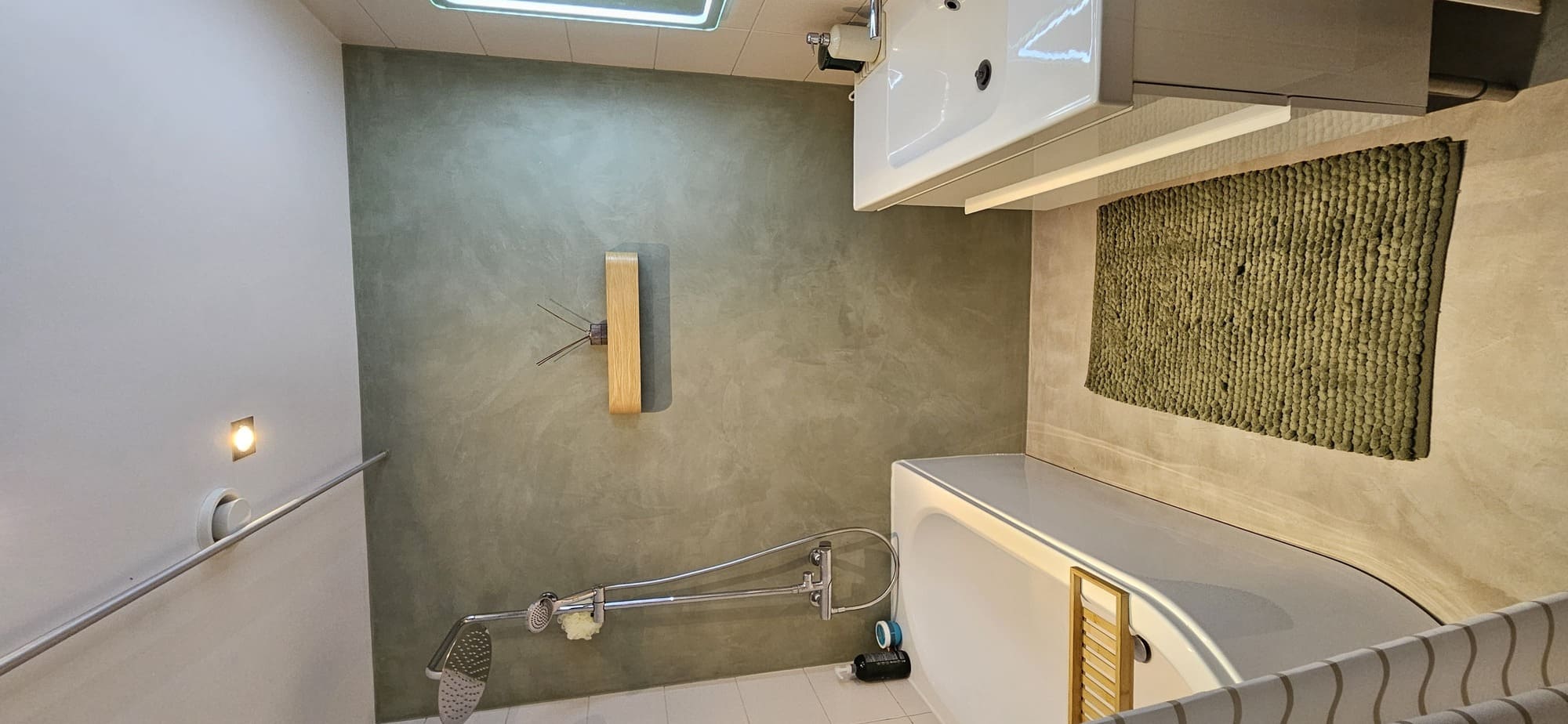 Kahe tooniga mikrotsemendi tööd on alati huvitavad. Mikrotsement paigaldati olemasoleva keraamilisele plaadile. Toon Basebeton Jade (sein), Basebeton Mouse ( põrand).