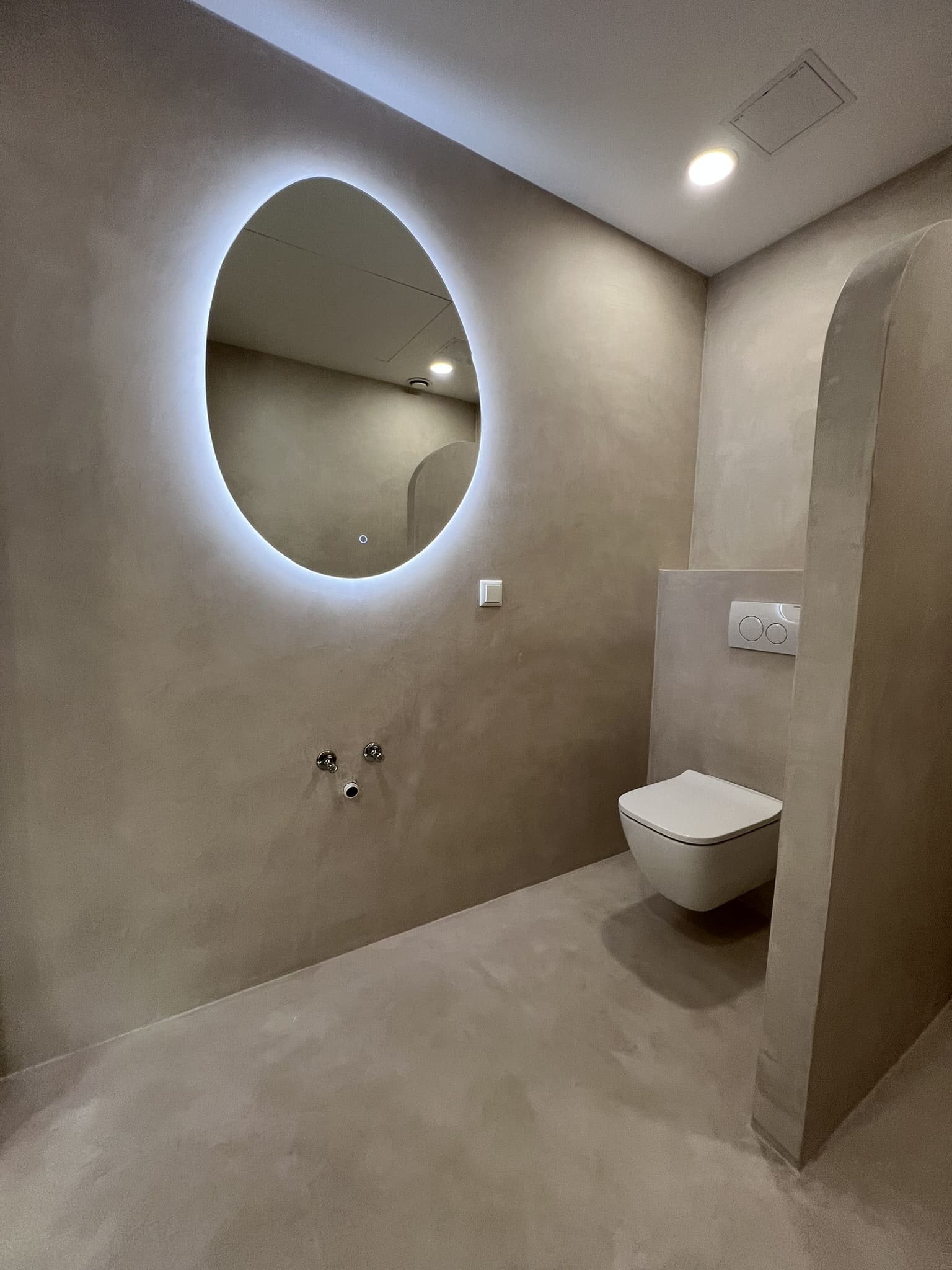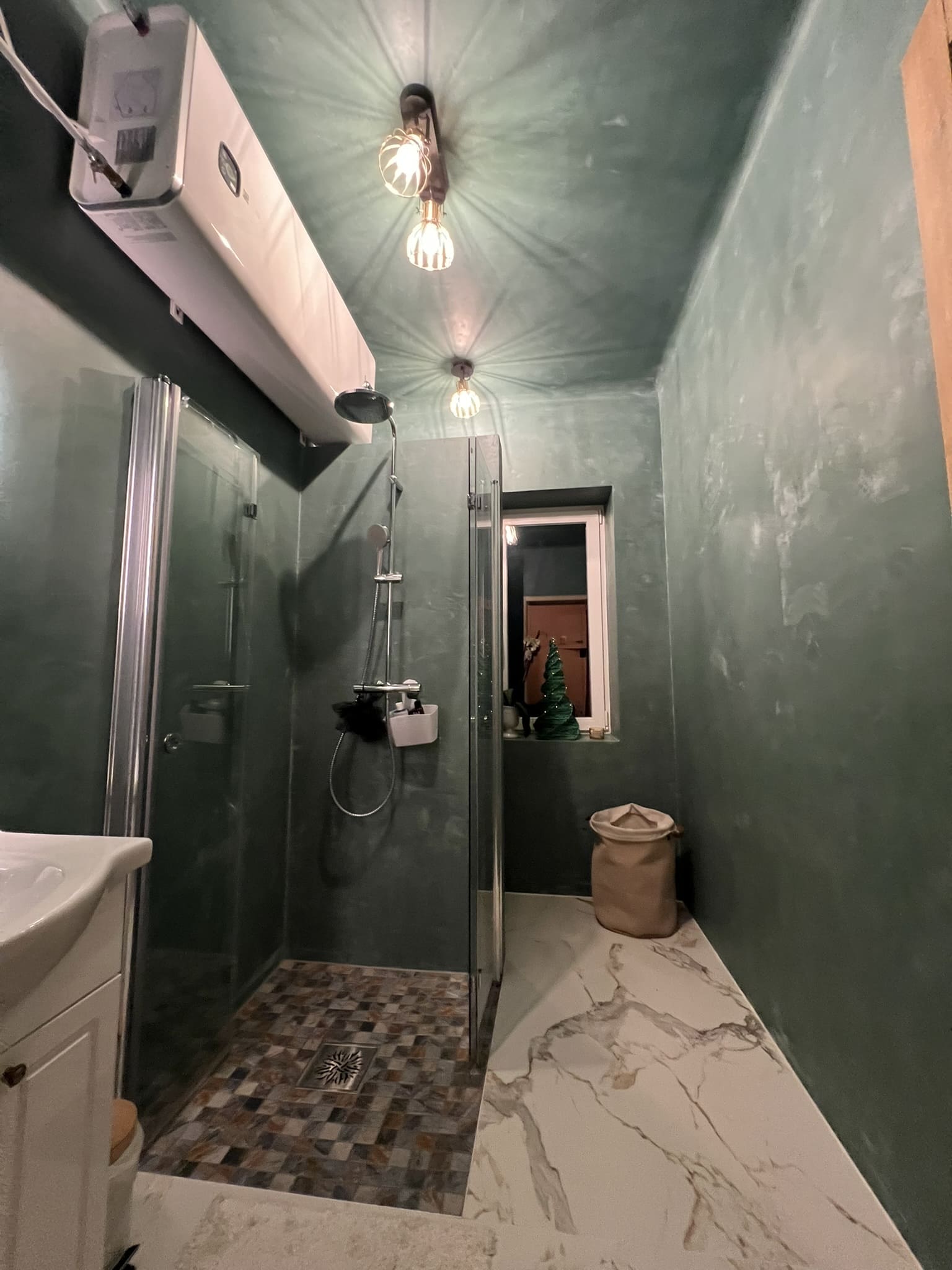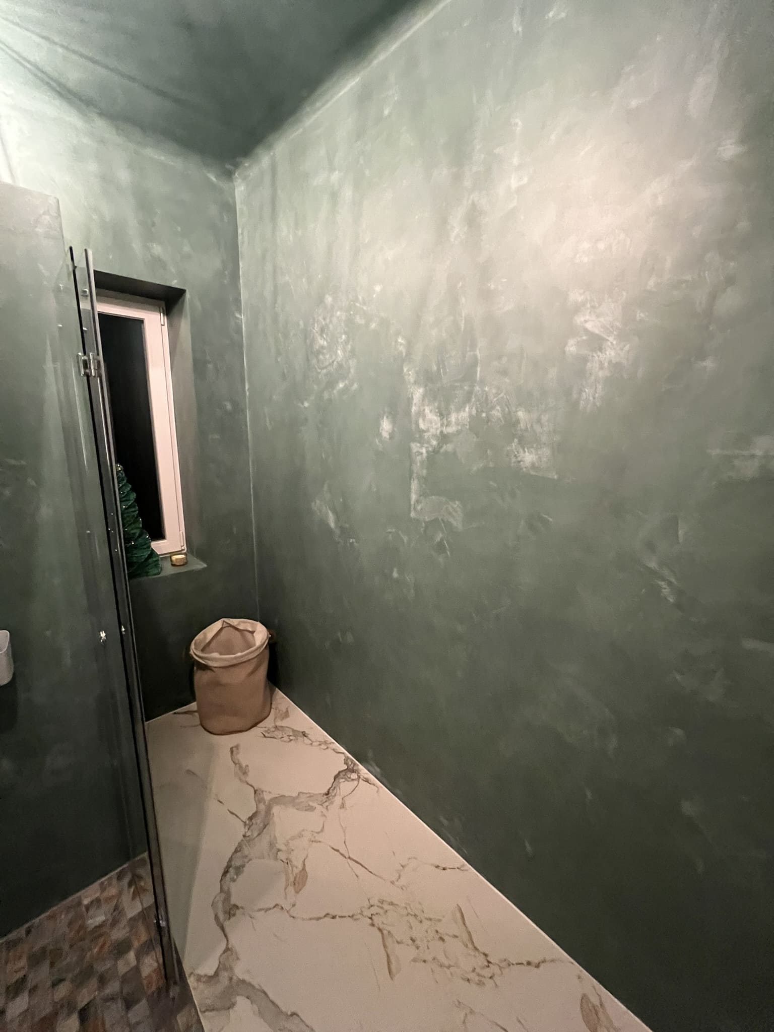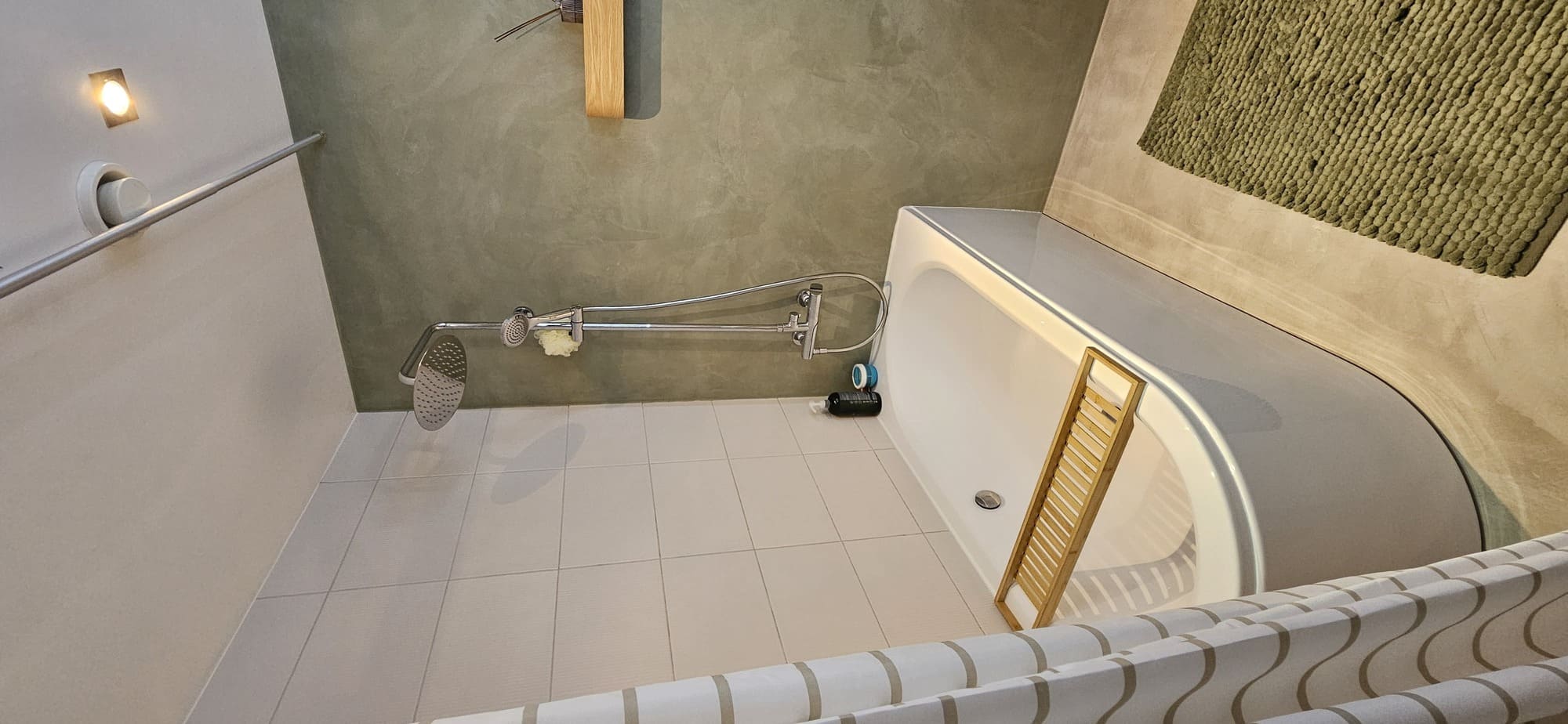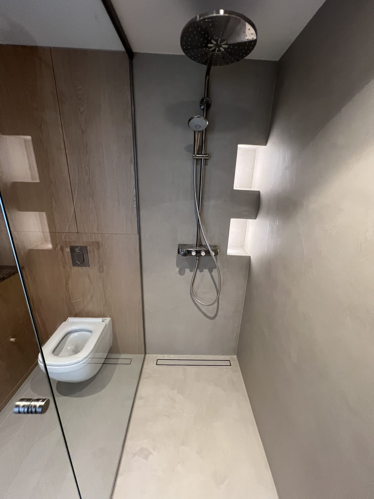 Kahe tooniga mikrotsemendi tööd on alati huvitavad. Mikrotsement paigaldati olemasoleva keraamilisele plaadile. Toon Basebeton Jade (sein), Basebeton Mouse ( põrand).