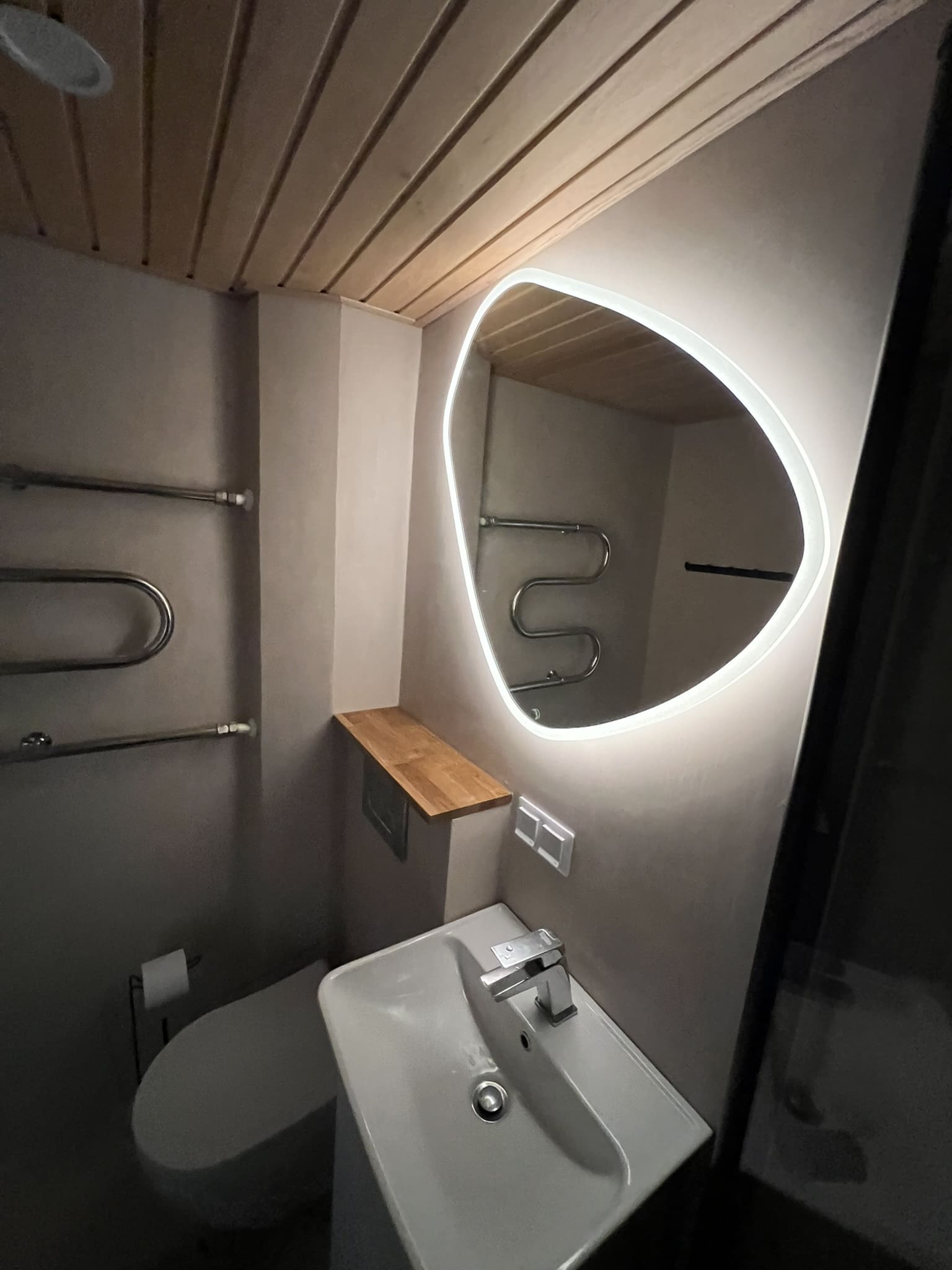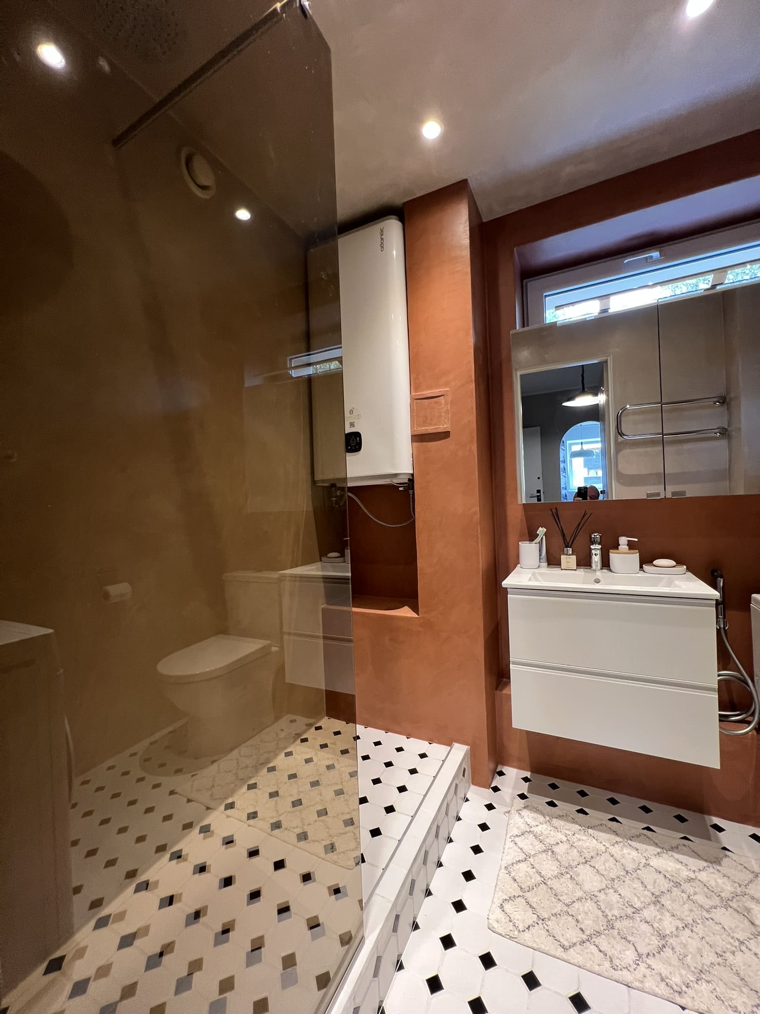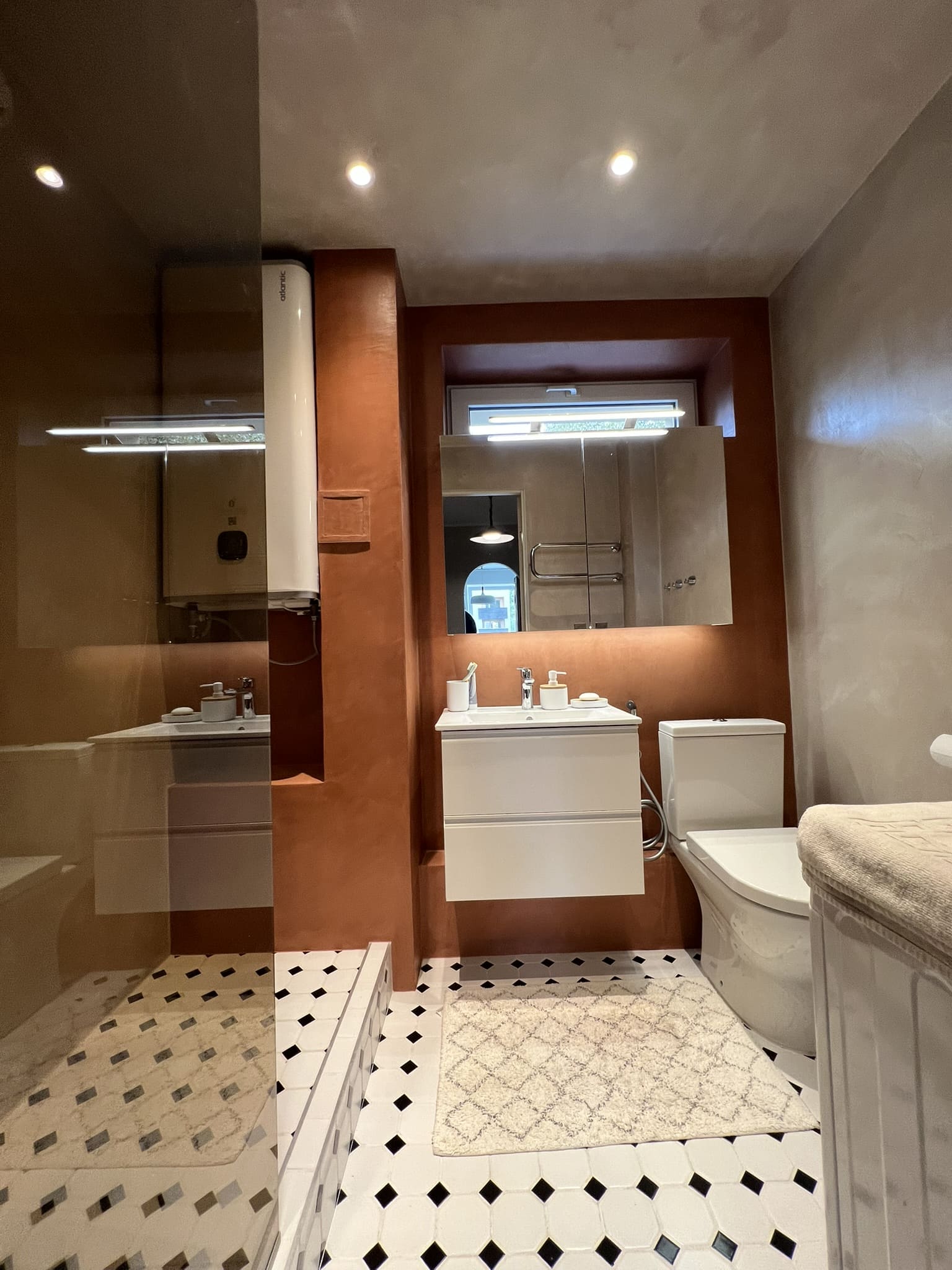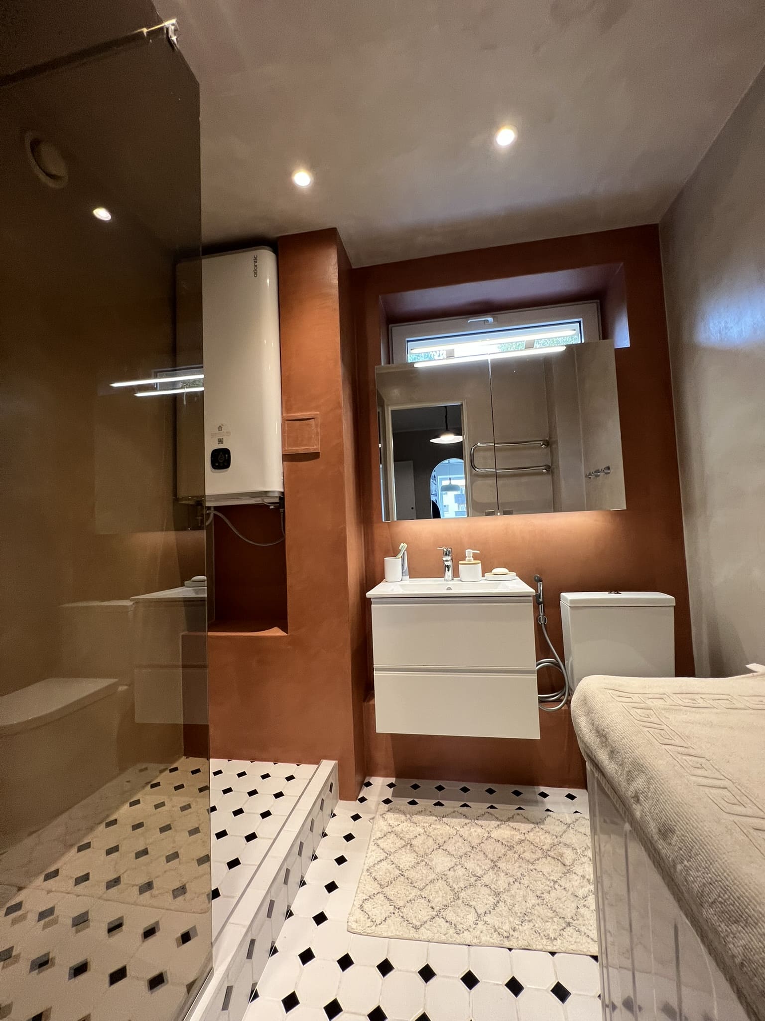 Kahe tooniga mikrotsemendi tööd on alati huvitavad. Mikrotsement paigaldati olemasoleva keraamilisele plaadile. Toon Basebeton Jade (sein), Basebeton Mouse ( põrand).