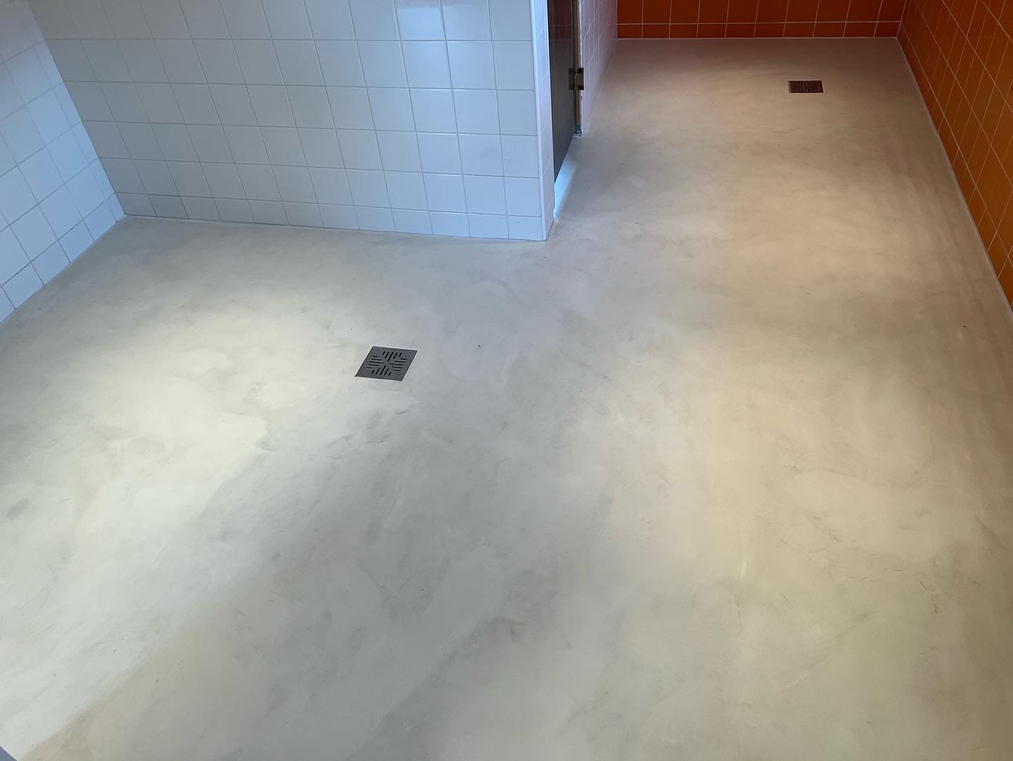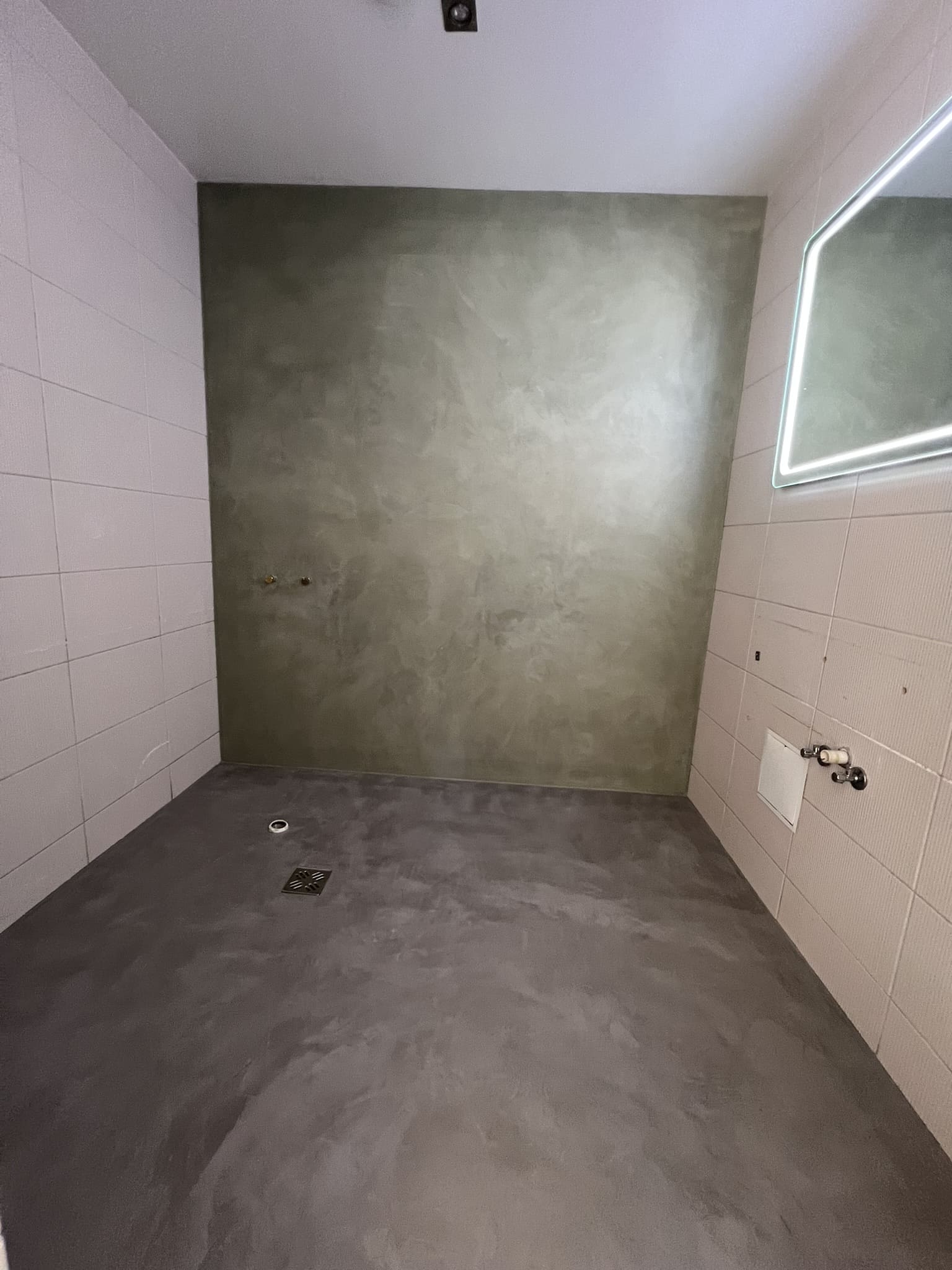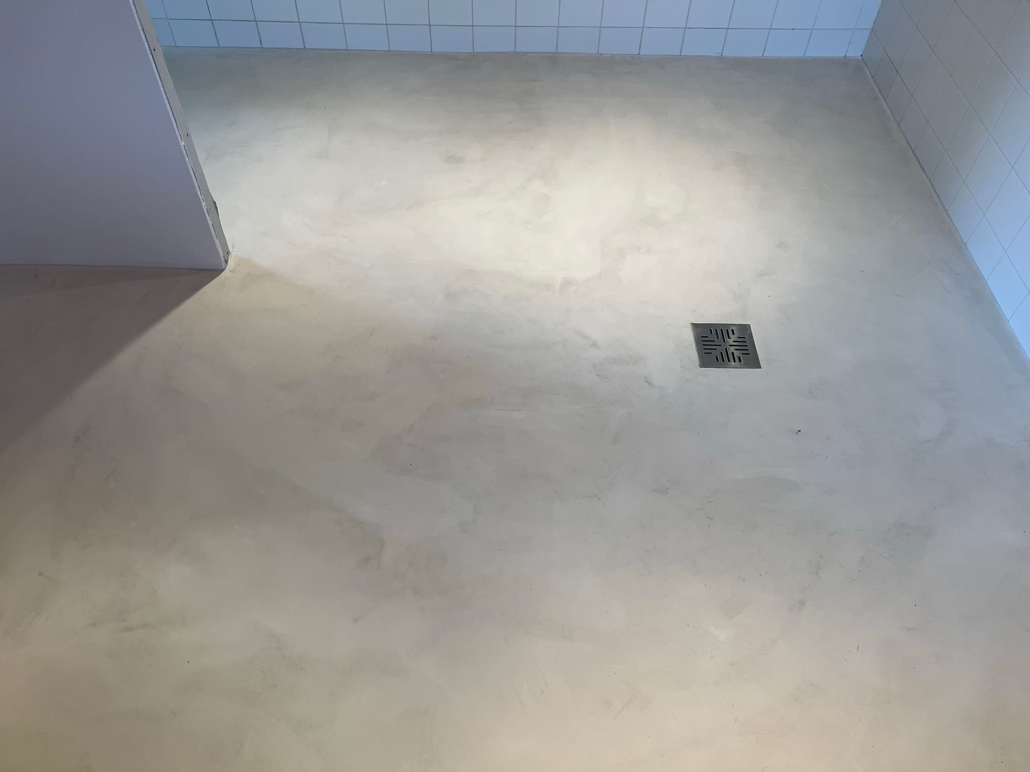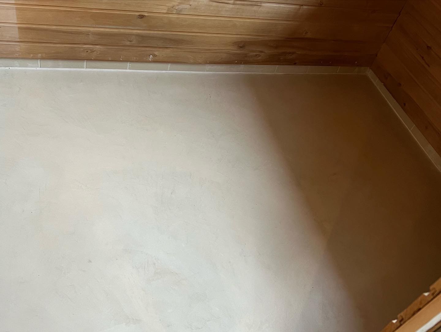 Mikrotsement olemasolevale keraamilisele plaadile. Dušiklaasi asemel tuli vahesein. Toon Basebeton Wheat.