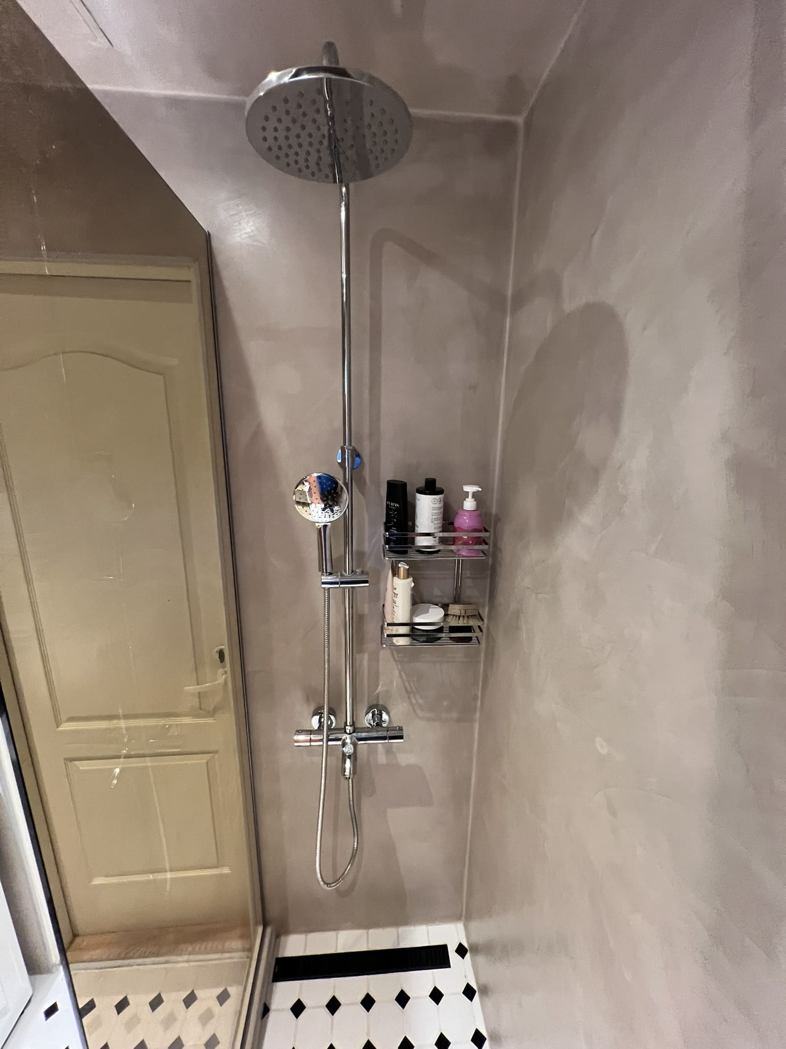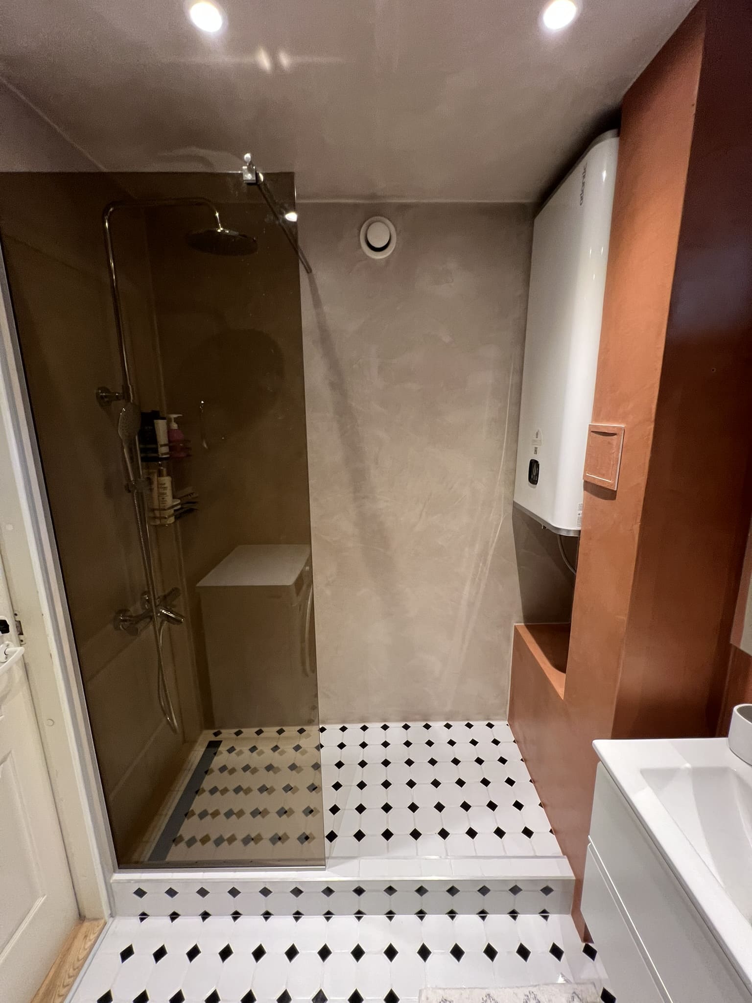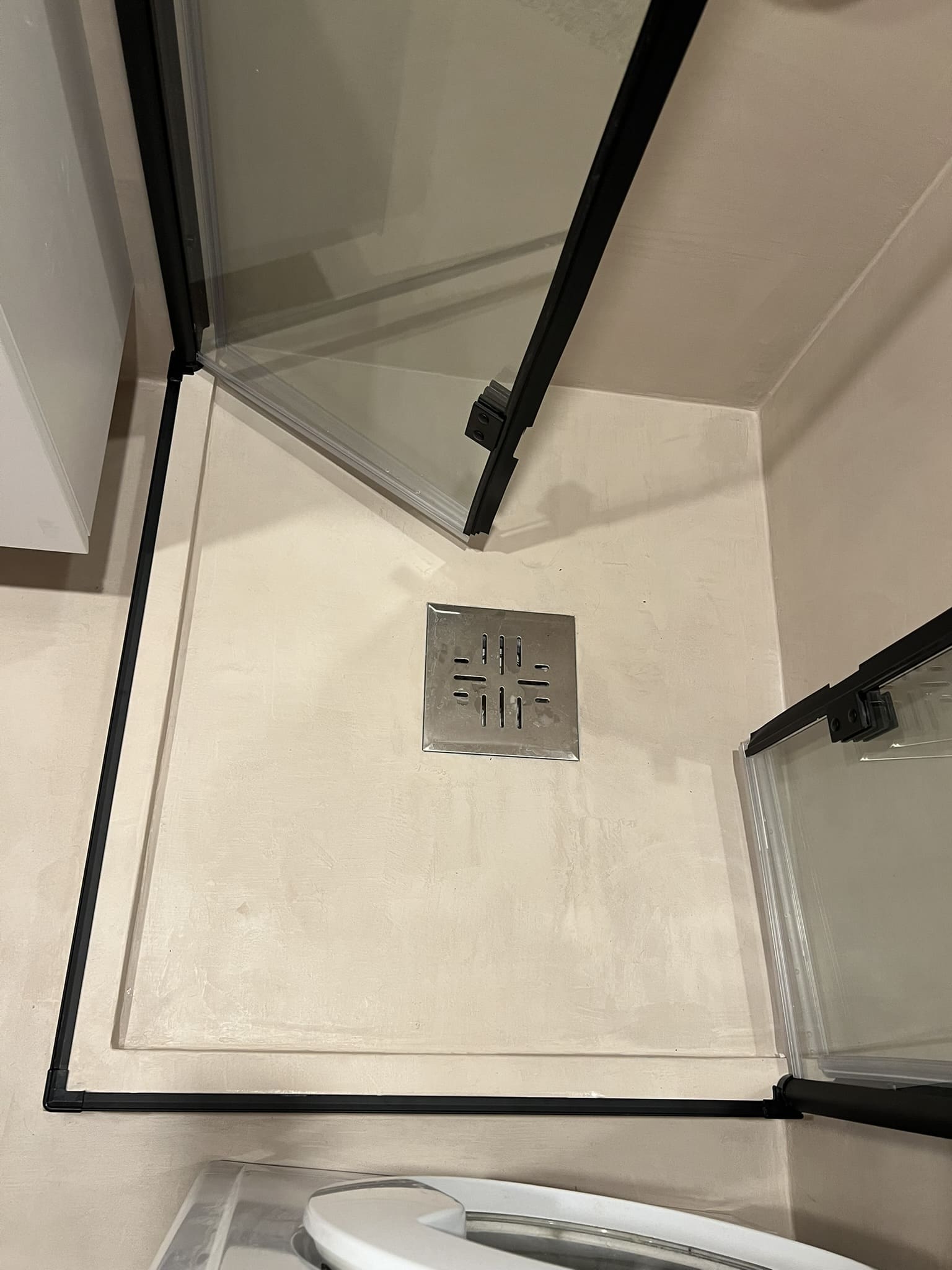 Mikrotsement olemasolevale keraamilisele plaadile. Dušiklaasi asemel tuli vahesein. Toon Basebeton Wheat.