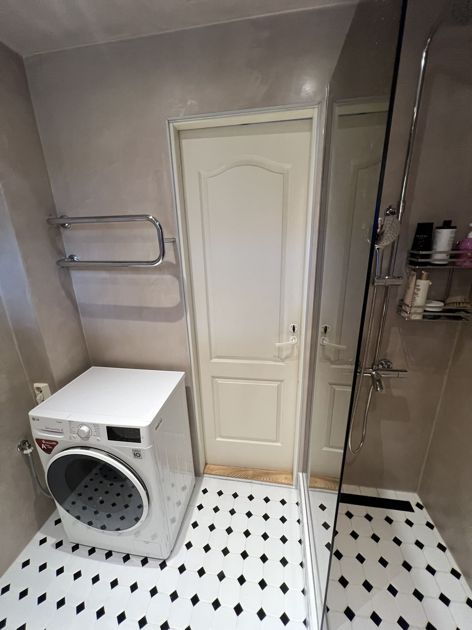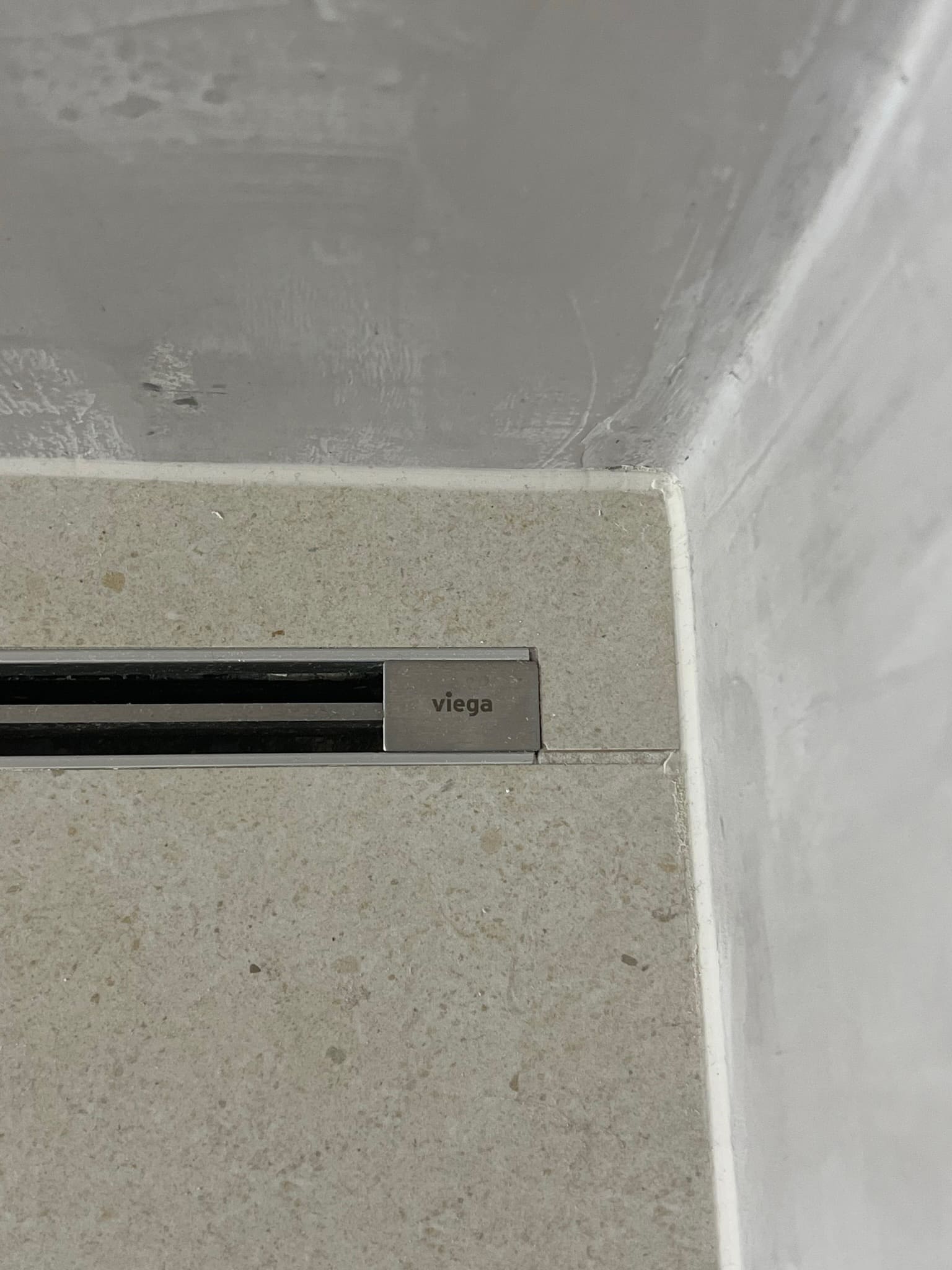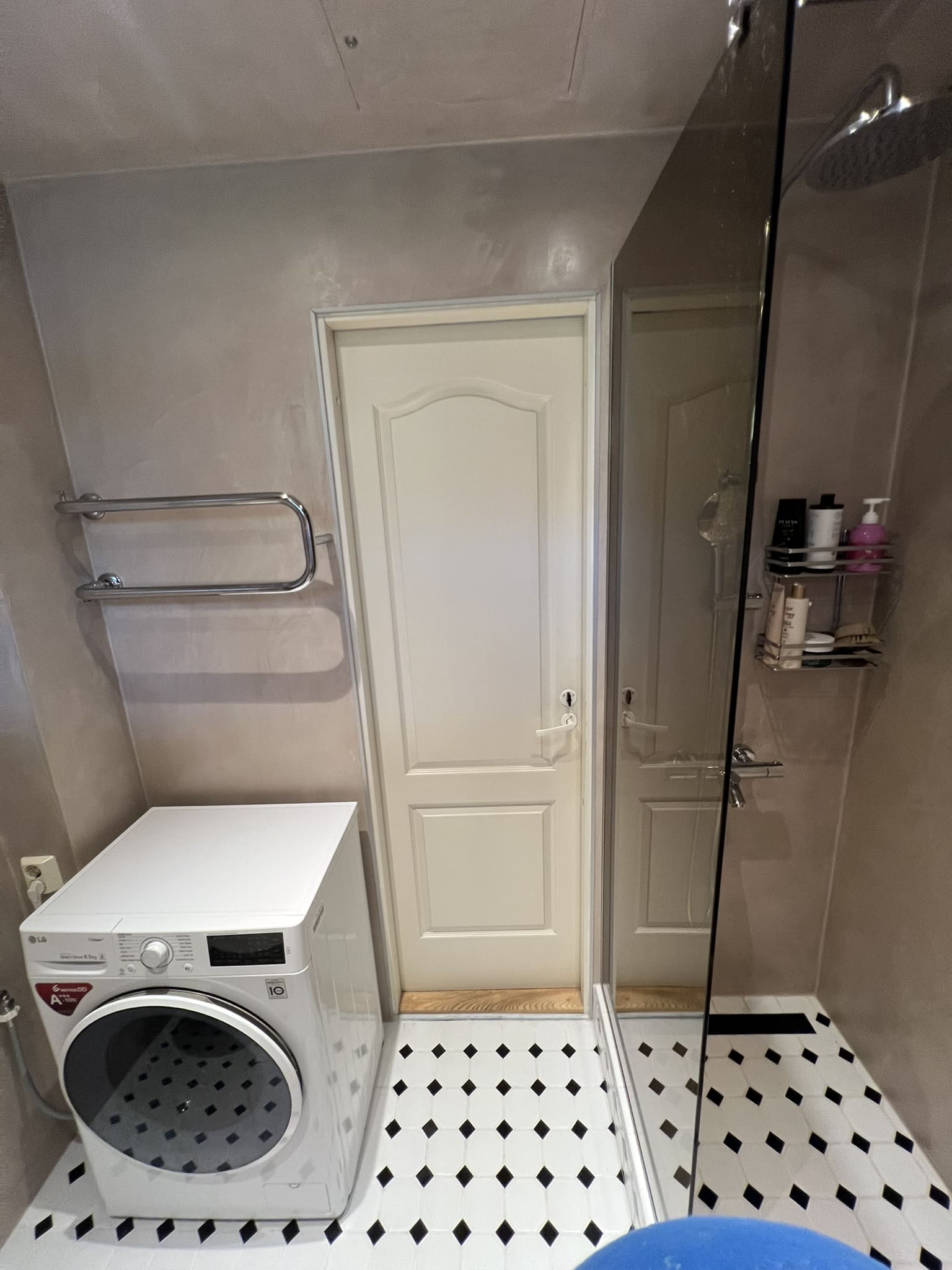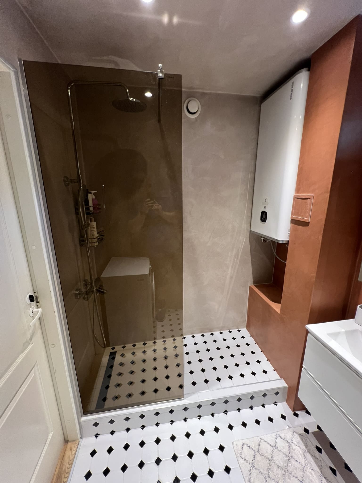 Mikrotsement olemasolevale keraamilisele plaadile. Dušiklaasi asemel tuli vahesein. Toon Basebeton Wheat.