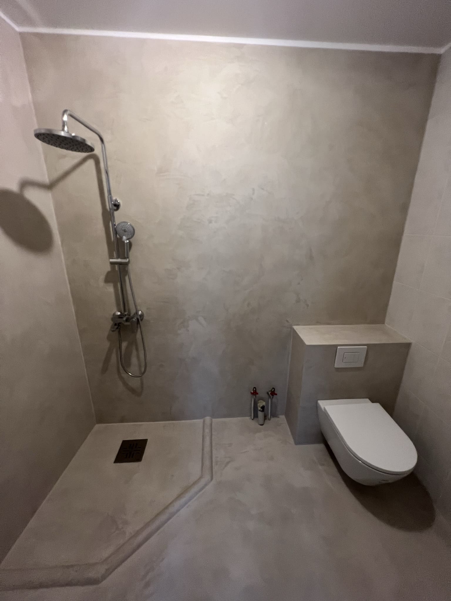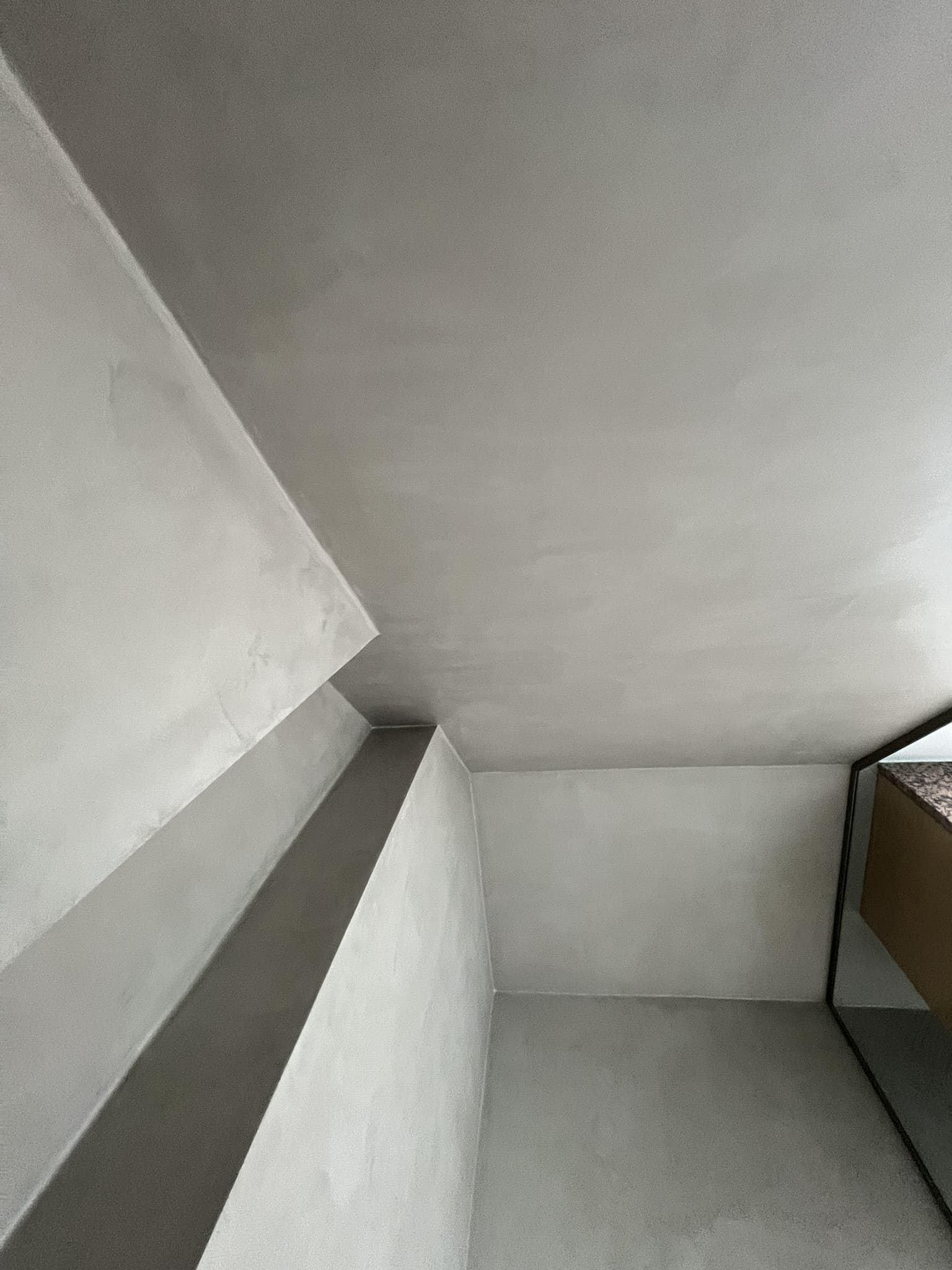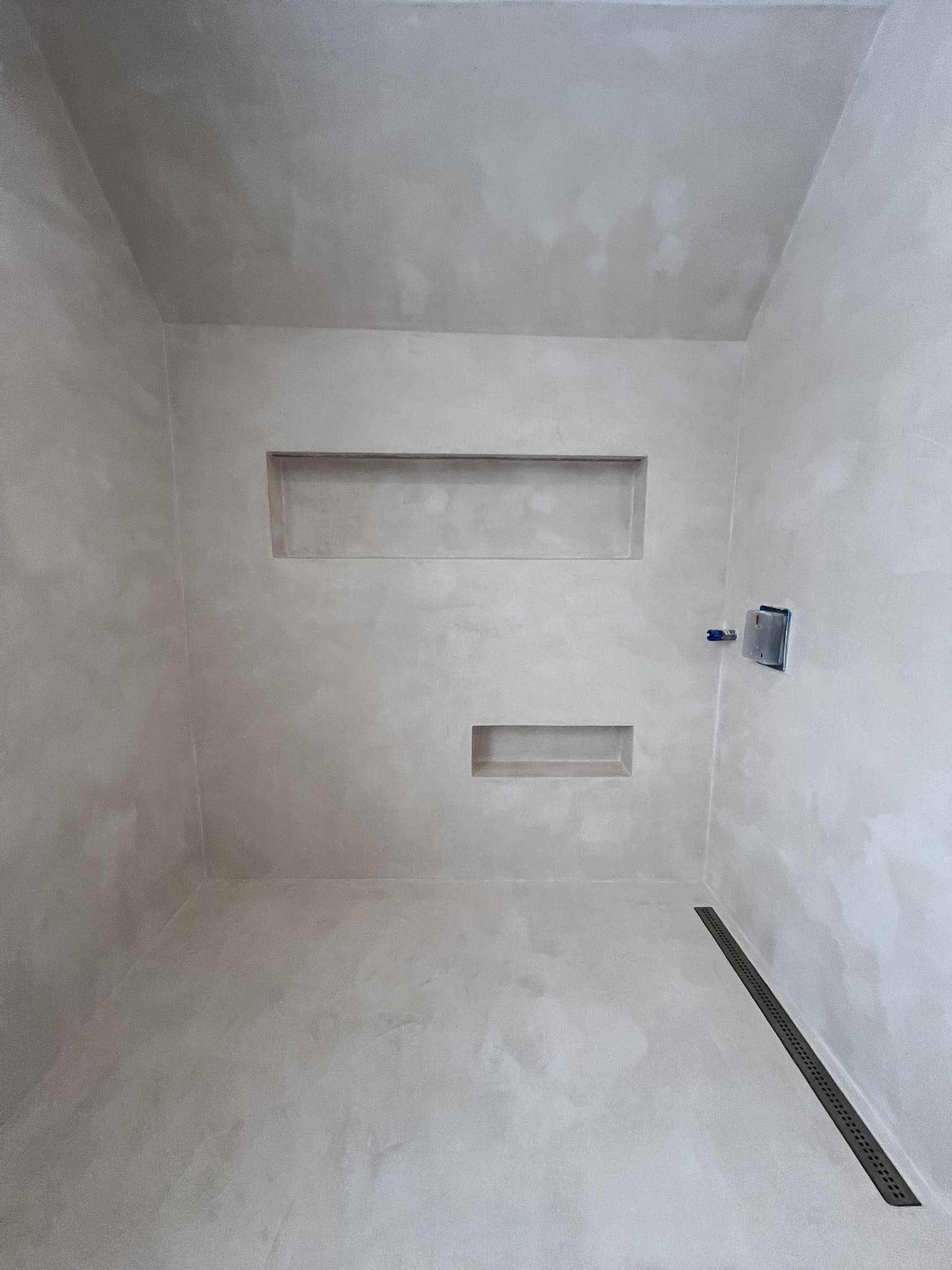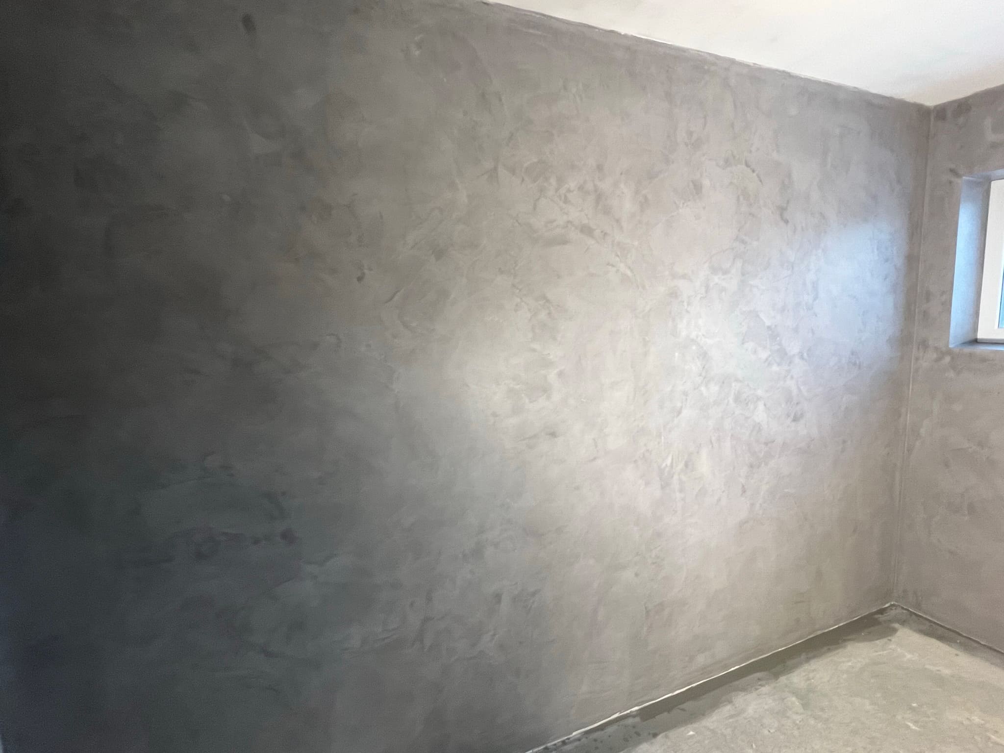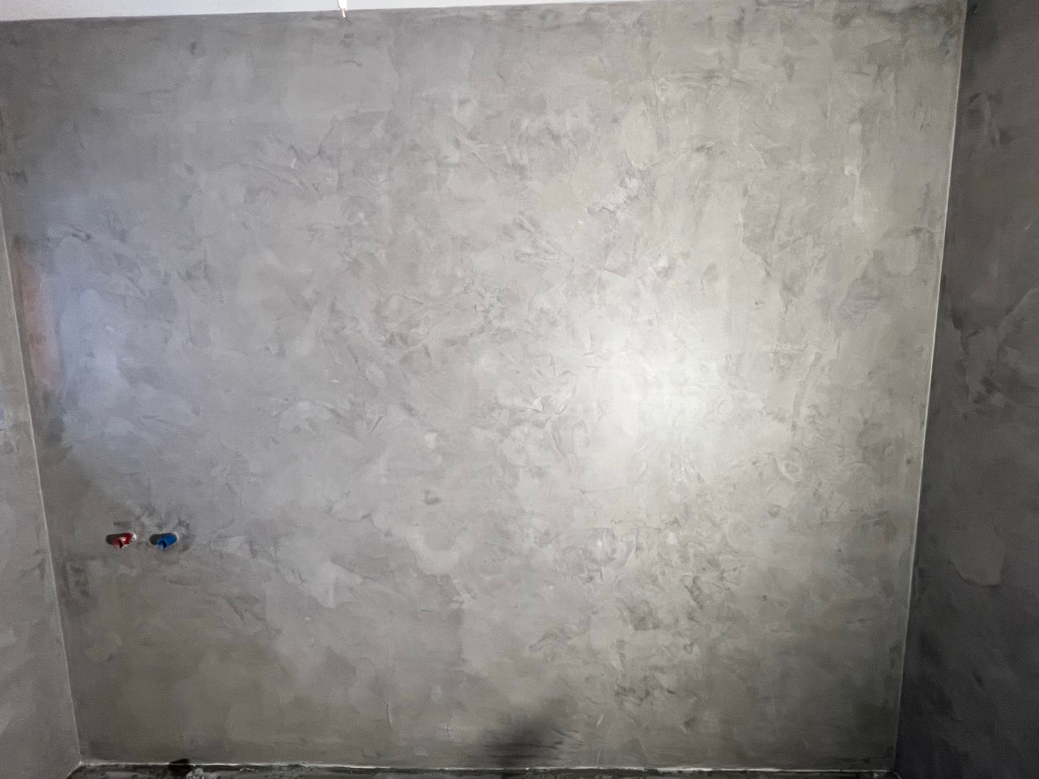 Mikrotsemendi tööd 5 m2 pindalaga duširuumis peale Teist Maailmasõda ehitatud eramajas. Vanade majade puhul nagu ikka pole seinad päris sirged, siis lõhuti välja vana krohvitud seinad ja krohviti armeeringuga uued sirged seinad. Lae kõrgus on 3,2 m, mille ääred on kaarjad. Nii lakke kui seinatele kanti mikrotsement. Toon: Torquesa.