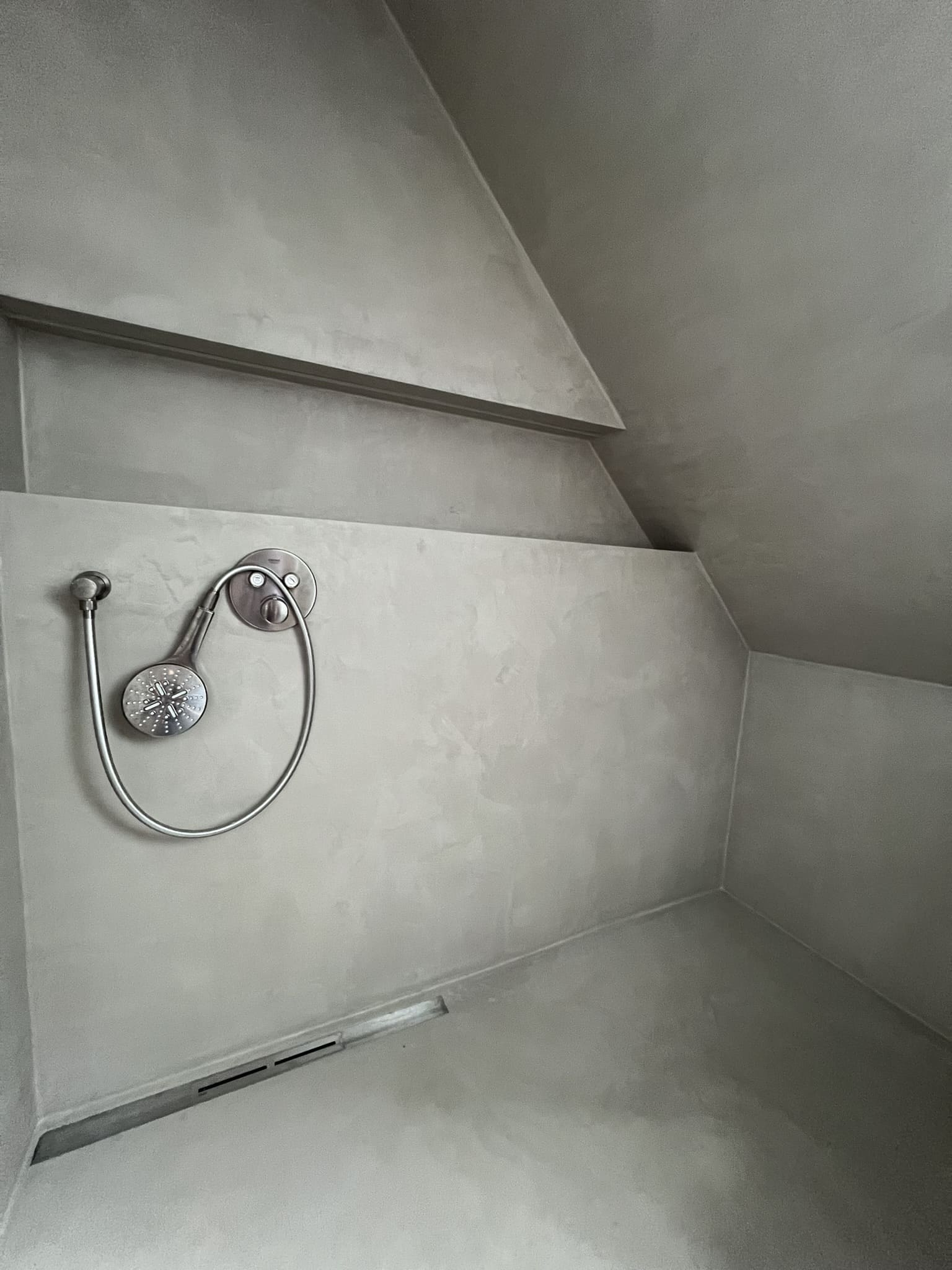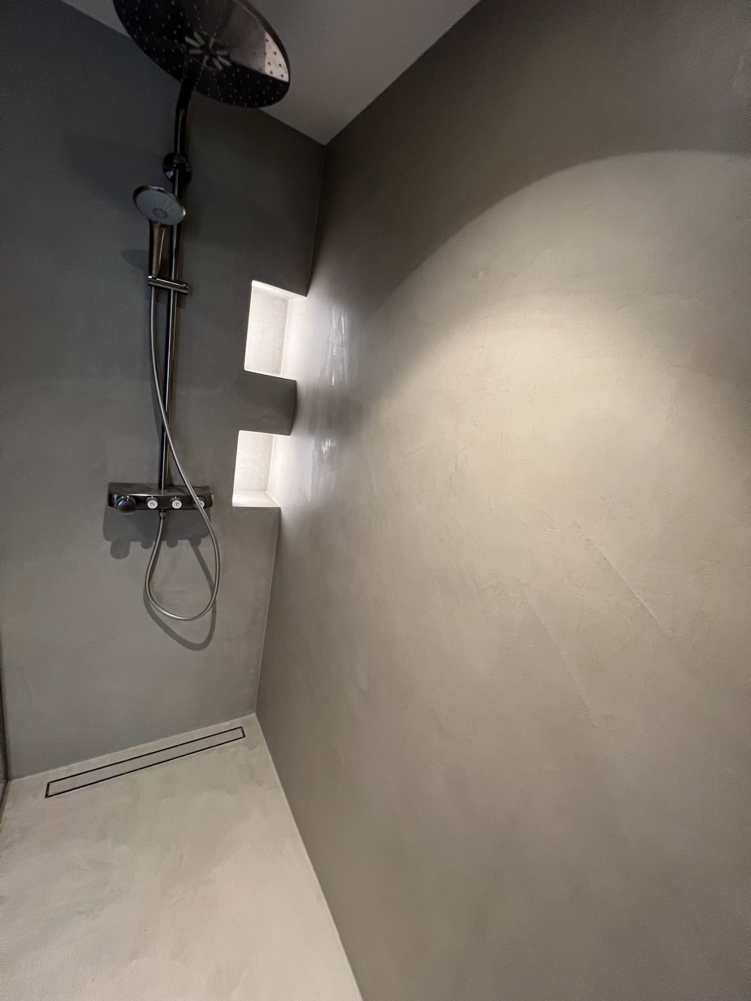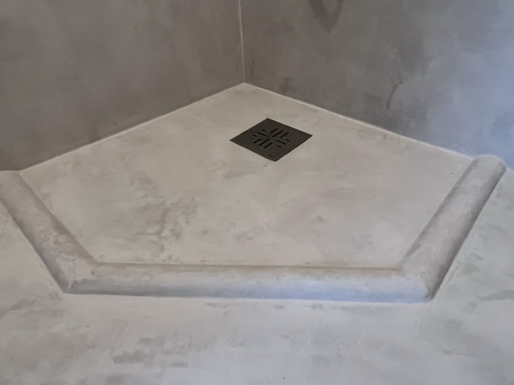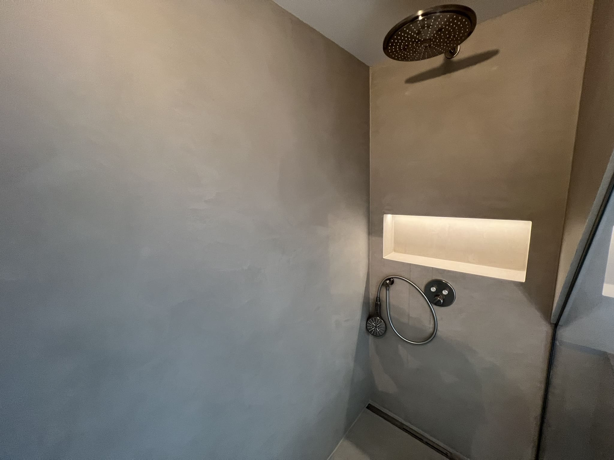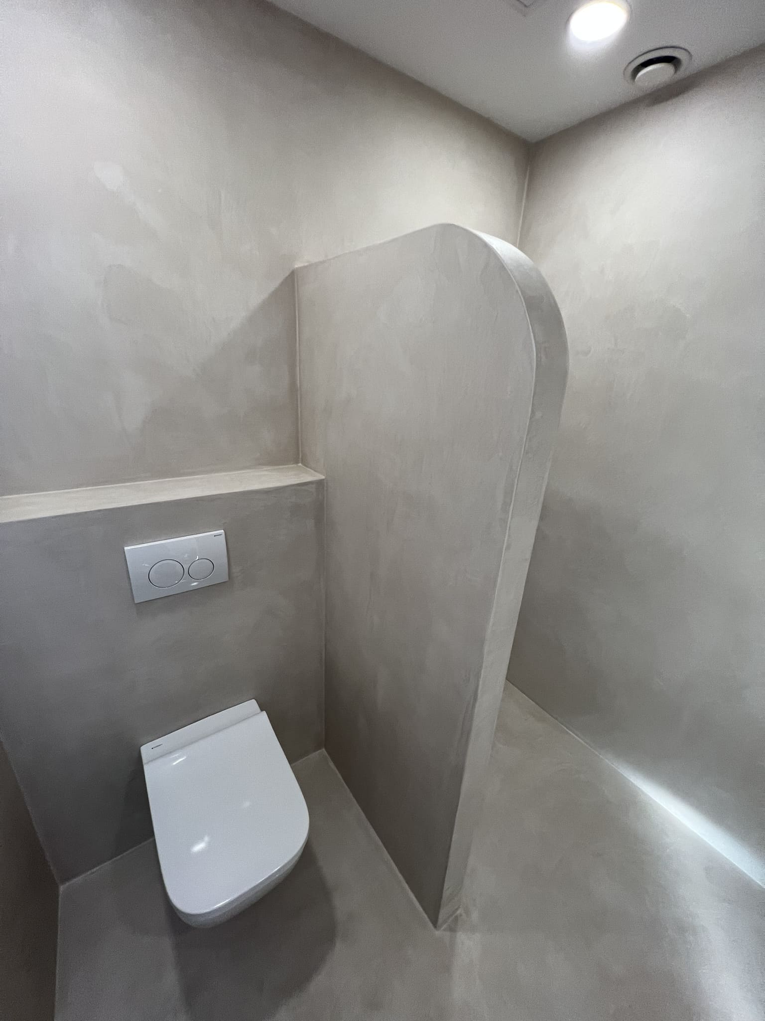 Mikrotsemendi tööd 5 m2 pindalaga duširuumis peale Teist Maailmasõda ehitatud eramajas. Vanade majade puhul nagu ikka pole seinad päris sirged, siis lõhuti välja vana krohvitud seinad ja krohviti armeeringuga uued sirged seinad. Lae kõrgus on 3,2 m, mille ääred on kaarjad. Nii lakke kui seinatele kanti mikrotsement. Toon: Torquesa.