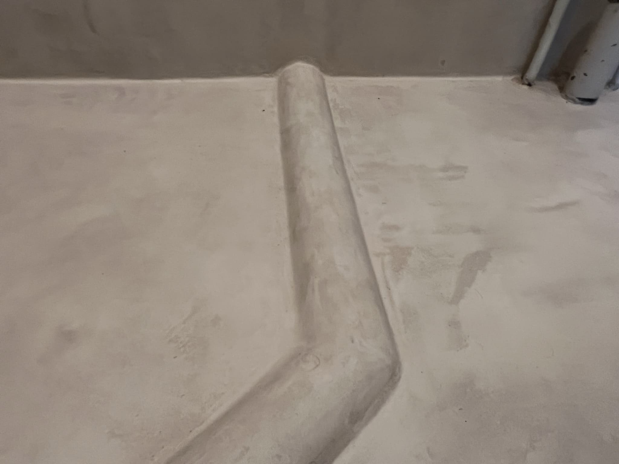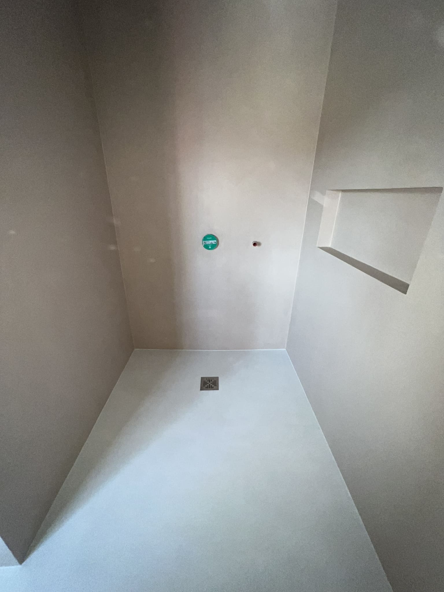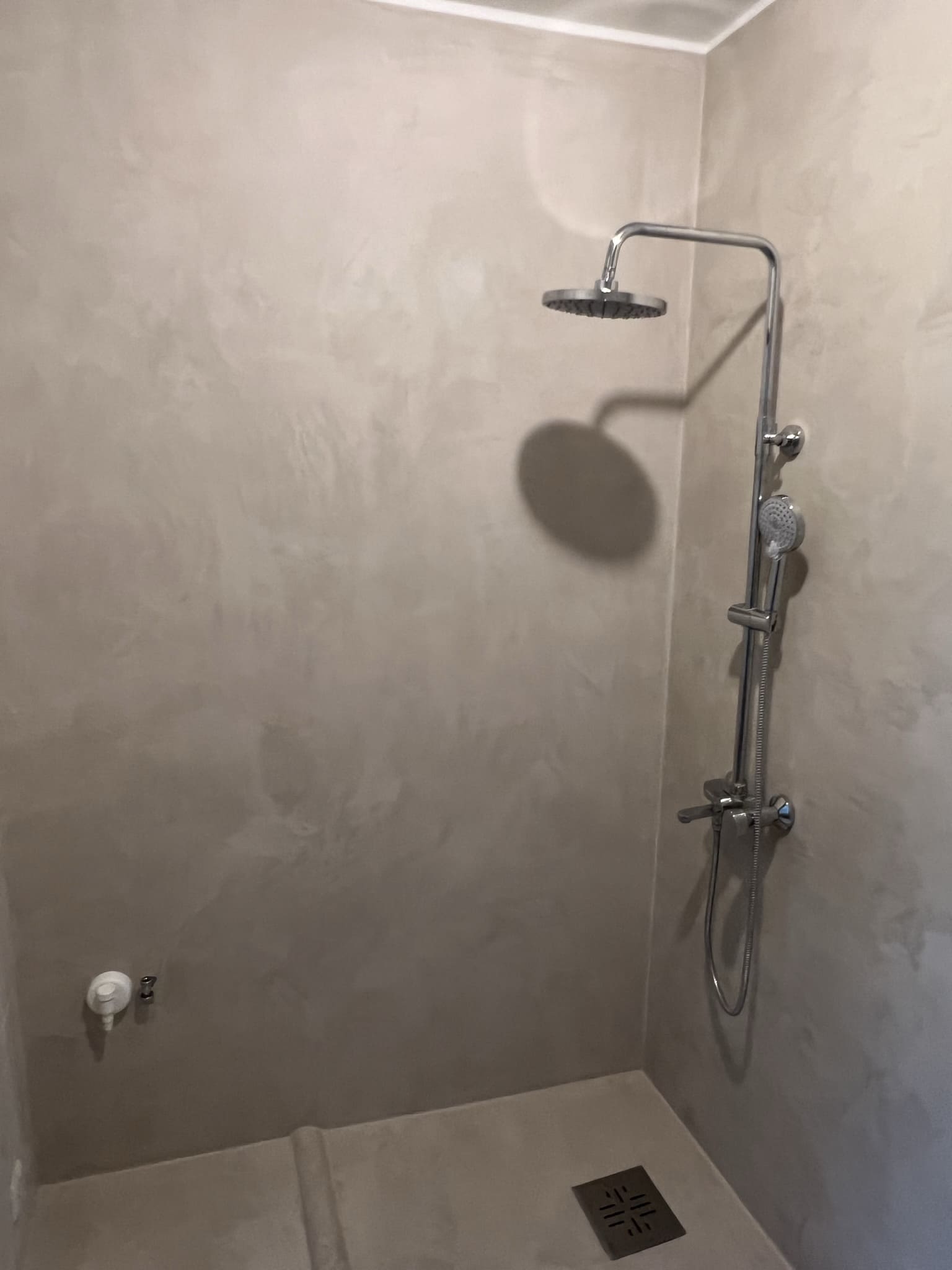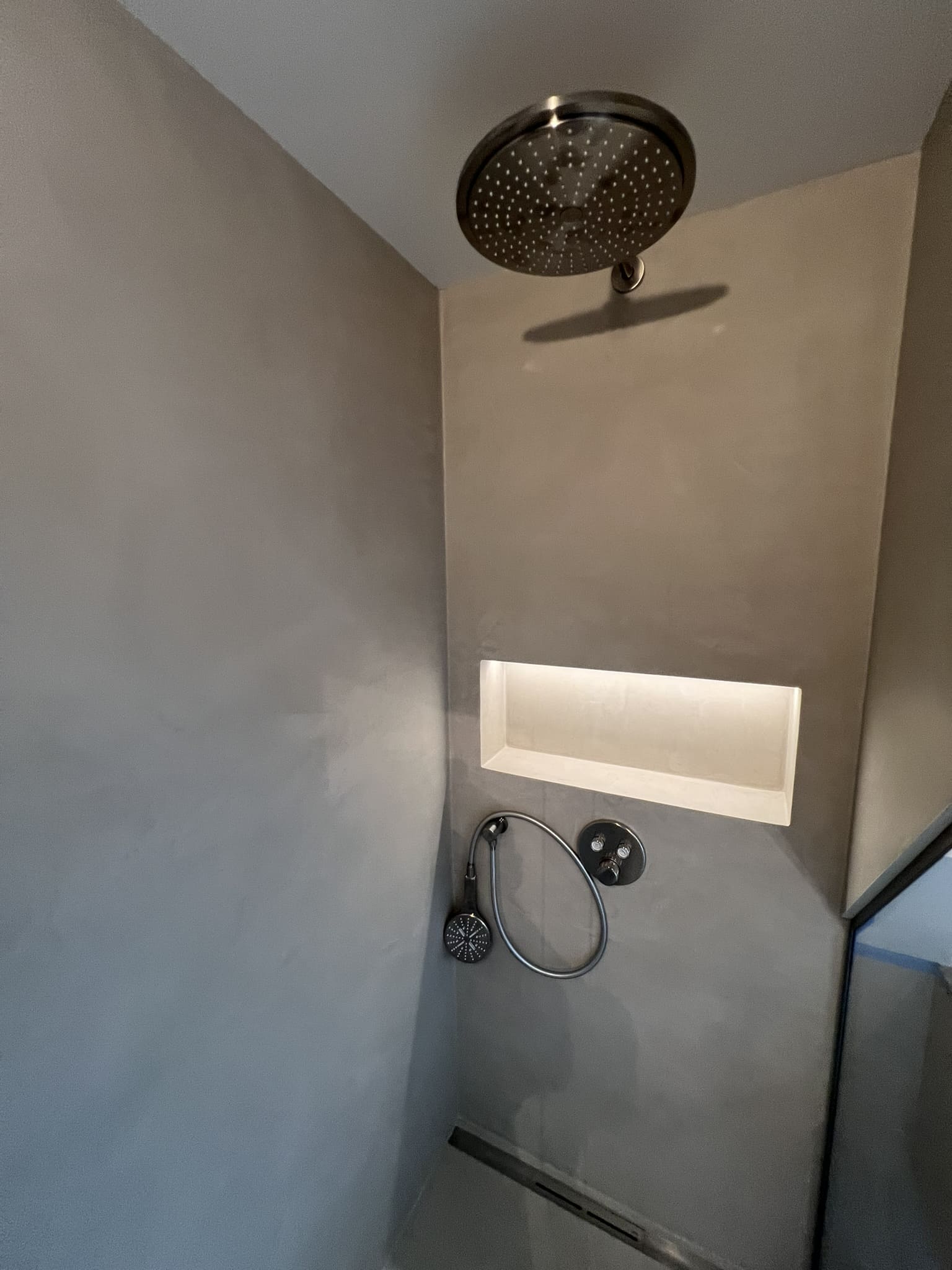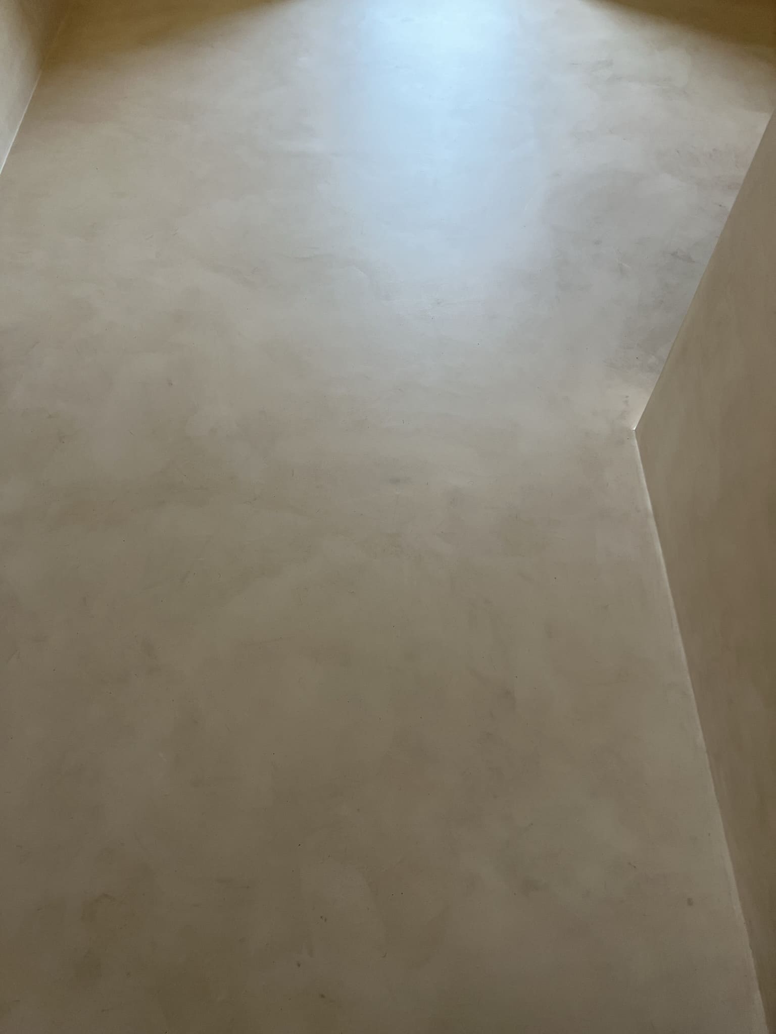 Mikrotsemendi tööd 5 m2 pindalaga duširuumis peale Teist Maailmasõda ehitatud eramajas. Vanade majade puhul nagu ikka pole seinad päris sirged, siis lõhuti välja vana krohvitud seinad ja krohviti armeeringuga uued sirged seinad. Lae kõrgus on 3,2 m, mille ääred on kaarjad. Nii lakke kui seinatele kanti mikrotsement. Toon: Torquesa.