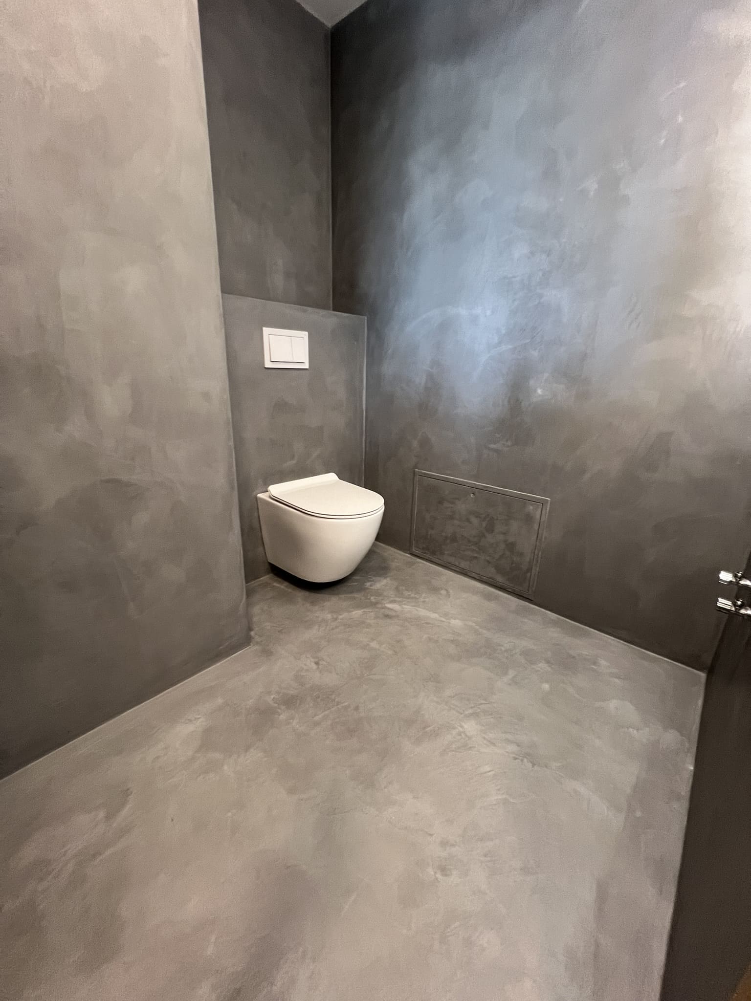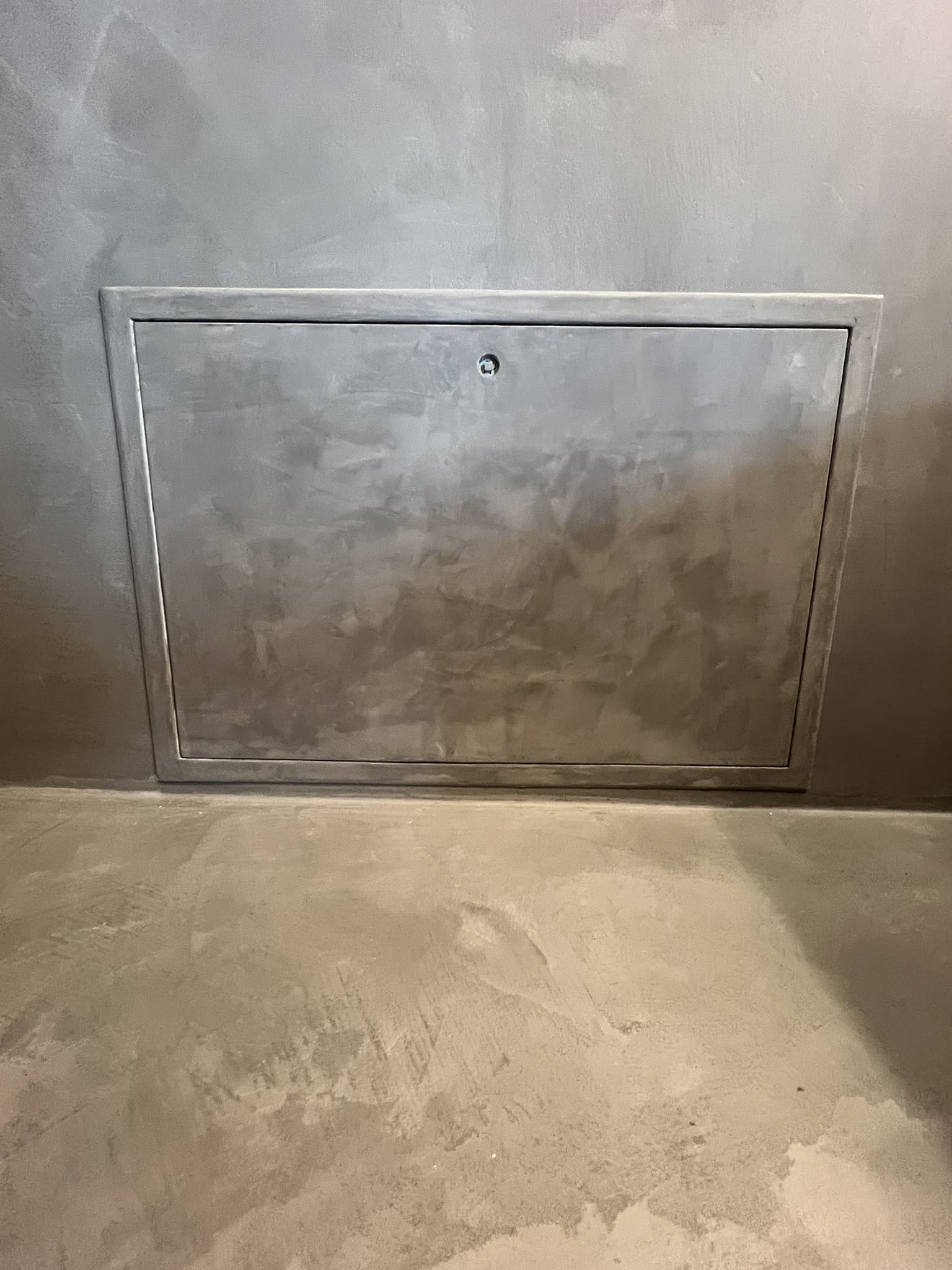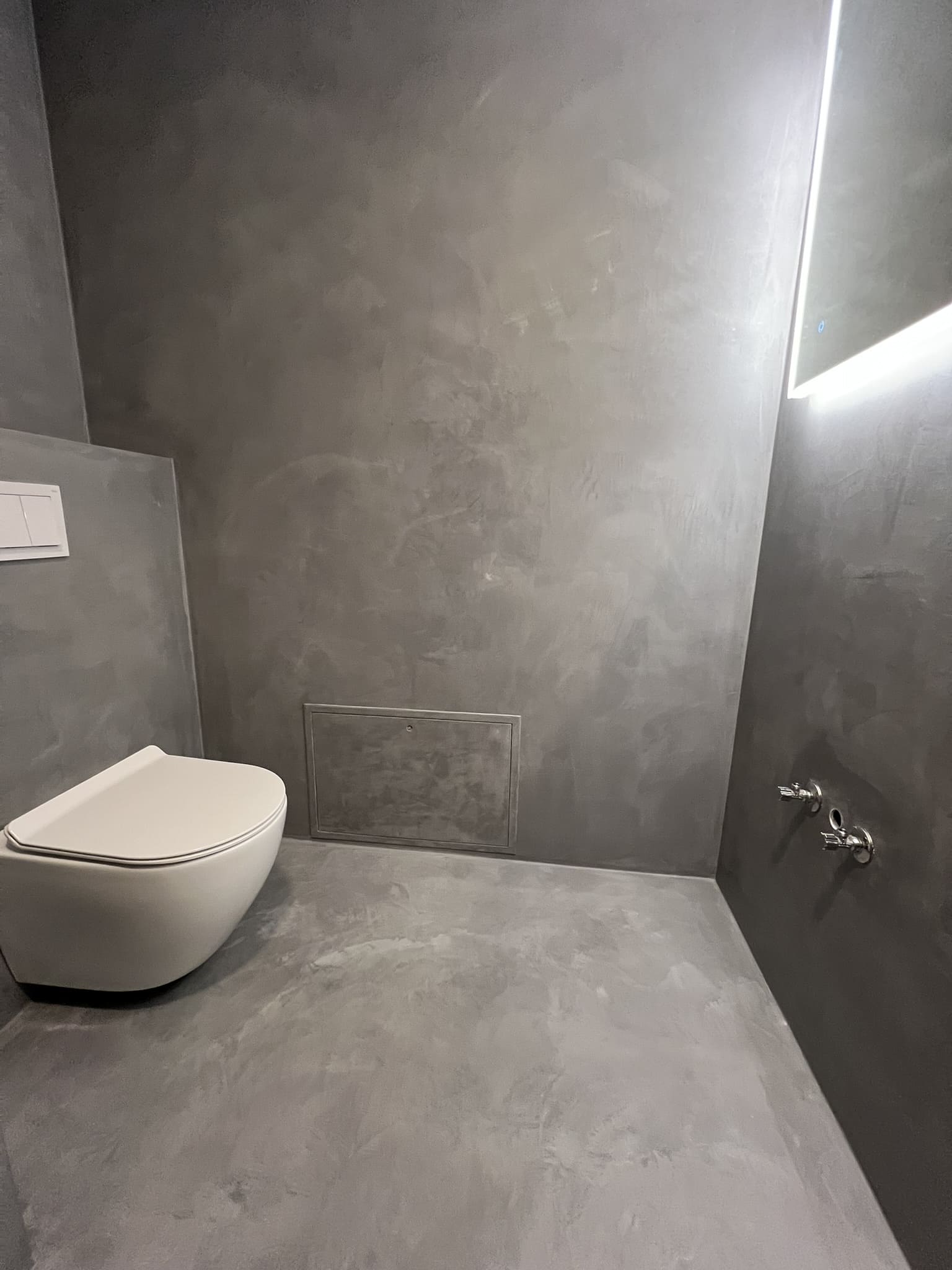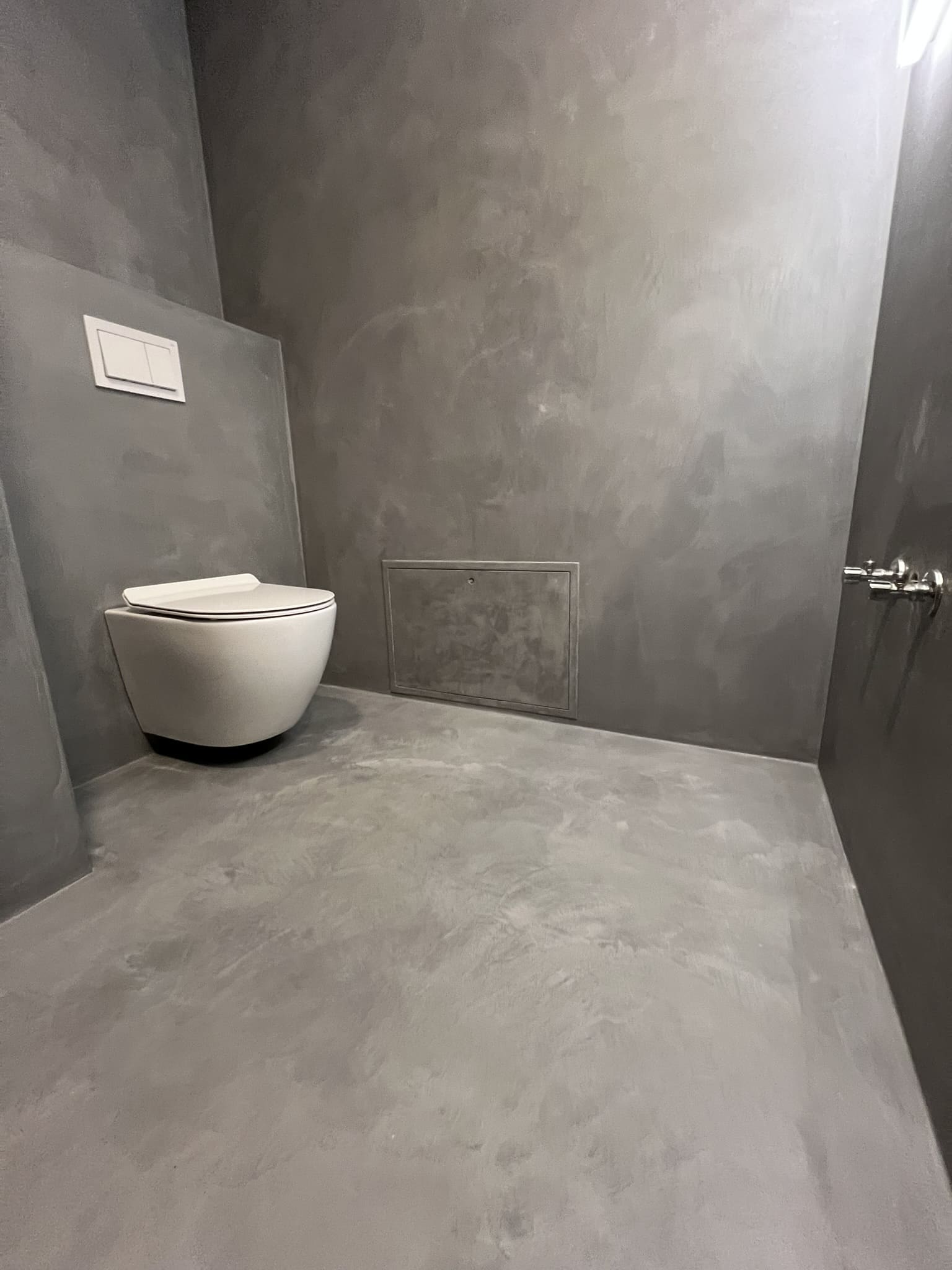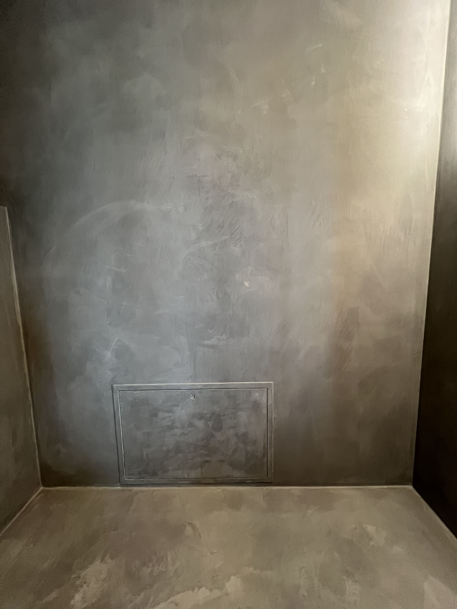 Mikrotsemendiga saab katta ka hooldusluuke, et see muu taustaga ühilduks. Mikrotsement kinnitub hästi metalli külge ja muude materjalide külge samuti. Sel objektil oli tarvis seinas olev avaus kinni katta enne mikrotsemendi kandmis pindadele.