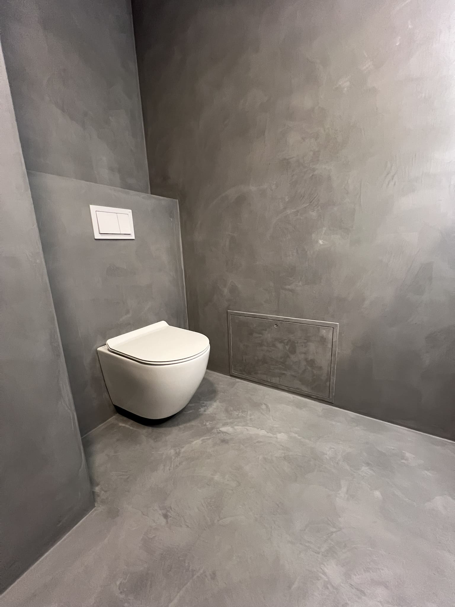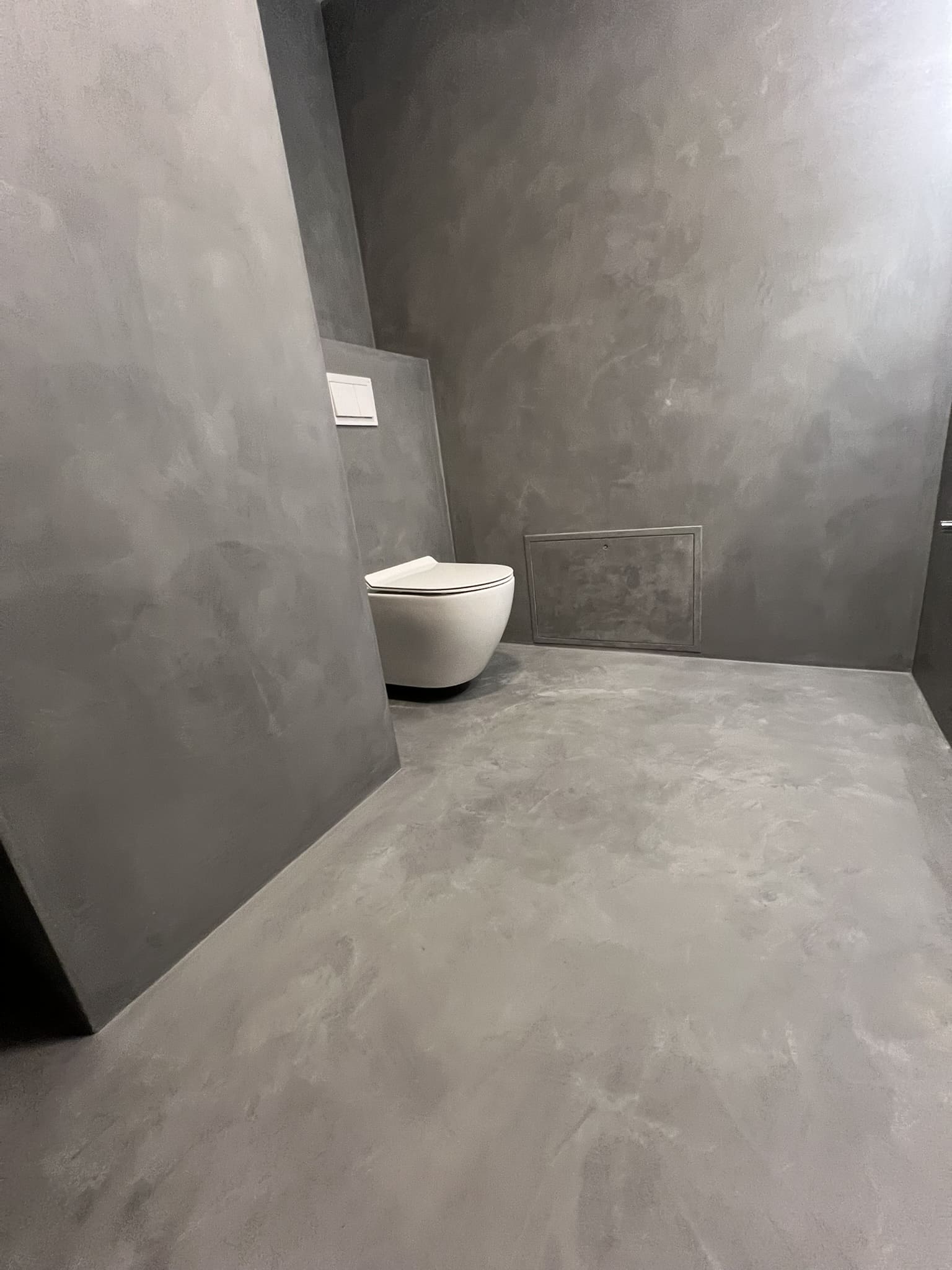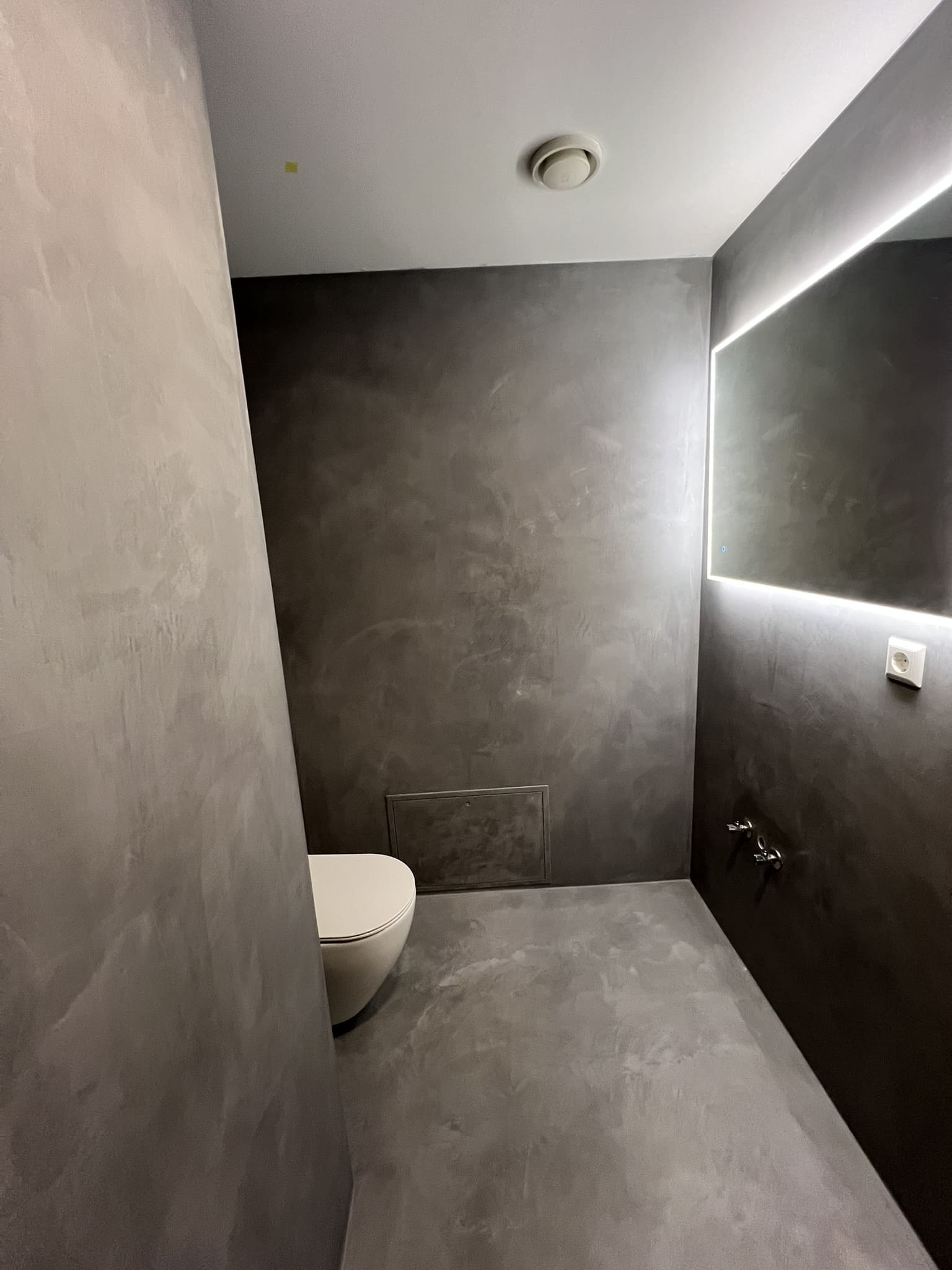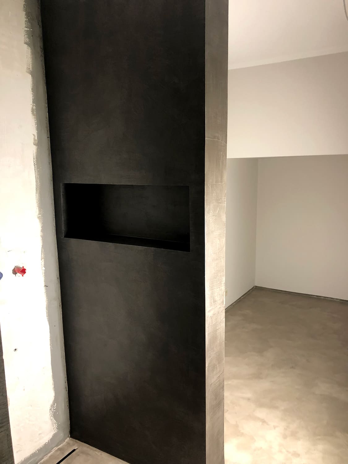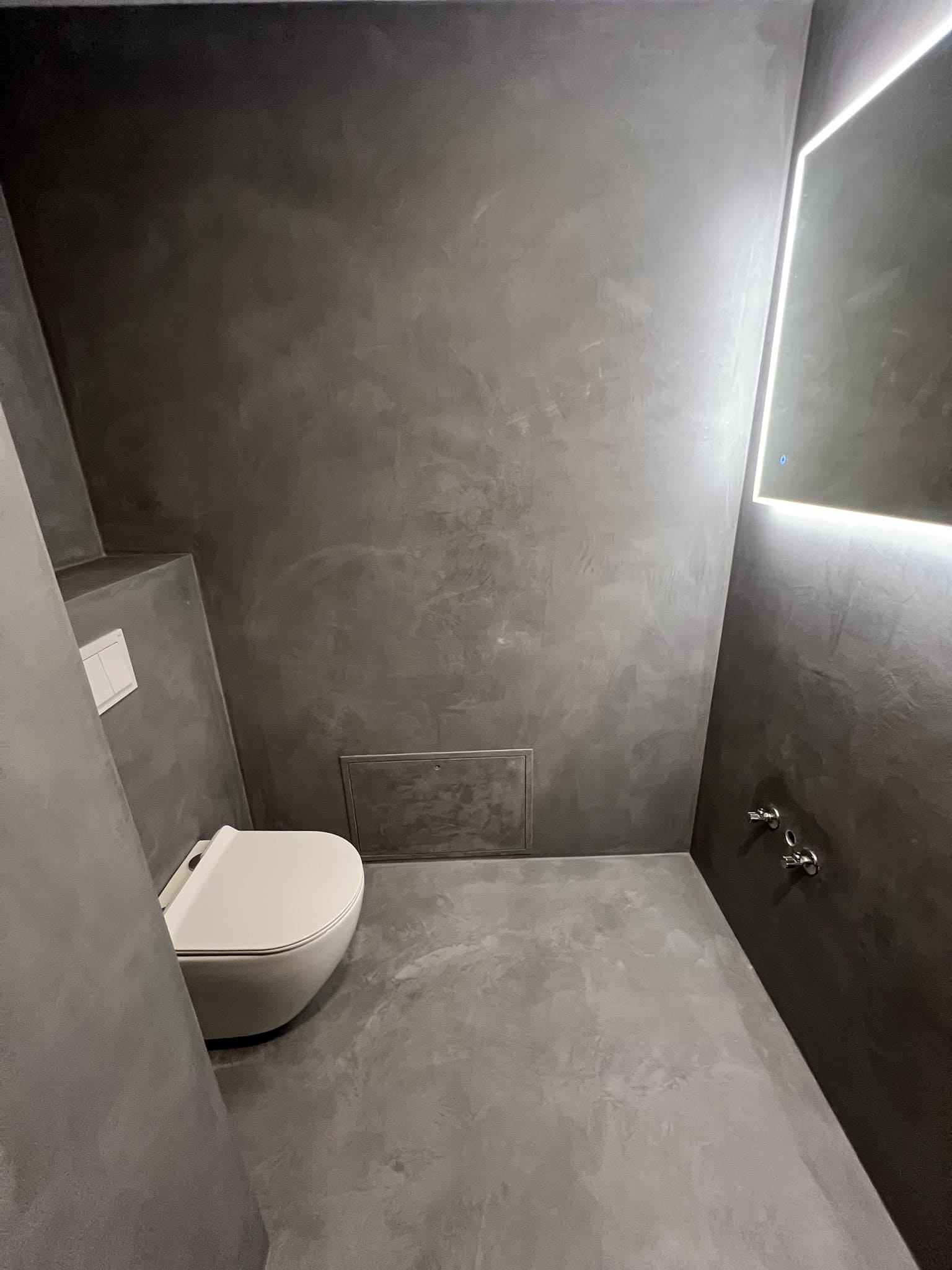 Mikrotsemendiga saab katta ka hooldusluuke, et see muu taustaga ühilduks. Mikrotsement kinnitub hästi metalli külge ja muude materjalide külge samuti. Sel objektil oli tarvis seinas olev avaus kinni katta enne mikrotsemendi kandmis pindadele.