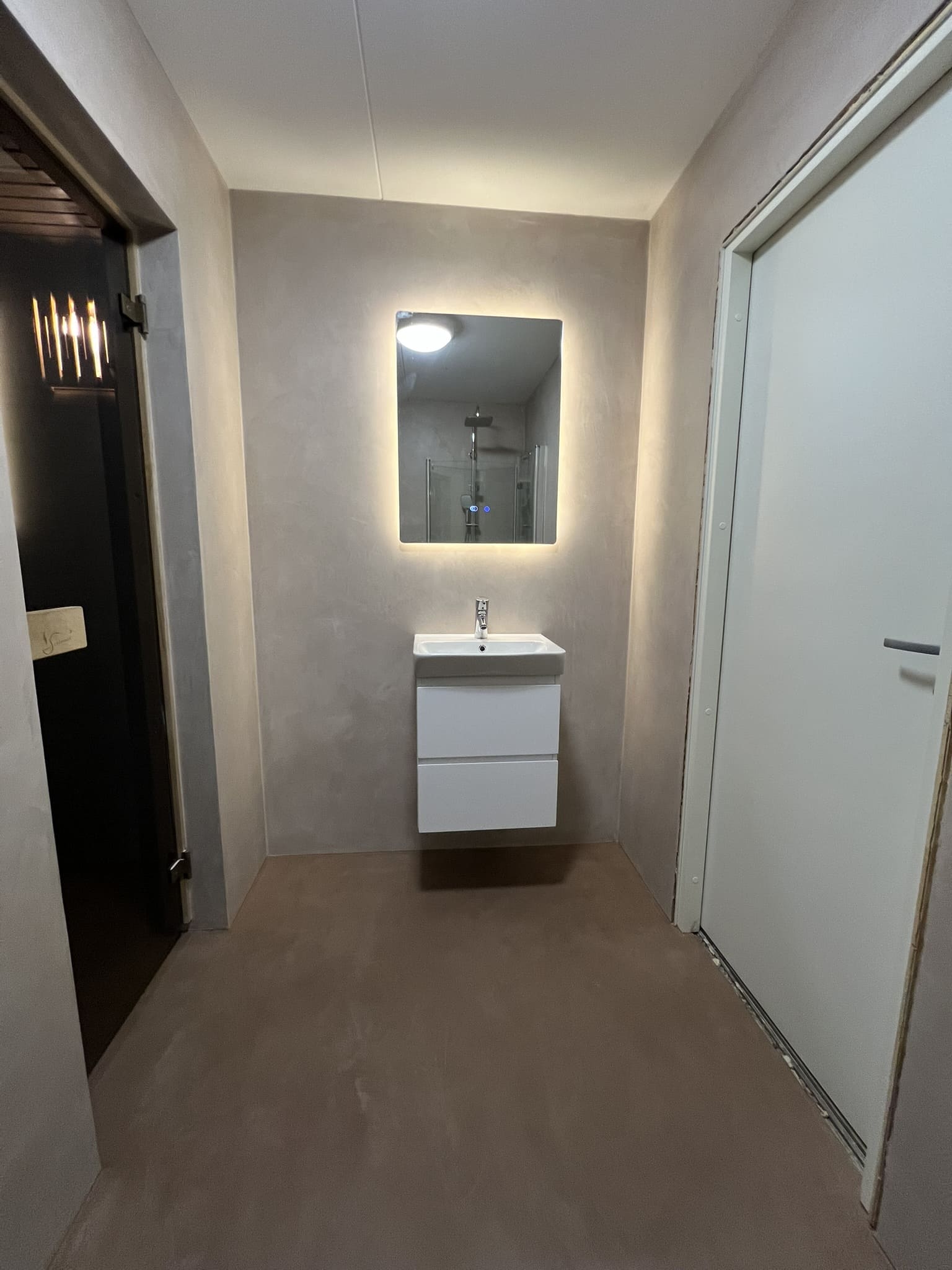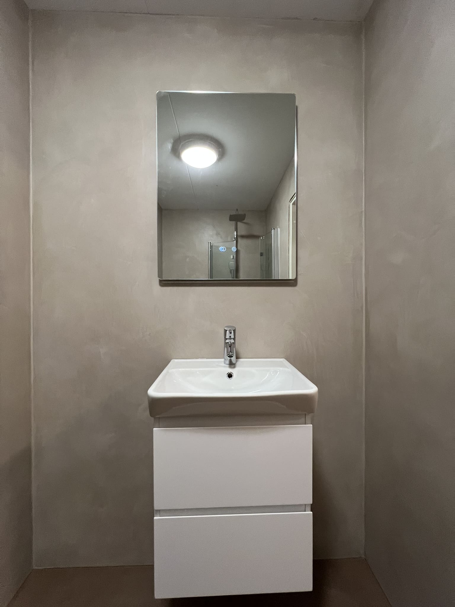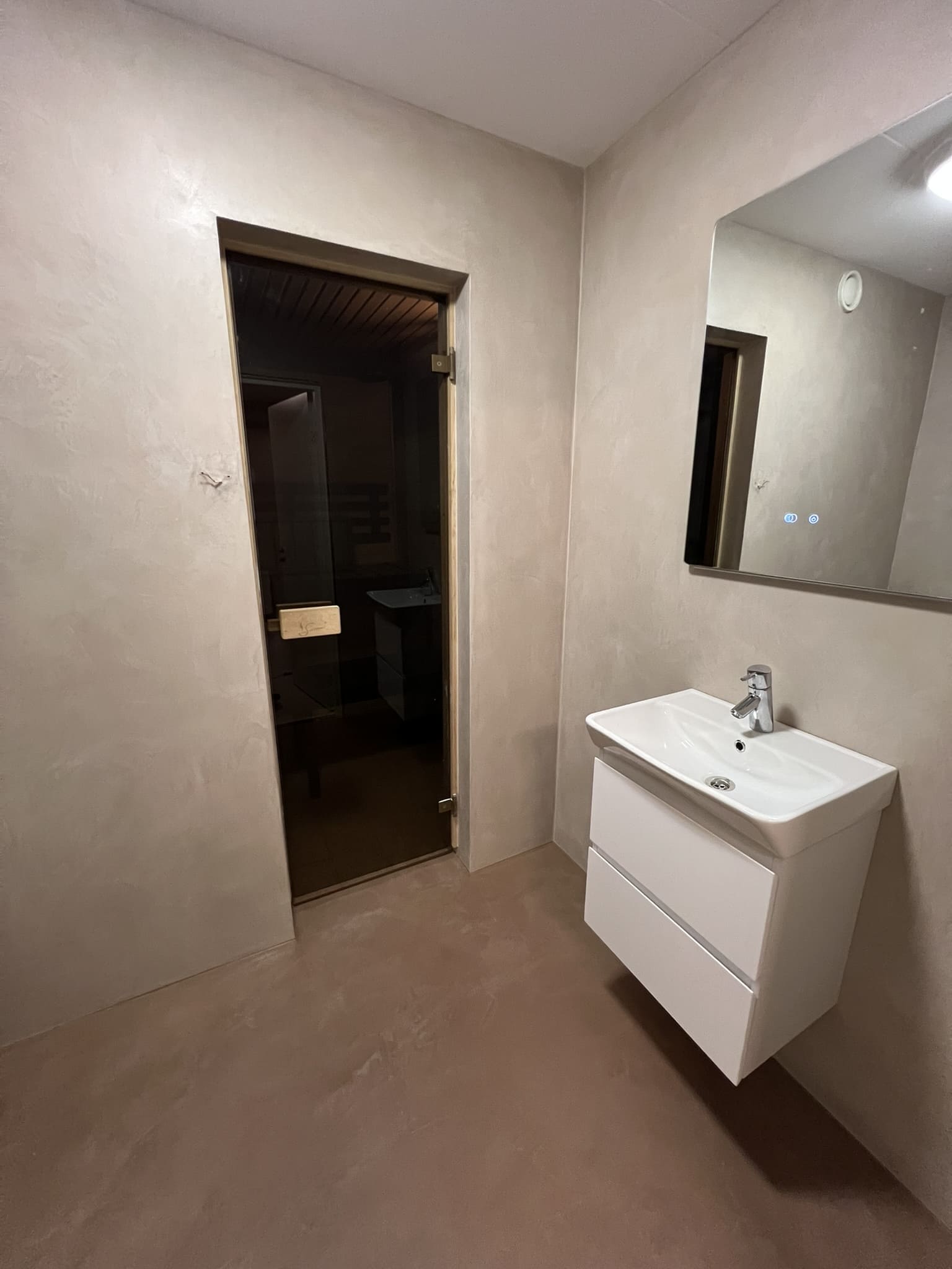 Mikrotsement keraamilisele plaadile. Antud töö puhul sai kasutada kahte tooni, põrandalale ( Basebeton Mocca) ja seinad ( Basebeton Duhe). Abiks olime ka santehnika paigaldamisel!
