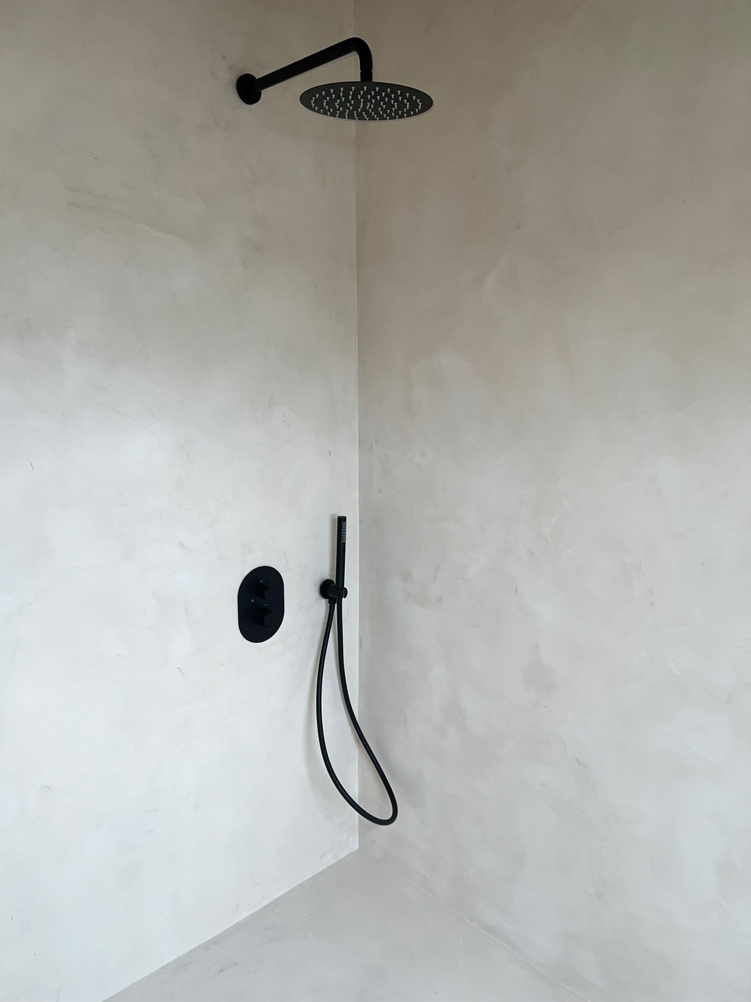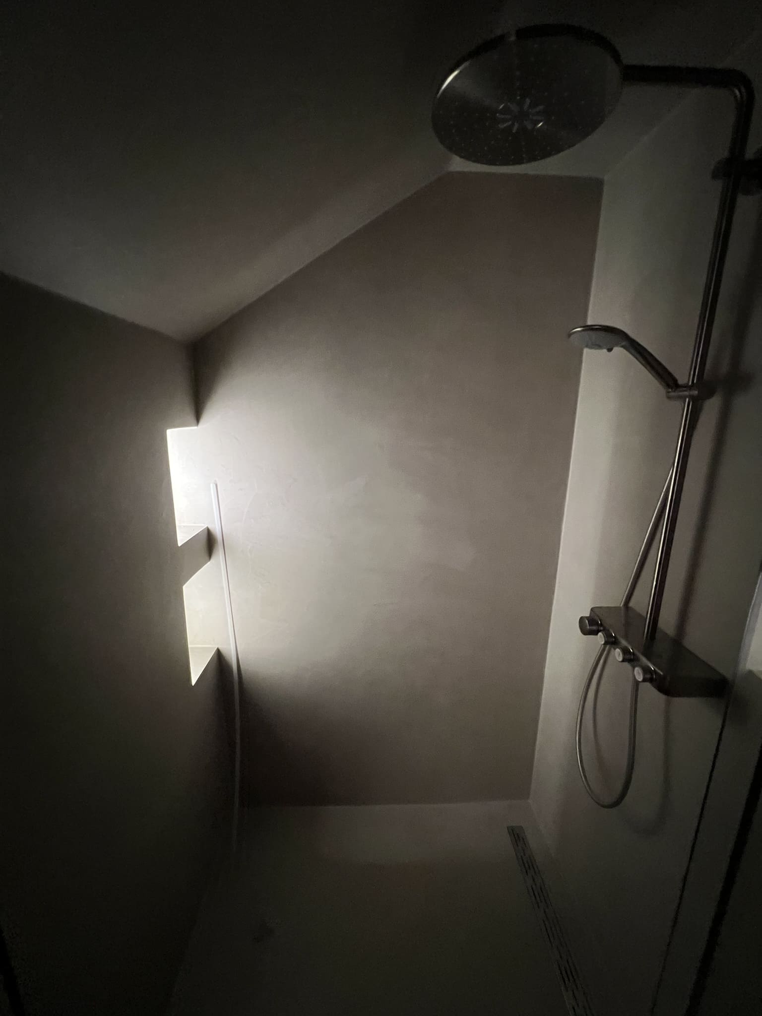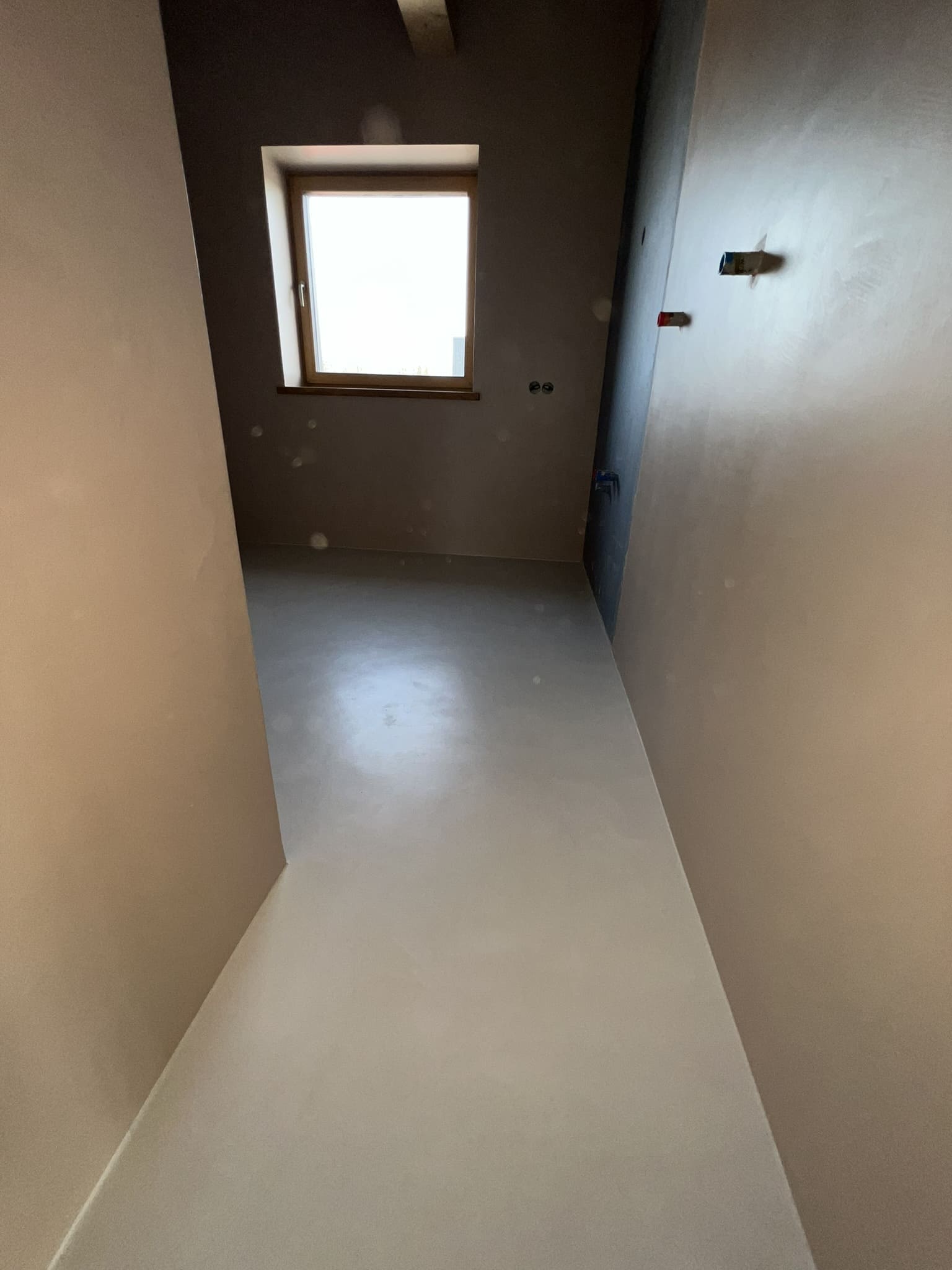 Mikrotsemendi tööd 16 m2 pindlaga duširuumis eramajas. Antud töö on tehtud kahe tooniga, põrand ( Basebeton Bright), seinad (Basebeton Dust). Kuna tegemist äsja valminud majaga, siis krohviti seinad areeringuga enne mikrotsemendi paigaldamist üle.