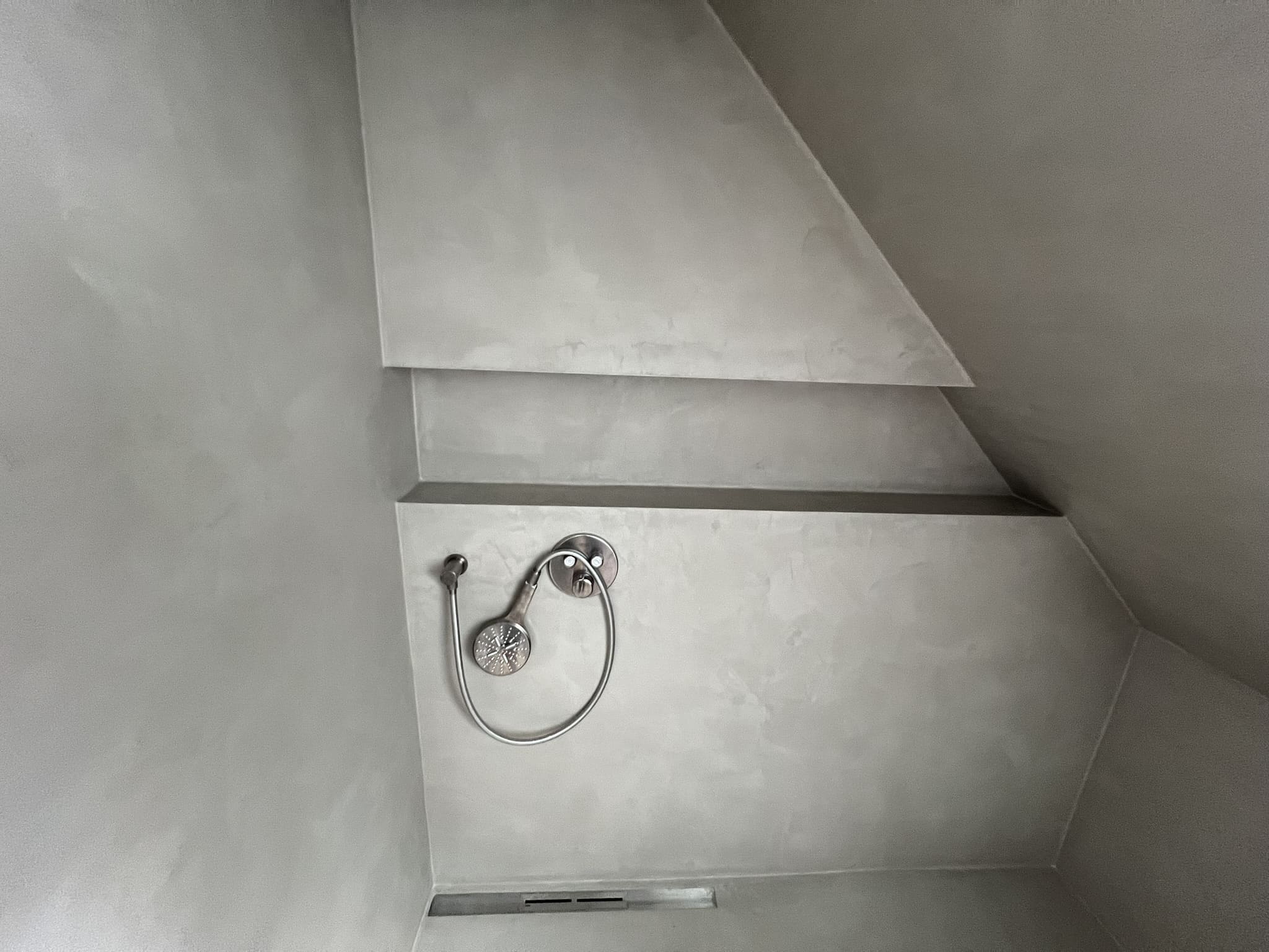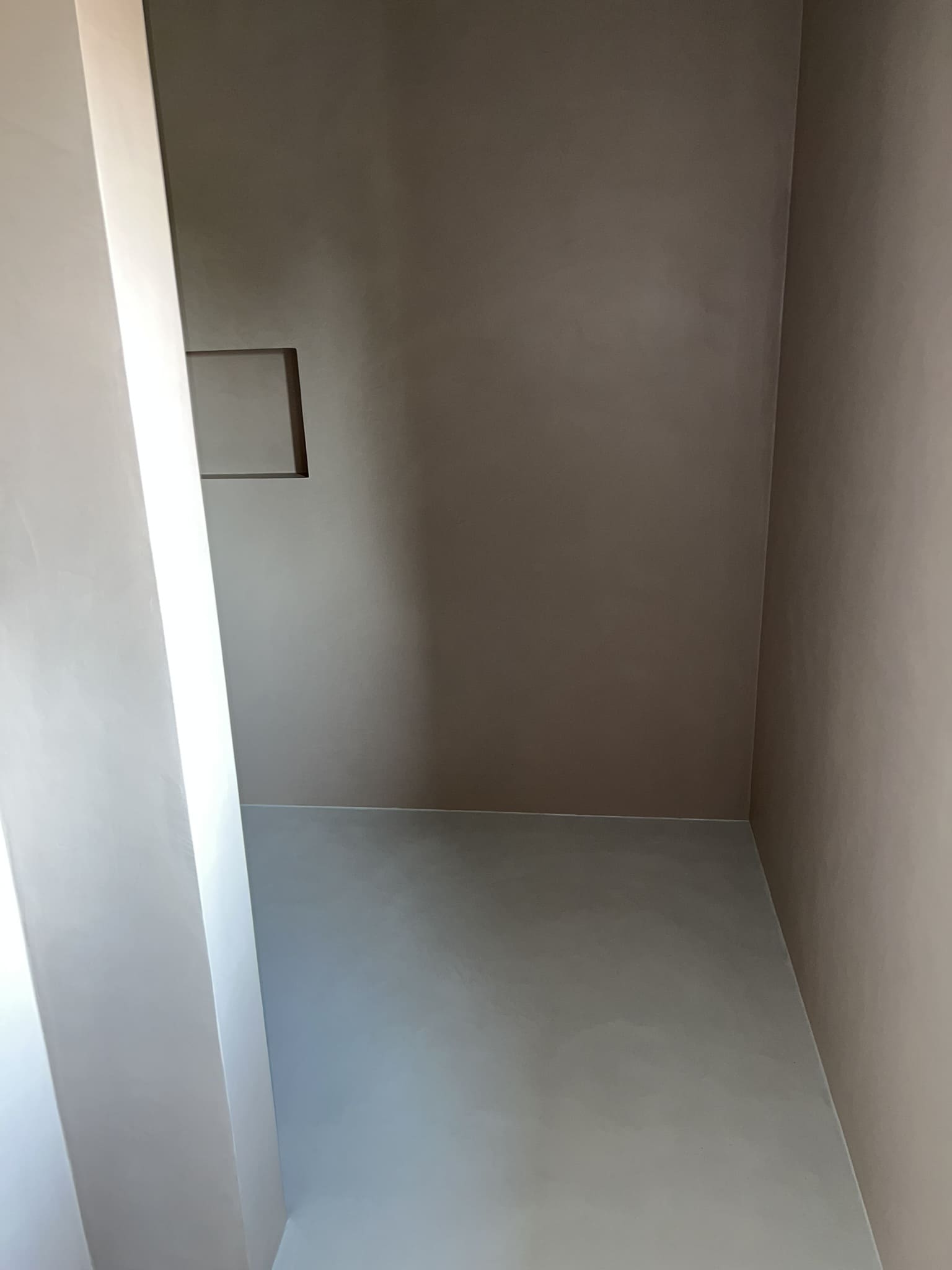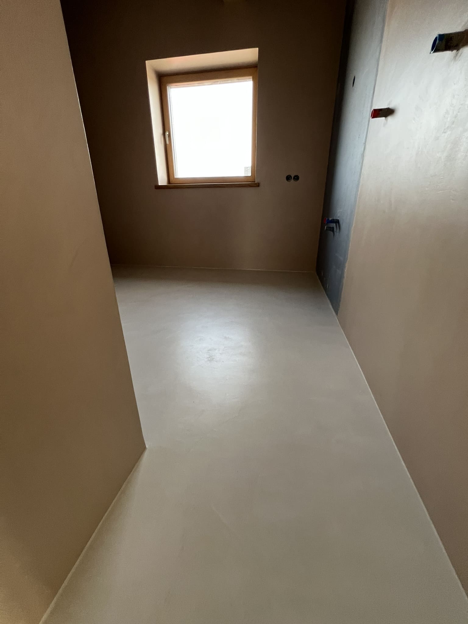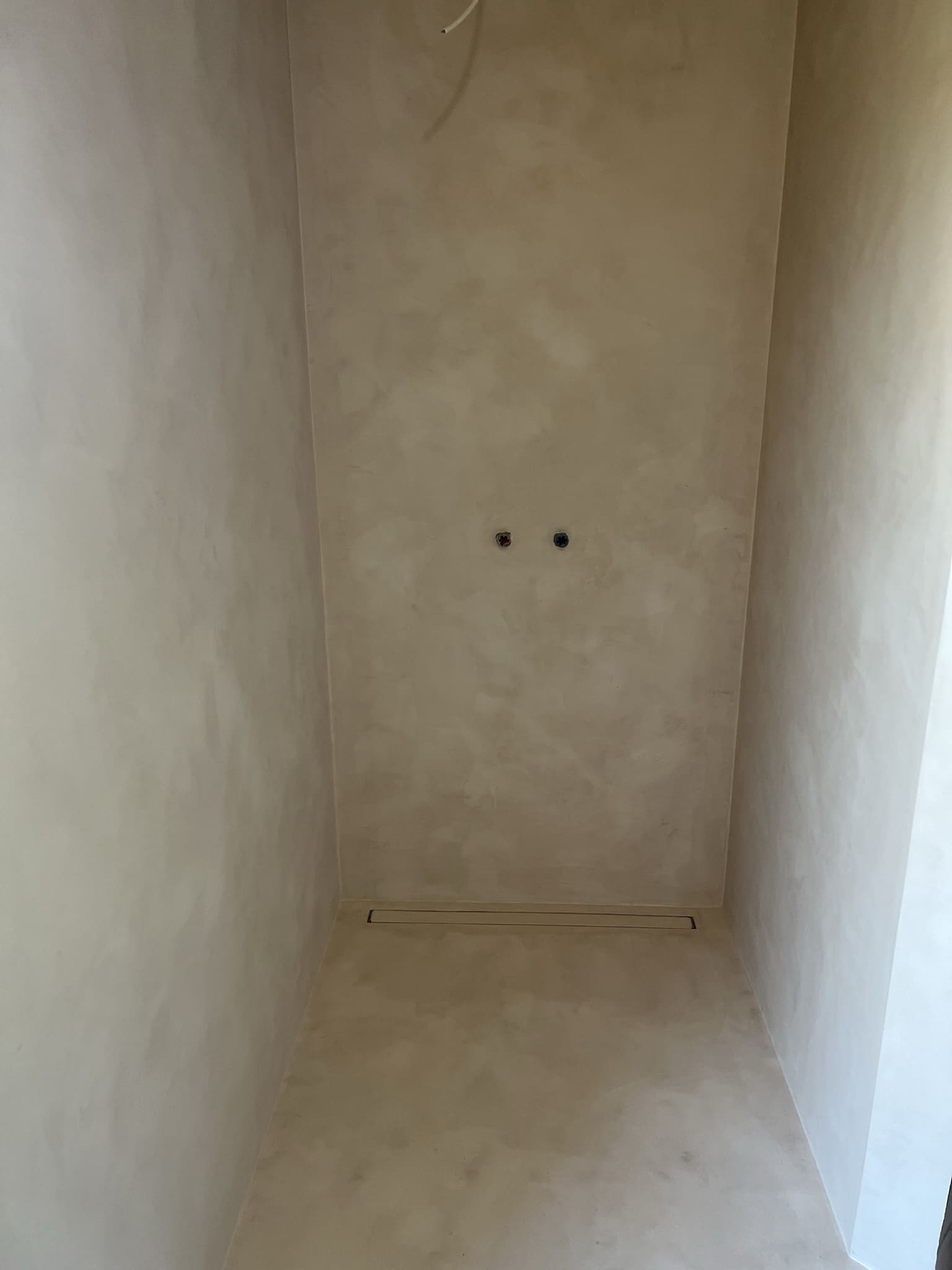 Mikrotsemendi tööd 8m2 pindalaga duširuumis suvilas. Toon: Sahhara.