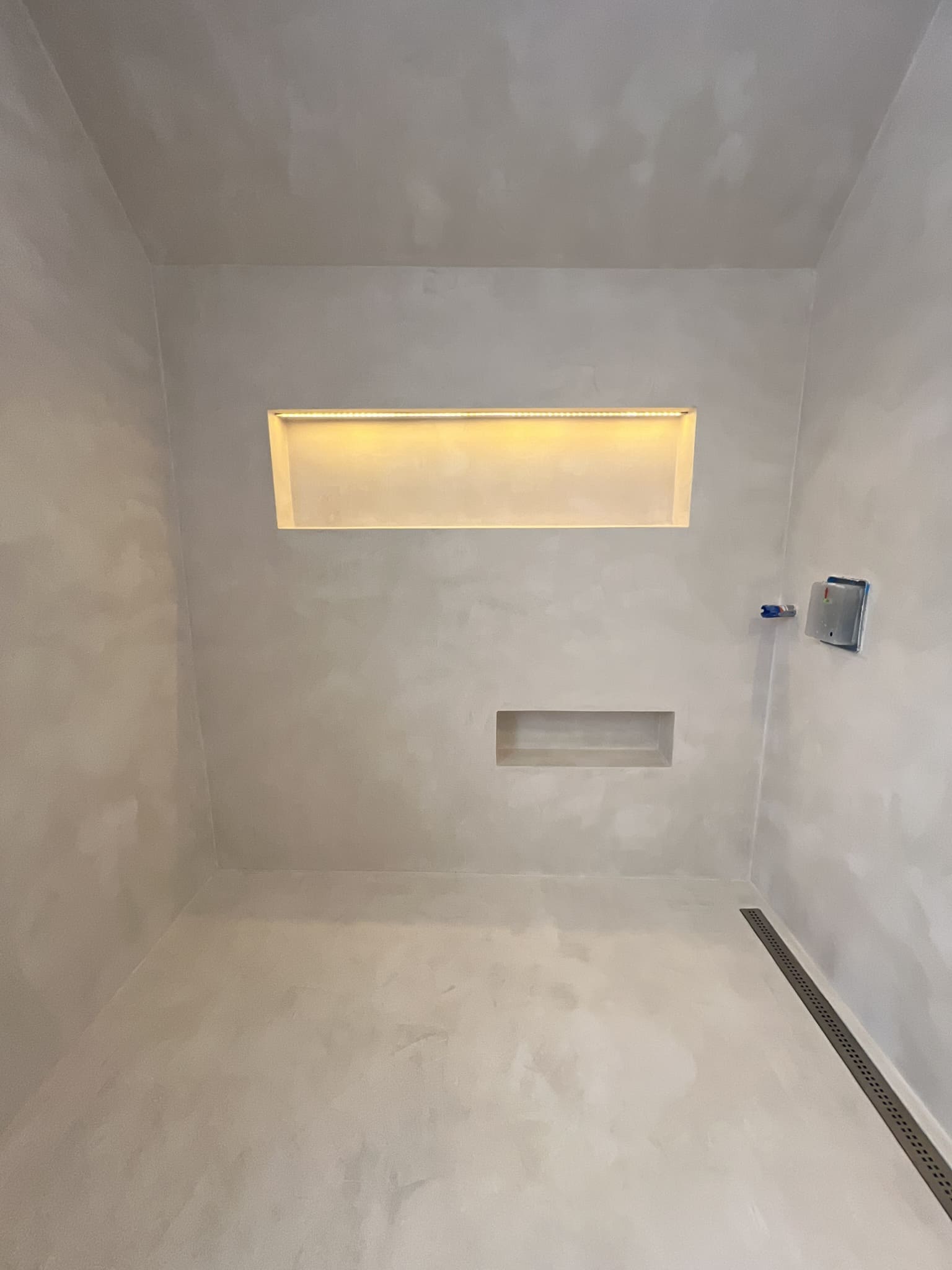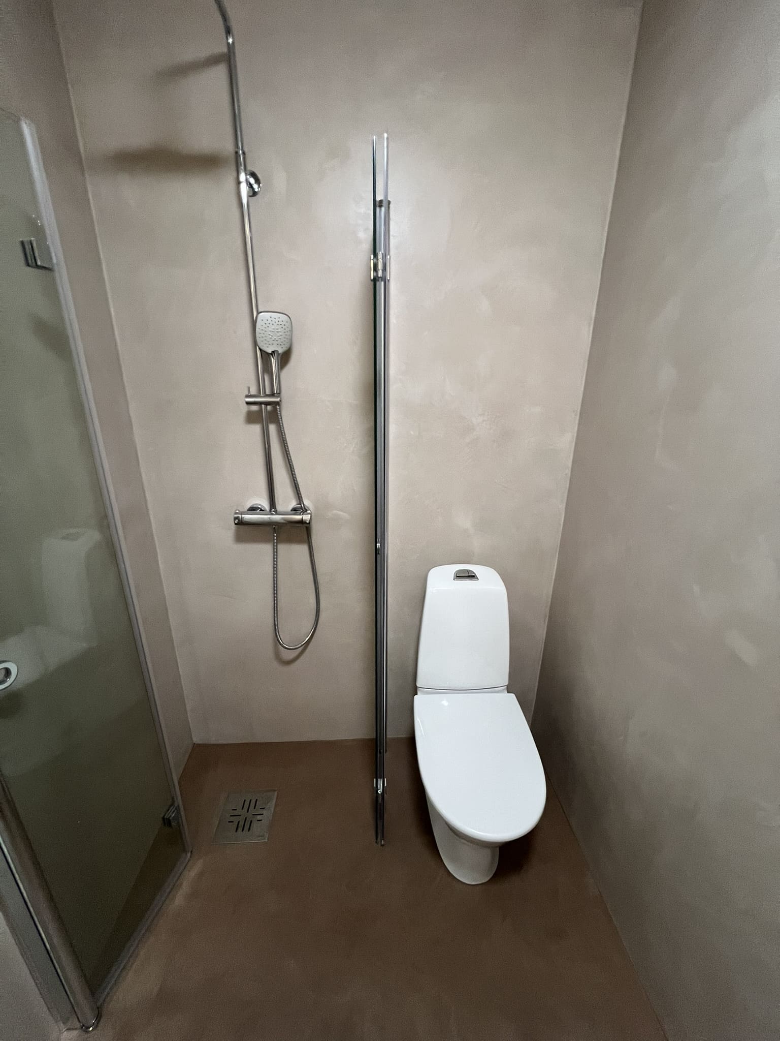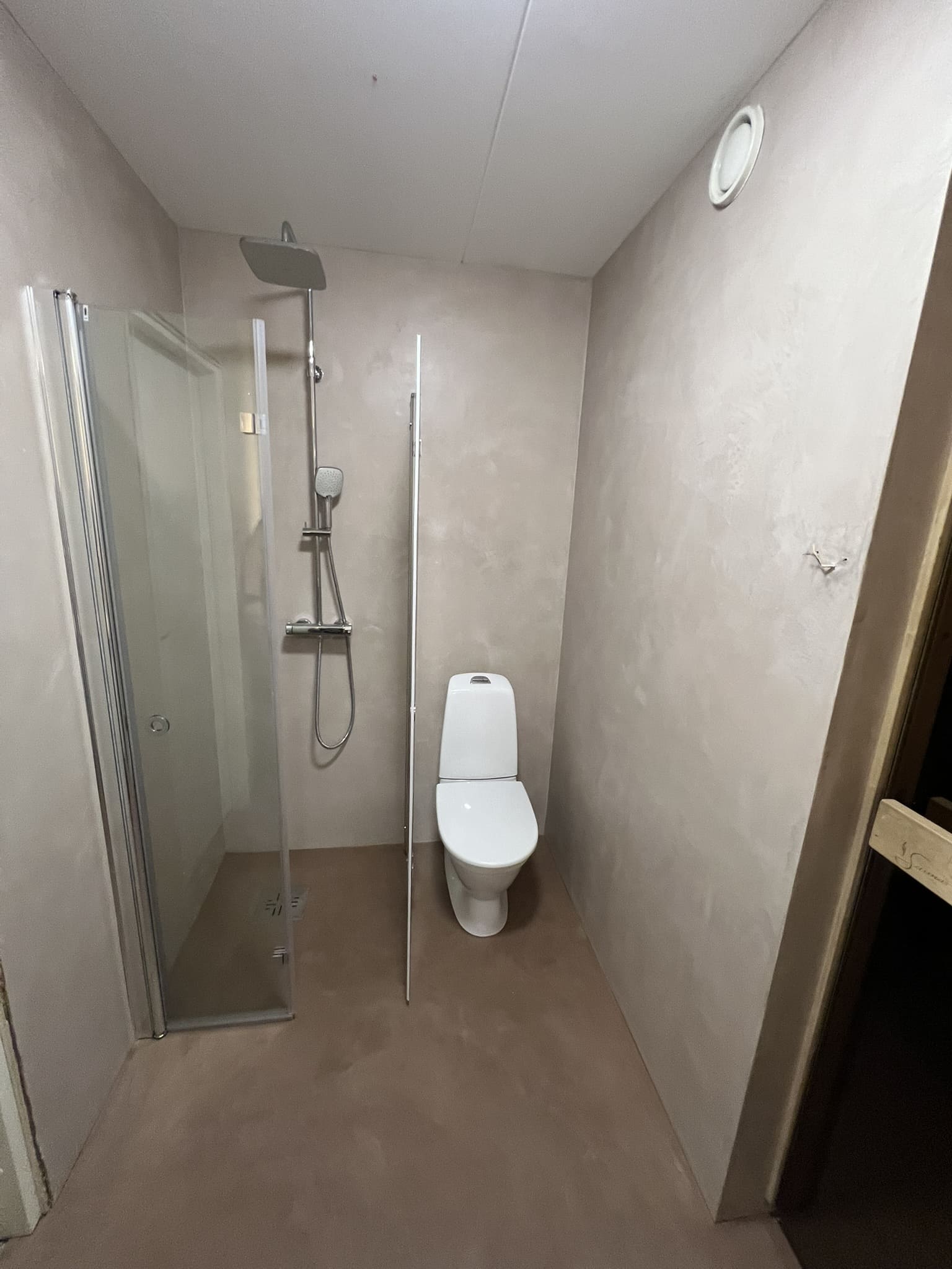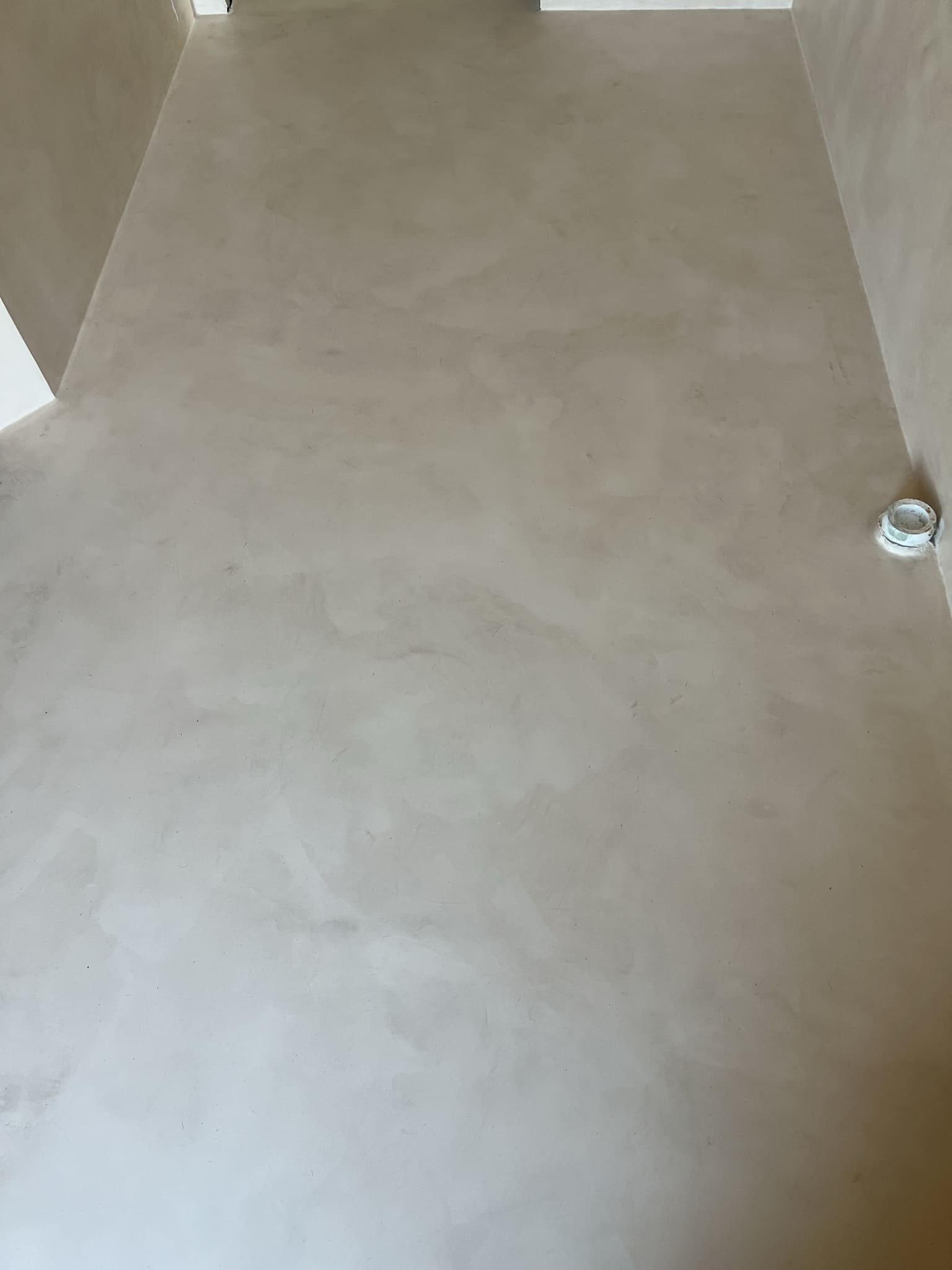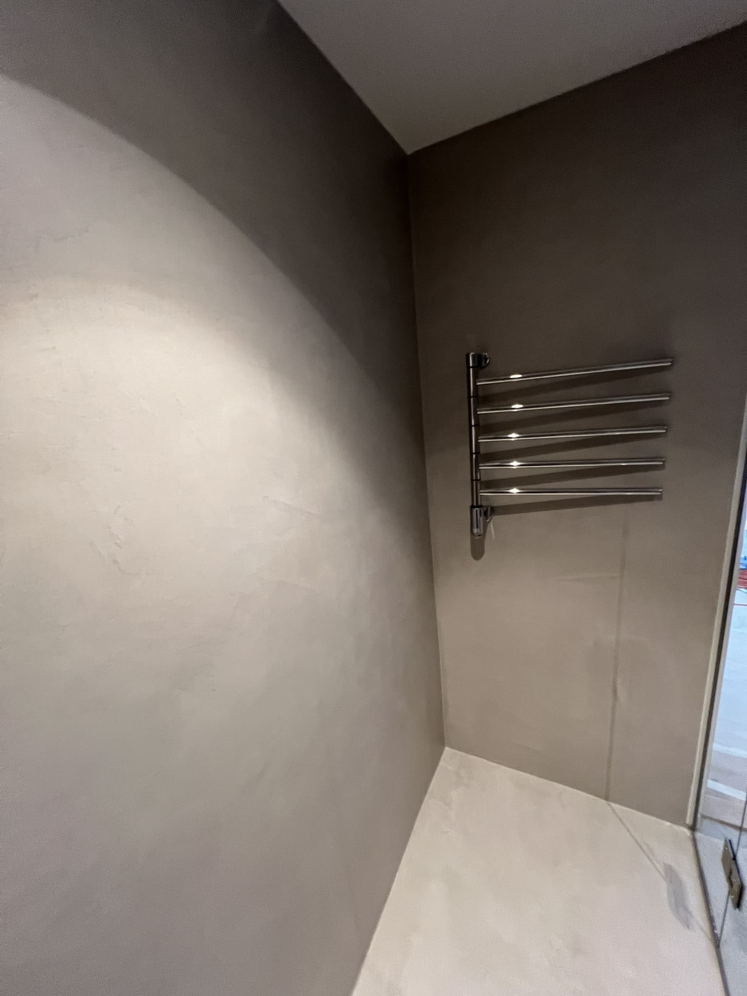 Mikrotsemendi tööd 8m2 pindalaga duširuumis suvilas. Toon: Sahhara.