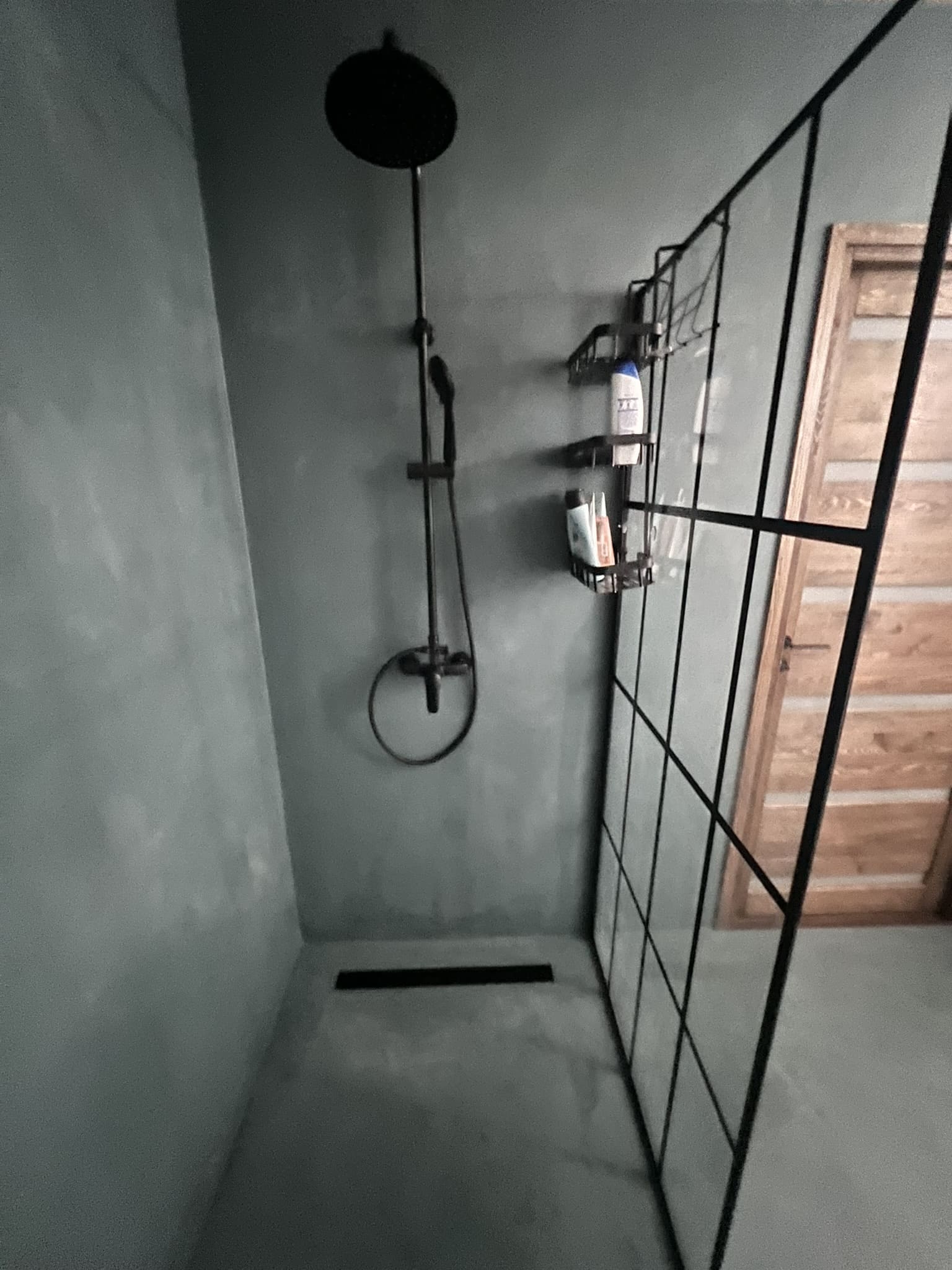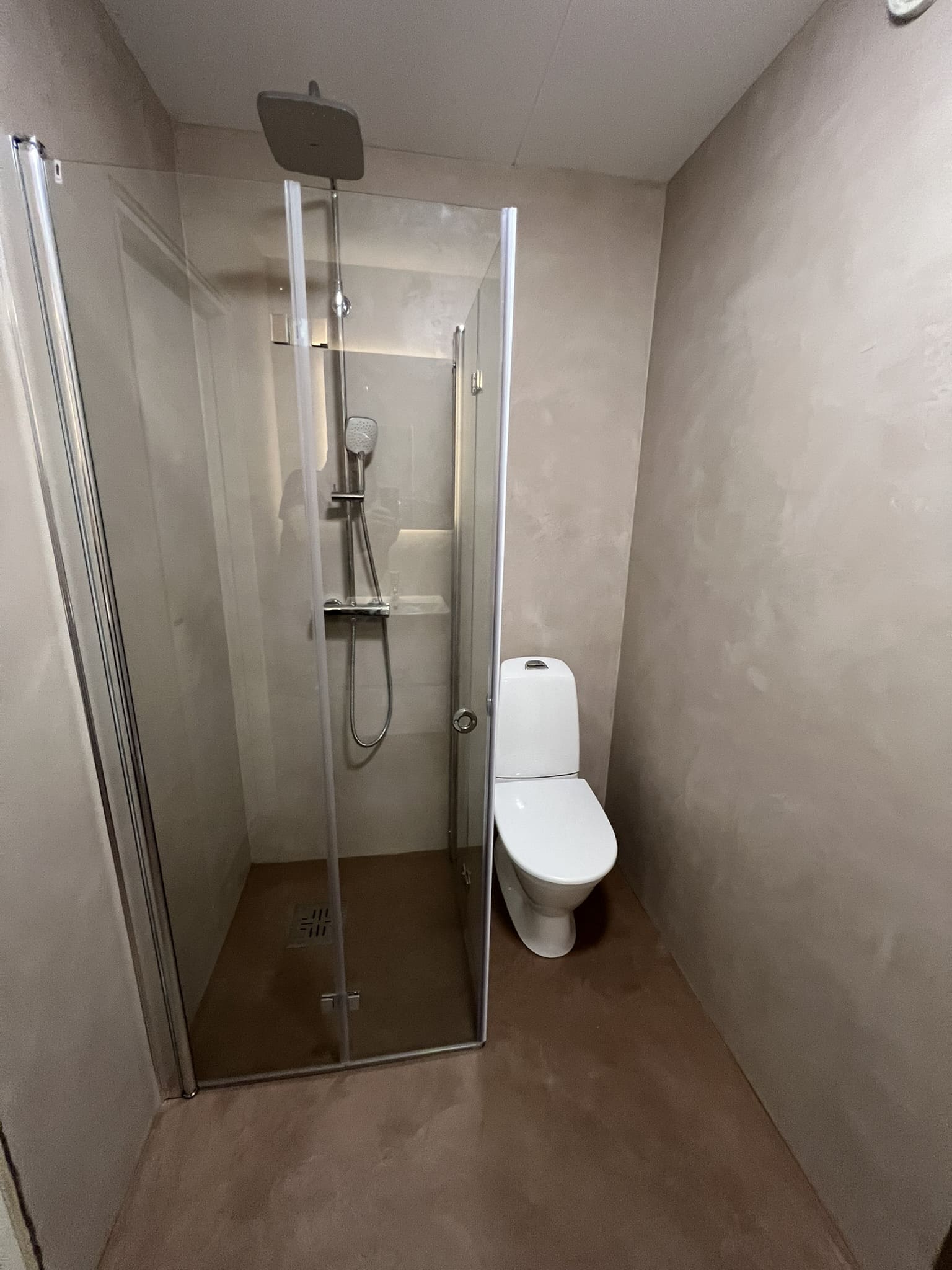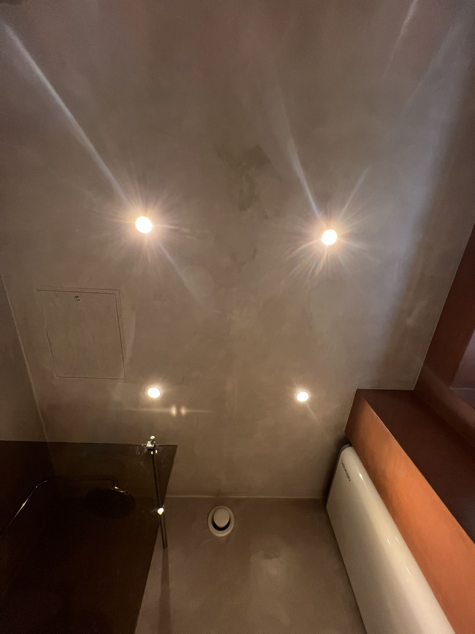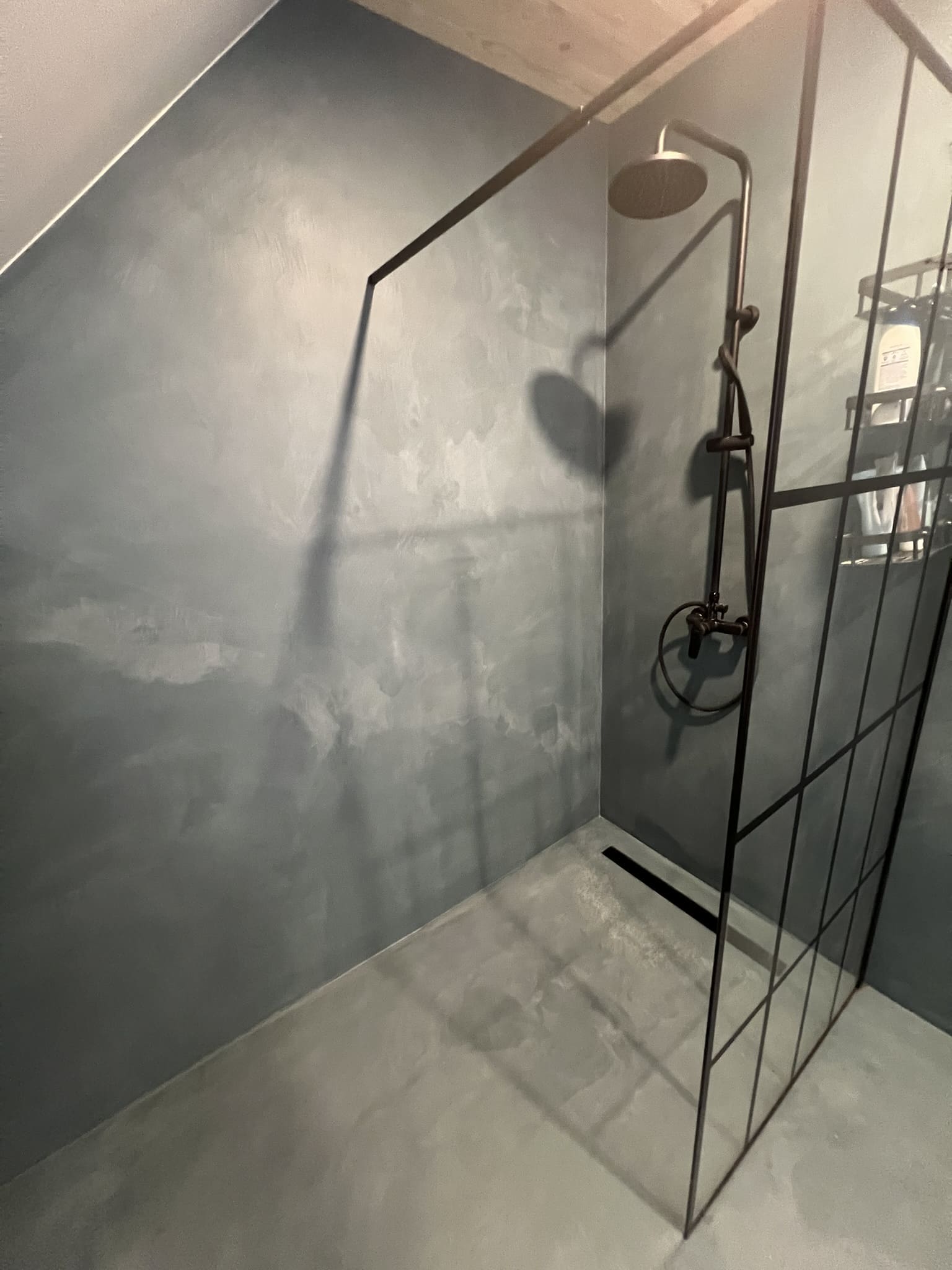Mikrotsemendi tööd 8m2 pindalaga duširuumis suvilas. Toon: Sahhara.
