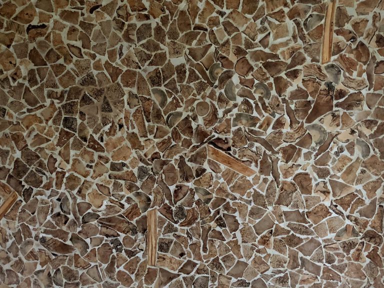 Kogu pind valmis käsitööna renoveeritavas palkmajas. Kasutatud on puiduseibe, mille vahed on täidetud kipsimassiga. Puidu tekstuuri pikaajaliseks säilitamiseks on seibid lihvitud ja pind töödeldud puidulakiga. Tulemuseks on askeetlik, pilkupüüdev ja kaootiline välimus.