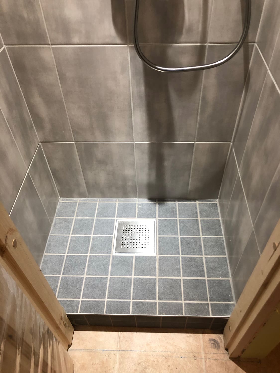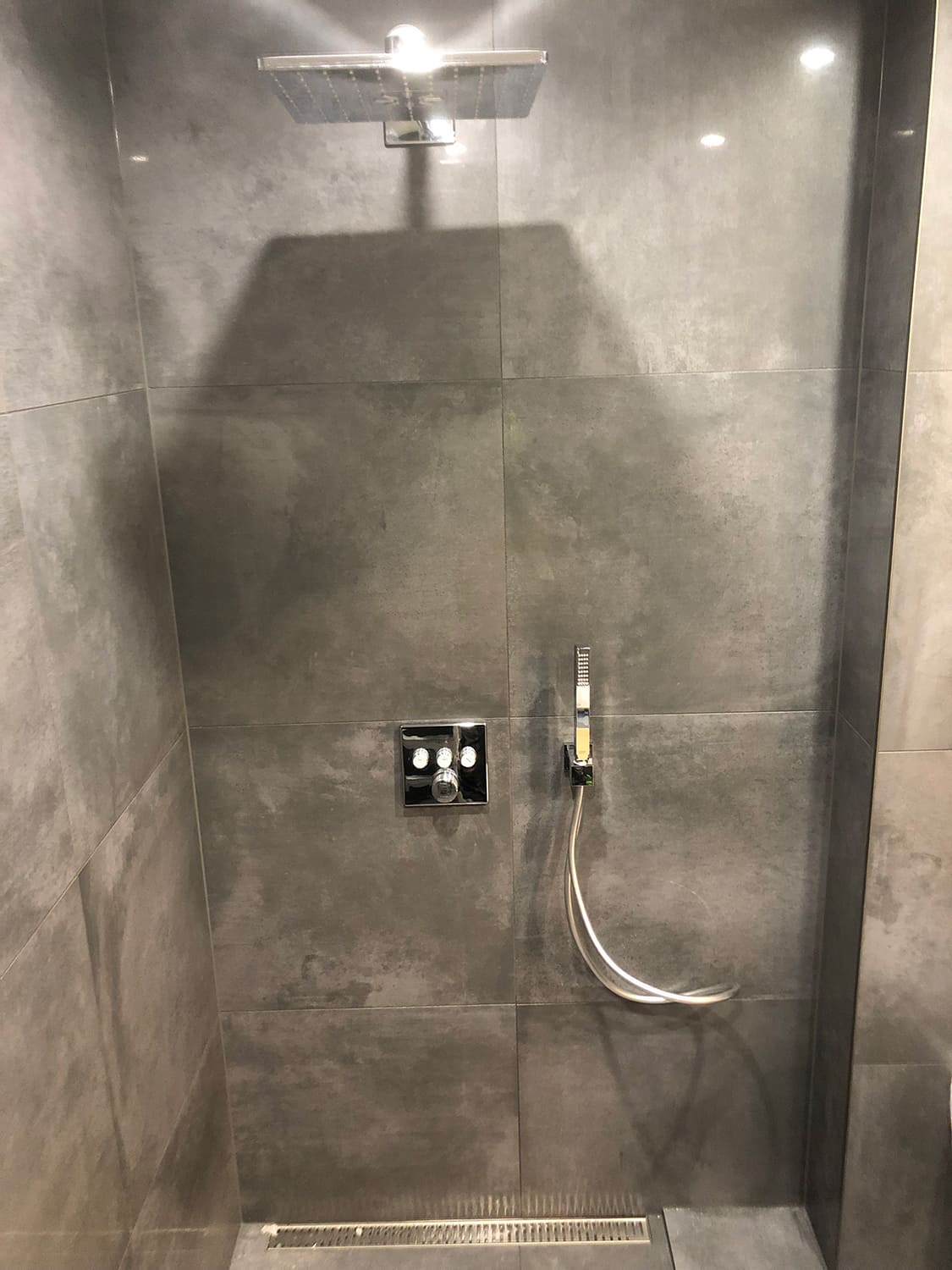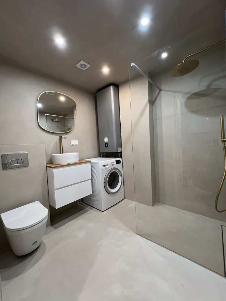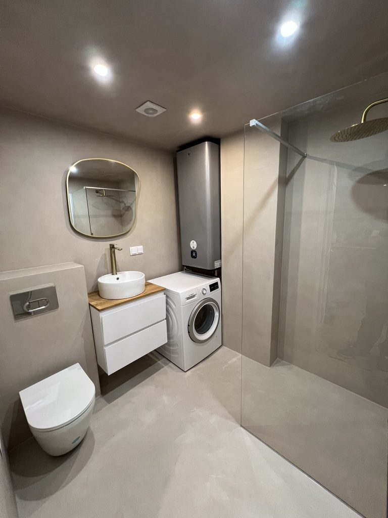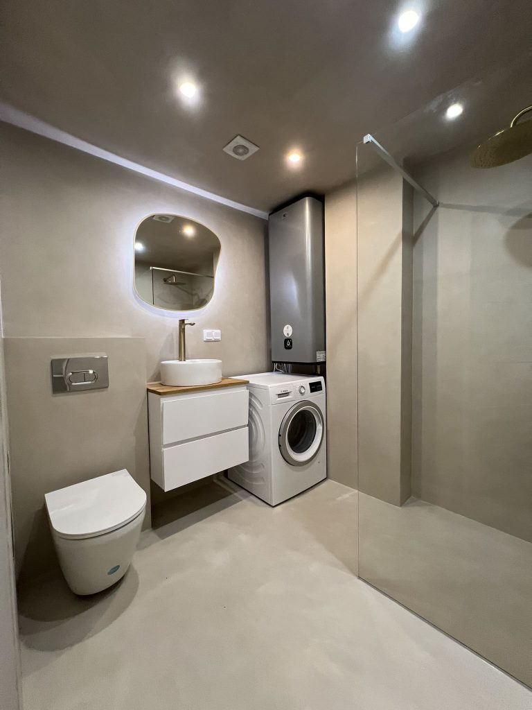 Lugu algas sellest, et klient kurtis , et vesi ei lähe ära nii nagu see seda tegema peaks. Pärast väikest inspekteerimist selgus, et torustik põranda all ei ole normide kohaselt ehitatud. Duširuumis on rohkesti hallitust, puudus igasugune ventilatsioon ja üldse oli rohkesti ehitusnorme eiratud. Ruum lammutati puhtaks ja ehitati uuesti nii nagu tänapäeva normid ette näevad. Lõppviimistluseks mikrotsement ( toon Gentle) ja santehnika ning mööbli paigaldus. Kuna tegemist oli ainult 2,5 m2 põrandapinnaga ruum, siis ruumi kokkuhoiu mõttes sai paigaldatud spetsiaalse valamu alla pesumasin. Nii on ruumis kõik vajalik olemas.