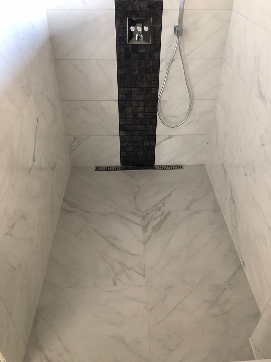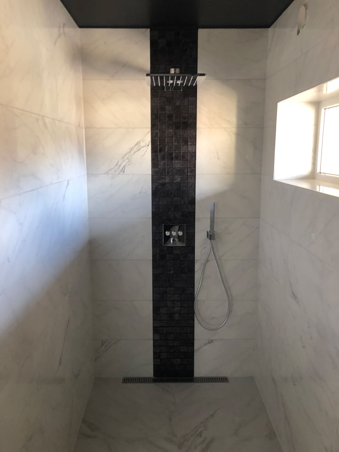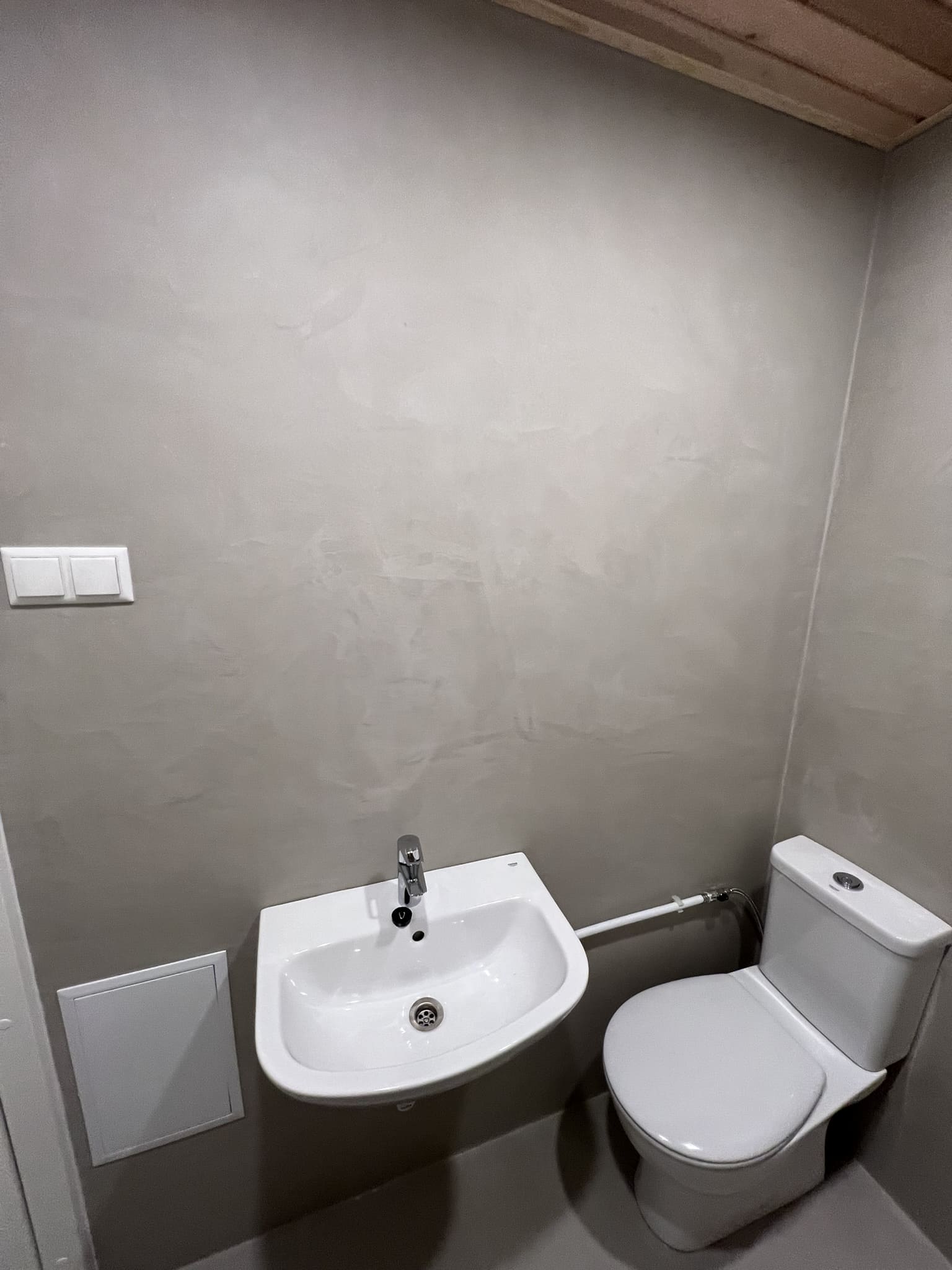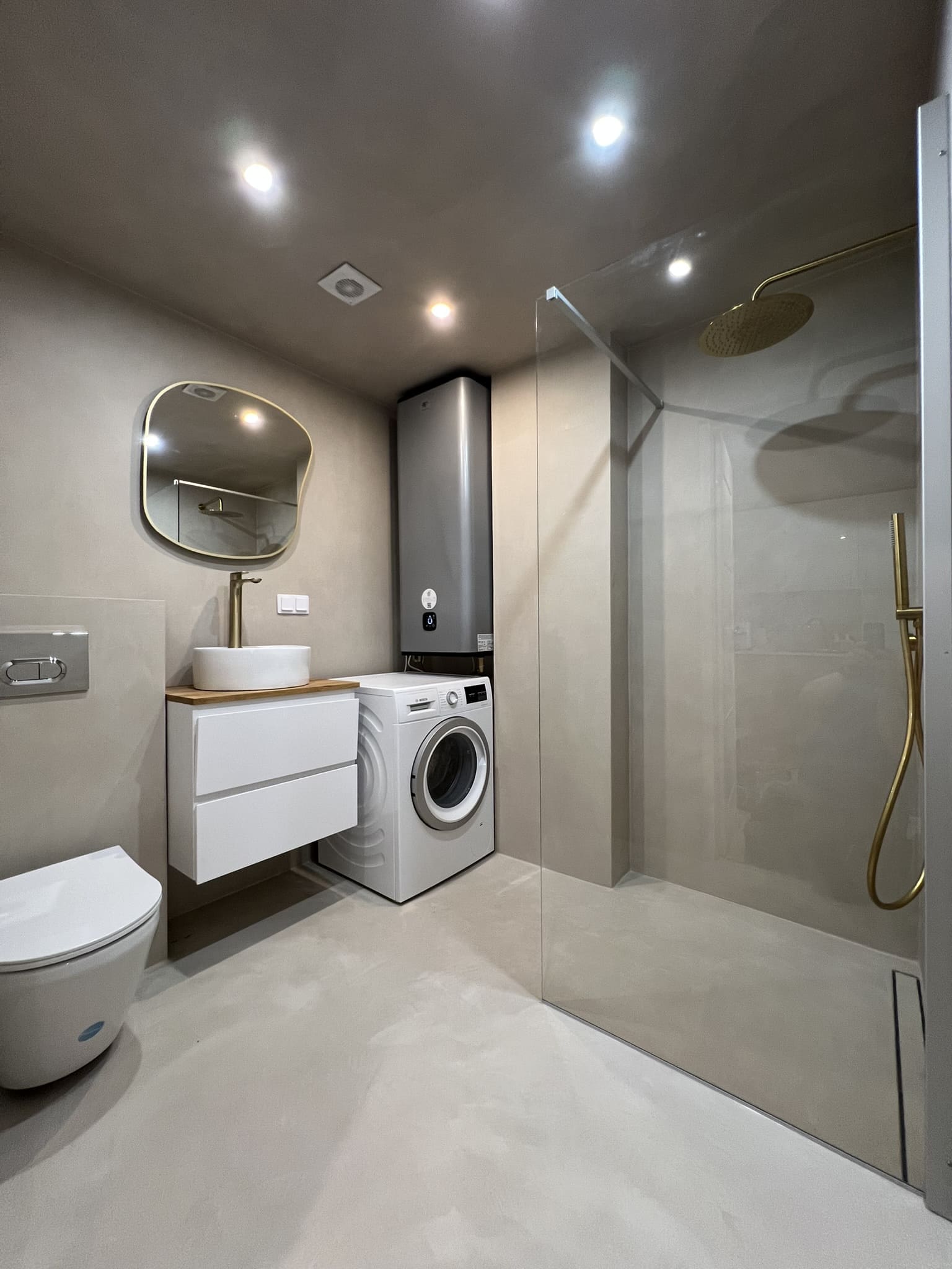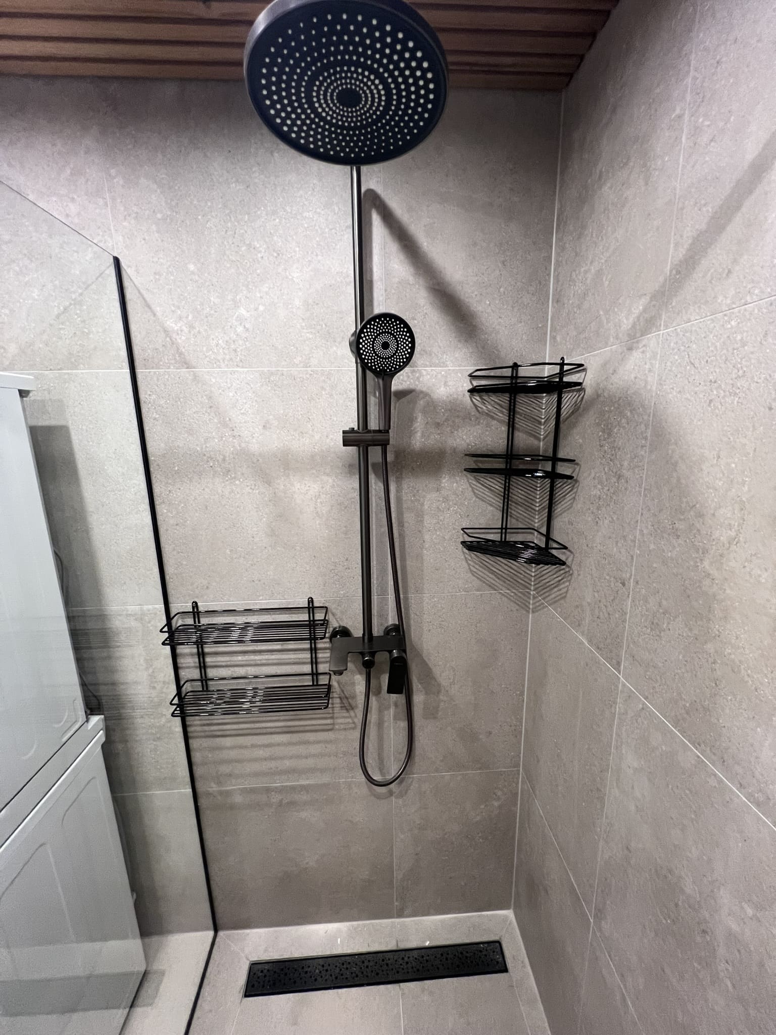 Lugu algas sellest, et klient kurtis , et vesi ei lähe ära nii nagu see seda tegema peaks. Pärast väikest inspekteerimist selgus, et torustik põranda all ei ole normide kohaselt ehitatud. Duširuumis on rohkesti hallitust, puudus igasugune ventilatsioon ja üldse oli rohkesti ehitusnorme eiratud. Ruum lammutati puhtaks ja ehitati uuesti nii nagu tänapäeva normid ette näevad. Lõppviimistluseks mikrotsement ( toon Gentle) ja santehnika ning mööbli paigaldus. Kuna tegemist oli ainult 2,5 m2 põrandapinnaga ruum, siis ruumi kokkuhoiu mõttes sai paigaldatud spetsiaalse valamu alla pesumasin. Nii on ruumis kõik vajalik olemas.