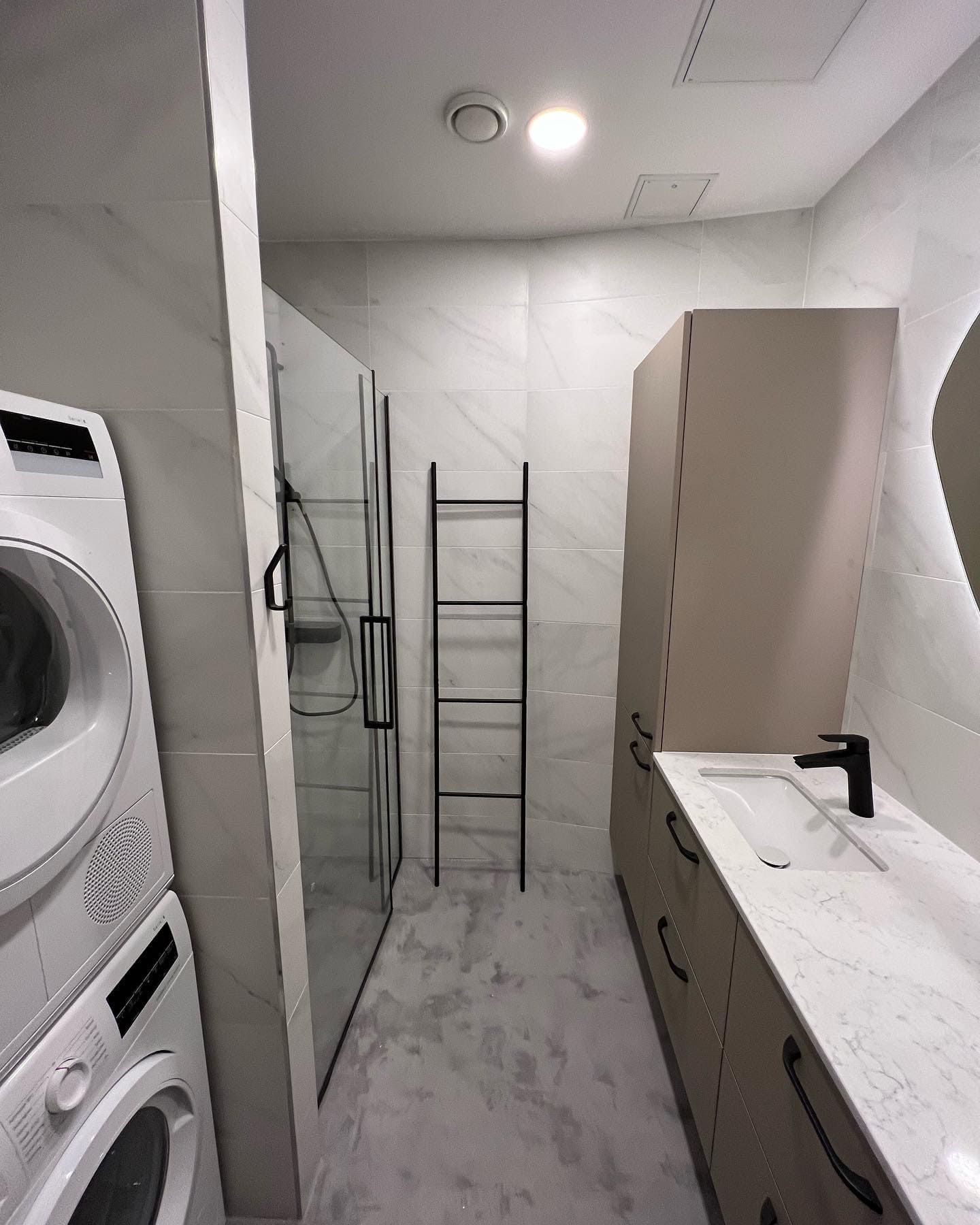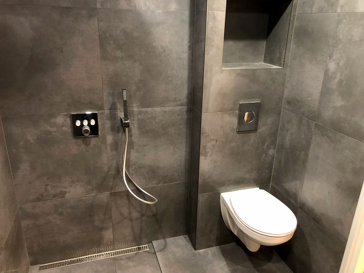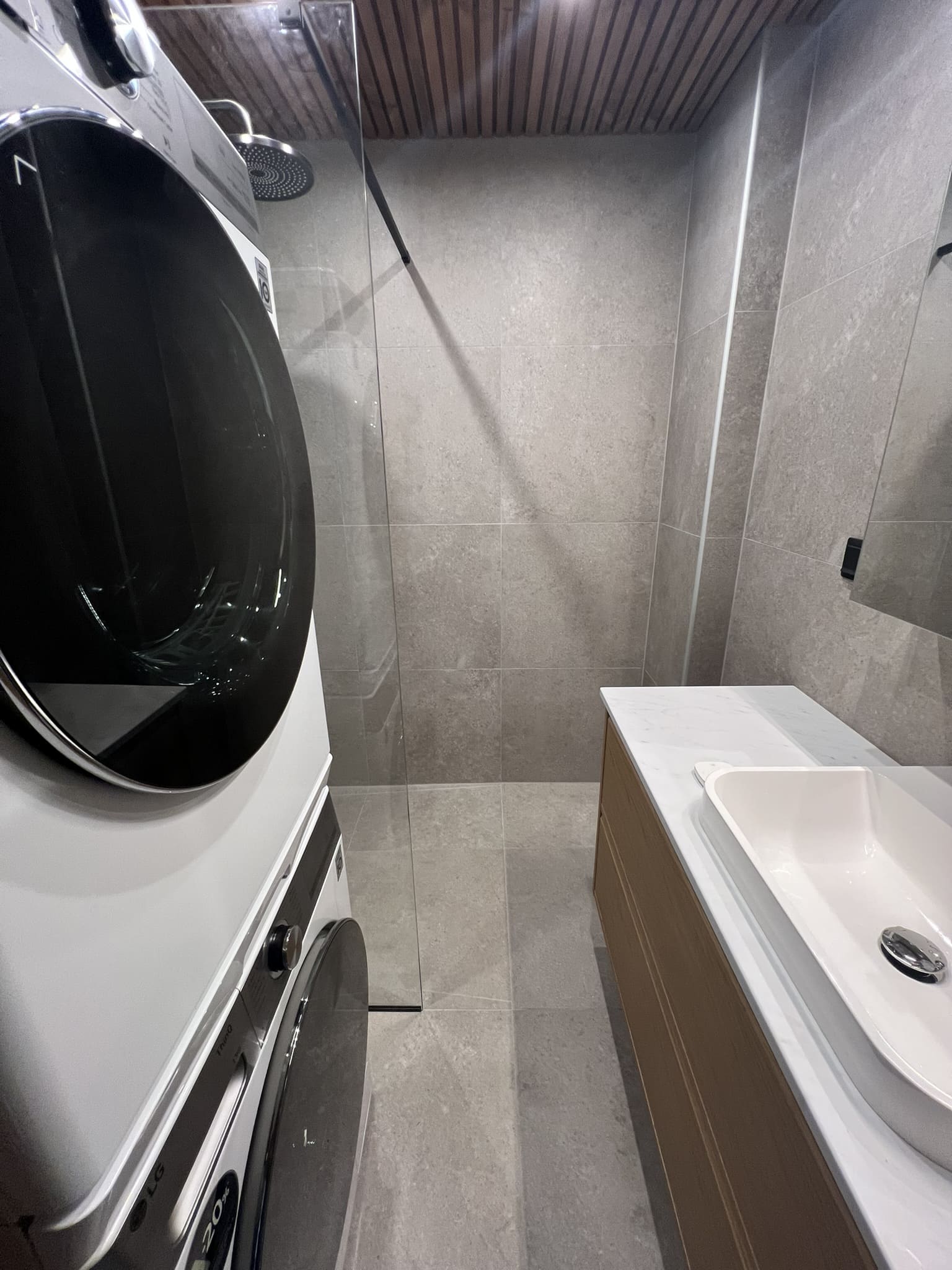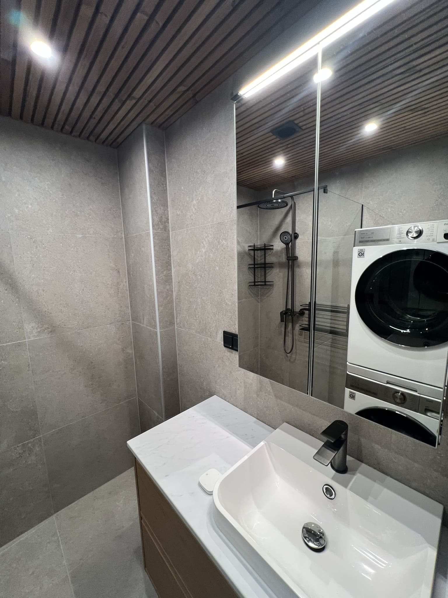 Täislahendus torutöödest, ruumi väljaehitusest, plaatimisest ja tarvikute paigaldamisest. Kasutatud on kvaliteetset ja innovaatilist Grohe seinasisest SmartControl-segistit ning seinasisest WC-potti. Grohe sanitaartehnika annab igale pesuruumile elegantse ja modernse välimuse.