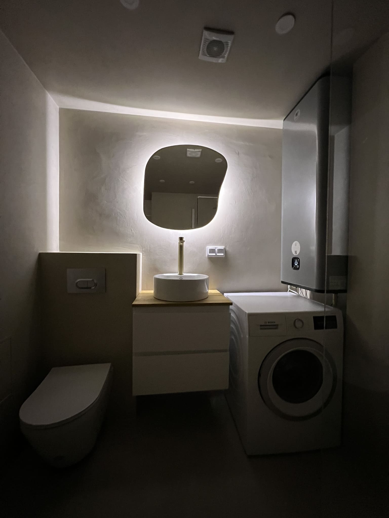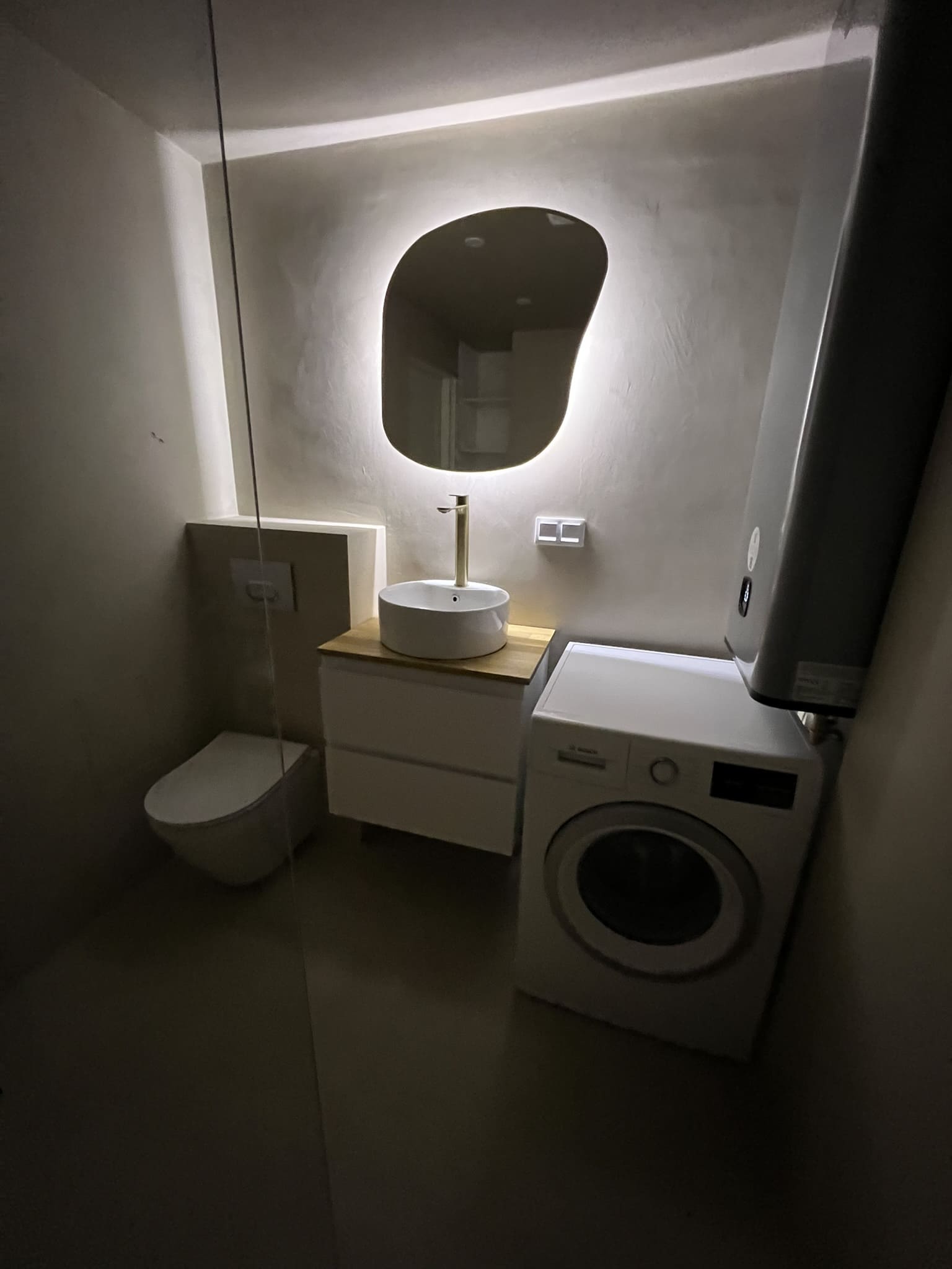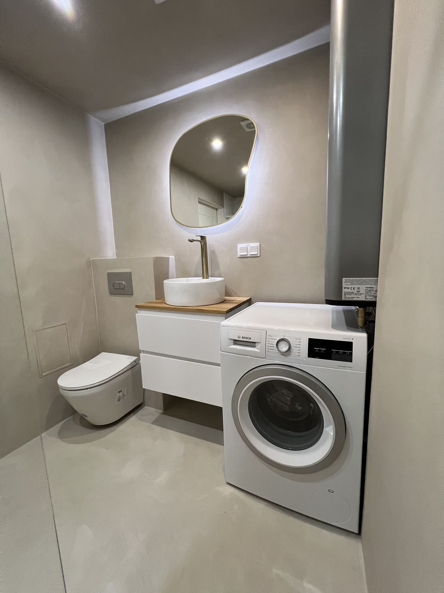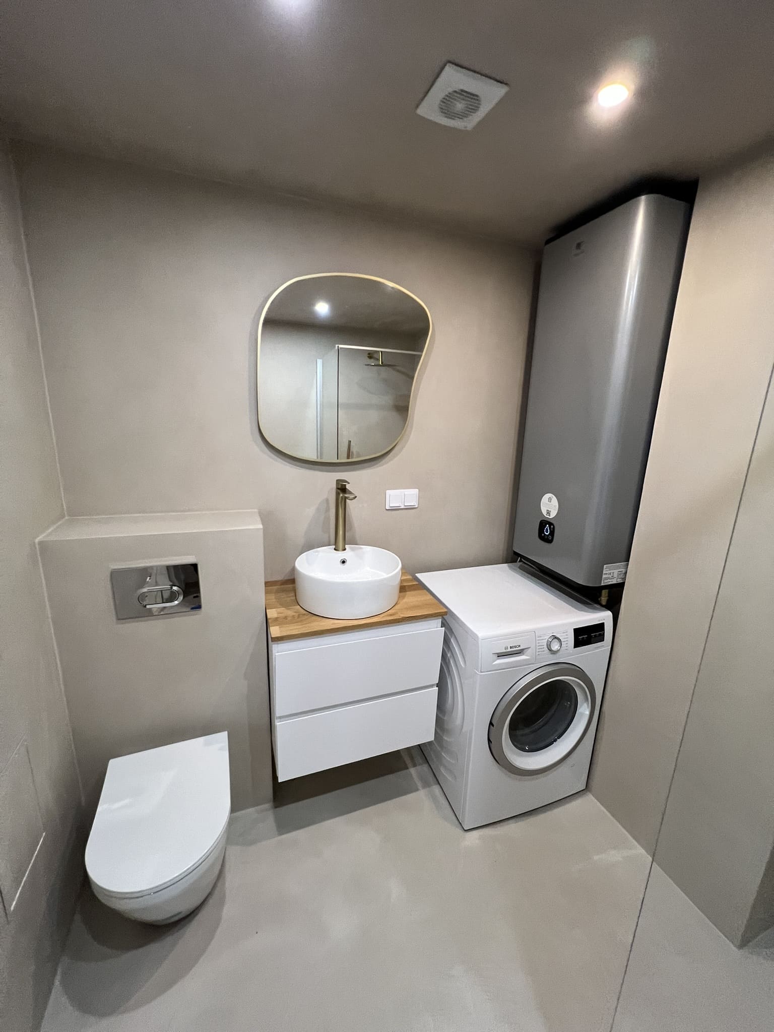 Täislahendus torutöödest, ruumi väljaehitusest, plaatimisest ja tarvikute paigaldamisest. Kasutatud on kvaliteetset ja innovaatilist Grohe seinasisest SmartControl-segistit ning seinasisest WC-potti. Grohe sanitaartehnika annab igale pesuruumile elegantse ja modernse välimuse.