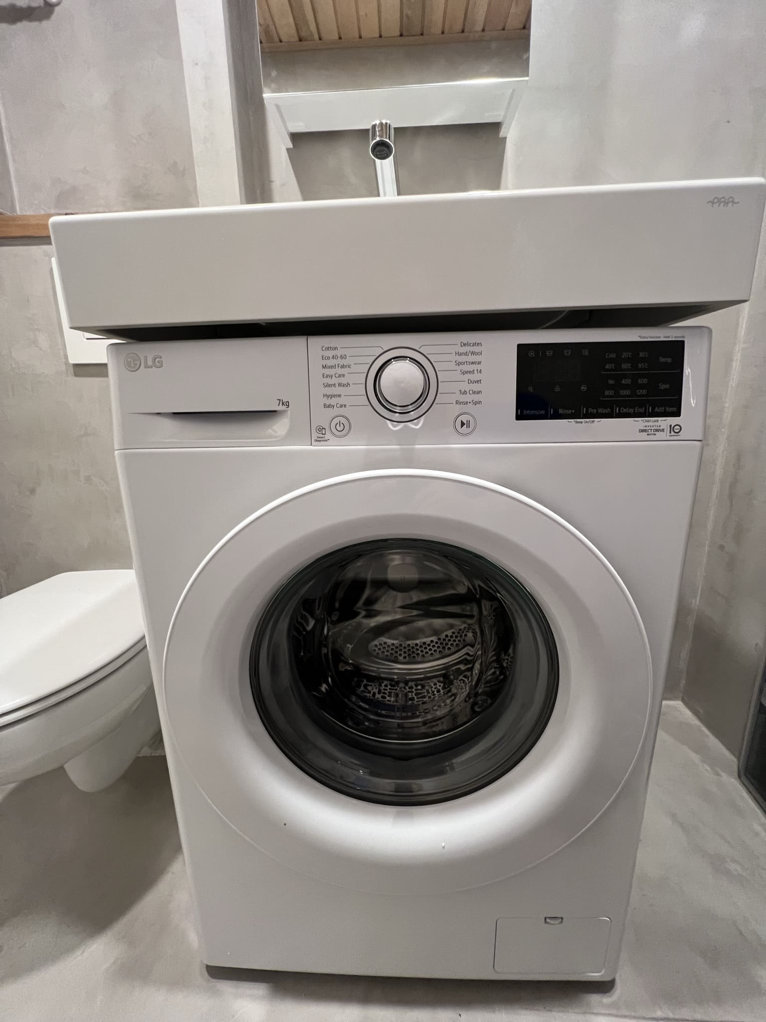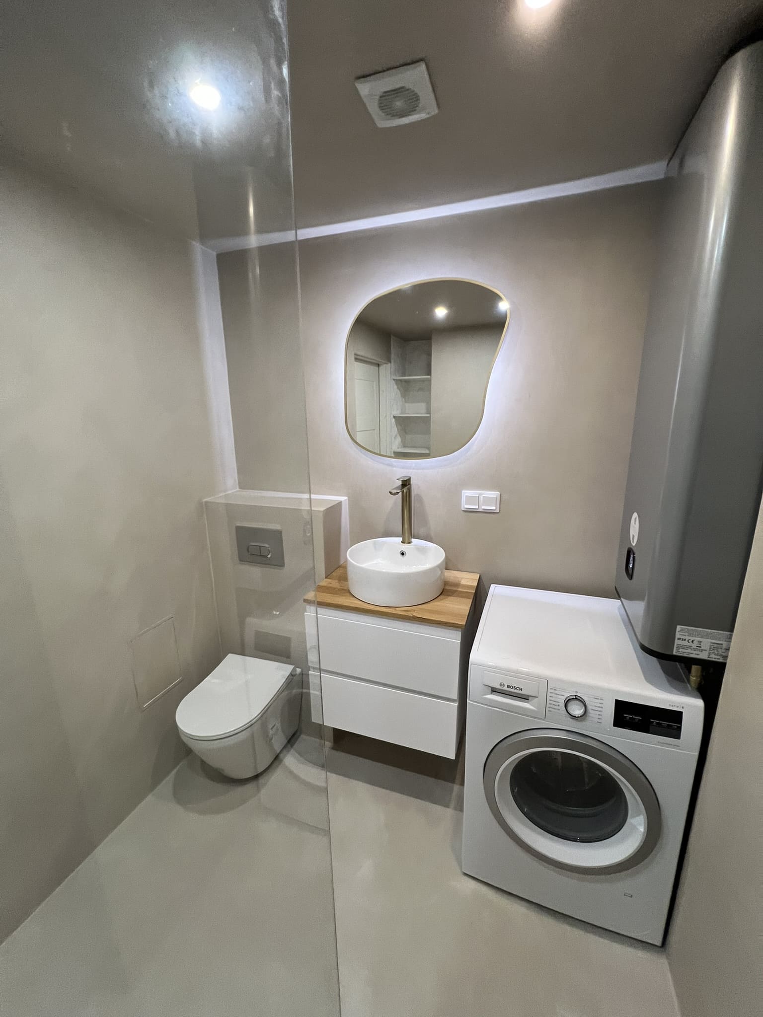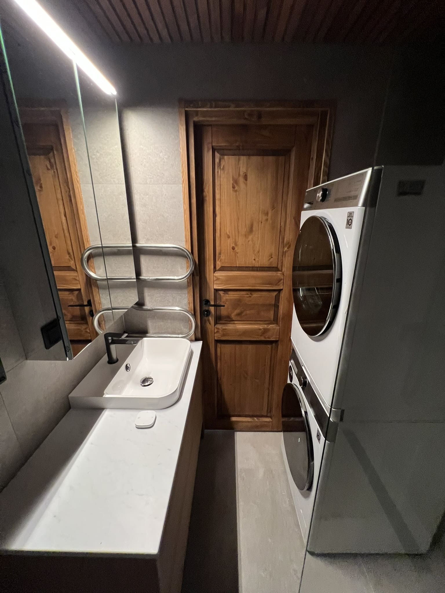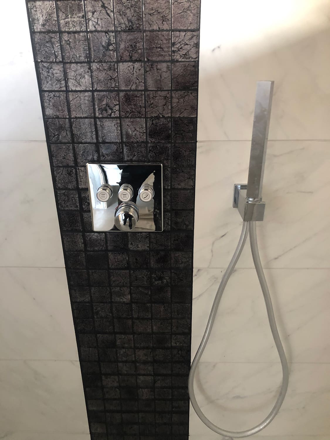Täislahendus torutöödest, ruumi väljaehitusest, plaatimisest ja tarvikute paigaldamisest. Kasutatud on kvaliteetset ja innovaatilist Grohe seinasisest SmartControl-segistit ning seinasisest WC-potti. Grohe sanitaartehnika annab igale pesuruumile elegantse ja modernse välimuse.