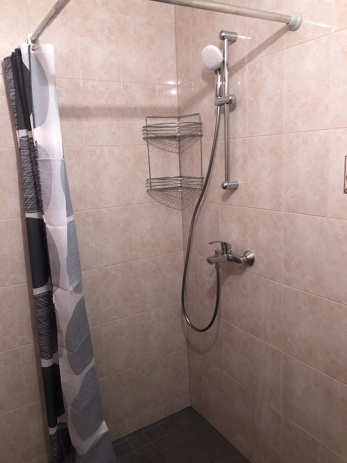 Täislahendusena valminud 2,5 m2 pindalaga duširuum paneelmajas.