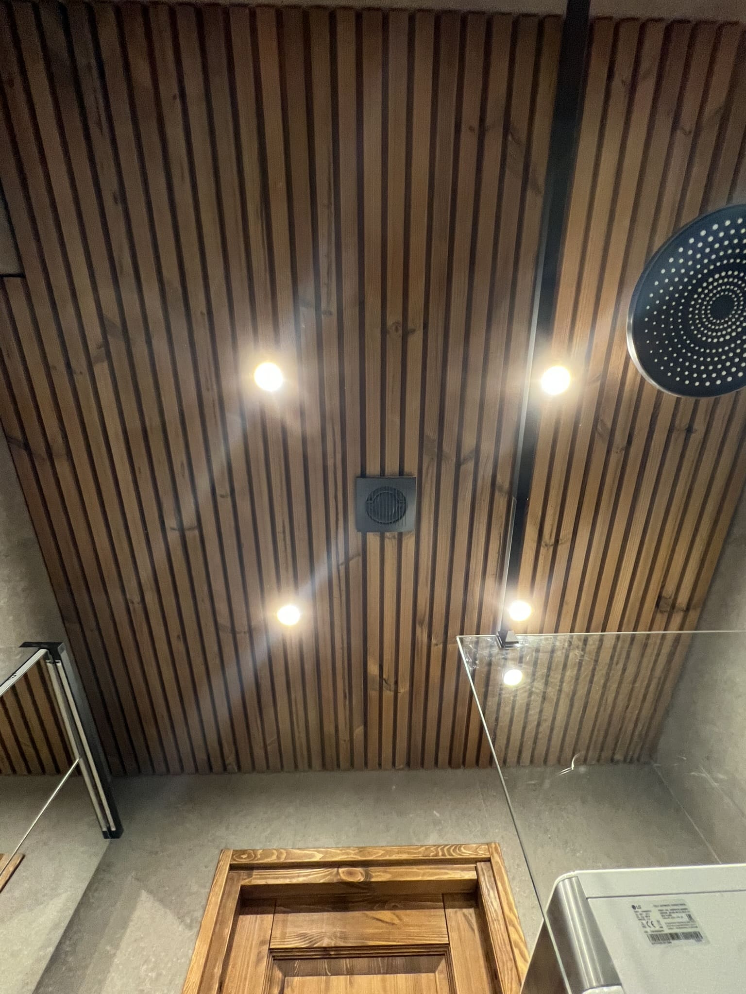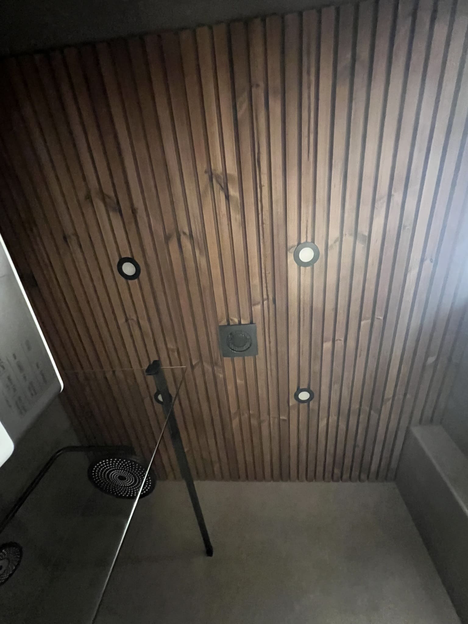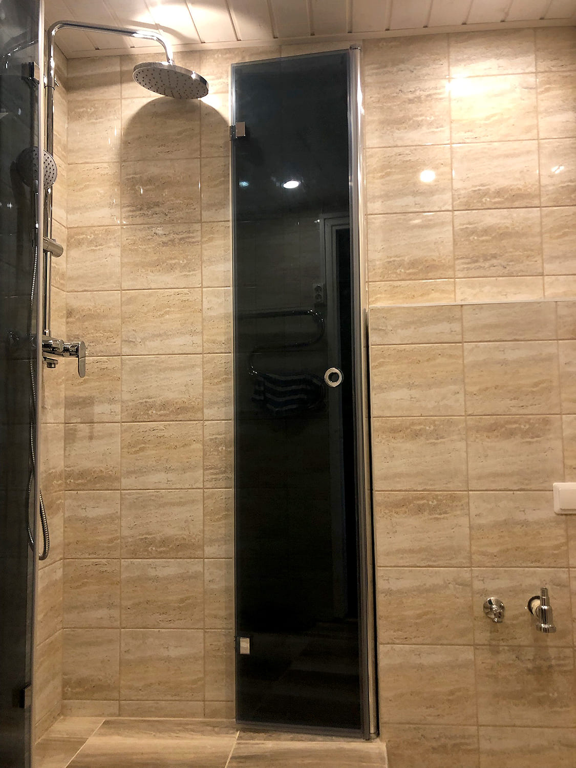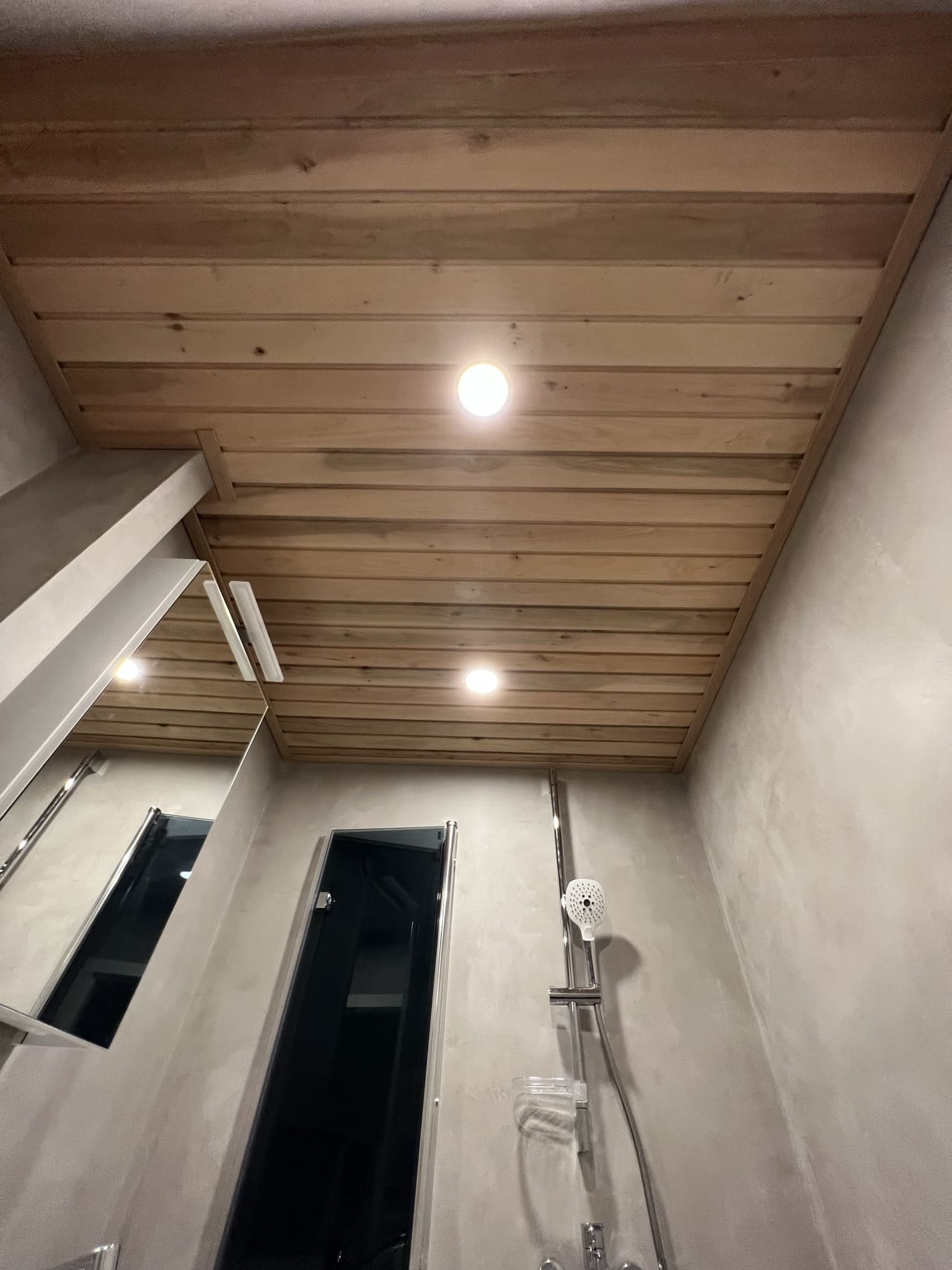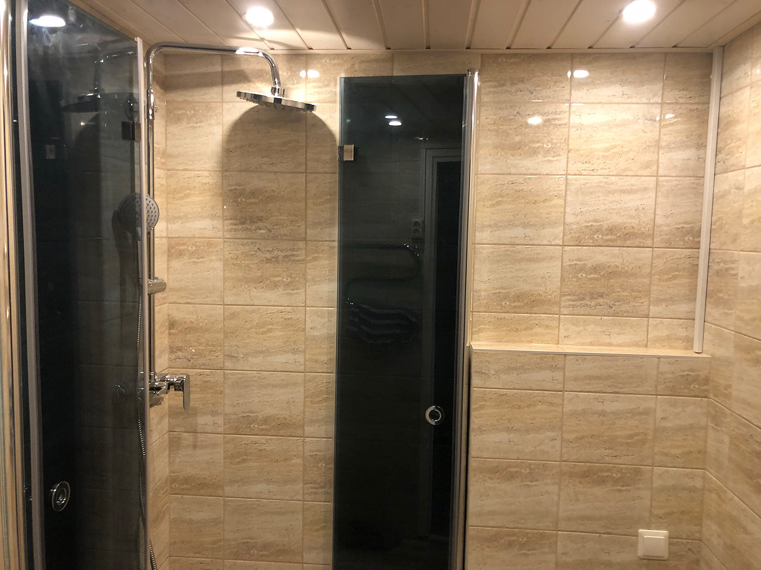 Algselt oli duširuumis saun ka sisse ehitatud, mis valede ehitusvõtetega oli halvasti ehitatud, mille tulemusena esines duširuumi põranda piirkonnas hallitust. Sauna asemele ehitati avar dušinurk. Lae ja seinte viimistlusmaterjalina kasutasime termotöödeldud välisvoodrilauda UTS2 profiili, mis paistab kaugelt silma. Sisustuse ja santehnika valis klient ise, mida meie lahkesti paigaldasime.
