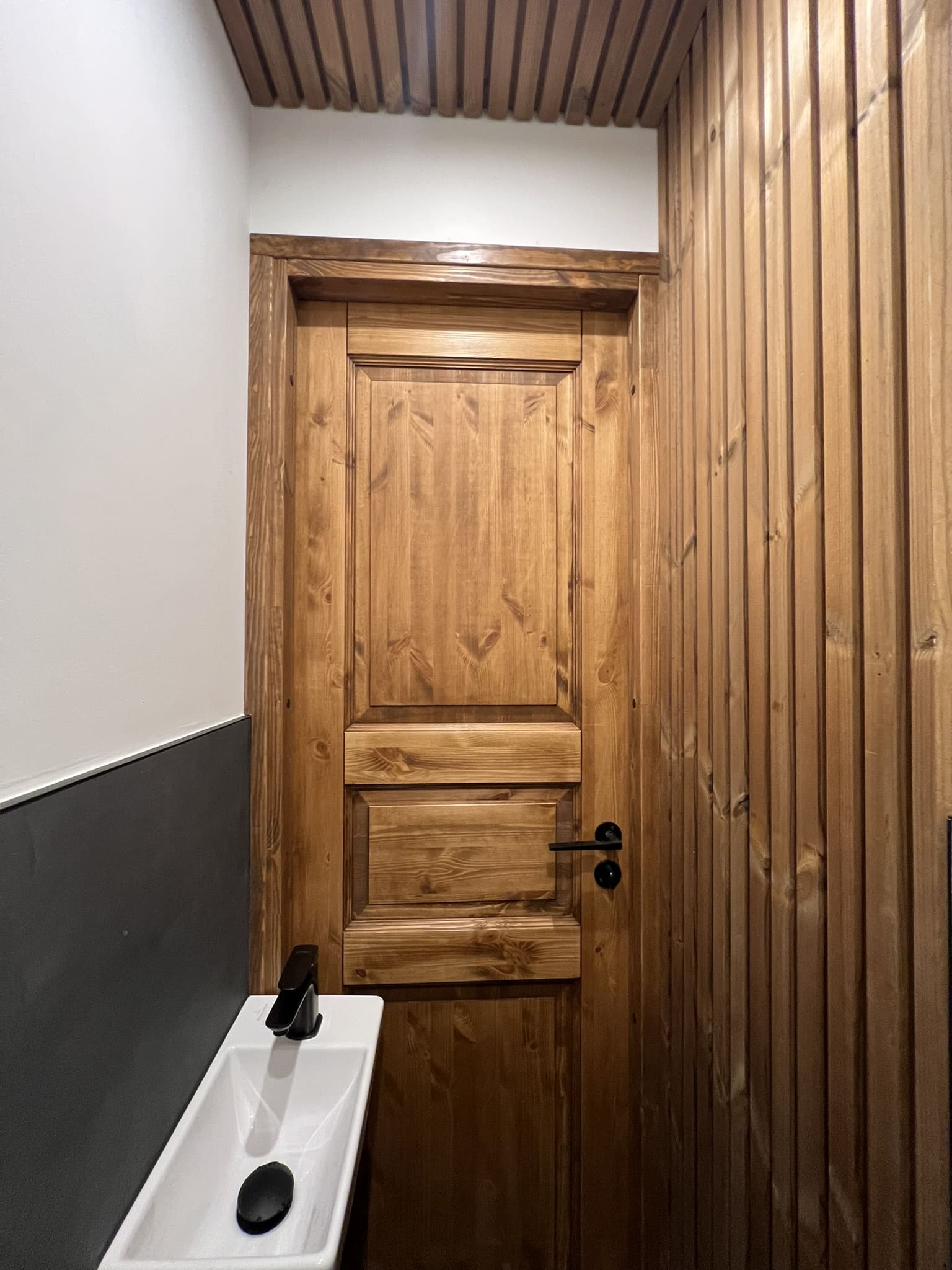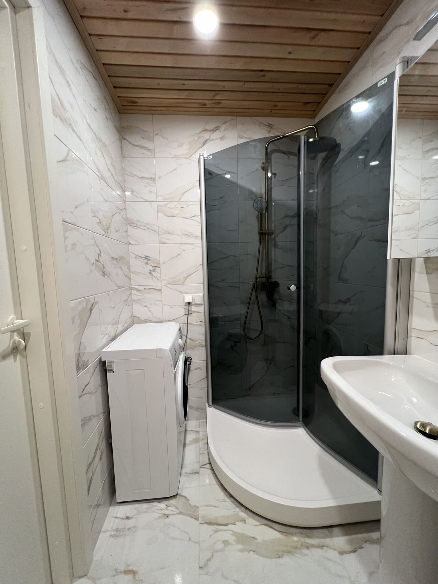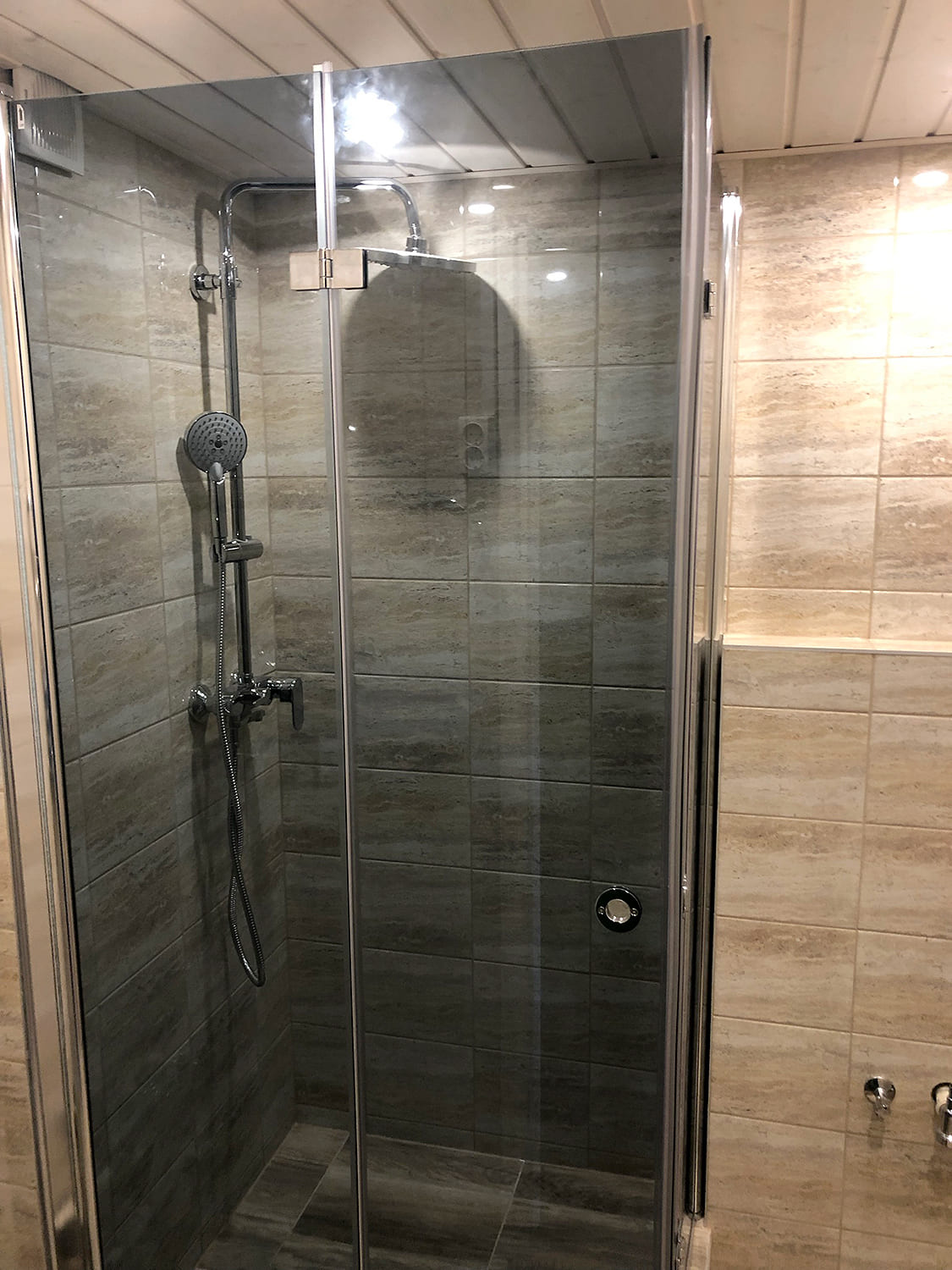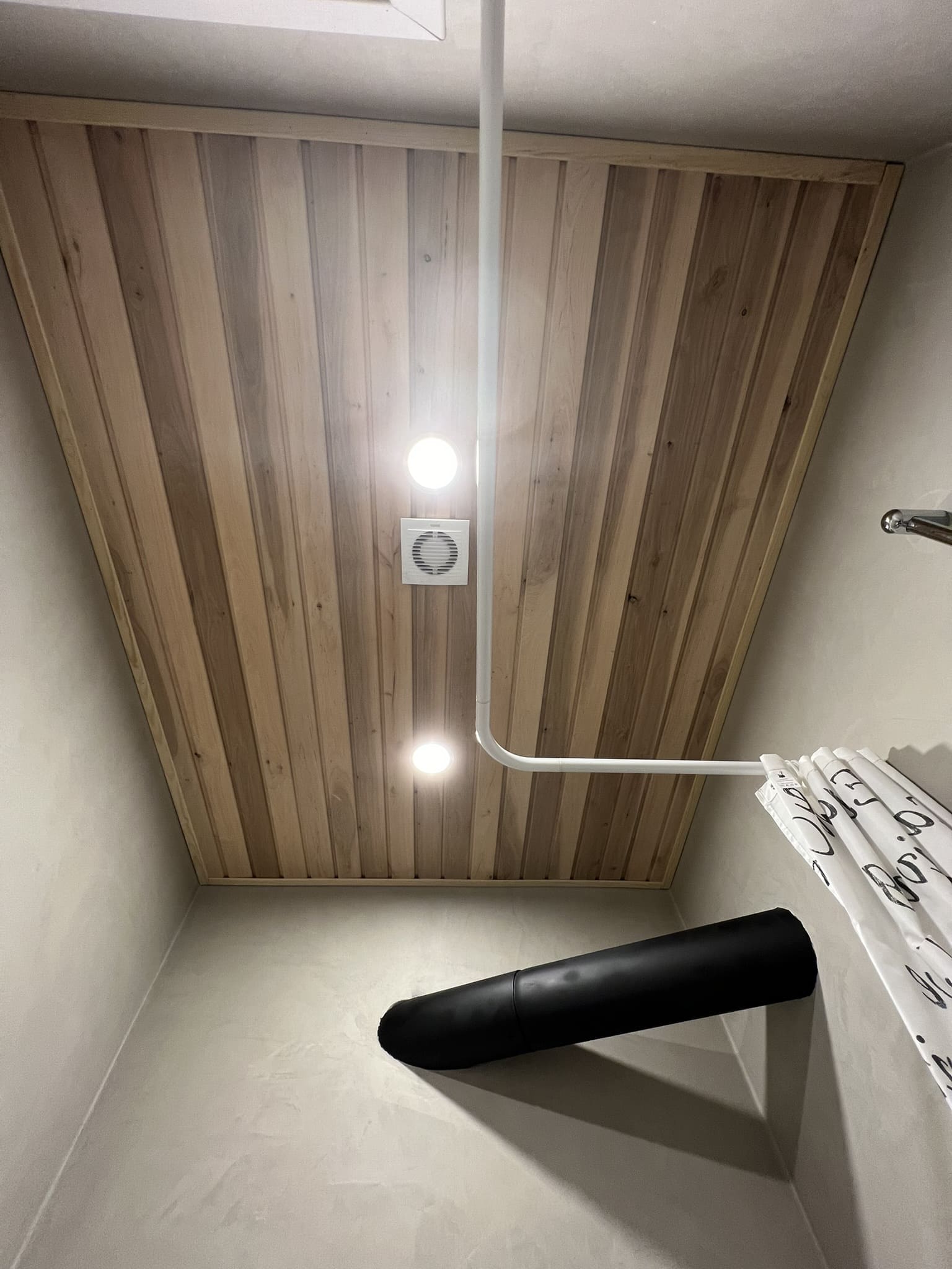 Algselt oli duširuumis saun ka sisse ehitatud, mis valede ehitusvõtetega oli halvasti ehitatud, mille tulemusena esines duširuumi põranda piirkonnas hallitust. Sauna asemele ehitati avar dušinurk. Lae ja seinte viimistlusmaterjalina kasutasime termotöödeldud välisvoodrilauda UTS2 profiili, mis paistab kaugelt silma. Sisustuse ja santehnika valis klient ise, mida meie lahkesti paigaldasime.