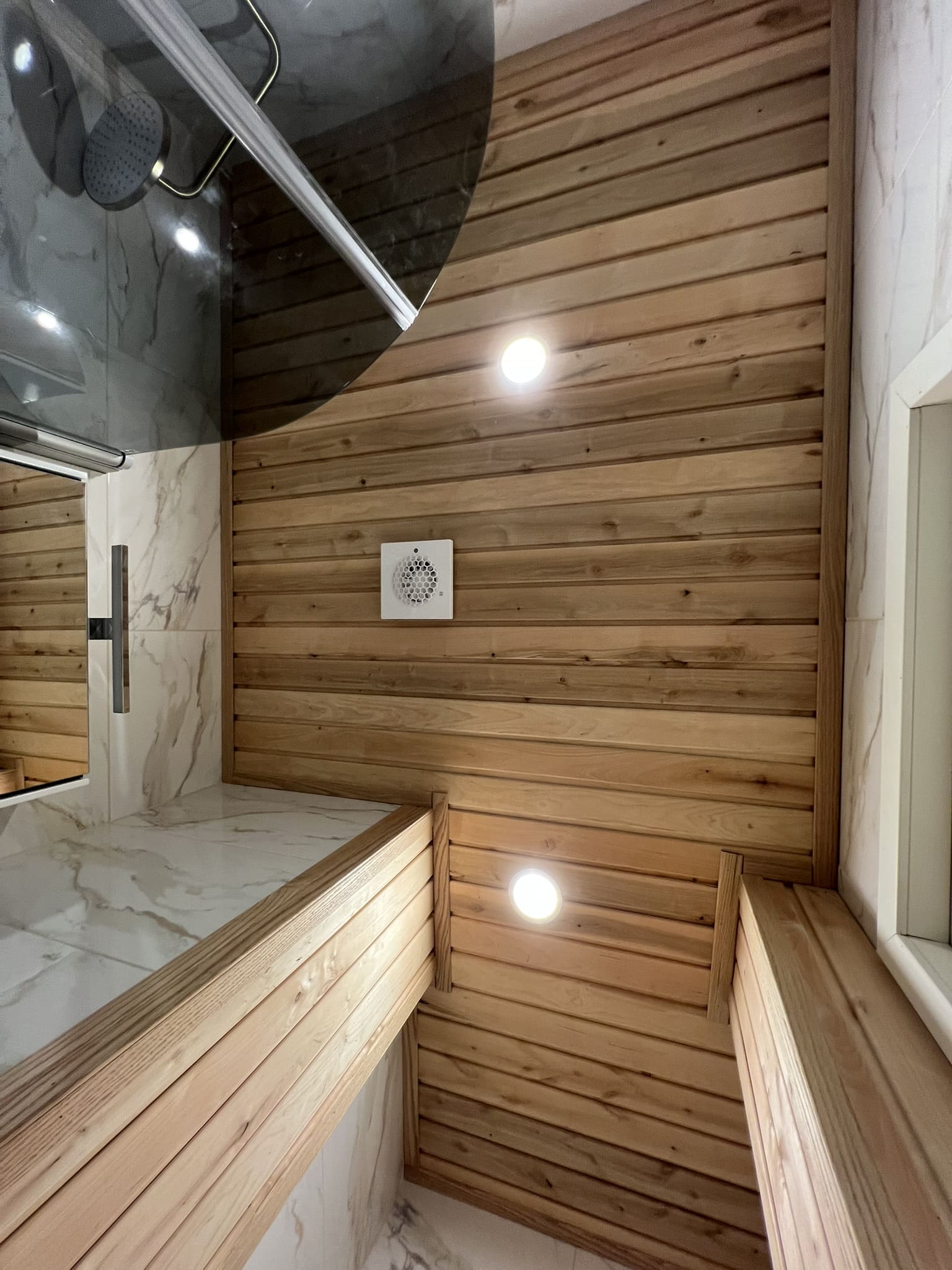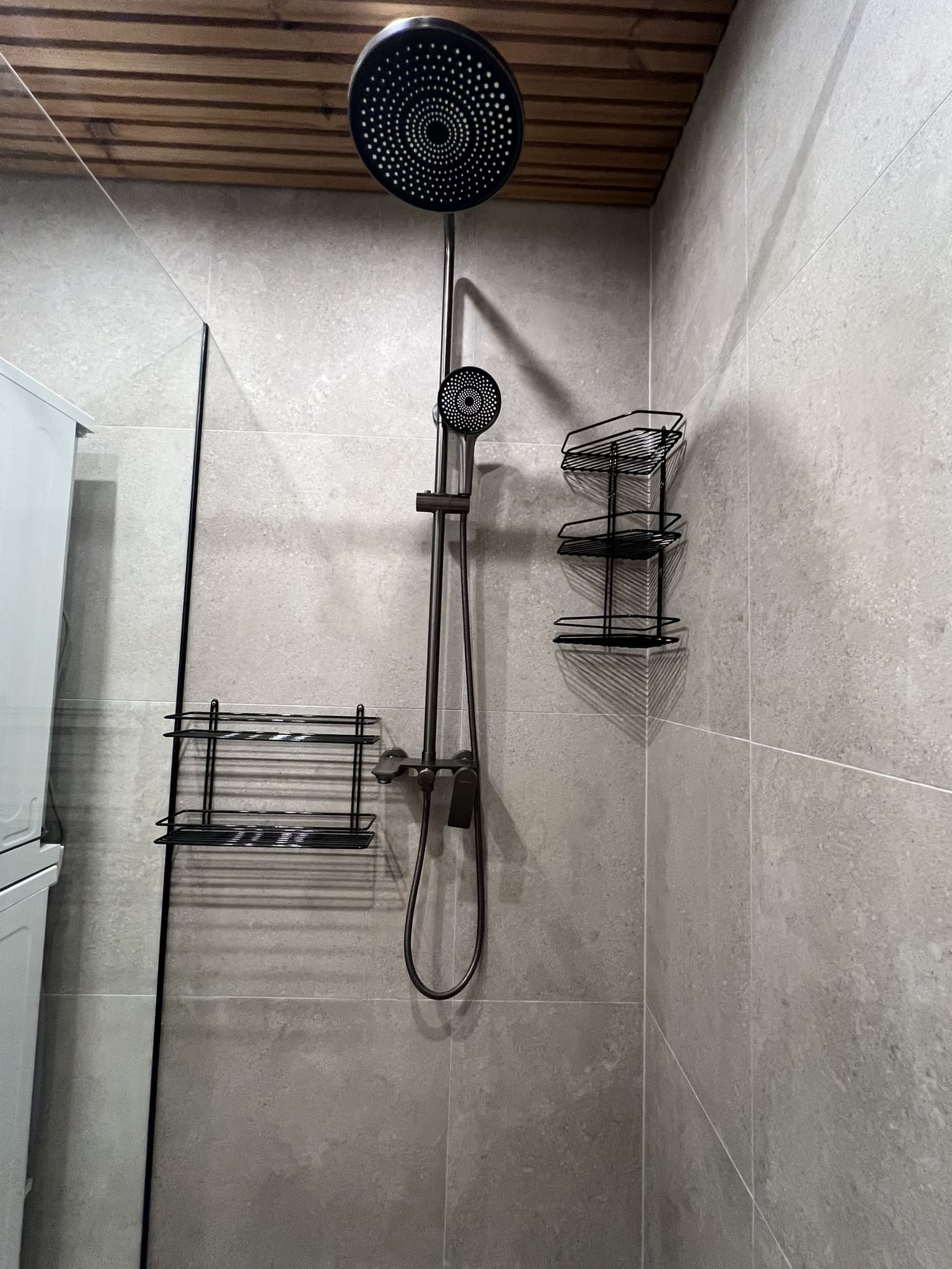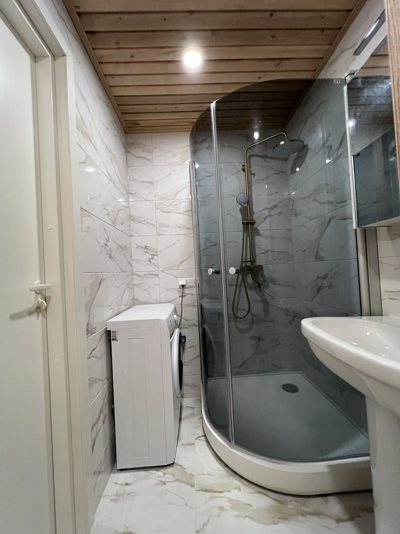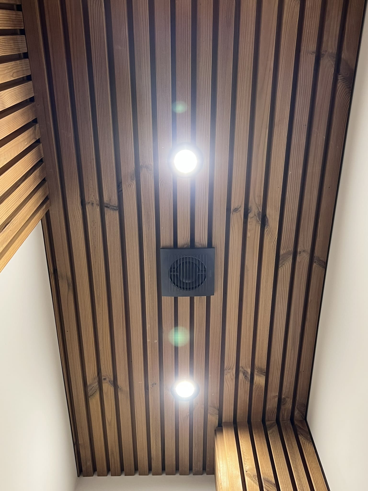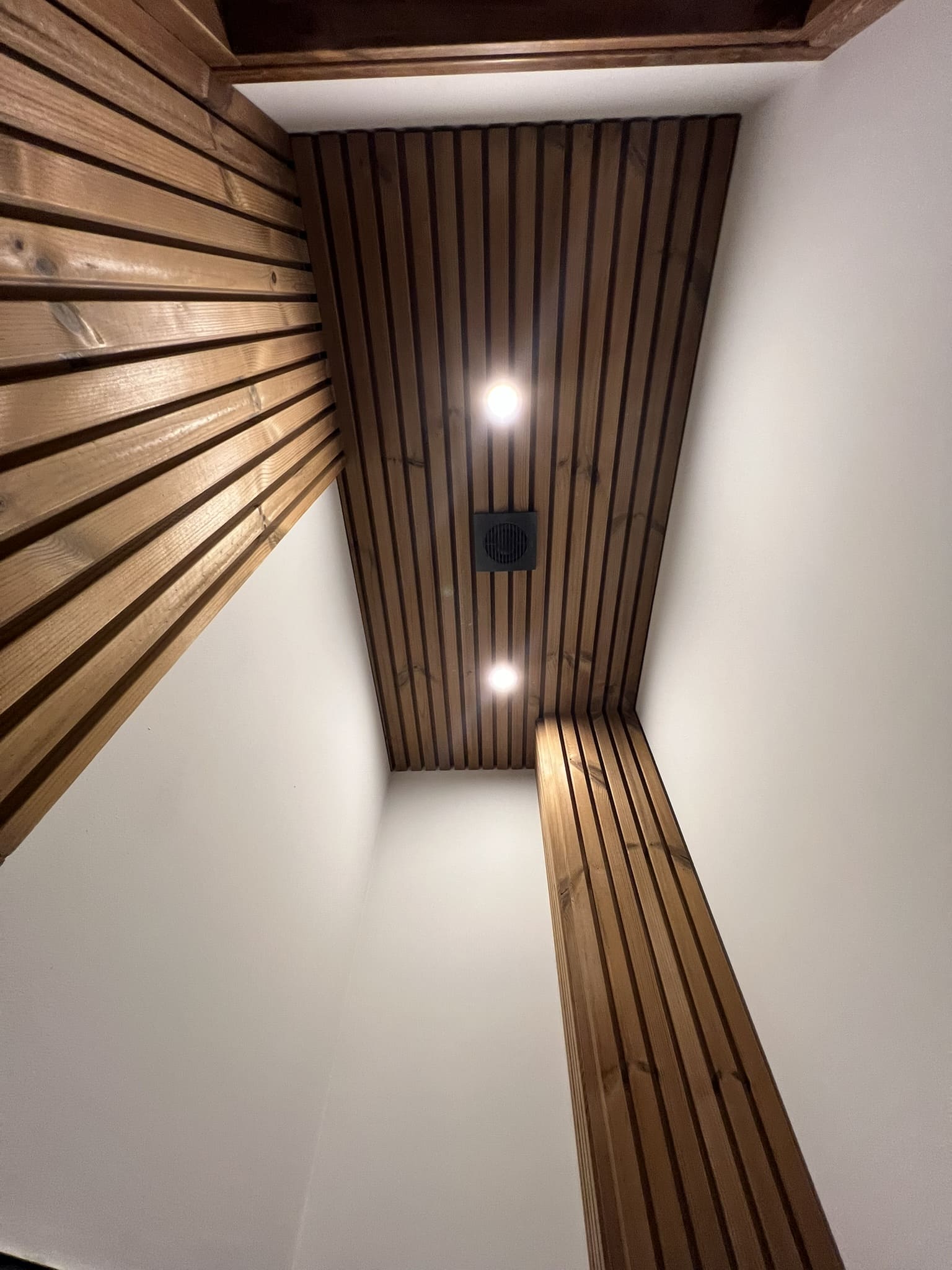 Algselt oli duširuumis saun ka sisse ehitatud, mis valede ehitusvõtetega oli halvasti ehitatud, mille tulemusena esines duširuumi põranda piirkonnas hallitust. Sauna asemele ehitati avar dušinurk. Lae ja seinte viimistlusmaterjalina kasutasime termotöödeldud välisvoodrilauda UTS2 profiili, mis paistab kaugelt silma. Sisustuse ja santehnika valis klient ise, mida meie lahkesti paigaldasime.