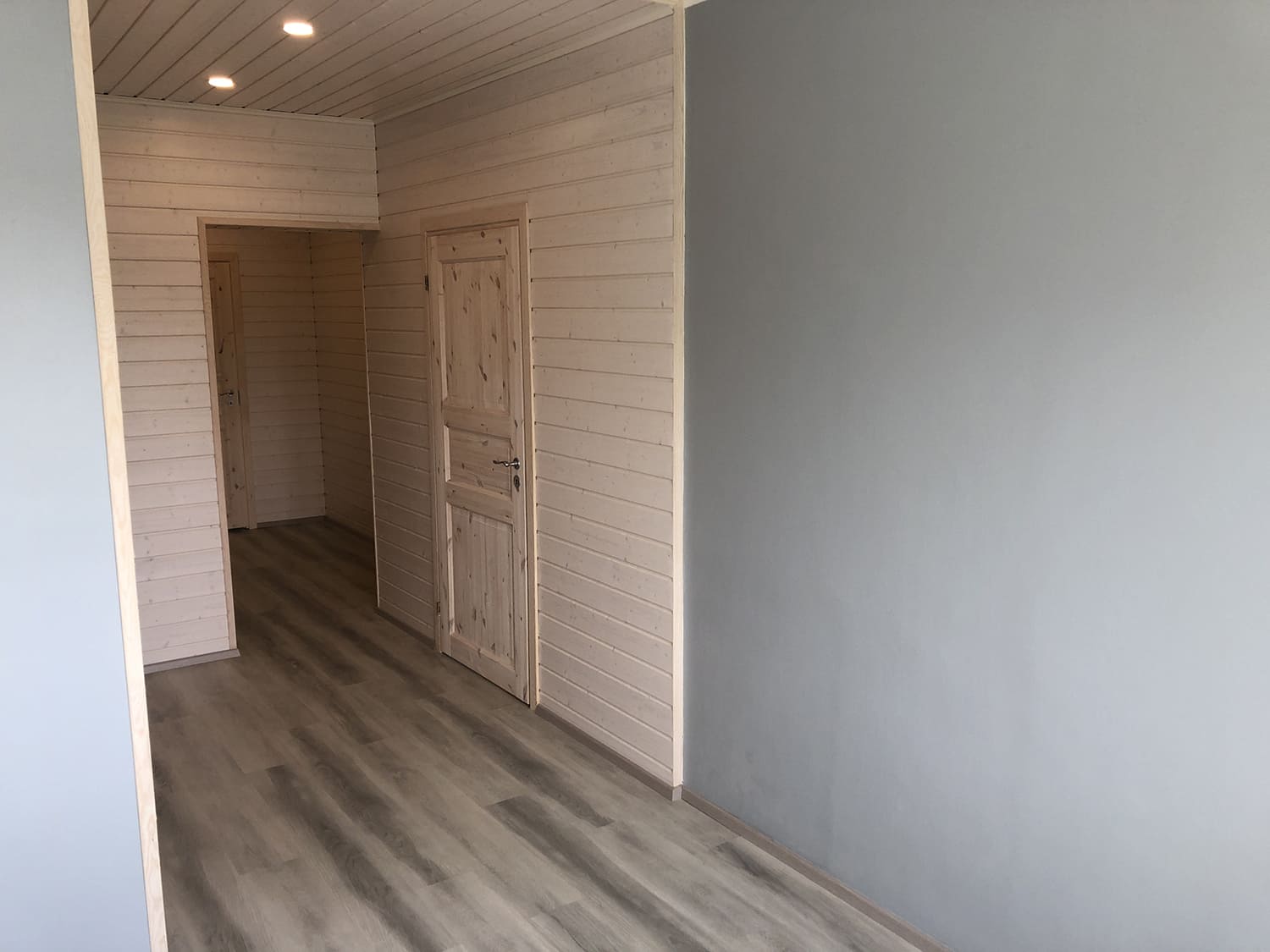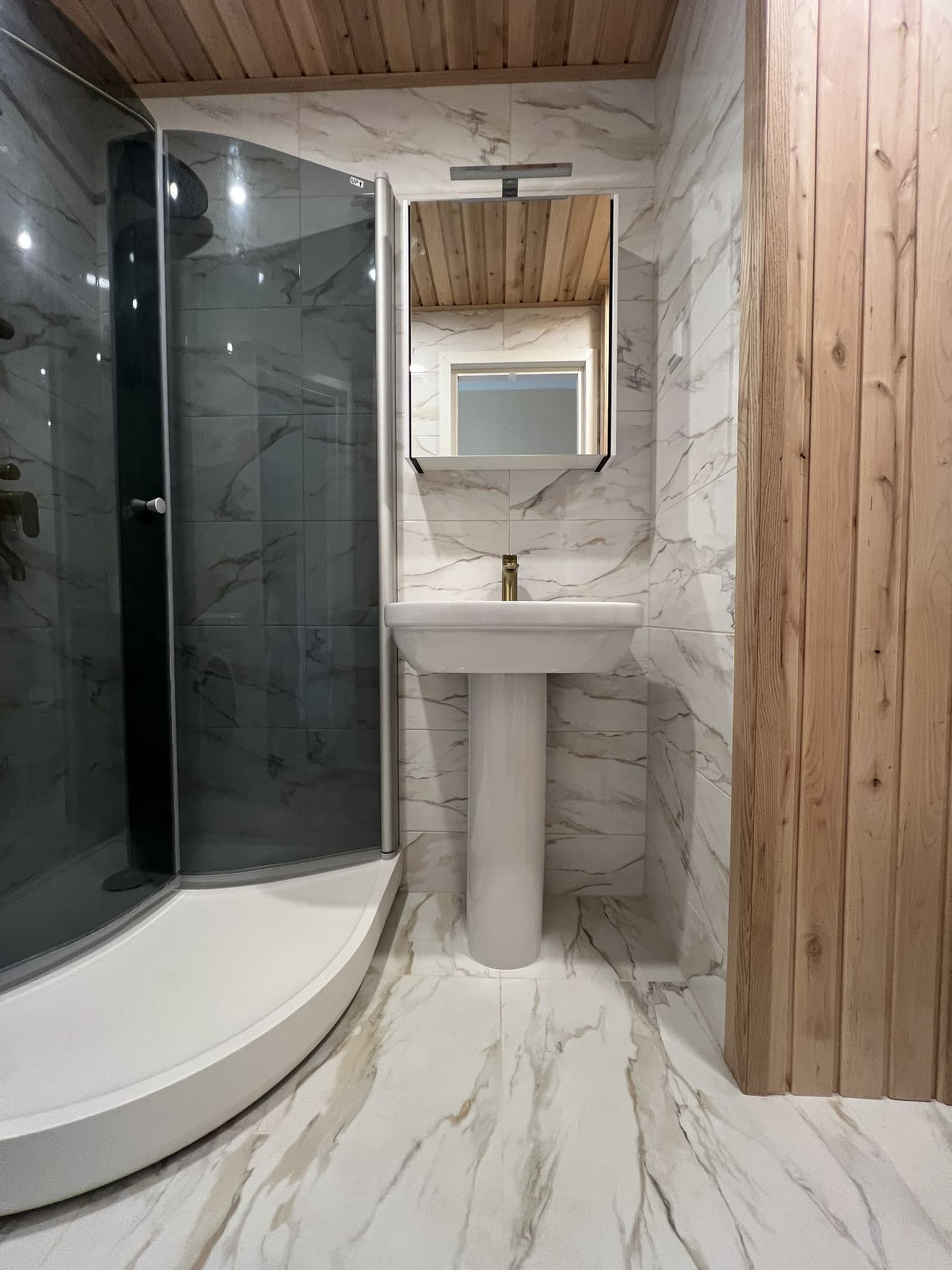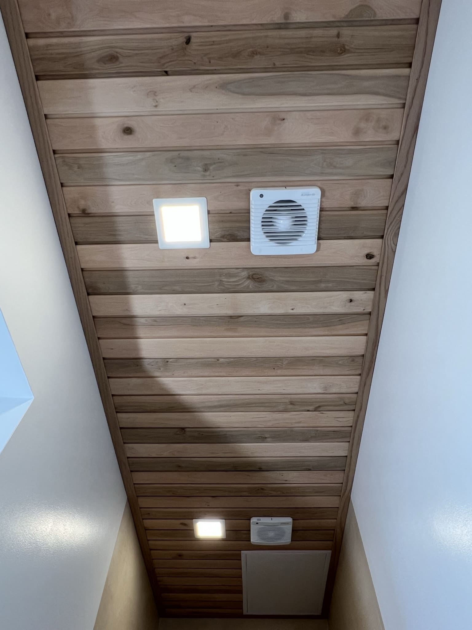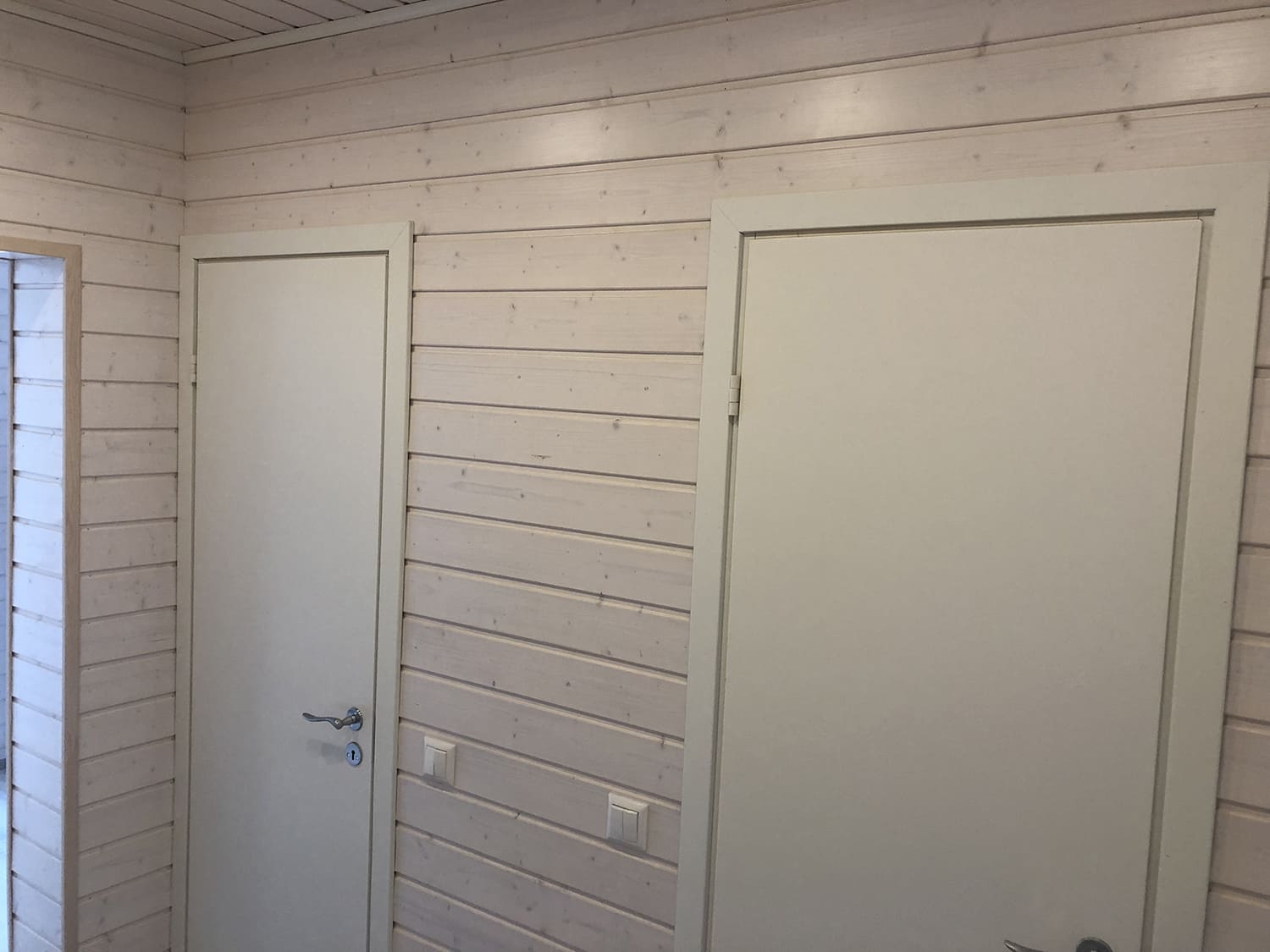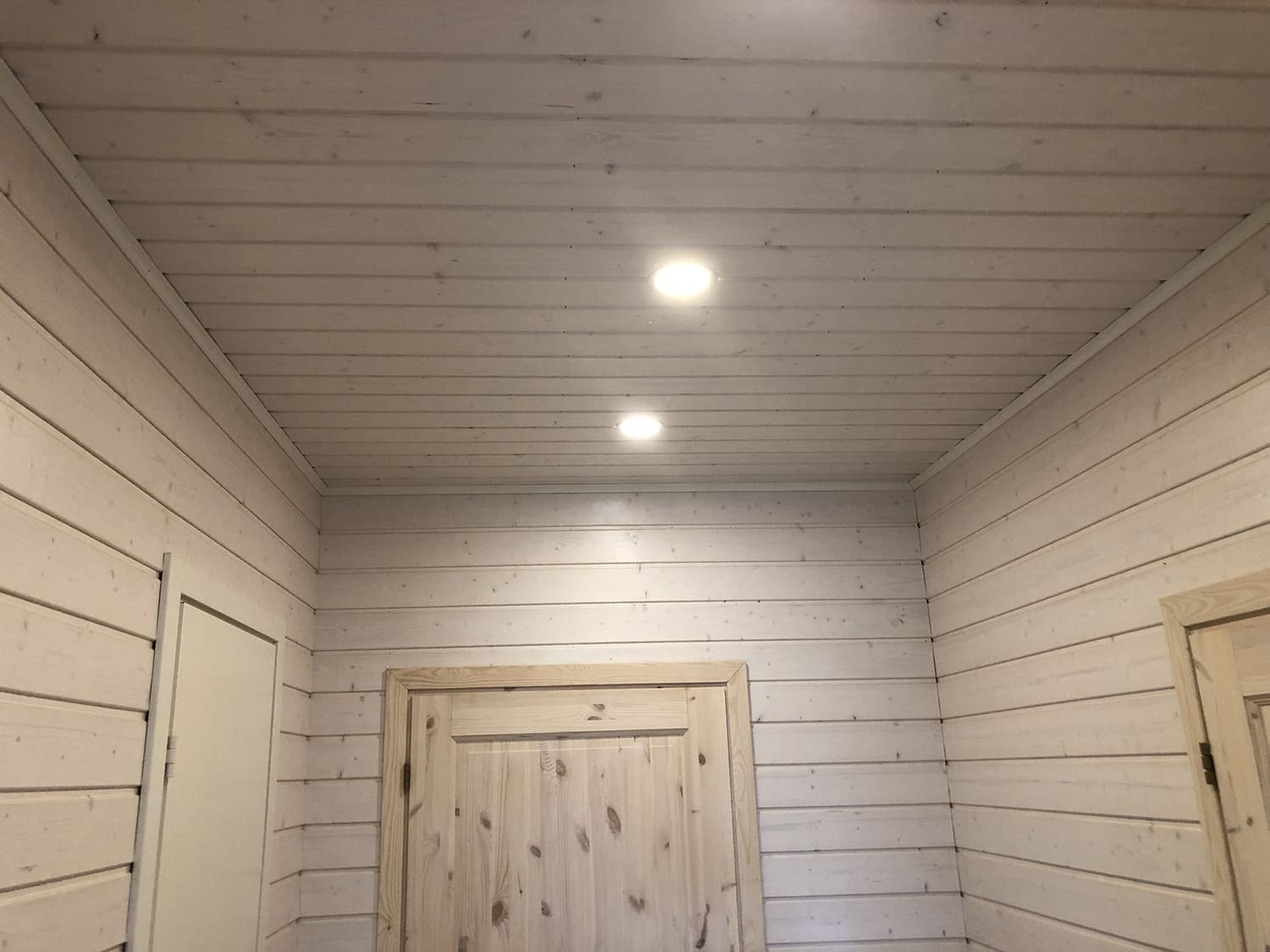 Algselt oli duširuumis saun ka sisse ehitatud, mis valede ehitusvõtetega oli halvasti ehitatud, mille tulemusena esines duširuumi põranda piirkonnas hallitust. Sauna asemele ehitati avar dušinurk. Lae ja seinte viimistlusmaterjalina kasutasime termotöödeldud välisvoodrilauda UTS2 profiili, mis paistab kaugelt silma. Sisustuse ja santehnika valis klient ise, mida meie lahkesti paigaldasime.