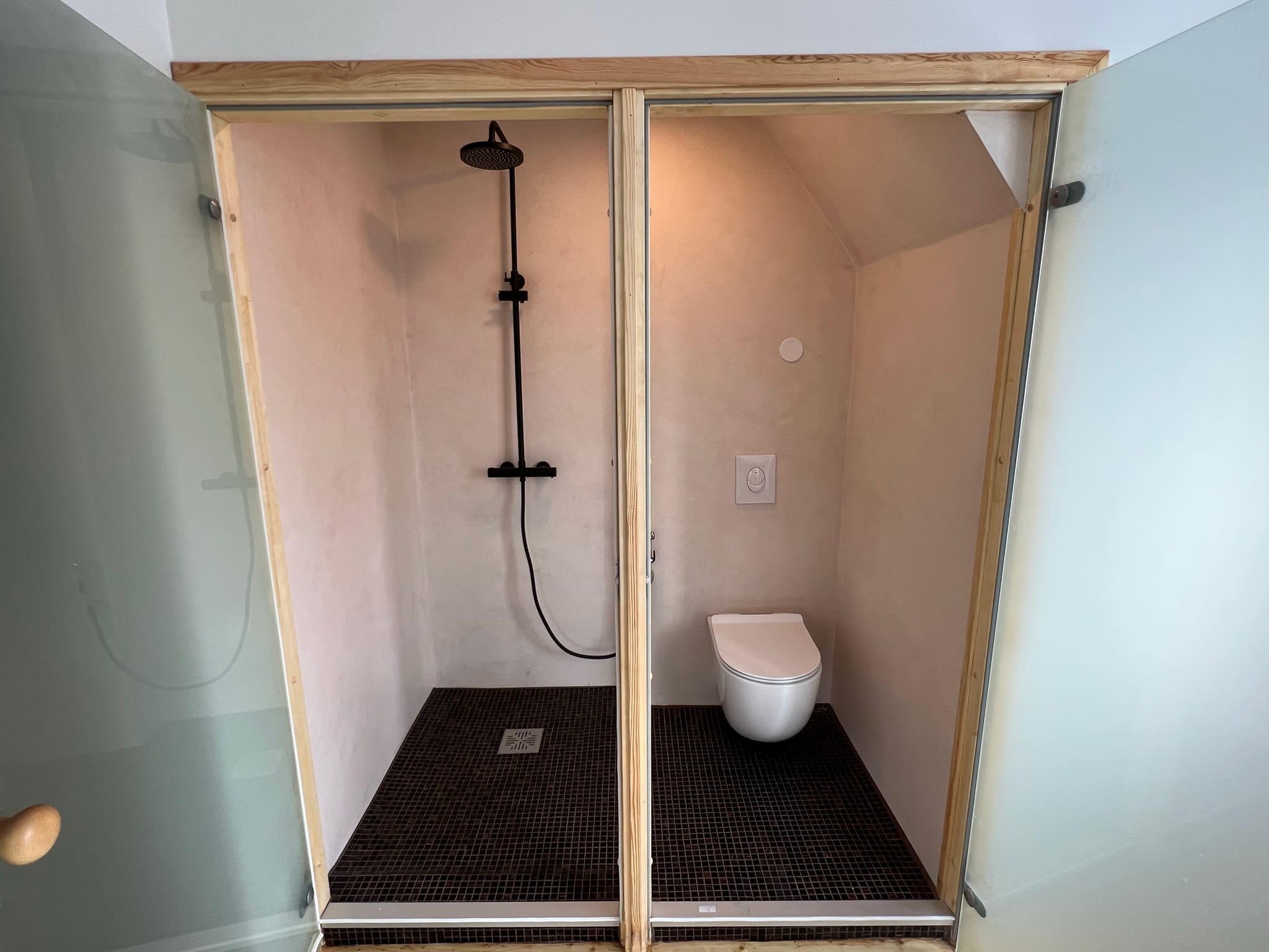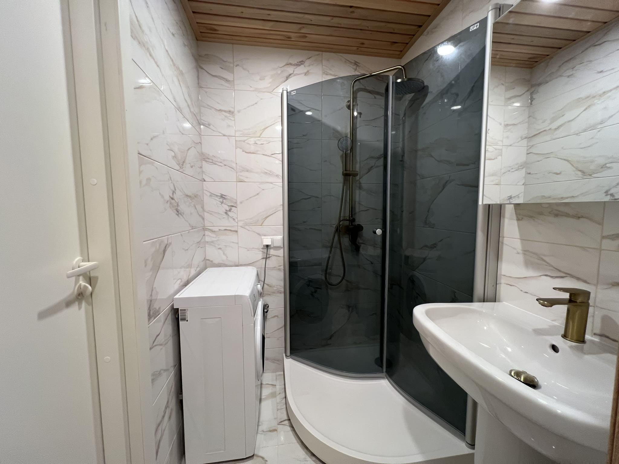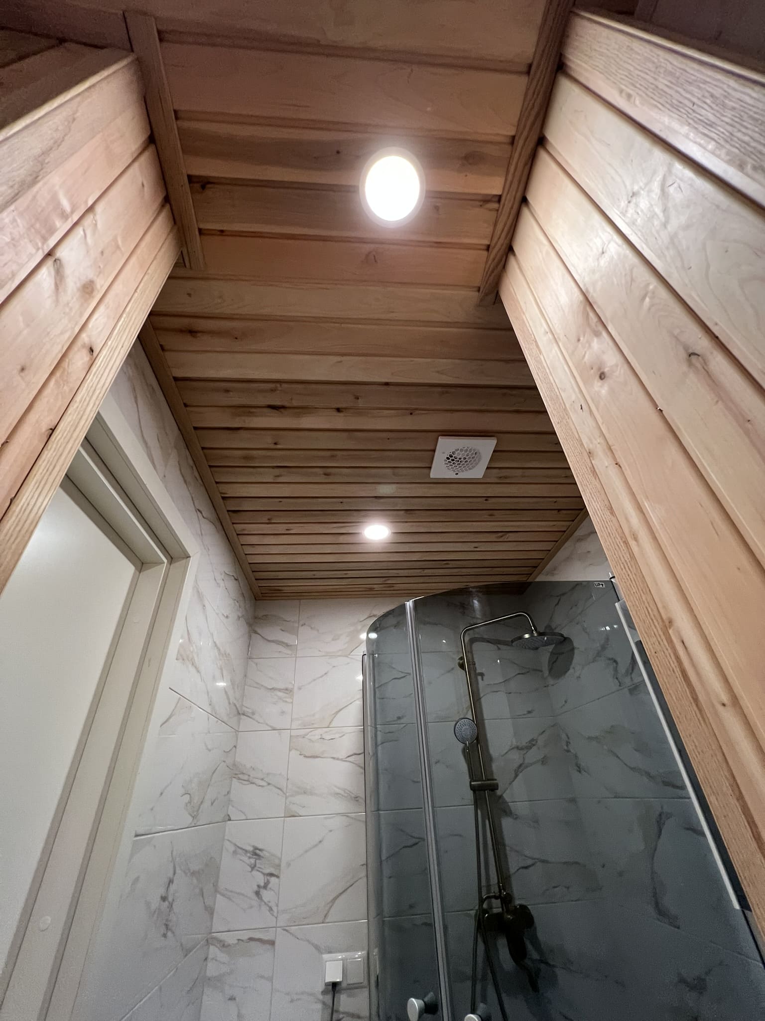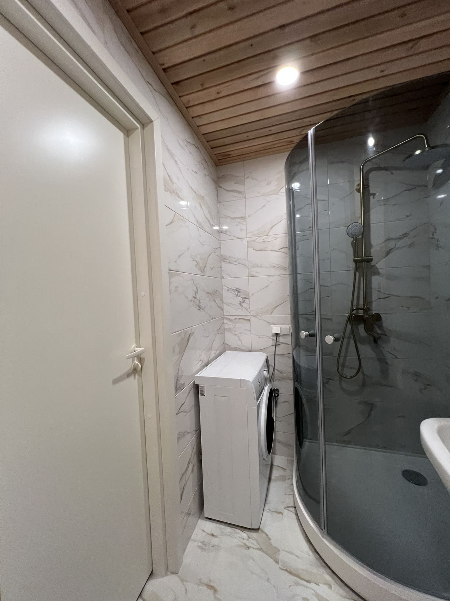 Täislahendusena valminud puumajas duširuum.