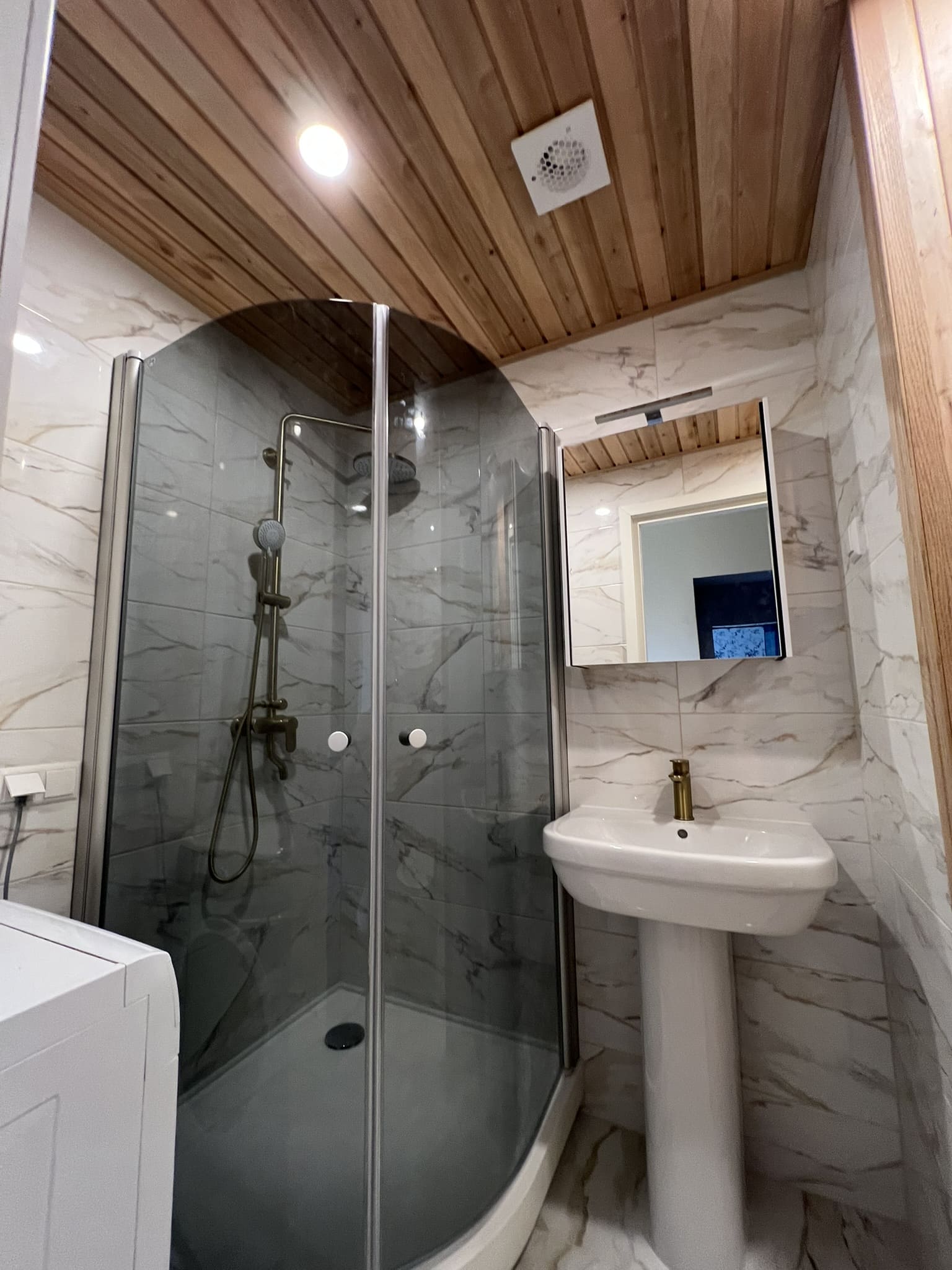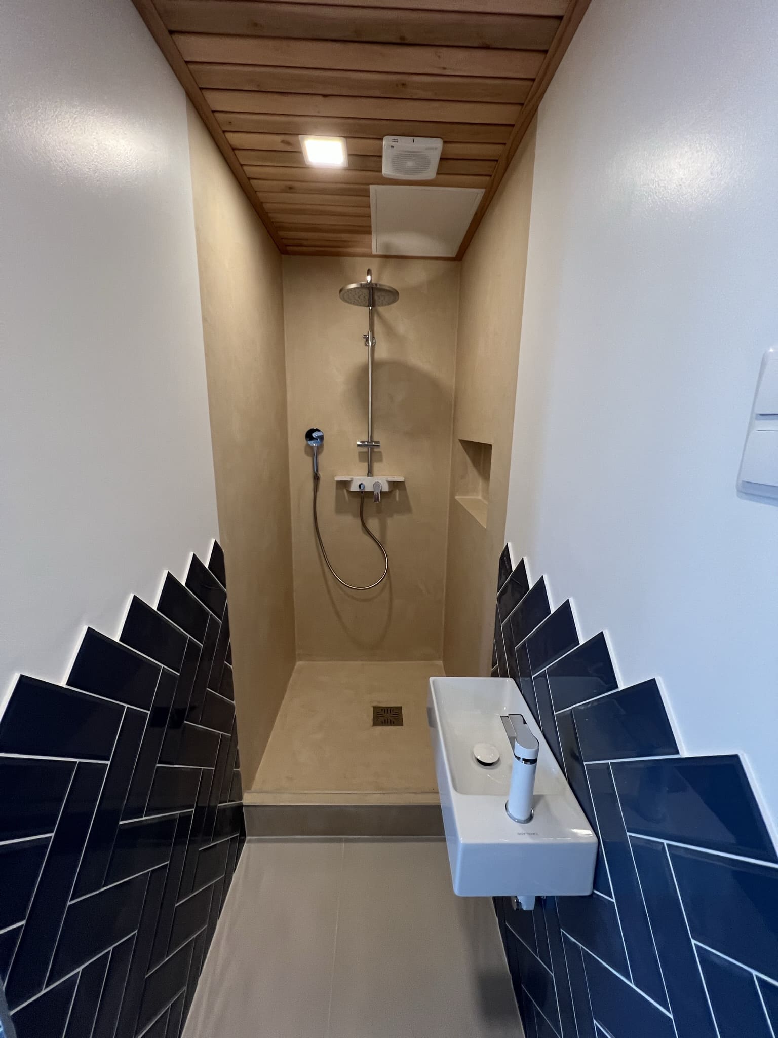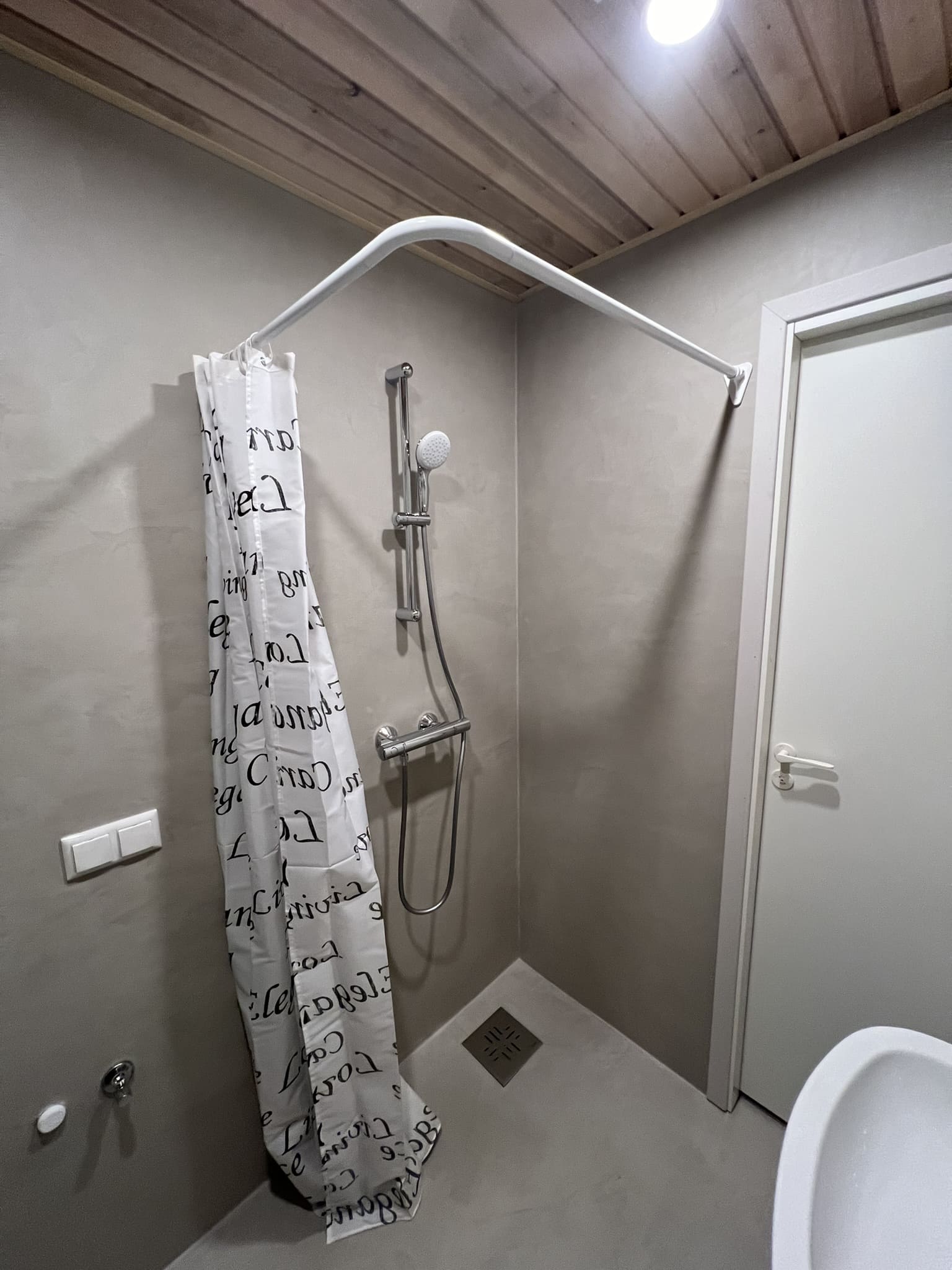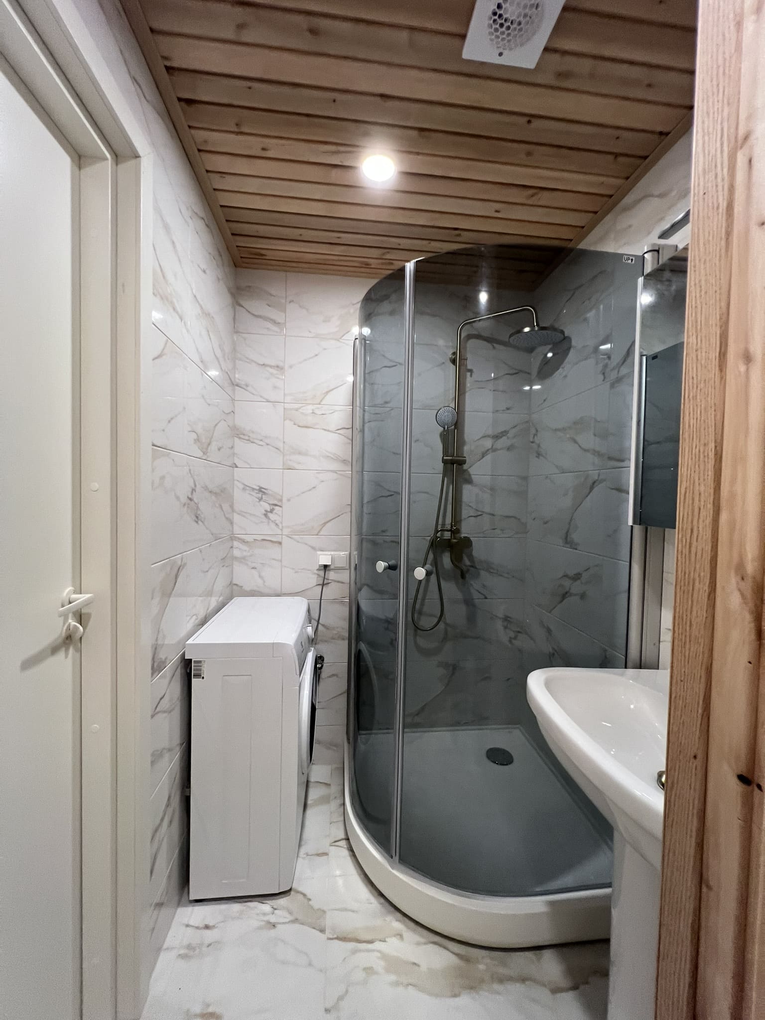 Täislahendusena valminud puumajas duširuum.