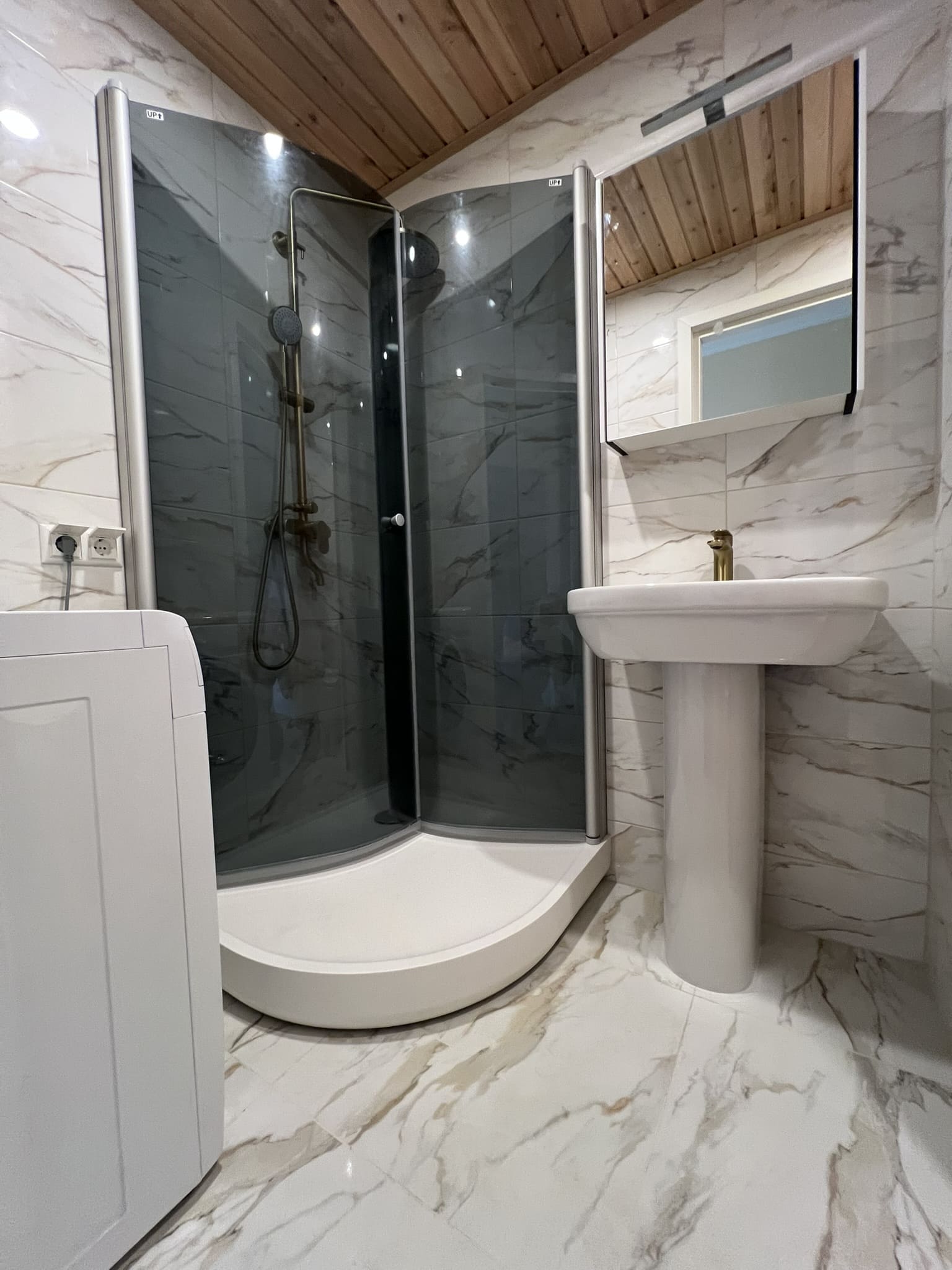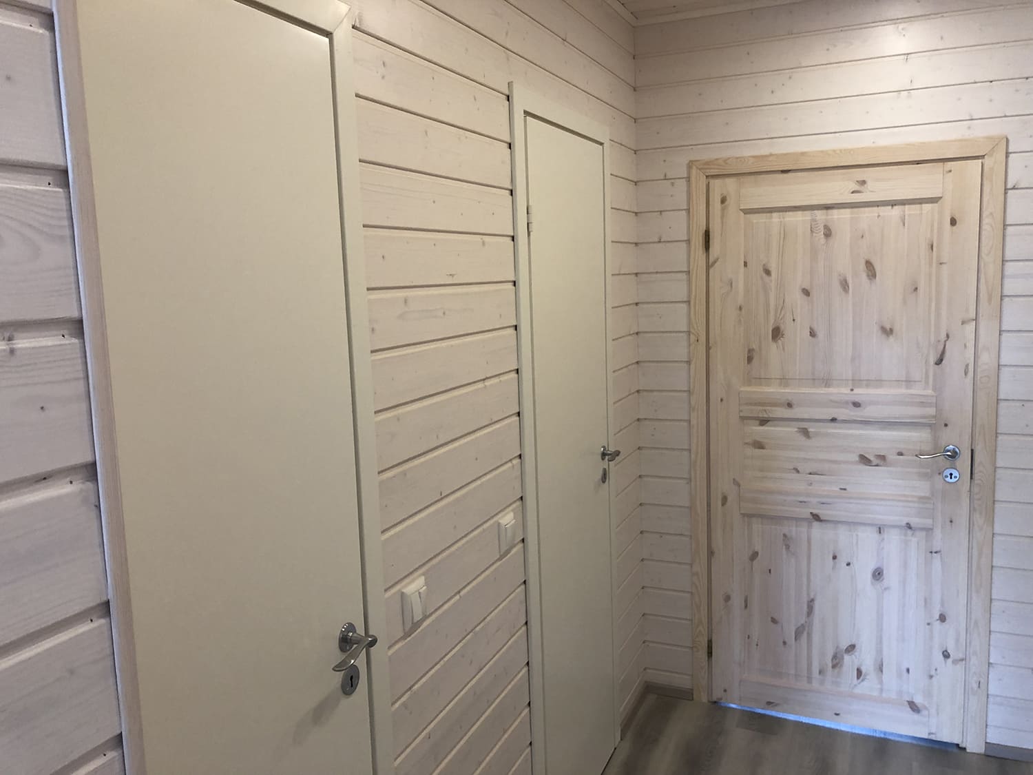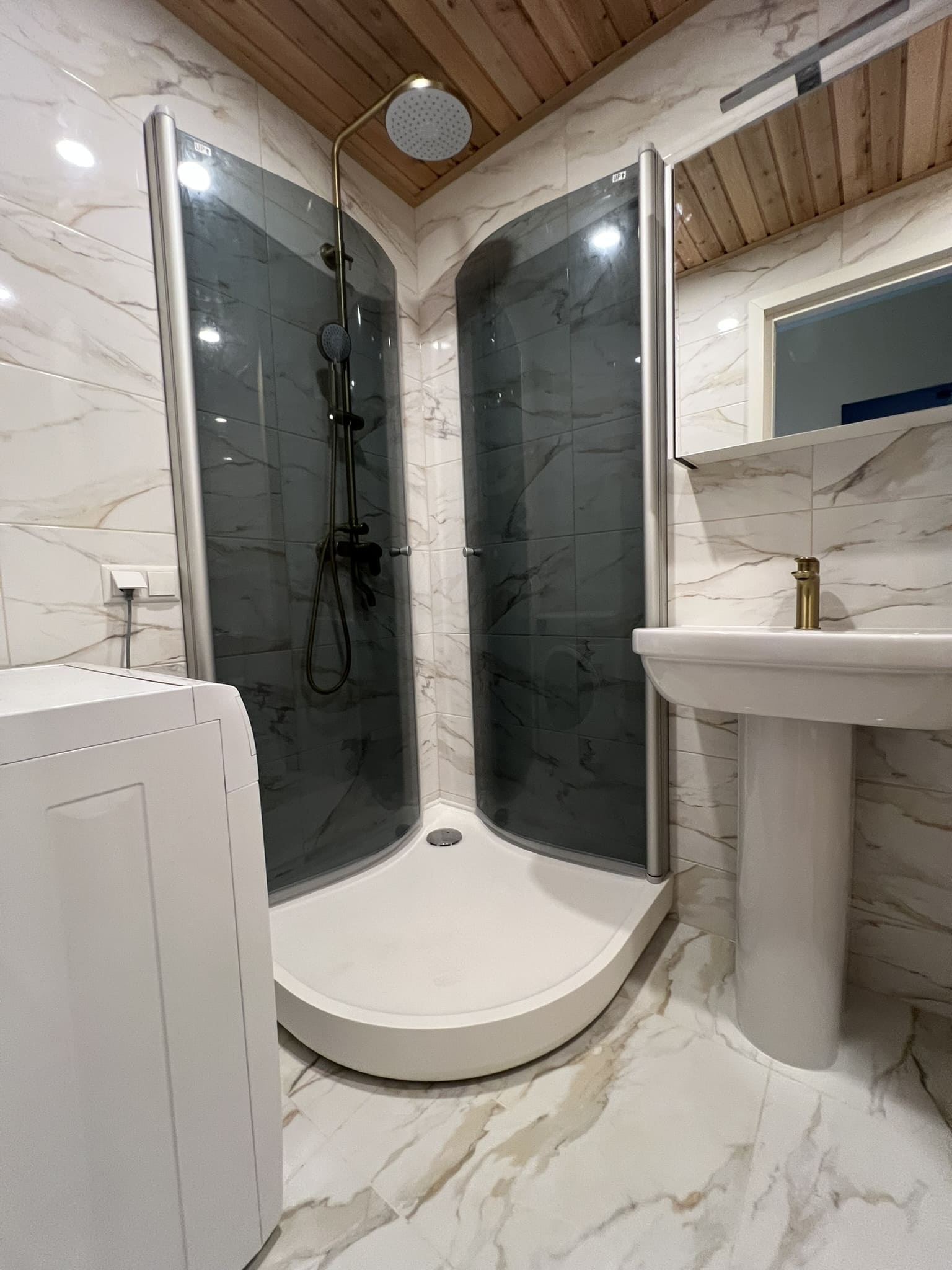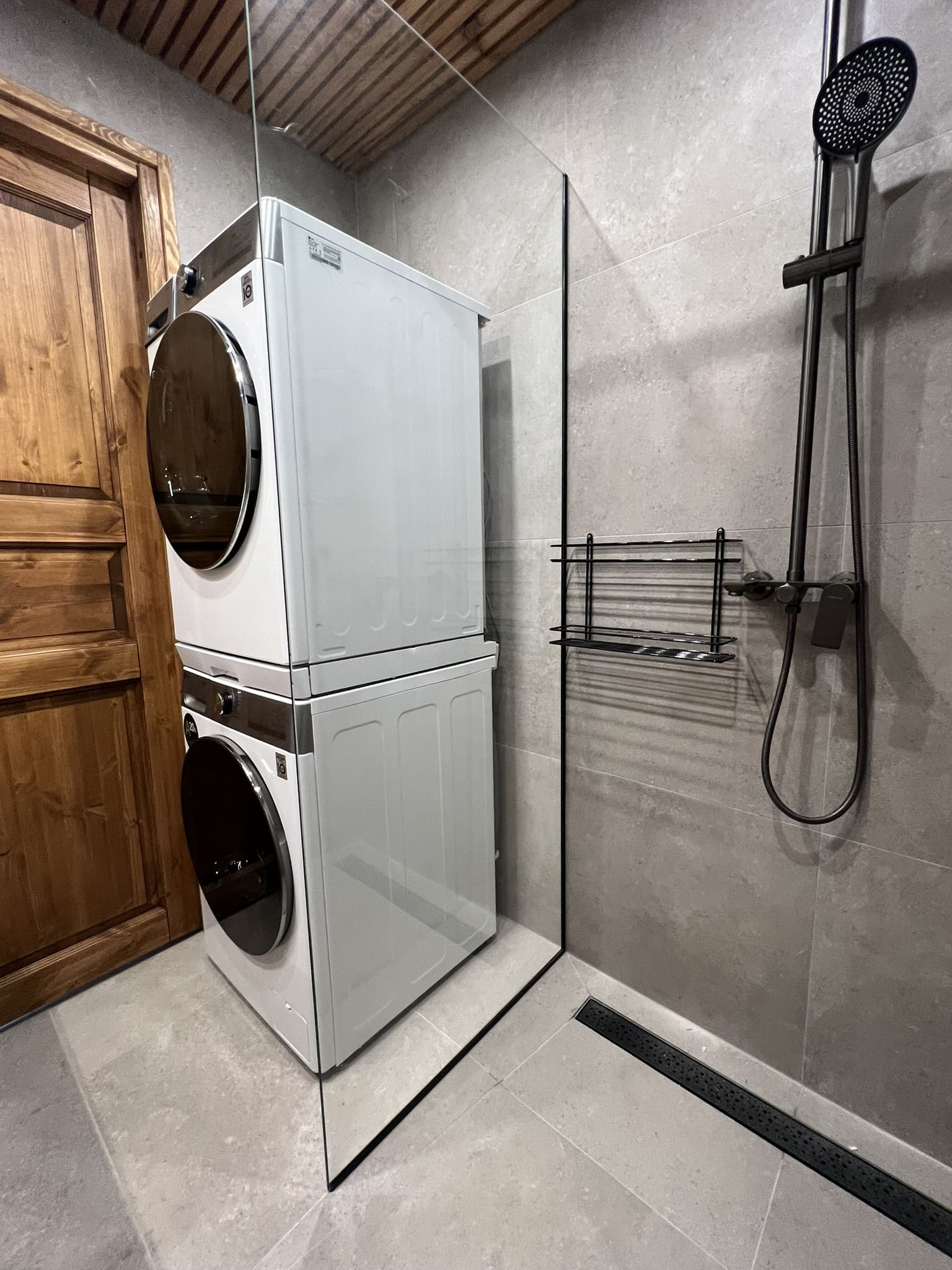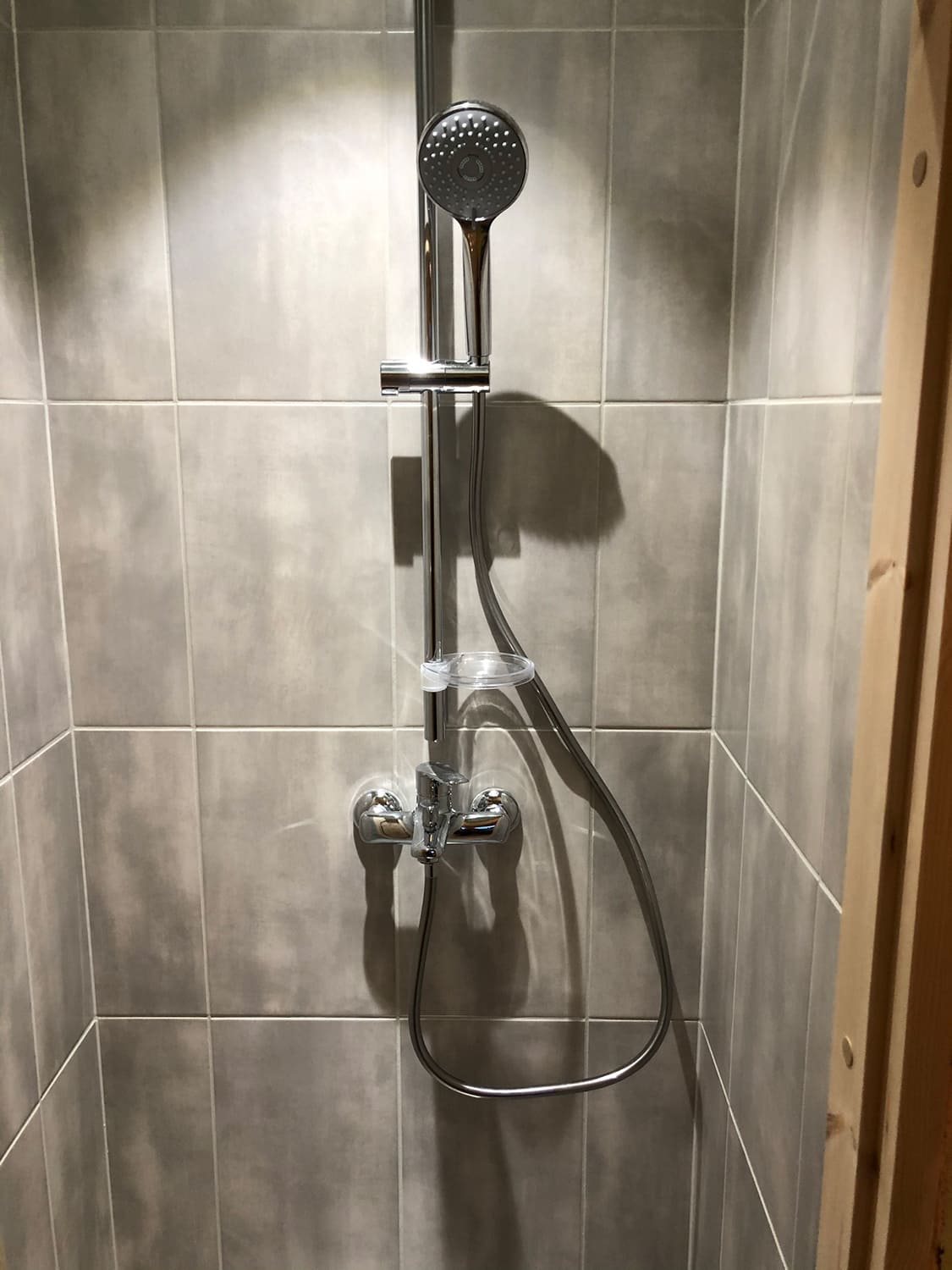 Täislahendusena valminud puumajas duširuum.