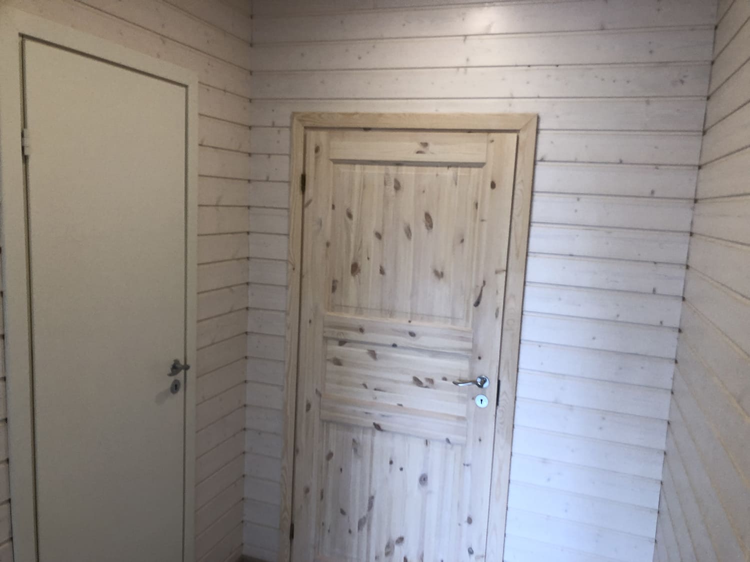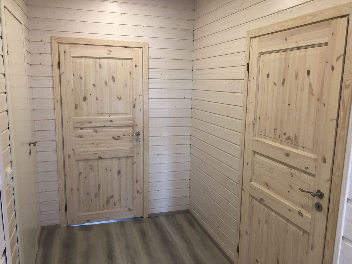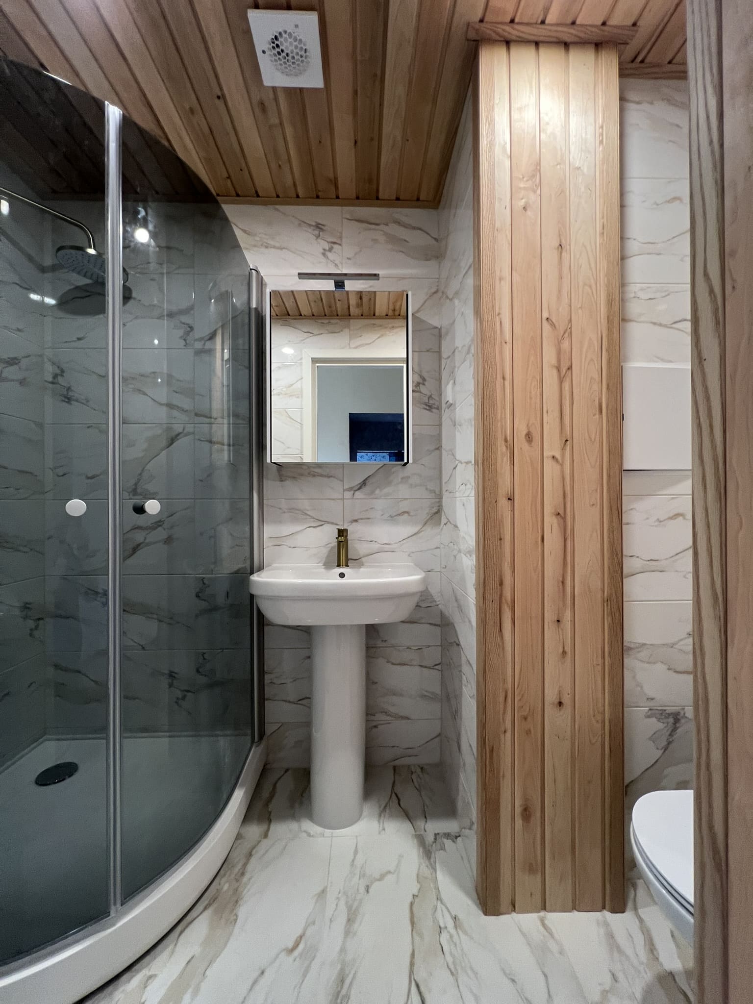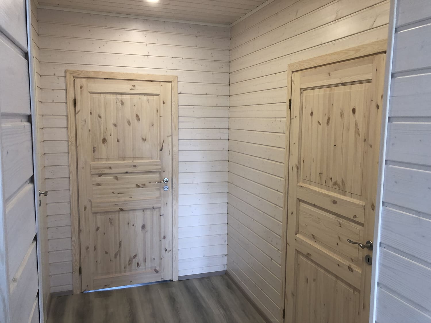 Täislahendusena valminud puumajas duširuum.