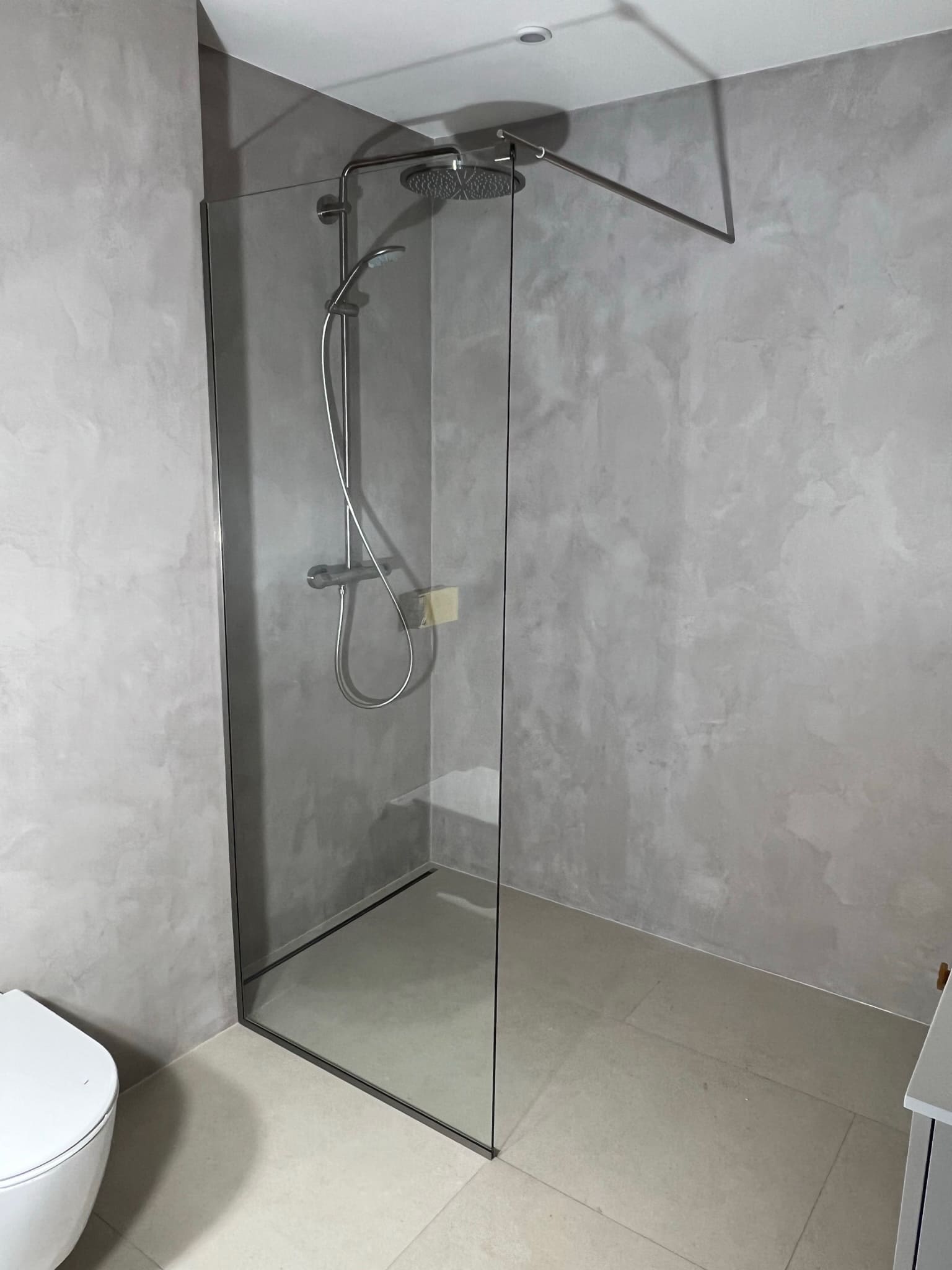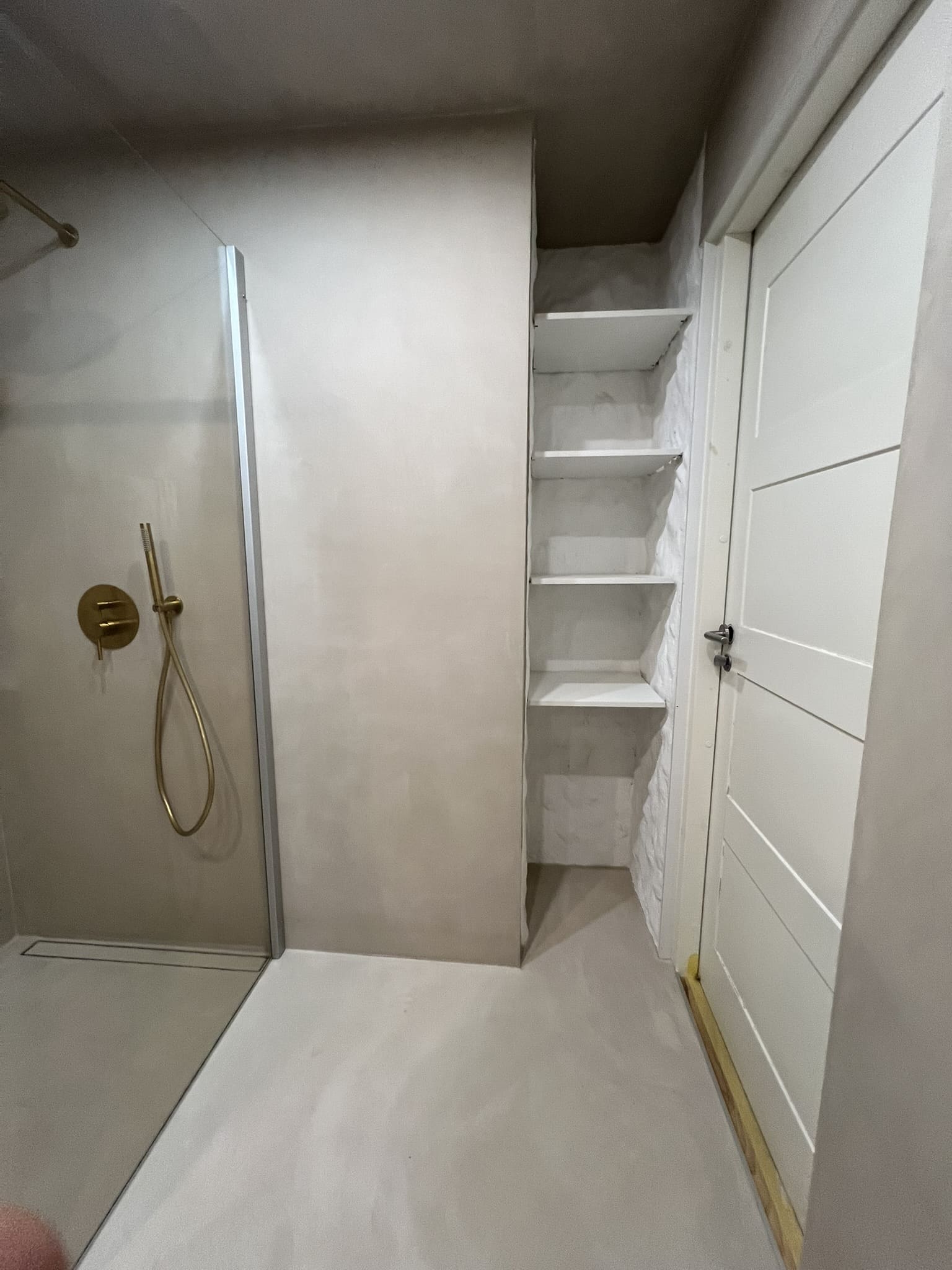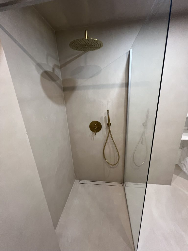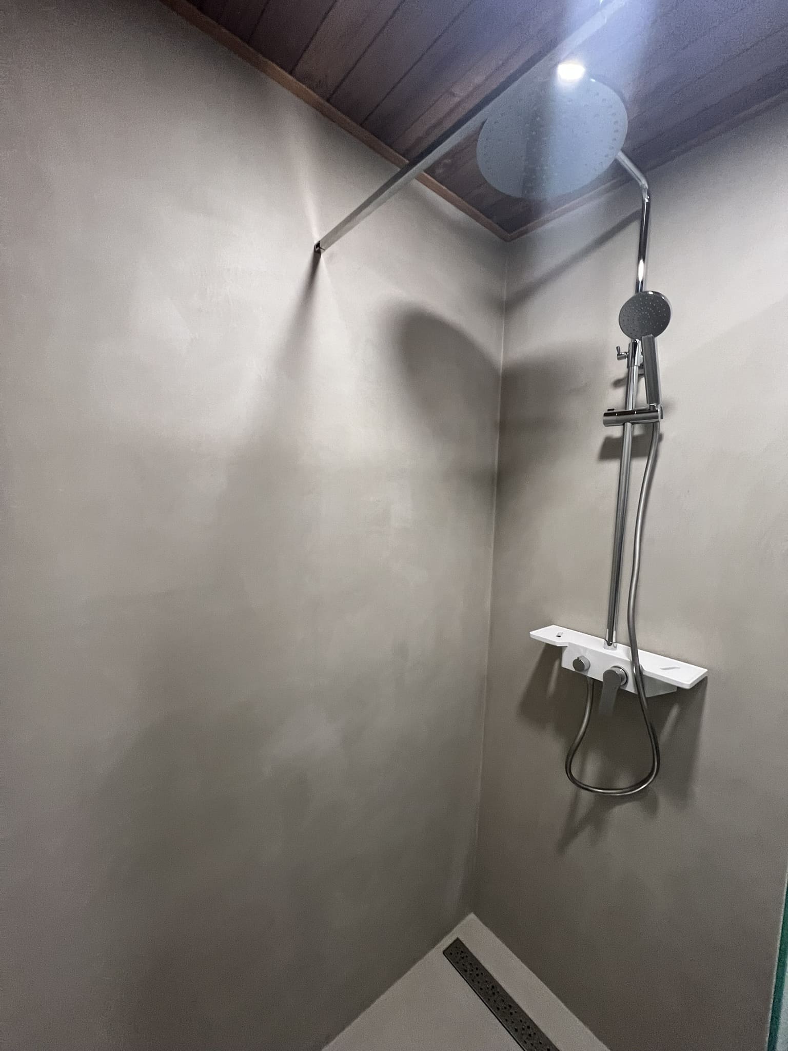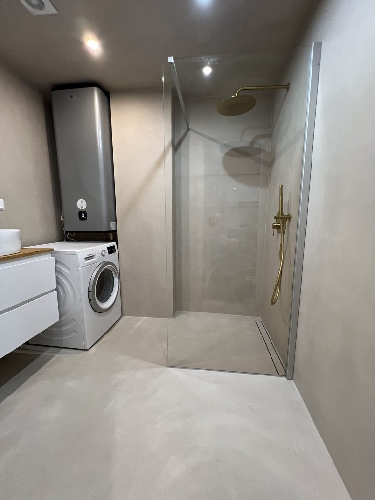 Käisime räppar AG-l külas ja tegime talle täislahendusena 4,5 m2 põrandapinnaga duširuumi mikrotsemendi tööd. Mikrotsemendi alla läks ka lagi. Mikrotsement paigaldati olemasoleva keraamilisele plaadile. Toon Basebeton Duhe. Abiks olime ka santehniliste töödega.
