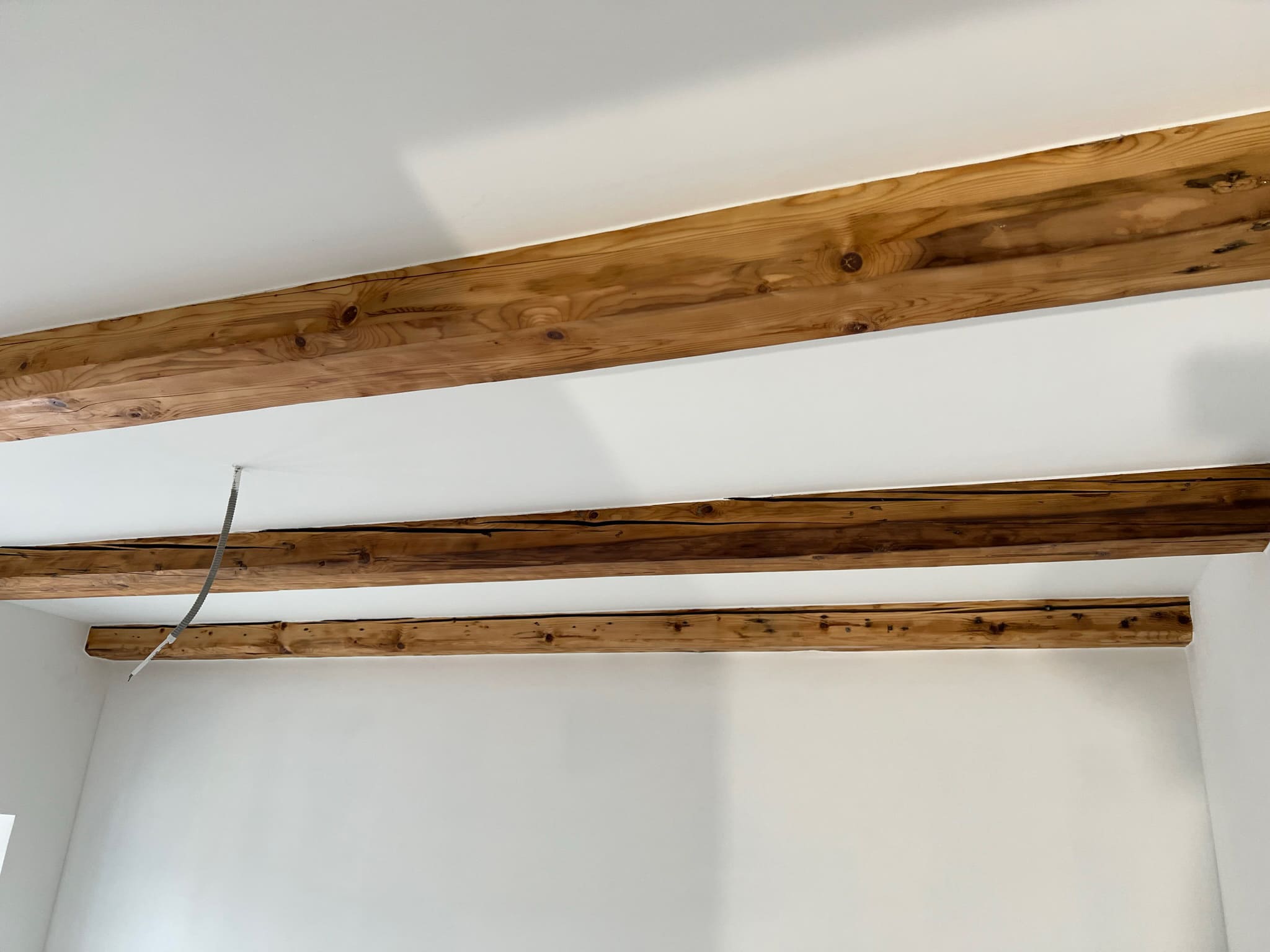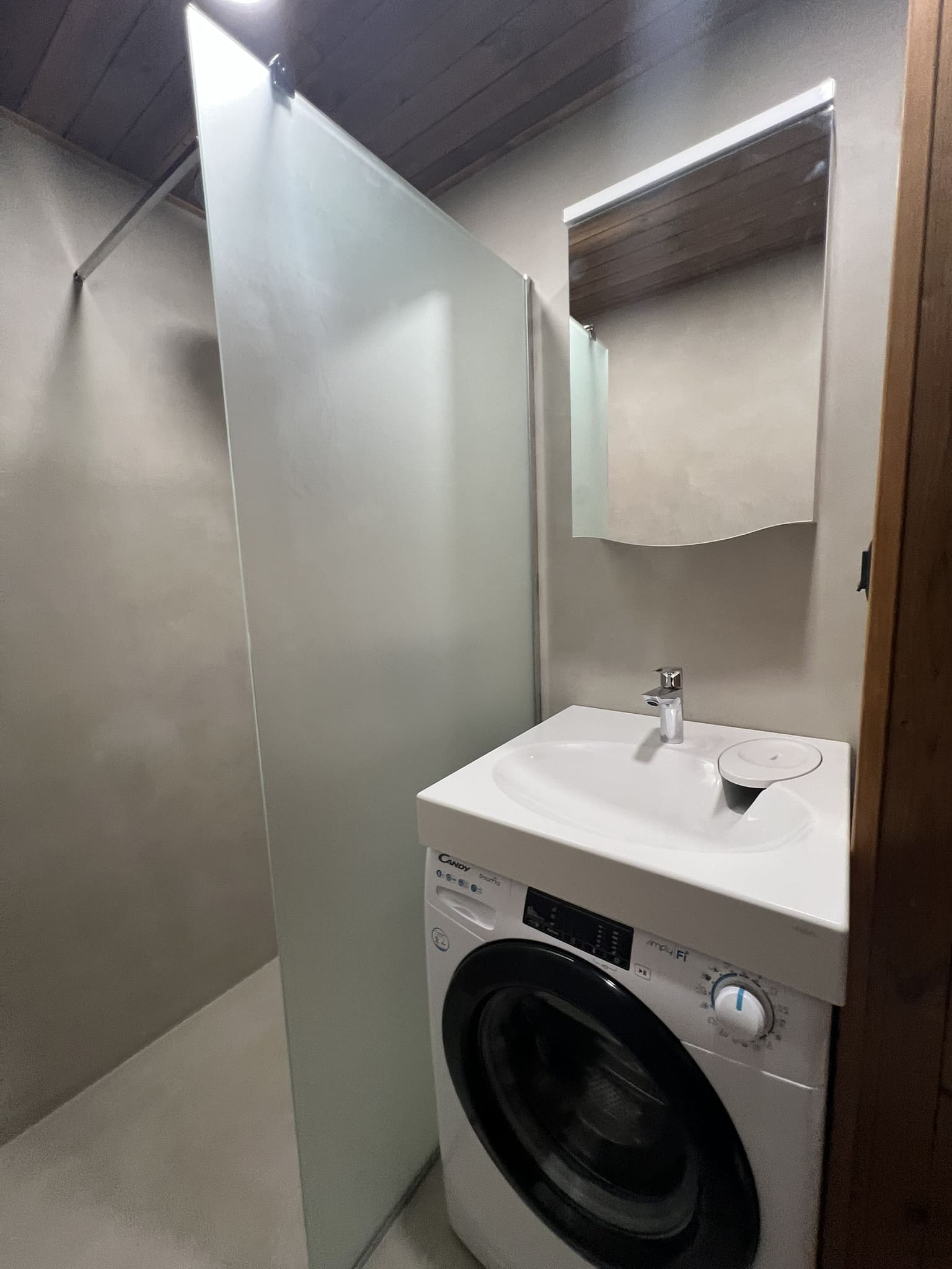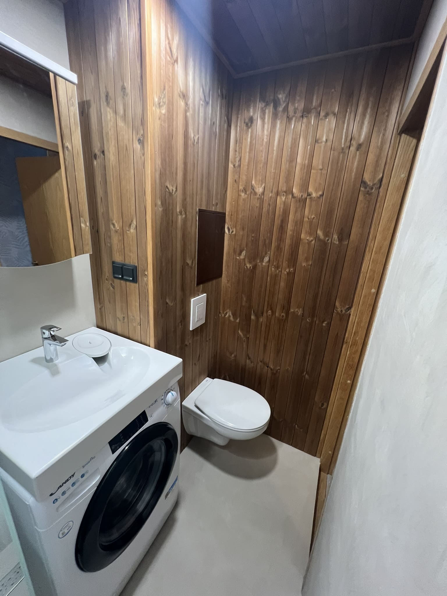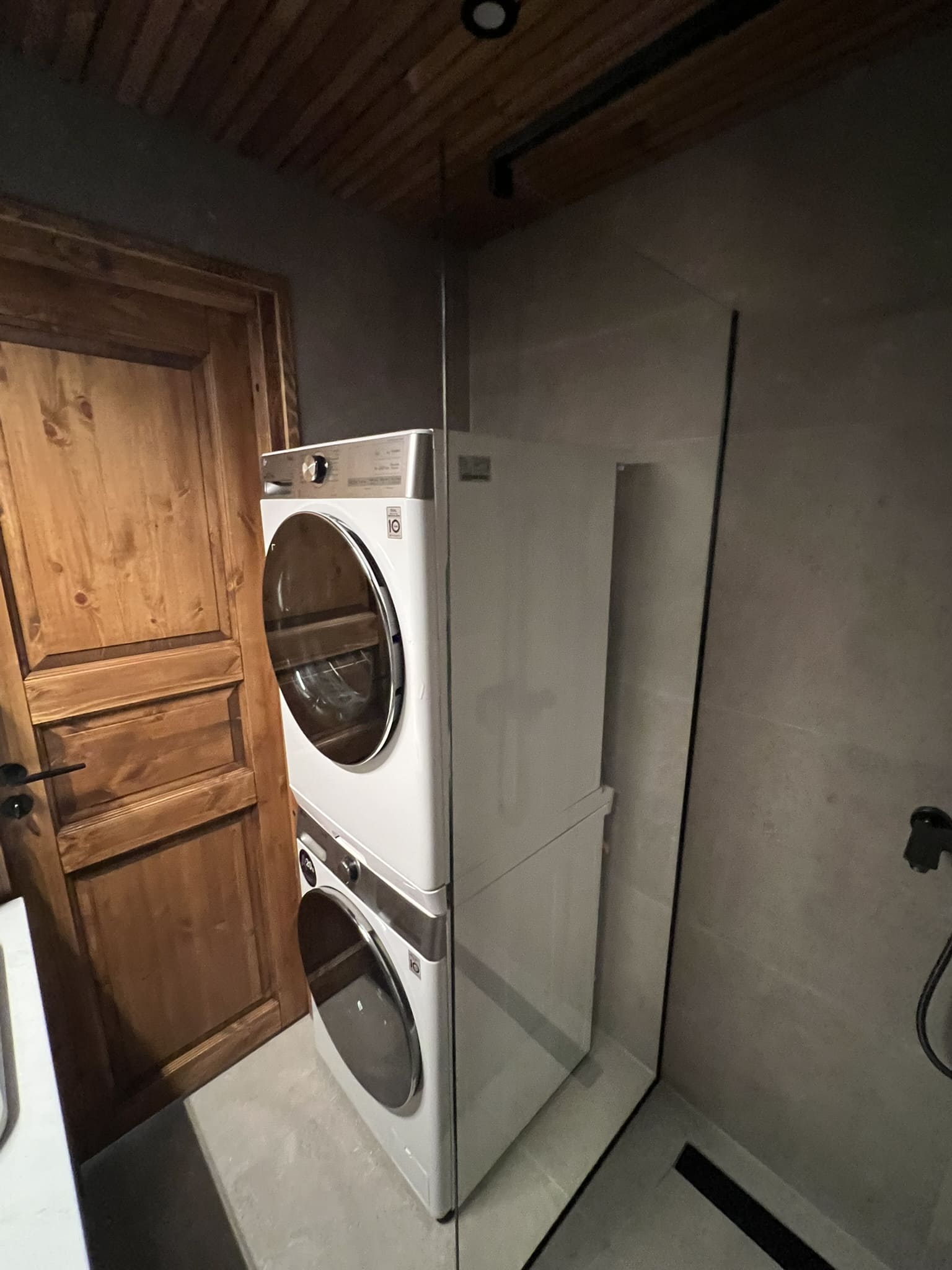 Kunagi puumajja ehitatud duširuum, mis algselt ei olnud korteri osa, ei olnud ehitatud ehitusnorme järgides, millest tekkis veekahjustus. Teisel korrusel asuva duširuum sai veekahjustuse tõttu lammutatud kogunisti põrandalaagideni välja, mis olid kergelt juba niiskuse tõttu kahjustada saanud. Keerukaks tööde teostamise tegi veel ruumis olev küttekolle ja selle korsten. Kuid natuke planeerimist ja õigeid töövõtted kasutusele võttes läks töö ladusalt. Lõppviimistluseks mikrotsement ( toon Gentle) ja santehnika paigaldus. Ja loomulikult puumajja ikka puidust lagi. Mikrotsement ja puit sobivad väga hästi kokku, need materjalid täiustavad üksteist.