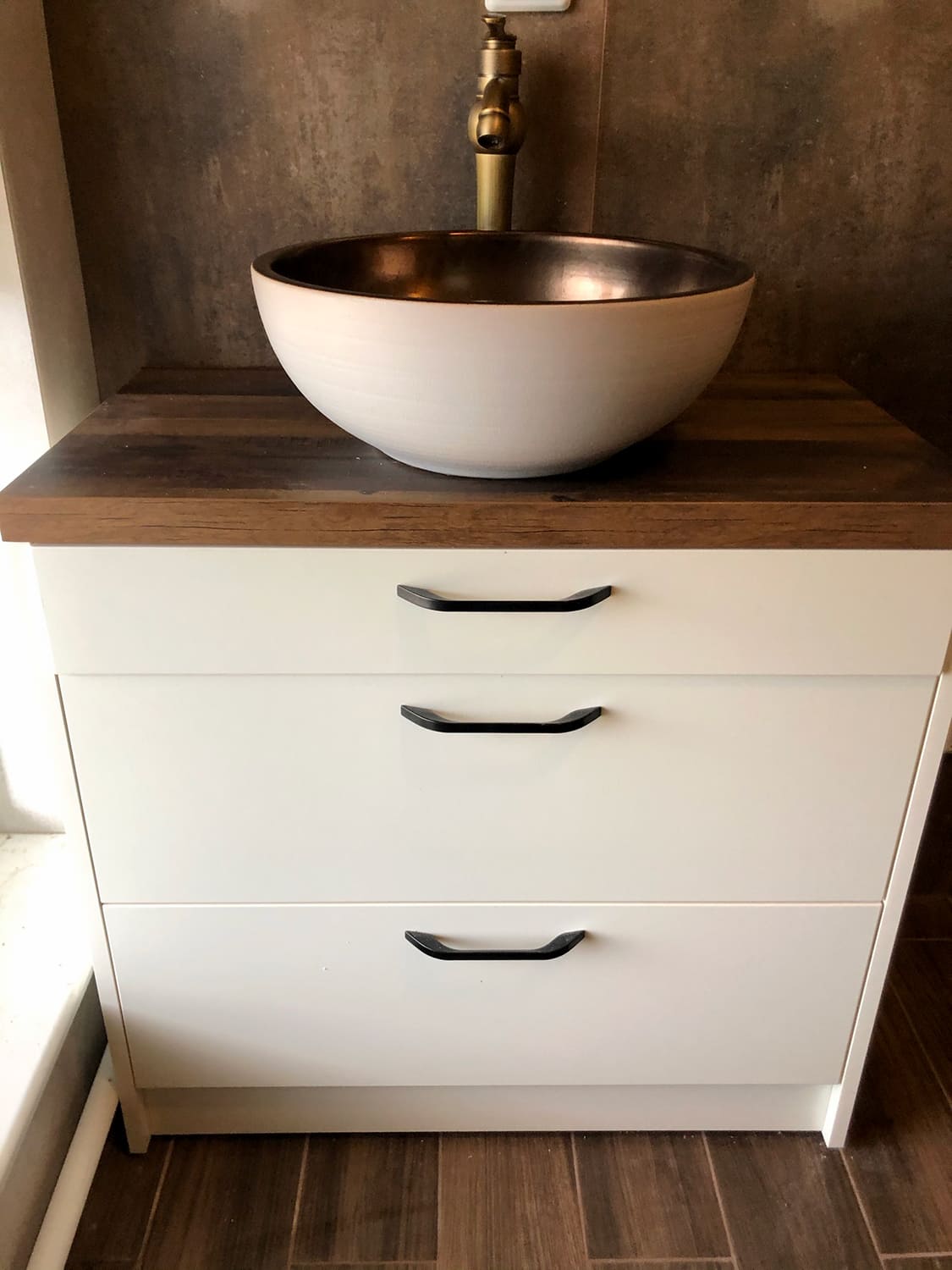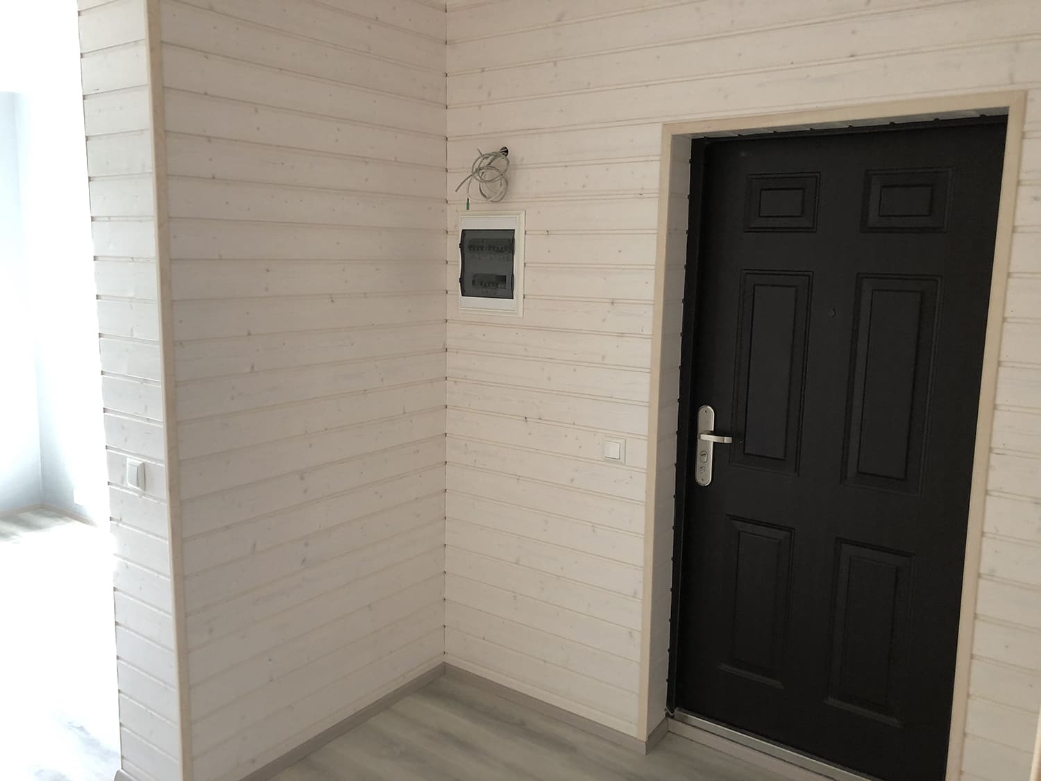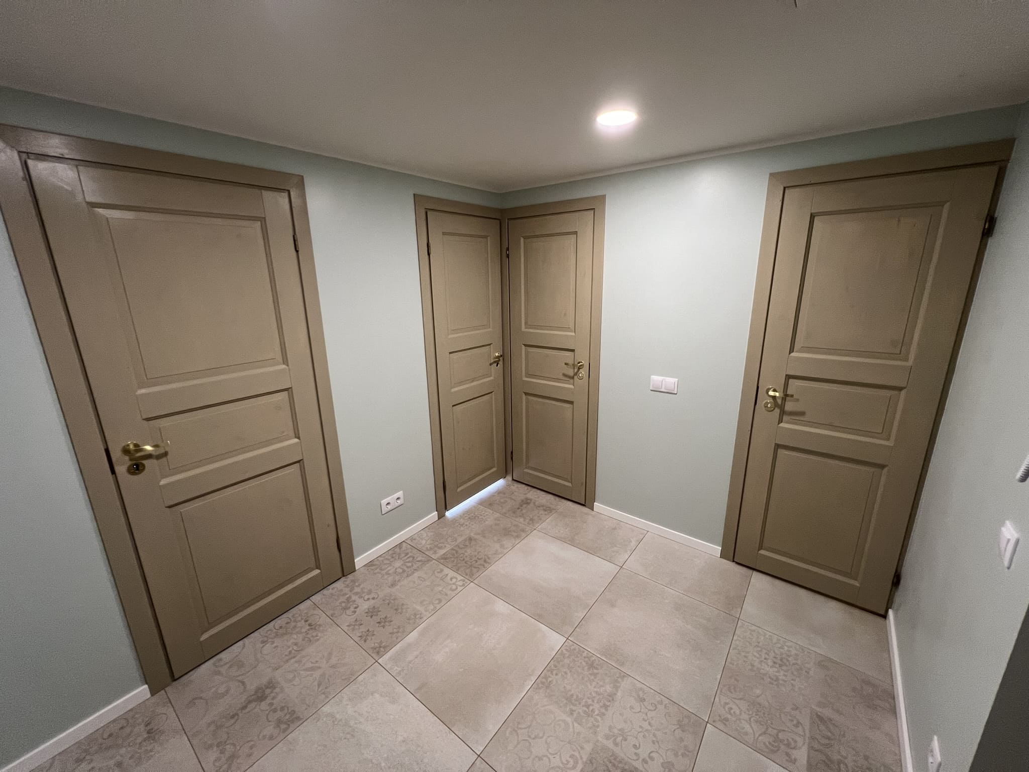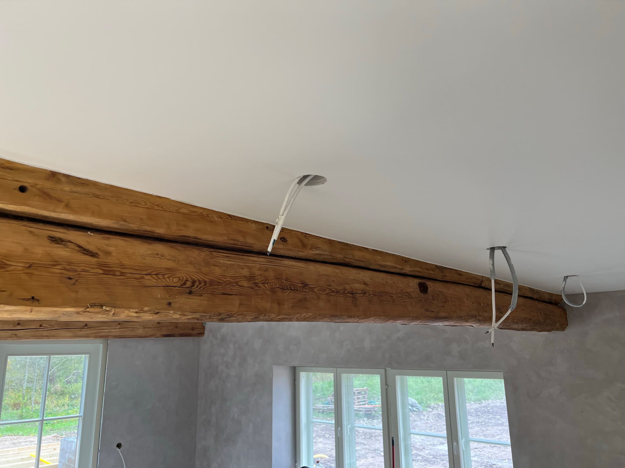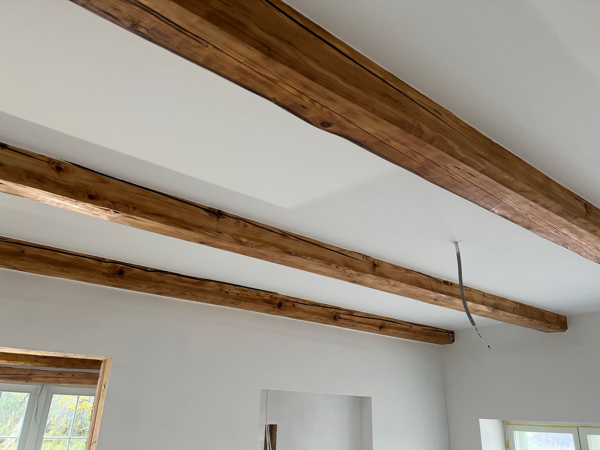 Kunagi puumajja ehitatud duširuum, mis algselt ei olnud korteri osa, ei olnud ehitatud ehitusnorme järgides, millest tekkis veekahjustus. Teisel korrusel asuva duširuum sai veekahjustuse tõttu lammutatud kogunisti põrandalaagideni välja, mis olid kergelt juba niiskuse tõttu kahjustada saanud. Keerukaks tööde teostamise tegi veel ruumis olev küttekolle ja selle korsten. Kuid natuke planeerimist ja õigeid töövõtted kasutusele võttes läks töö ladusalt. Lõppviimistluseks mikrotsement ( toon Gentle) ja santehnika paigaldus. Ja loomulikult puumajja ikka puidust lagi. Mikrotsement ja puit sobivad väga hästi kokku, need materjalid täiustavad üksteist.
