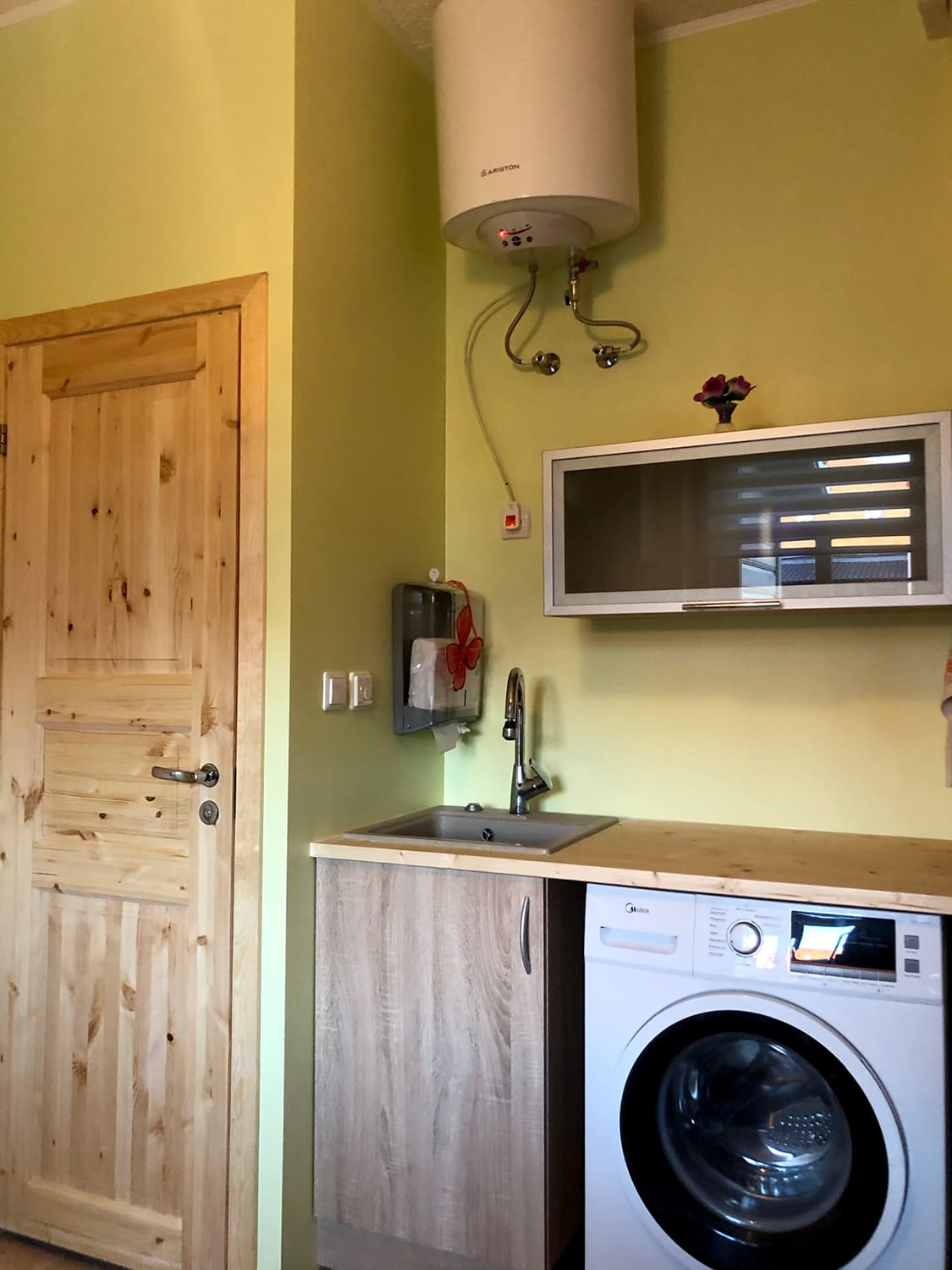 Kuna ruumi oli vähe ja klient soovis enda väiksesse korterisse pesuruumi ja kööginurka,siis sai selline minimalistlik lahend välja mõeldud koos sisustusega.Pesuruumi pindala on kõigest 0,5 m².