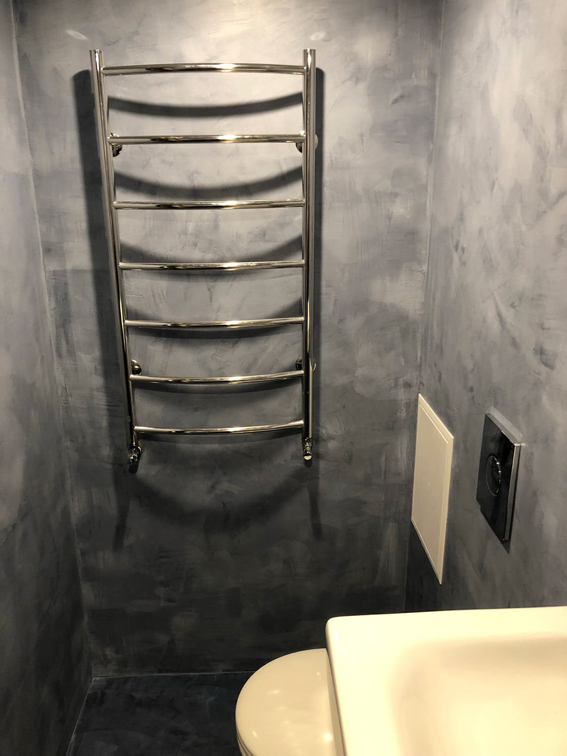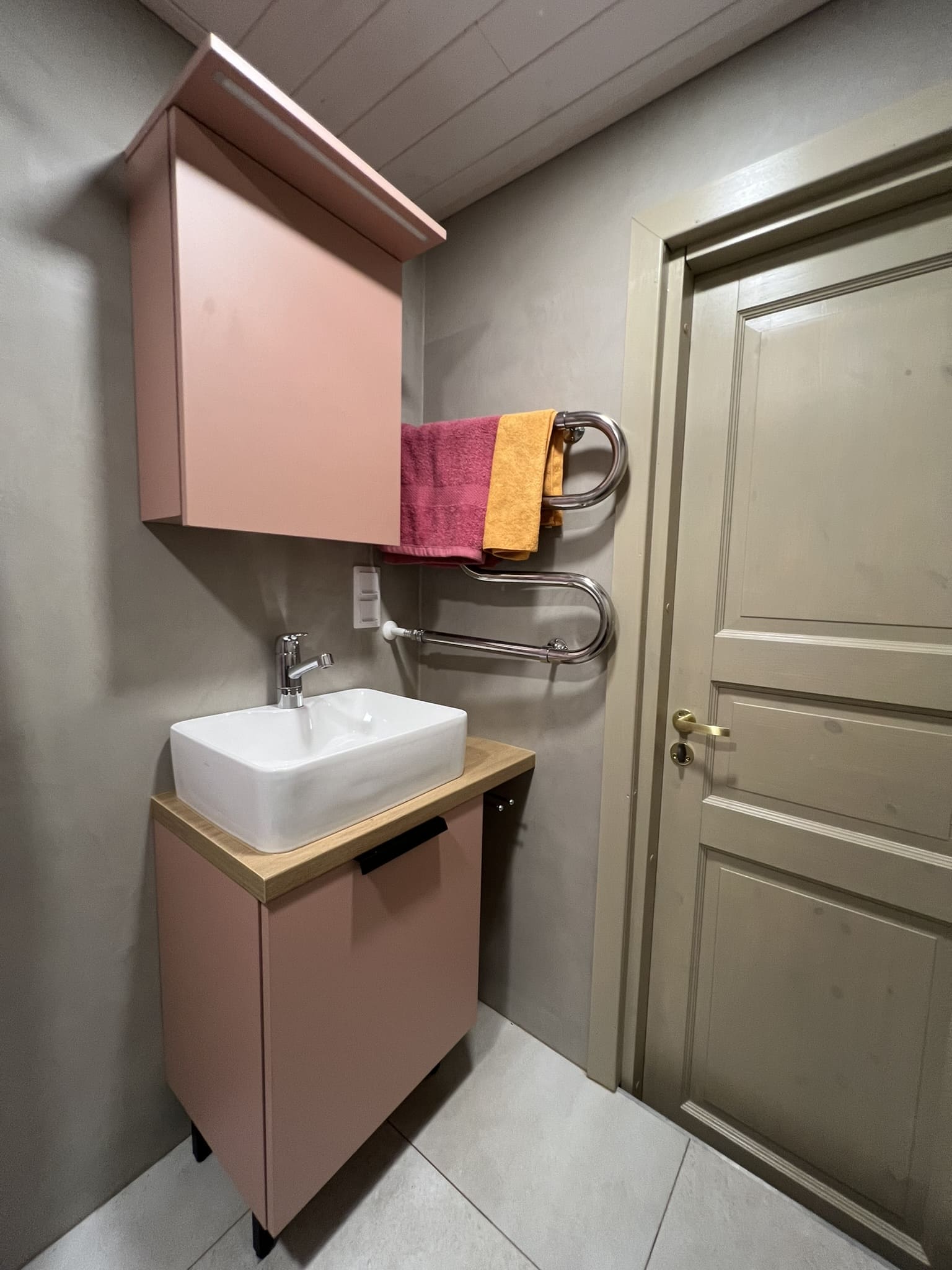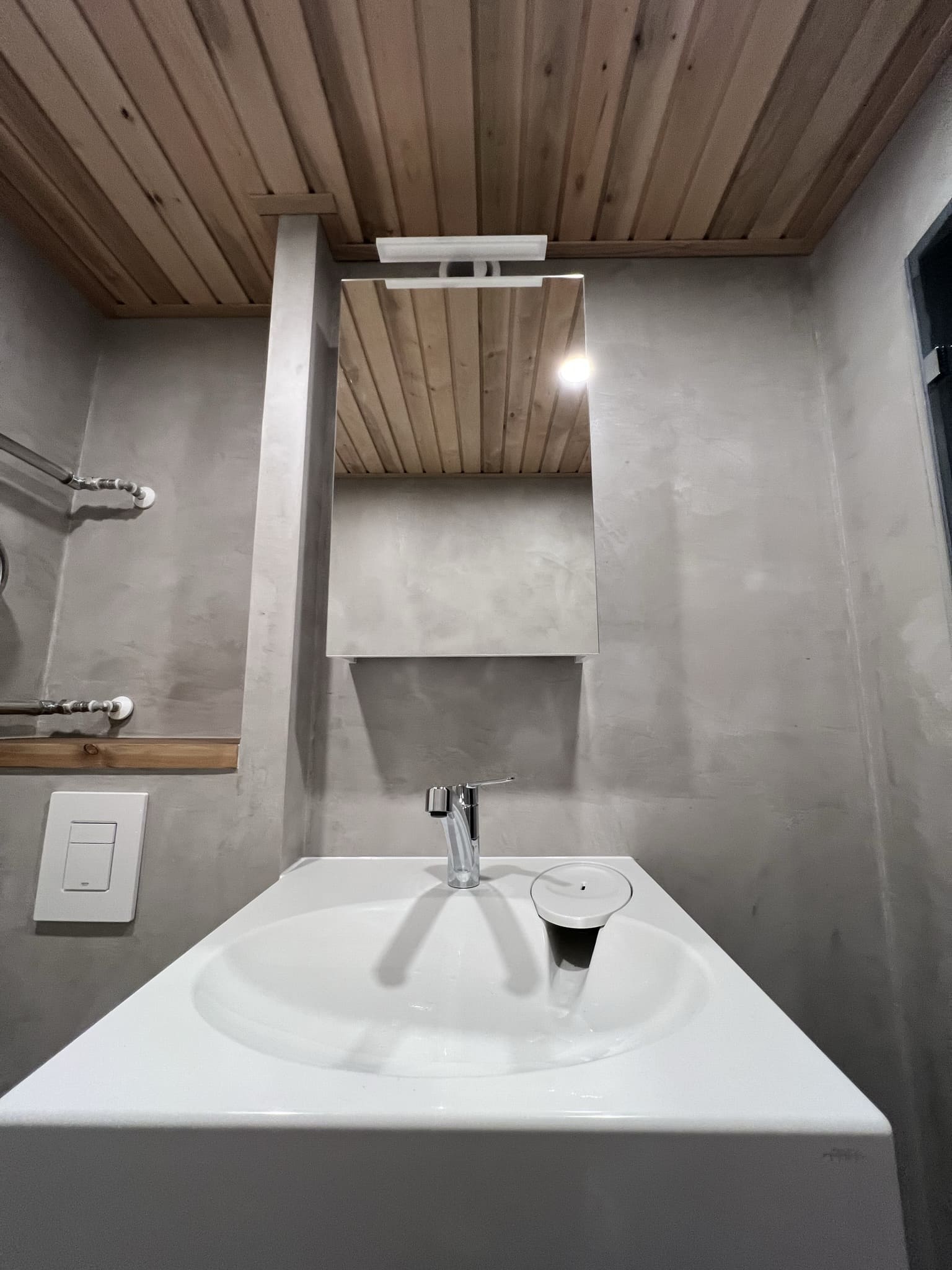 Vannituba on kaetud mikrotsemendiga. Võttes arvesse tellija soovi, tehti pinnad tavapärasest mikrotsemendi mustrist veidi rustikaalsemad. Tulemuseks on tugev, veekindel, vuugivaba ja sile pind. Mikrotsemendi materjalidega aitas kaasa www.mikotsement.ee.