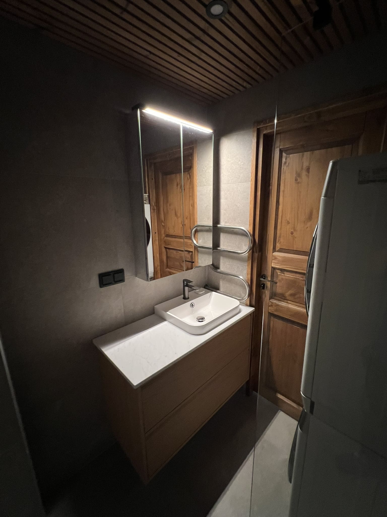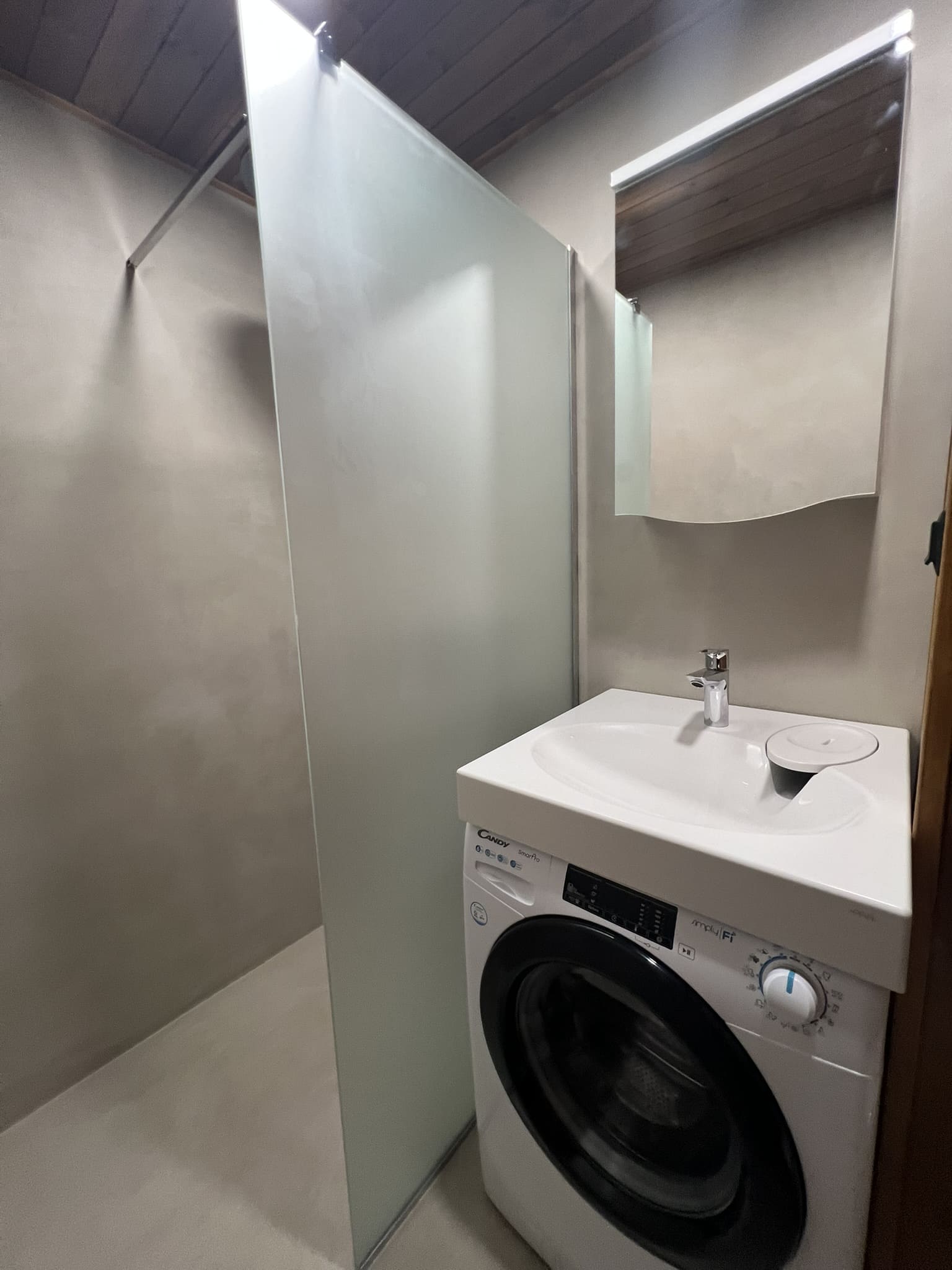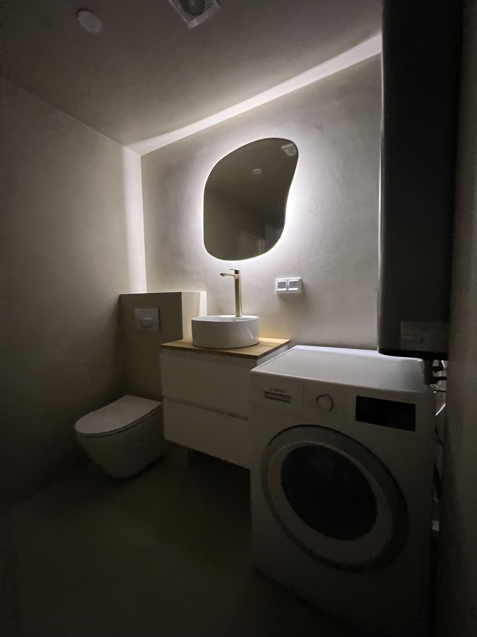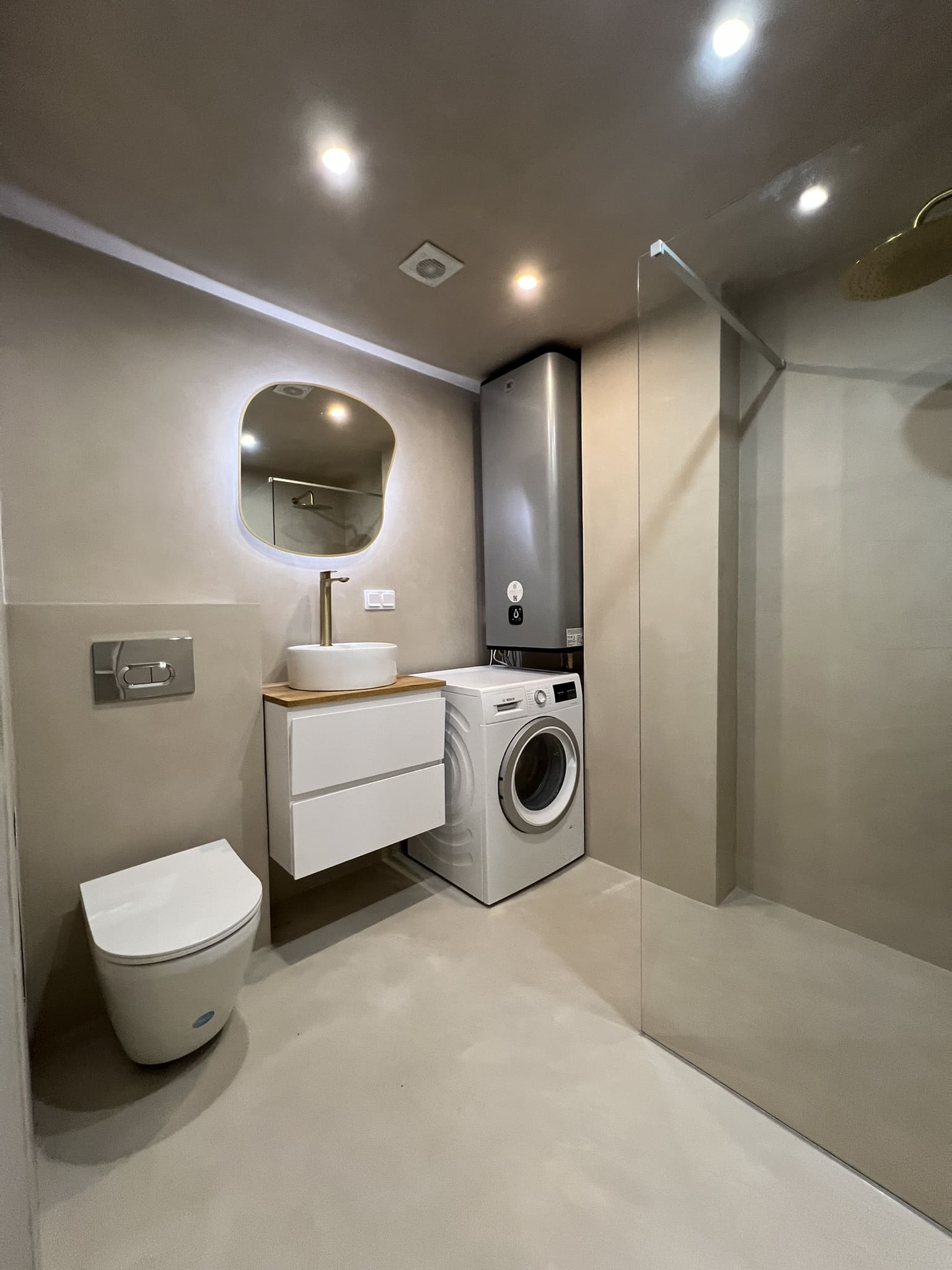 Vannituba on kaetud mikrotsemendiga. Võttes arvesse tellija soovi, tehti pinnad tavapärasest mikrotsemendi mustrist veidi rustikaalsemad. Tulemuseks on tugev, veekindel, vuugivaba ja sile pind. Mikrotsemendi materjalidega aitas kaasa www.mikotsement.ee.