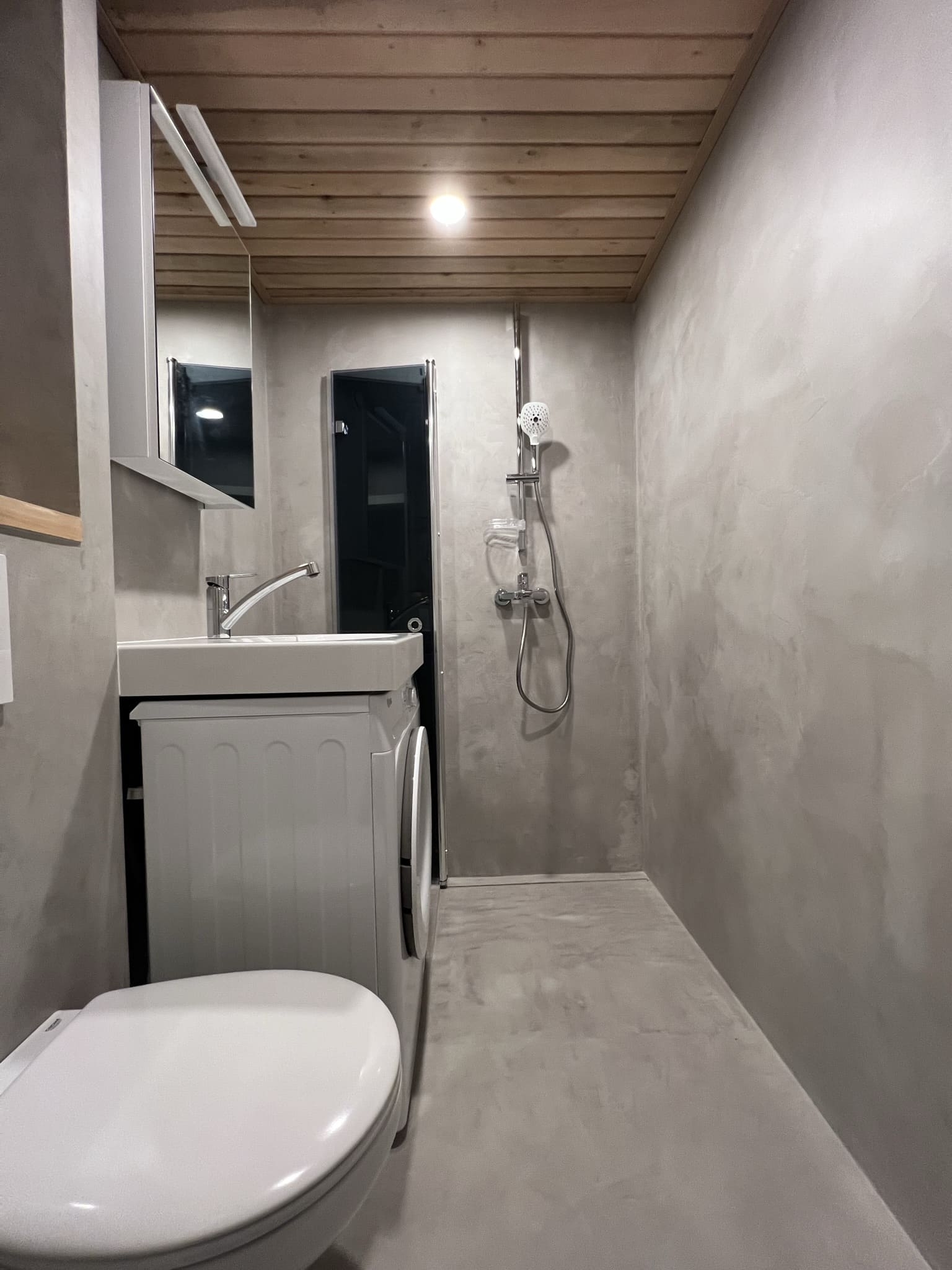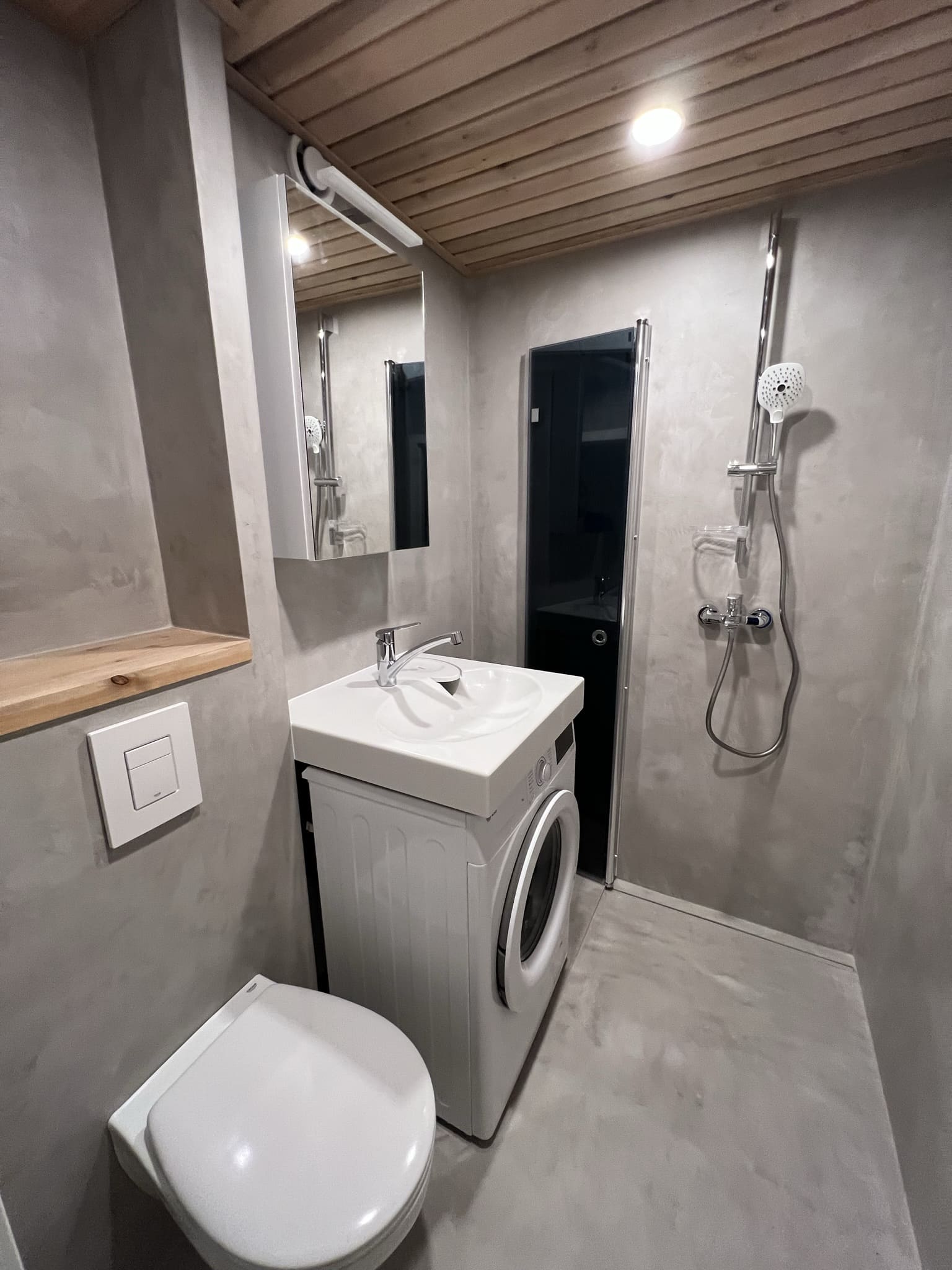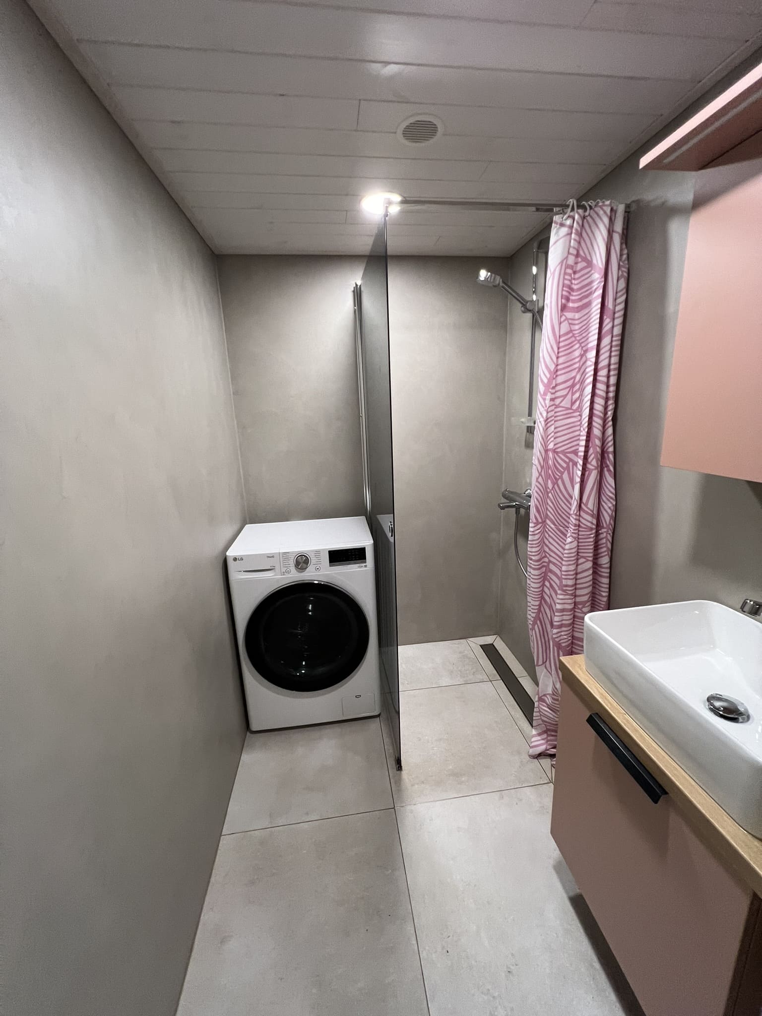 Kuna tegemist on väikese duširuumiga, siis paigutasime kõik eluks vajaliku. Väikeste pindaladega duširuumide puhul saab kasutada ruumi säästmise puhul pesumasinapealseid valamuid, kus sama pindala peale mahub kaks asja korraga. Põranda ja seinad viimisleti mikrotsemendiga, mida on lihtne hooldada (Hall 20) , lagi lepa sisevoordilauaga.