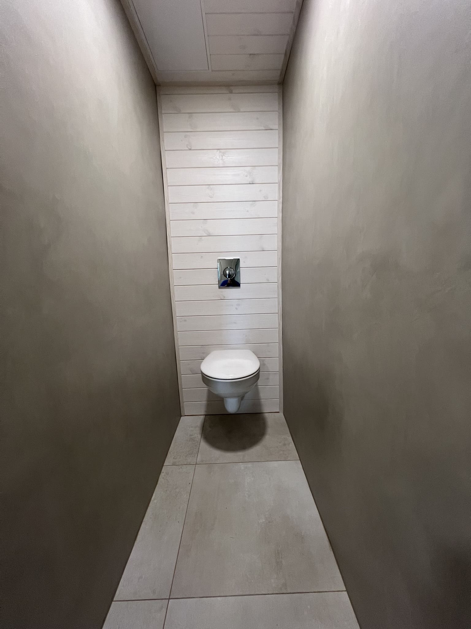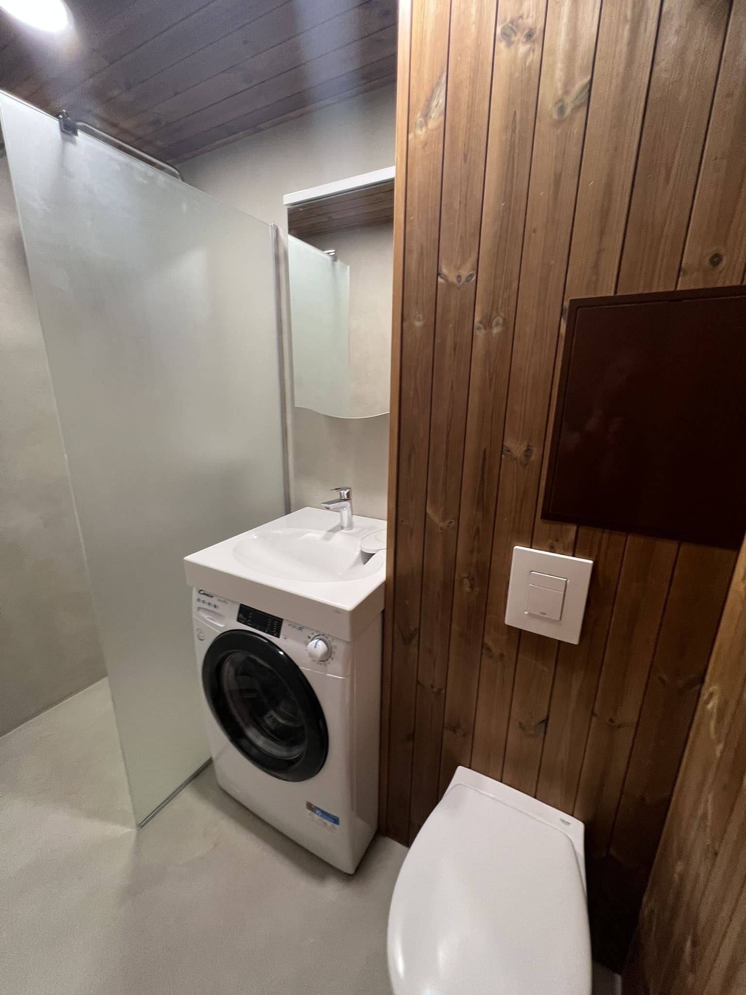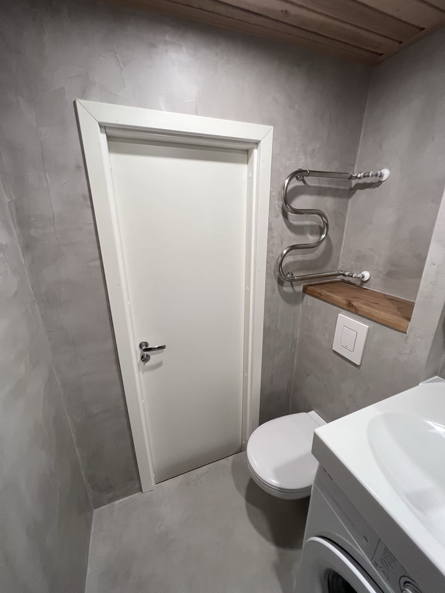 Kuna tegemist on väikese duširuumiga, siis paigutasime kõik eluks vajaliku. Väikeste pindaladega duširuumide puhul saab kasutada ruumi säästmise puhul pesumasinapealseid valamuid, kus sama pindala peale mahub kaks asja korraga. Põranda ja seinad viimisleti mikrotsemendiga, mida on lihtne hooldada (Hall 20) , lagi lepa sisevoordilauaga.